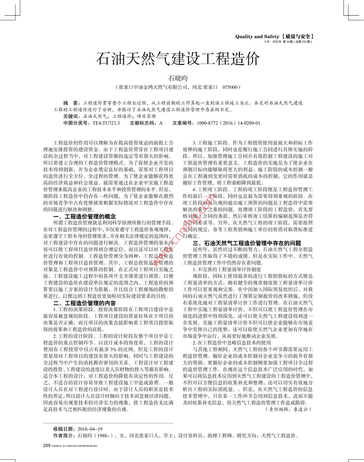 Quality and Safety【質(zhì)量與安全】5中201年第1期(總第532期)石油天然氣建設(shè)工程造價(jià)石曉昀(張家口中油金鴻天然氣有限公司,河北張家口075000)摘要:工程造價(jià)貫穿整個(gè)工程全過程,從工程前期的工作算起一直到該工程竣工為止。本文對(duì)石油夭然氣建設(shè)工程的工程造價(jià)進(jìn)行了分析,并探討了石油夭然氣建設(shè)工程造價(jià)管理中存在的不足。關(guān)鍵詞:石油天然氣;工程造價(jià);項(xiàng)目管理中圖分類號(hào):TE4TU7233文獻(xiàn)標(biāo)志碼:A文章編號(hào):1000-8772(2016)140209-01工程造價(jià)的作用可以理解為在提高投資效益的前提上合3.工程施工階段。作為工程投資使用量最大和招標(biāo)工作理地安排投資的建設(shè)資金。由于工程造價(jià)貫穿在工程項(xiàng)目建延伸的施工階段,同時(shí)也是履行施工合同進(jìn)行具體實(shí)施的階設(shè)的全過程當(dāng)中,對(duì)工程建設(shè)資源的選定等有很大的影響,段。所以,加強(qiáng)管理施工合同并有效控制工程建設(shè)的施工對(duì)所以要建立合理的工程造價(jià)管理模式。為了促使企業(yè)開發(fā)的工程造價(jià)管理有重要意義。工程造價(jià)的實(shí)施是為了使企業(yè)在技術(shù)得到創(chuàng)新,并為企業(yè)奠定良好的基礎(chǔ),需要對(duì)工程項(xiàng)目預(yù)期目標(biāo)內(nèi)能夠取得更大的利益。施工階段的成夲控制一艤的造價(jià)進(jìn)行全方位、全過程的管理。為了使企業(yè)能夠獲得更是在工程遇到變更時(shí)需要消耗的成本的控制,它的作用就是高的經(jīng)濟(jì)效益和社會(huì)效益,就需要通過在企業(yè)中實(shí)施工程造做好工作管理,將工程索賠降到最低。價(jià)管理來提高企業(yè)的工程技術(shù)水平和投資管理的水平。但是4.工程竣工階段。工程的竣工階段便是工程造價(jià)管理工現(xiàn)階段工程造價(jià)中仍存在一些問題,為了使企業(yè)能夠在激烈作的最后一個(gè)階段,同時(shí)也是最為需要得到重視的階段。在的市場(chǎng)競(jìng)爭(zhēng)中占有優(yōu)勢(shì)就要根據(jù)實(shí)際情況對(duì)工程造價(jià)中存在竣工階段容易出現(xiàn)的超出施工預(yù)算的問題是工程造價(jià)中需要的問題進(jìn)行解決和調(diào)整。解決的重中之重的問題。處理竣工階段的工程造價(jià),首先要工程造價(jià)管理的概念核對(duì)施工合同的條款,然后審核竣工結(jié)算的編制范圍是否符所謂工程造價(jià)管理就是利用科學(xué)原理所推行的管理手段。合合同要求等。另外,在天然氣工程的竣工階段,需要按照在對(duì)工程造價(jià)管理的過程中,不僅要遵守工程造價(jià)客觀規(guī)律,合同的規(guī)定,參考工程類別和施工單位的資質(zhì)對(duì)取費(fèi)標(biāo)準(zhǔn)進(jìn)還要遵守工程本身的管理要求,并在相關(guān)法律規(guī)定的范圍內(nèi),行確定對(duì)工程建設(shè)中存在的問題進(jìn)行解決。工程造價(jià)管理的基本內(nèi)三、石油天然氣工程造價(jià)管理中存在的問題容可以使工程項(xiàng)目造價(jià)得到合理定位,而且還可以對(duì)工程造近些年,雖然經(jīng)過不斷的努力,石油天然氣工程全程造價(jià)進(jìn)行有效的控制。工程造價(jià)管理分為兩種:工程總投資造價(jià)管理工作取得了不錯(cuò)的成績(jī),但是在實(shí)際工作中,天然氣價(jià)管理和工程項(xiàng)目造價(jià)管理。其中,工程總投資造價(jià)管理的工程造價(jià)管理工作中仍然存在著問題對(duì)象是工程造價(jià)中對(duì)預(yù)算的控制。在正式對(duì)工程項(xiàng)目實(shí)施之不完善的工程量清單計(jì)價(jià)制度前,工程建設(shè)施工過程中的各項(xiàng)開支全部要進(jìn)行預(yù)算,以便現(xiàn)階段,國(guó)際上使用最多的進(jìn)行工程招投標(biāo)的方式便是工程建設(shè)的造價(jià)在建設(shè)單位規(guī)定的范圍之內(nèi)。工程造價(jià)的預(yù)工程量清單的方式,擁有健全的規(guī)章制度使工程量清單計(jì)價(jià)算要以施工方案的設(shè)計(jì)為依據(jù),并且結(jié)合工程現(xiàn)場(chǎng)的勘察結(jié)作可以更客觀和完善。在中國(guó)加入國(guó)際貿(mào)易組織后,對(duì)我果進(jìn)行,以便達(dá)到工程造價(jià)更加貼切實(shí)際建設(shè)要求的目的國(guó)的石油天然氣雖然進(jìn)行了預(yù)算定額報(bào)價(jià)的改革措施,但沒工程造價(jià)管理的內(nèi)容有系統(tǒng)化地對(duì)工程量清單計(jì)價(jià)工作進(jìn)行管理。在石油天然氣工程的決策階段。投資決策階段在工程項(xiàng)目建設(shè)中是工程中實(shí)施工程量清單計(jì)價(jià),不但可以使工程造價(jià)管理在市最容易被忽視的階段。工程項(xiàng)目建設(shè)的質(zhì)量妤壞在于項(xiàng)目的場(chǎng)化的進(jìn)程中得到深化,還可以使天然氣工程建設(shè)得到進(jìn)決策是否正確,而且項(xiàng)目的決策直接影響著工程項(xiàng)目投資取步發(fā)展。實(shí)施工程量清單計(jì)價(jià)不但可以使企業(yè)能夠在市場(chǎng)競(jìng)得的效果和工程造價(jià)的高低。爭(zhēng)中發(fā)揮自己的優(yōu)勢(shì),還可以促使天然氣企業(yè)更加有序地在2.工程的設(shè)計(jì)階段。工程的設(shè)計(jì)階段在整個(gè)項(xiàng)目中是工市場(chǎng)競(jìng)爭(zhēng)中