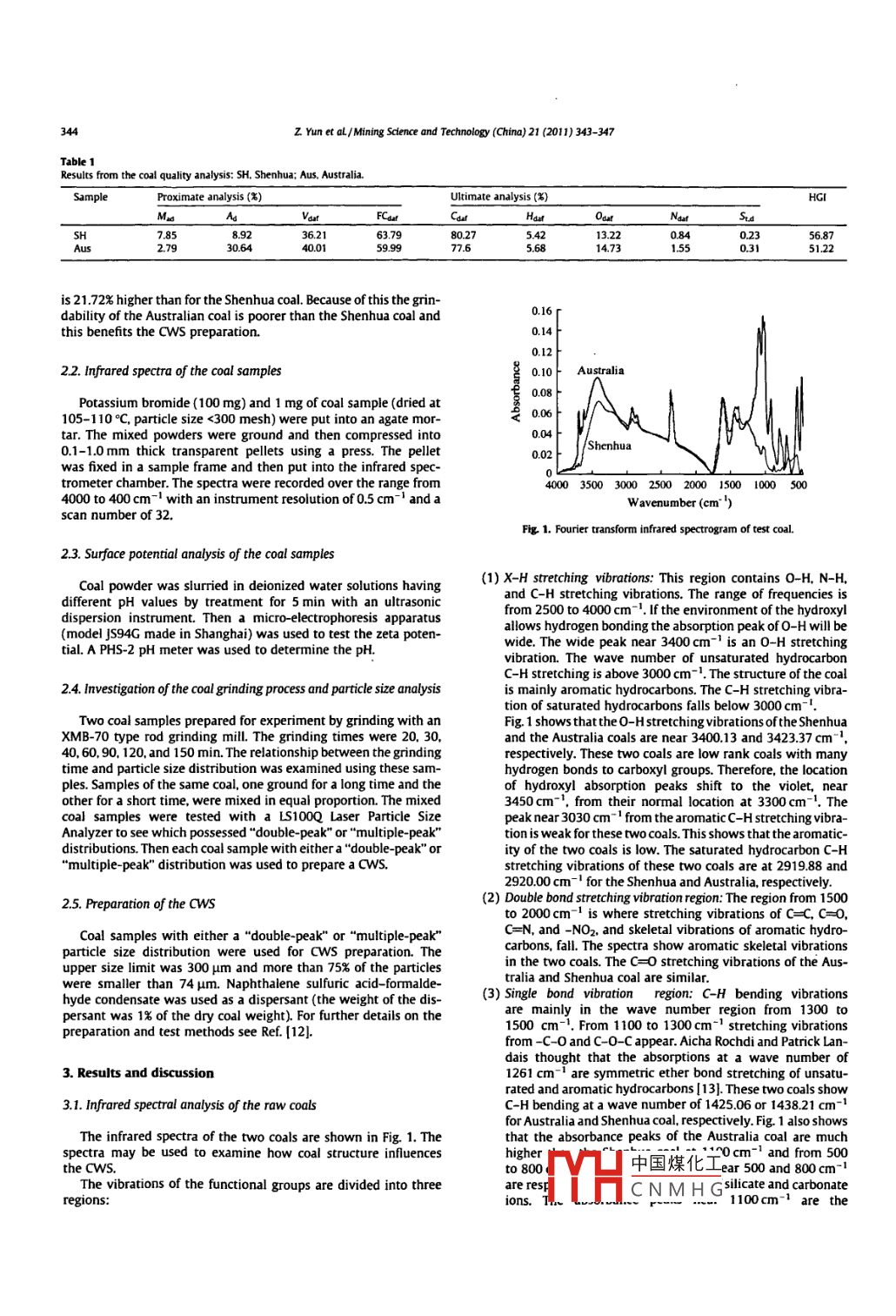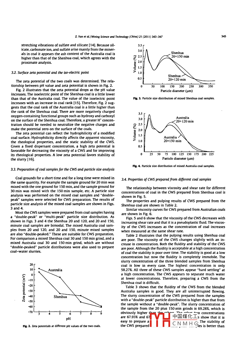Mining Science and Technology( China)21(2011)343-347Contents lists available at Science Direct蓋dIecMining Science and Technology( China)SEVIERjournalhomepagewww.elsevier.com/locate/mstcA comparative investigation of the properties of coal-water slurries preparedfrom Australia and Shenhua coalsYun Zengjie * Wu Guoguang Meng Xianliang, Zhang Yuliang, Shi Frank, He Yaqun", Luo XiaoqiangSchool of Chemical Engineering and Technology. China University of Mining and Technology. Xuzhou 221008, ChinaJulius Kruttschnitt Mineral Research Centre, Brisbane 4068, AustralARTICLE INFOABSTRACTTwo coal samples of similar rank were chosen from Australia and China to investigate the differences inReceived 3 October 2010Coal-Water Slurry( CWS)made from them. the effect of ash content and particle size gradation on theseReceived in revised form 29 October 2010properties was also studied Different grinding times were used when grinding the two coals and particleAccepted 1 December 2010Available online 8 June 2011size analysis of these ground coals was used to select samples with adouble-peak"particle size distri-bution. All the"double-peak"samples were used to prepare a CwS. The concentration, viscosity fluidity.and stability of each CwS were measured. The results show that the properties of a CwS prepared from aoal-Water Slurrycoal sample with a"double-peak"size distribution are better than those CwS prepared from sampleswith a mono-modal particle distribution. The ash content of Australian coal is 21.72% higher than theSlurry abilityash content of Shenhua coal. the highest coal concentration in slurry from the Australia coal is 11.01%higher than in CWS from the Shenhua coal. The fluidity and stability of the CwS prepared from theAustralian coal are both better than the fluidity and stability of slurry prepared from Shenhua coal Highash content in the australian coal improves the pulping results of a Cws made from it.o 2011 Published by Elsevier B V. on behalf of China University of Mining Technology1 Introductionout for many years [5-10 A recently patented technology for pre-paring high concentration CWS from low rank coals has been pubCoal-Water Slurry( CwS)technology was developed during the lished showing how the concentration of coal in the CwS can beworld wide oil crisis of the 1970,s to produce a novel and clean increased by 3-5% (111fluid fuel as a substitute for petroleum the slurry is prepared asThe two coal samples used in the experiments described hereina mixture of 62-70% fine coal, 29-37% water, and about 1% addi- are from australia and China. they are both low rank coals withtives determined specifically for each different process [1]. cws similar coalification. One of the key points for preparing CwS istechnology was developed and applied systematically in China particle size gradation. Appropriate particle gradation can achieveluring the early 1980's. The technique is gradually being perfected a high packing efficiency and increase the coal concentration in thetoday and it is now entering commercial application [2].CWS. The influence of particle gradation on Cws properties isAlthough medium rank bituminous coals are suitable for Cws reported here. Differences of the CwS properties when usipreparation they are typically used for coke making because they Australia coal or Shenhua coal are discussed. Experimental studyare not particularly abundant in the world. The low rank coals, such of CWS preparation from the Australia coal is significant for theas lignite, long flame coal, and non-caking coal, are used for Cws preparation and application of aws in australia.preparation to supply feed material for coal gasification or combus-tion(3]. The properties of coal, such as inherent moisture, oxygencontaining functional groups, Hardgrove grindability index(HGi),2. Experimentalo/C ratio, and ash content have great influence on the pulping re-sults during CWS preparation[4 The high moisture content and 2.1. Coal samplespoor grindability of low rank coals make it difficult to form a highlyconcentrated CWs from them. Investigations into preparationIn these experiments two kinds of coals were chosen, one frommethods for Cws having high coal concentrations, low viscosities,the Shenhua mining Group, Ltd, and one from Australia Tarongand good fluidity starting from low rank coals have been carried Energy. These are low rank coals. The results of a quality analysison the two coals are shown in table 1The Shenhua coal is a weakly coking coal. The results in Table 1Corresponding author Tel +86 15949040834show that the volatile content of the two coals is similar and theE-mailaddress:yunzengji@126.com(ZYun).same is true for中國煤化工 the Australia coal1674-5264/s- see front matter e 2011 Published by Elsevier B.V. on behalf of China University of Mining什HCNMHGdoi:10.1016mstc201105014344Z Yun et aL/ Mining Science and Technology(China)21(2011)343-347Results from the coal quality analysis: SH Shenhua: Aus, australia.Proximate analysis (3)Ultimate analysis(‰)A785637980275.4213.22568730645999680.315122is 21.72% higher than for the shenhua coal. Because of this the grindability of the Australian coal is poorer than the Shenhua coal and0.16his benefits the CwS preparation.2.2. Infrared spectra of the coal samples0.10F Australia008Potassium bromide( 100 mg )and 1 mg of coal sample(dried at105-110C, particle size <300 mesh)were put into an agate mor-ar. The mixed powders were ground and then compressed into0. 1-1.0 mm thick transparent pellets using a press. The pelletShenhuawas fixed in a sample frame and then put into the infrared spectrometer chamber the spectra were recorded over the range from40003500300025002000150010005004000 to 400 cm-l with an instrument resolution of 0.5 cm-I and ascan number of 32Fig 1. Fourier transform infrared spectrogram of test coal.2.3. Surface potential analysis of the coal samplesCoal powder was slurried in deionized water solutions having(1)X-H stretching vibrations: This 