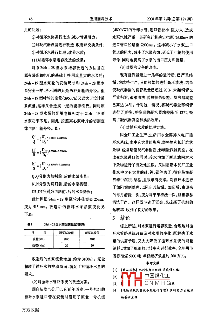2008年第7期(總第127期)應(yīng)用能源技術(shù)45發(fā)電廠循環(huán)水系統(tǒng)的節(jié)能改造韓廣祥,馮音(唐山啟新水泥有服公司,河北,唐山,063000摘要:本文主要介紹了電廠循環(huán)水系統(tǒng)在取水環(huán)境和供水容量等方面進(jìn)行改造,通過技術(shù)改造既解決了水量的供需矛盾,又大大降低了循環(huán)水系統(tǒng)的能量消耗,提高了機(jī)組的熱效率,節(jié)約了能源。關(guān)鍵詞:發(fā)電廠;循環(huán)水系統(tǒng);節(jié)能改造中圖分類號:TK22351文獻(xiàn)標(biāo)識碼B文章編號:1009-3230(2008)07-0045-02Energy-saving Reform of Water CirculationSystem in Power PlantsHAN Guang-xiang, FENG Yin( Tangshan Qixin Cement Co Ltd, Tangshan, Hebei, 063000, China)Abstract: Because of changes of environment and water supply capacity for water circulation system ofpower plant, makes it need of technology reform to solve the conflict between water supply and consump-tion and it can reduce the erption of water circulation system, increase the sets thermal efhKey words: power plant; water circulation system; energy-saving reform0引言求量在設(shè)計條件下約為3050th;循環(huán)水系統(tǒng)的供隨著企業(yè)的發(fā)展變化,使得早年投入運行的水能力明顯不足,致使機(jī)組的真空下降10%左發(fā)電廠循環(huán)水系統(tǒng)在取水環(huán)境和供水容量等方面右。因循環(huán)水流速慢且壓力低凝汽器銅管嚴(yán)重發(fā)生了很大變化,現(xiàn)有的循環(huán)水系統(tǒng)已經(jīng)根本不結(jié)垢平均每月要進(jìn)行一次高壓清洗既造成資金能適應(yīng)生產(chǎn)的需要如何通過技術(shù)改造來使之適嚴(yán)重浪費,又影響生產(chǎn);另一方面隨著企業(yè)不斷應(yīng)形勢發(fā)展的需要是一個勢在必行的問題現(xiàn)提發(fā)展,廠內(nèi)污水全部排入冷水溝使水質(zhì)嚴(yán)重下出如下改造方案:降機(jī)組正常運行已受到嚴(yán)重威脅,使生產(chǎn)陷于被循環(huán)水系統(tǒng)的現(xiàn)狀動局面,對循環(huán)水系統(tǒng)的改造已成為目前急需解啟新水泥有限公司發(fā)電分廠#1機(jī)組是八十決的問題。年代建成投產(chǎn)的,額定功率為1200W,循環(huán)水系統(tǒng)為一臺24h-28型水泵,銘牌出力為2880v/h2循環(huán)水系統(tǒng)的改造實際流量為2050th;整個#1機(jī)組對循環(huán)水需中國煤化工運行形勢我們決CNMHG全面的技術(shù)分析收稿日期:2008-06-11修訂稿日期:2008-06-18和論證,選擇了四條技術(shù)改造路線作者簡介:韓廣祥(194-),男,本科學(xué)歷學(xué)士學(xué)位工程師,從事電廠熱動設(shè)備技術(shù)管理工作。①對循環(huán)水泵實施增容改造,以解決水量不應(yīng)用能源技術(shù)2008年第7期(總第127期)足的問題(4800)的冷卻水管進(jìn)口管徑小,阻力大,造成②對循環(huán)水路進(jìn)行改造減少管道阻力;水泵汽蝕嚴(yán)重。經(jīng)研究計算決定把原φ550m的③對凝汽器設(shè)備進(jìn)行改造,改善熱交換條件;進(jìn)口管口徑增至90mm。這樣減小了水泵進(jìn)口④對循環(huán)水進(jìn)行處理改善水質(zhì);管道的阻力減小了水泵汽蝕,延長了葉輪的使用(1)對循環(huán)水泵增容改造的效果:壽命,同時也提高了水泵的出口壓力和流量。對原24sh-28型水泵增容改造的方法是在(3)對凝汽設(shè)備的改造。原有泵殼和電機(jī)的基礎(chǔ)上換用流量大的水泵輪現(xiàn)有凝汽器經(jīng)過十幾年的運行后,已嚴(yán)重結(jié)24h-19型水泵輪的安裝尺寸和24sh-28型水垢,為維持生產(chǎn),只能頻繁的進(jìn)行高壓清洗結(jié)果泵完全一樣所不同的只是兩種泵輪的外徑。但使凝汽器漏的銅管數(shù)量已超過20%,未漏銅管也24sh-19型葉輪的流量(396h)又遠(yuǎn)大于設(shè)計需嚴(yán)重積垢很難清洗,傳熱效果極差。凝汽器端差要流量這樣又會造成一定的能源浪費。同時原已高達(dá)34℃。針對這一情況將凝汽器全部銅管24sh-28型水泵的配用電機(jī)相對于24sh-19型進(jìn)行了更換更換后的凝汽器端差降至12℃,提水泵功率不足。因此按照離心泵葉片的切割定高了凝汽器真空和換熱效果律切割葉輪外徑。即:(4)對循環(huán)水質(zhì)的處理方法。因全廠工業(yè)生產(chǎn)、生活用水全部排入電廠循,085+0.0015環(huán)水系統(tǒng),水中有大量的焦炭塑料物和長纖維狀=(2)1.5448+0.000%m雜物經(jīng)常堵塞凝汽器銅管,影響凝汽器真空。在改變水泵進(jìn)口管同時,冷水溝加了兩道濾網(wǎng)對水N305625+0.0151551mN=(D2中雜物進(jìn)行了有效地攔截。又因啟新水泥廠工業(yè)排水中含有大量的硅鈣、鎂等離子,很容易在凝QQ分別為切割前后的水泵流量汽器中沉積、結(jié)垢,且很難清洗掉。對循環(huán)水進(jìn)行NN分別為切割前后的水泵揚程;了加阻垢劑處理,以阻止其結(jié)垢。加藥后,由原來D2D分別為切割前后的水泵揚程;的每月清洗一次,變?yōu)槊堪肽昵逑匆淮?且很容易經(jīng)計算把24sh-19型泵輪外徑切去25mm清洗干凈。這樣既節(jié)省了資金,又提高了機(jī)組的變?yōu)?15mm。改造后的循環(huán)水泵參數(shù)變化見運轉(zhuǎn)率,收到了良好的效果。下表:3結(jié)論24dh-28型水泵改造前后對照表綜上所述,對水泵進(jìn)行增容改造,合理地對循原泵試驗值新泵試驗值環(huán)水管路系統(tǒng)改造及對水質(zhì)的凈化,既解決了水流量(Uh)50量的供需矛盾,又大大降低了循環(huán)水系統(tǒng)的能量揚程(Mp)消耗,增加了機(jī)組的運