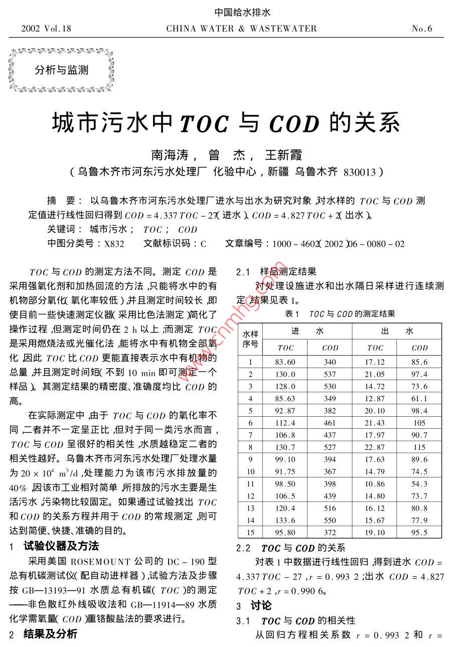 城市污水中TOC與COD的關(guān)系