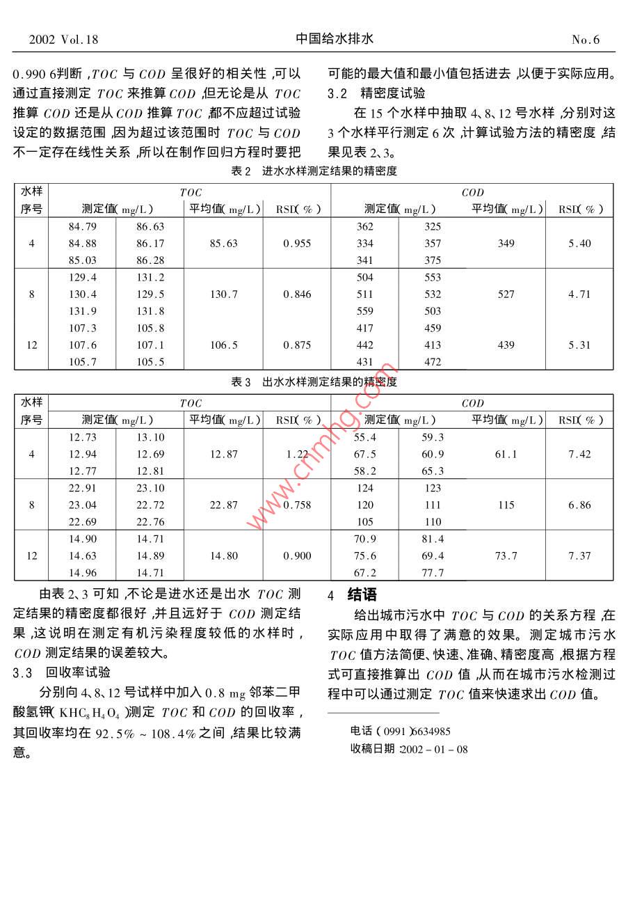 中國給水排水2002Vol.18ChinA WaTER WASTEWaterNo 6分析與監(jiān)測城市污水中TOC與C0D的關(guān)系南海濤,曾杰,王新霞烏魯木齊市河?xùn)|污水處理廠化驗中心,新疆烏魯木齊830013)摘要:以烏魯木齊市河?xùn)|污水處理廠進水與出水為研究對象對水樣的TOC與COD測定值進行線性回歸得到COD=4.337T0C-2x進水)COD=4.82770C+X出水關(guān)鍵詞:城市污水;TOC;COD中圖分類號:X832文獻標識碼:C文章編號:1000-460x(2002)6-0080-02TOC與COD的測定方法不同。測定COD是2.1樣品測定結(jié)果采用強氧化劑和加熱回流的方法只能將水中的有對處理設(shè)施進水和出水隔日采樣進行連續(xù)測機物部分氧倀氧化率較低)并且測定時間較長即定結(jié)果見表1。使目前一些快速測定儀器采用比色法測定篇化了表1T0c與C0D的測定結(jié)果操作過程,但測定時間仍在2h以上洏測定TC進水是采用燃燒法或光催化法能將水中有機物全部氧序號70cCODTOCCOD化因此TOC比COD更能直接表示水中有機物的17.1總量并且測定時間短(不到10min即可測定一個21.05樣品)其測定結(jié)果的精密度、準確度均比COD的4.7273.6在實際測定中由于TC與COD的氧化率不同二者并不一定呈正比但對于同一類污水而言TOC與COD呈很好的相關(guān)性水質(zhì)越穩(wěn)定二者的2345678985.6312.8720.10112,4106.8相關(guān)性越好。烏魯木齊市河?xùn)|污水處理廠處理水量99.10為20×104m3/d,處理能力為該市污水排放量的1091.7536714.7974.540%因該市工業(yè)相對簡單所排放的污水主要是生98.5039810.86活污水污染物比較固定。如果通過試驗找出T0C106.514.8073.713120.4和COD的關(guān)系方程并用于COD的常規(guī)測定則可15.67達到簡便、快捷、準確的目的,95.801試驗儀器及方法2.2T0C與C0D的關(guān)系采用美國 ROSEMOUNT公司的DC-190型對表1中數(shù)據(jù)進行線性回歸得到進水COD總有機碳測試儀(配自動進樣器),試驗方法及步驟4.337TOC-27,r=0.9932;出水COD=4.827按GB-13193—91水質(zhì)總有機碳(TOC)的測定T0C+2,r=0.9906。非色散紅外線吸收法和GB-11914-89水質(zhì)3討論化學(xué)需氧量(COD腫鉻酸鹽法的要求進行。3.1T0C與COD的相關(guān)性2結(jié)果及分析從回歸方程相關(guān)系數(shù)r=0.9932和r2002Vol.18中國給水排水No 60.9906判斷,TOC與COD呈很好的相關(guān)性,可以可能的最大值和最小值包括進去以便于實際應(yīng)用通過直接測定TOC來推算COD但無論是從TOC3.2精密度試驗推算COD還是從COD推算TOC都不應(yīng)超過試驗在15個水樣中抽取4、8、12號水樣分別對這設(shè)定的數(shù)據(jù)范圍因為超過該范圍時ToC與COD3個水樣平行測定6次計算試驗方法的精密度結(jié)不一定存在線性關(guān)系所以在制作回歸方程時要把果見表2、3。表2進水水樣測定結(jié)果的精密度水樣TOCCOD測定值mg/L)平均值mg/L)RS%)則定值mg/L)平均值mgL)Rs86.1785.630.95585.03131,2553130.4129.5130.75114.7131.9131.8559107.3105.841745912107.6107.1106.50.8755.31105.5表3出水水樣測定結(jié)果的精密度水樣TOCCOD序號測定值mL)平均值mg/L)RsⅡ%)寶值mg/L)平均值(mgL)Rs%)12.692.877.4212.7723.1012422.7222.870.7581156,8622.6910581.414.800.90075.673.77.3714.9614.7167.277.7由表2、3可知不論是進水還是出水TOC測4結(jié)語定結(jié)果的精密度都很好并且遠好于COD測定結(jié)給出城市污水中TOC與COD的關(guān)系方程在果,這說明在測定有機污染程度較低的水樣時,實際應(yīng)用中取得了滿意的效果。測定城市污水COD測定結(jié)果的誤差較大。TOC值方法簡便、快速、準確、精密度高根據(jù)方程3.3回收率試驗式可直接推算出COD值,從而在城市污水檢測過分別向48、12號試樣中加入0.8mg鄰苯二甲程中可以通過測定70C值來快速求出COD值酸氬鉀(KHC3H2O4)測定TOC和COD的回收率其回收率均在92.5%~108.4%之間結(jié)果比較滿電話(09163498收稿日期2002-01-08