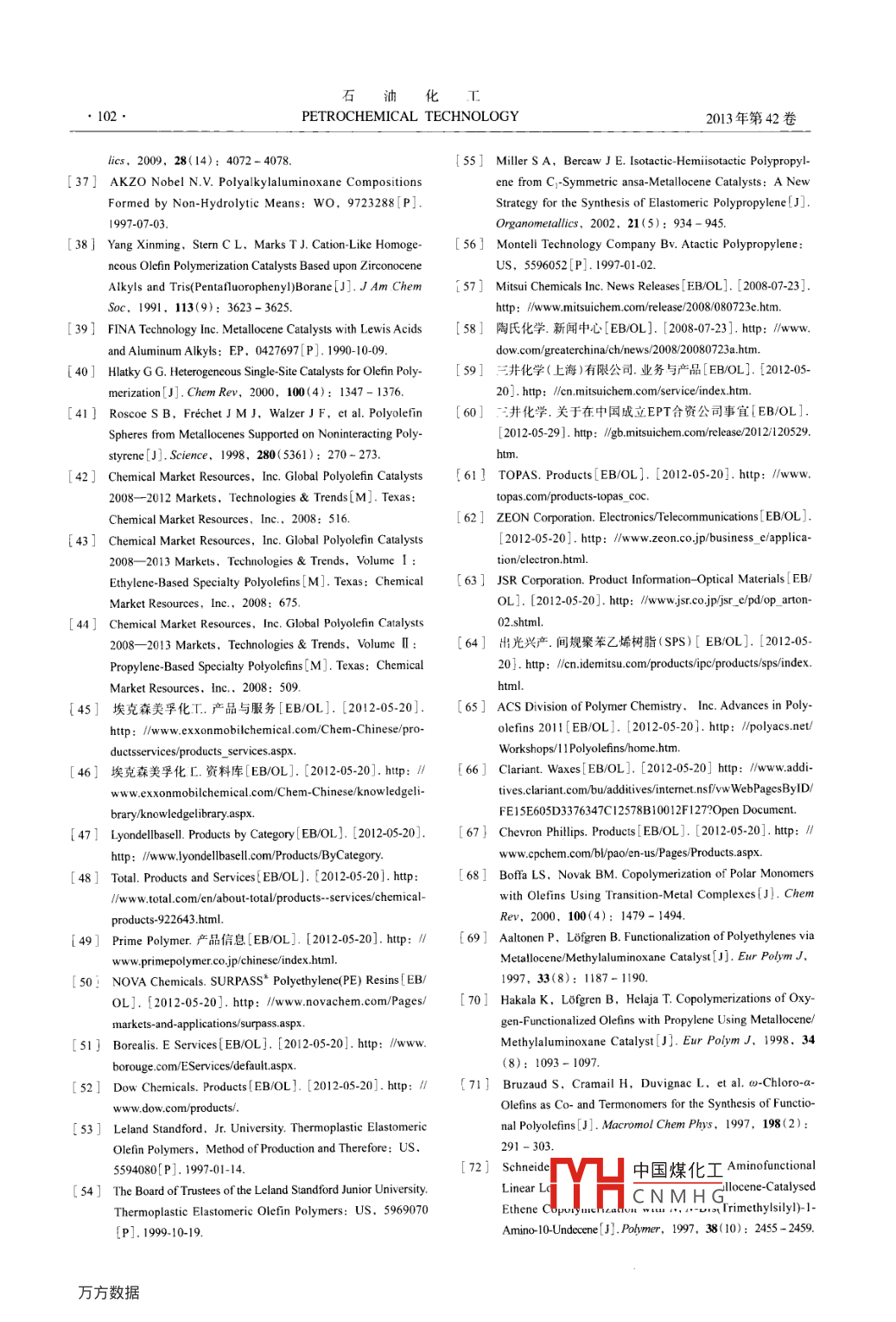 石由2013年第42卷第1期PETROCHEMICAL TECHNOLOGY●95.單中心催化劑聚烯烴材料的研究進(jìn)展王偉(中國(guó)石化北京化T.研究院,北京100013)[摘要]綜述「茂金屬催化劑、非茂金屬催化劑和后過(guò)渡金屬催化削等單中心催化體系的研究進(jìn)展,同時(shí)介紹了一些使用非配位聚合方法(如開(kāi)環(huán)易位聚合)合成特殊結(jié)構(gòu)聚烯烴的研究:著重介紹了基于這類催化劑的聚烯烴材料工業(yè)生產(chǎn)的情況,總結(jié)歸納了各公同生產(chǎn)的單中心催化劑聚烯烴產(chǎn)品并闡述了它們的結(jié)構(gòu)和用途,對(duì)具有強(qiáng)大潛在市場(chǎng)而術(shù)T.業(yè)化的產(chǎn)品(如功能化聚烯烴)進(jìn)行「論述:對(duì)我國(guó)單中心催化劑和聚烯烴材料術(shù)來(lái)的發(fā)展提出了展望。單中心催化劑的研究與開(kāi)發(fā)將促進(jìn)聚烯烴產(chǎn)品的差異化和升級(jí)換代:[關(guān)鍵詞]單中心催化劑:聚烯烴;聚乙烯;聚丙烯;高附加值樹(shù)脂[文章編號(hào)] 1000- 8144(2013)01 - 0095 - 09 .中圖分類號(hào)] TQ322[文獻(xiàn)標(biāo)志碼] AProgress in the Research of Polyolefin Materials with Single Site CatalystsWang Wei(SINOPEC Beijing Research Institute of Chemical Industry. Beiing 100013. China )[ Abstract] The researches of single-site catalysts, namely metallocene catalysts ,non-metallocenecatalysts and late transition metal catalysts, for olefin polymerization were reviewed. The synthesisof some special polyolefins by non-coordination polymerization (e.g. ring-opening metathesispolymerization) was also involved. Some commercially available polyolefn materials based on thesekinds of catalysts were focused on. The types,structures and applications of the polyolefin resins weresummarized. And the uncommercialized functional polyolefins which had strong potential market valuewere also discussed. The development trends of polyolefins based on the single-site catalysts wereproposed.[ Keywords] single-site catalyst; polyolefin; polyethylene; polypropylene; high value-added resin聚烯烴是日常生活中最重要的合成聚合物材建議。料。近年來(lái),具有新型功能、高附加值的聚烯烴材1單中心催化劑料逐漸引起研究人員的關(guān)注。催化劑技術(shù)決定了聚烯烴的發(fā)展,從傳統(tǒng)的Ziegler- -Natta (Z-N)催化劑1957年研究者發(fā)現(xiàn)’,在Et,Al或Et,AICI存在.到茂金屬催化劑、非茂金屬催化劑和后過(guò)渡金屬催時(shí),二氯二茂鈦(Cp2TiCl)可催化乙烯聚合,但聚化劑,烯烴聚合發(fā)展的歷史就是烯烴催化劑發(fā)展的合活性太低,不符合工業(yè)應(yīng)用的要求。直至1980年歷史。催化劑技術(shù)是聚烯烴工.業(yè)的命脈,與傳統(tǒng)Sinn等41發(fā)現(xiàn),采用甲基鋁氧烷(MAO)為助催化的Z-N催化劑相比,茂金屬及其他均相催化劑具有劑時(shí),茂金屬催化乙烯聚合的活性可大幅提高。此更優(yōu)秀的聚合行為,可賦予聚烯烴材料獨(dú)特的結(jié)構(gòu)后,茂金屬催化烯烴聚合的研究不斷有新的突破。和性能2Kaminsky等s]合成出可用于聚合等規(guī)聚丙烯的橋本文綜述了烯烴聚合單中心催化劑的研究進(jìn)聯(lián)手性茂金屬中"箱幾升用手性茂鈦催中國(guó)煤化工展,介紹了單中心催化劑的工業(yè)化進(jìn)程和主要相關(guān)[收稿日期]2TYHC NM H G12- 10-12。產(chǎn)品及其市場(chǎng),對(duì)可能使用單中心催化劑生產(chǎn)的潛i作者簡(jiǎn)介]王偉(1969-),男.北京市人,博士,高級(jí)工程在產(chǎn)品進(jìn)行了展望,并對(duì)這方面的研究開(kāi)發(fā)提出了師.電話010 - 59202604.電郵wang.bjhy@sinopec com:●96●PETROCHEMICAL TECHNOLOGY2013年第42卷化劑,首次采用丙烯單體合成出了熱塑性彈性體;稱為“類Cp配體”Coates等7利用非橋聯(lián)茂金屬催化劑合成了立體嵌Dow公司30-31發(fā)現(xiàn),在烯烴聚合催化體系中段聚丙烯(PP)。同時(shí)使用兩種非茂催化劑(一種共聚能力很強(qiáng),另單茂金屬或半茂金屬化合物是指帶有--.個(gè)環(huán)- -種幾乎不能共聚),通過(guò)引人“鏈穿梭劑”可形戊二烯基或其衍生物的過(guò)渡金屬化合物。1986年,成既含剛性的乙烯均聚鏈段,又含柔性的共聚鏈段Ishihara等8-9. 采用單茂金屬催化劑合成了間規(guī)聚苯的多嵌段結(jié)構(gòu)聚合物。Klosin等 32設(shè)計(jì)了一種新型乙烯(sPS); 1990年, Dow公司和Exxon公司幾乎非茂催化劑,并稱該催化劑在耐溫性、高溫活性、同時(shí)申請(qǐng)了關(guān)于“限制幾何構(gòu)型”催化劑(CGC)共聚性以及聚合物相對(duì)分子質(zhì)量方面已全面超越在烯烴聚合應(yīng)用的專利10; 1991年, Dow公司12CGC催化劑。中請(qǐng)了帶烷氧基的單茂金屬用于烯烴聚合催化劑的除上述IVB族金屬和鐵、鎳等后過(guò)渡金屬的專利,但聚合活性并不高; 1998年, Nomura等 13:化合物,II B族的鈧、鑭系稀土元素以及過(guò)渡金屬發(fā)現(xiàn),帶芳氧基的單茂金屬催化劑的乙烯聚合活性釩、鉻也常用于烯烴聚合。釩催化劑除用于生產(chǎn)乙遠(yuǎn)高FDow公司的帶烷氧基單茂金屬催化劑。該研丙三元橡膠之外,還有很多新興的用途33-34;鉻是究組14-15.5 把這類催化劑的用途大大擴(kuò)展,實(shí)現(xiàn)了多.Phillips催化劑的主要成分,有機(jī)鉻化合物催化劑不種單體的聚合和共聚,甚至使- - 些傳統(tǒng)不可聚合的僅可生產(chǎn)烯烴的低聚物和齊聚物,也可催化烯烴聚單體也能與乙烯共聚,如環(huán)已烯[6l。 其他比較典合得到高相對(duì)分子質(zhì)量的聚