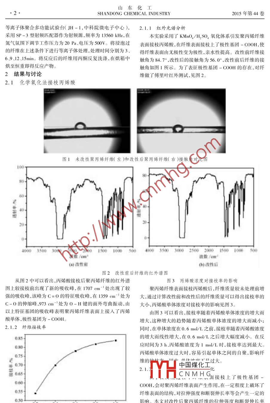 第7期馬佳晨,等:聚丙烯纖維接枝丙烯酸的表面改性硏究科研與開發(fā)聚丙烯纖維接枝丙烯酸的表面改性研究馬佳晨12,劉中偉2,張爐青12,陳曉勇3,張書香12(1.濟(jì)南大學(xué)化學(xué)化工學(xué)院山東省氟化學(xué)化工材料重點(diǎn)實(shí)驗(yàn)室,山東濟(jì)南250022;2.山東省氟材料工程技術(shù)中心,山東濟(jì)南2500223.中北大學(xué)化工與環(huán)境學(xué)院,山西太原030051摘要:以丙烯酸為接枝單體利用化學(xué)氧化接枝法和等離子體處理接枝法分別對(duì)聚丙烯纖維進(jìn)行表面改性,然后測(cè)量了改性后的聚丙烯纖維的接觸角、接枝率等性能參數(shù),并對(duì)改性前后性能進(jìn)行了比較,最后比較了兩種方法的改性效果。關(guān)鍵詞:聚丙烯纖維;表面改性;化學(xué)氧化接枝中圖分類號(hào):TQ342+.62文獻(xiàn)標(biāo)識(shí)碼:A文章編號(hào):1008-021X(201507-0001-03The Study of Surface Modification of Acrylic Acid grafted Polypropylene FiberMa Jiachen, Liu Zhongwei., Zhang Luqing, Chen Xiaoyong', Zhang Shuxiang(1. School of Chemistry and Chemical Engineering, University of Jinan, Jinan 250022, China2. Shandong Key Laboratory of Fluorine Chemistry and Chemical Engineering Materials, University of Jinan, Jinan 250022,China3. School of Materials Science and Engineering, North University of China, Taiyuan 030051, Chinamachine spinning polypropylene fiber, which chemical grafting and plasma oxidationtreatment are used to modify polypropylene fibers surface. The graft monomer is acrylic acid. Afterwards, we measured themodified polypropylene fiber contact angle, the grafting rate and other performance parameters and compare with thedification. The last,, weared the results of the two different modification methodsKey words: polypropylene fiber; surface modification; chemical oxidation graftin聚丙烯纖維分子上由于表面光滑、無極性基團(tuán),使得聚觸角測(cè)量?jī)x型號(hào)OCA40,德國(guó) Pataphysics公司;微機(jī)控制電丙烯纖維表面呈疏水性,導(dǎo)致在水泥基材料中的分散性較子萬能試驗(yàn)機(jī),美斯特工業(yè)系統(tǒng)(中國(guó))有限公司;等離子聚差口。許多學(xué)者為了改善其親水性,對(duì)聚丙烯纖維表面進(jìn)行合多功能試驗(yàn)臺(tái)型號(hào)JH-1,中科院微電子中心。了化學(xué)改性的硏究。目前在這些研究中比較成熟的方法有1.2聚丙烯纖維的化學(xué)氧化接枝丙烯酸法改性化學(xué)氧化接枝丙烯酸及等離子體處理法2-3等1)將聚丙烯纖維在丙酮中浸泡4h后用蒸餾水反復(fù)清通過化學(xué)氧化接枝法處理后的聚丙烯纖維表面接枝上洗,在真空干燥箱中烘干。了活性官能團(tuán),聚丙烯纖維的表面由光滑變得明顯粗糙,親2)稱取上述適量纖維,放進(jìn)四口燒瓶中。水性提高4-5,在水中的接觸角明顯增大;而離子體改性接(3)先加入5×10-3mol/L的KMnO4溶液50m,滴加枝丙烯酸,則是利用等離子體對(duì)聚丙烯纖維表面無定型區(qū)進(jìn)10mL一定濃度的丙烯酸溶液(濃度分別為0.2、0.4、0.6行刻蝕,在纖維表面產(chǎn)生活性基團(tuán),進(jìn)而改善聚丙烯纖維表0.8、1.0mol/L),攪拌處理30min。然后加入0.2mol/L的稀面親水性及其它性能。本文即對(duì)這兩種方法的改性條件及H12SO250ml,反應(yīng)時(shí)間為30mn,再加入4mL丙烯酸溶液結(jié)果進(jìn)行了研究在80℃下反應(yīng)3h。1實(shí)驗(yàn)部分(4)將反應(yīng)后的纖維用丙酮反復(fù)洗滌,在烘箱中烘至恒1.1實(shí)驗(yàn)原料與儀器重即得改性產(chǎn)物自制的末改性聚丙烯纖維的直徑為73μm,拉伸強(qiáng)度為1.3聚丙烯纖維的等離子體處理接枝丙烯酸法改性224MPa,斷裂伸長(zhǎng)率為17%;丙烯酸、無水乙醇、高錳酸鉀濃硫酸、丙酮均為市售分析純。中國(guó)煤化工泡1h,然后在超聲波清CNMHG箱中烘干。稱取適量上述紅外光譜儀型號(hào)IR-435,美國(guó)PE公司;全自動(dòng)視頻接纖維T一權(quán)時(shí)間。等離子體處理采用的收稿日期:2015-02-02基金項(xiàng)目:國(guó)家國(guó)際科技合作專項(xiàng)資助(2012DFA70870-3)作者簡(jiǎn)介:馬佳晨(1994—),安徽渦陽人,研究生在讀,研究方向:聚合物功能材料山東化工SHANDONG CHEMICAL INDUSTRY2015年第44卷等離子體聚合多功能試驗(yàn)臺(tái)(JH-1,中科院微電子中心),2.1.1紅外光譜分析采用SP-3型射頻匹配器作為射頻源,頻率為13560kHz,在本實(shí)驗(yàn)采用了KMnO/H2SO4氧化體系引發(fā)聚丙烯纖維氮?dú)夥諊抡{(diào)節(jié)工作壓力為20Pa、電壓為500V。將浸泡過表面接枝丙烯酸,在纖維表面接枝上了極性基團(tuán)-COOH,使的纖維在上述條件下進(jìn)行等離子體處理,處理時(shí)間分別為3、得纖維表面由無極性變?yōu)闃O性,親水性提高。改性前纖維接69、12、15mn。將反應(yīng)后的纖維用丙酮反復(fù)洗滌,在烘箱中觸角為84.7°,改性后的接觸角為56.0°,改性前后纖維的接烘至恒重即得反應(yīng)產(chǎn)物。觸角如圖1所示。為了表征極性基團(tuán)-COOH的存在,對(duì)纖2結(jié)果與討論維做了傅里葉紅外測(cè)試,見圖2。2.1化學(xué)氧化法接枝丙烯酸圖1未改性聚丙烯纖維(左)和改性后聚丙烯纖維(右)接觸角對(duì)比圖4000350030002500200015001000300取10035003000250020150010u500波數(shù)/cm2波數(shù)/cm(a)改性留(b)改性后圖2改性前后纖維的紅外譜圖從圖2中可以看出,丙烯酸接枝后聚丙烯纖維的紅外譜圖3丙烯酸濃度對(duì)接枝率的影響圖上較接枝前出現(xiàn)了新的吸收峰,在1707cm-處出現(xiàn)了較聚丙烯纖維表面接枝