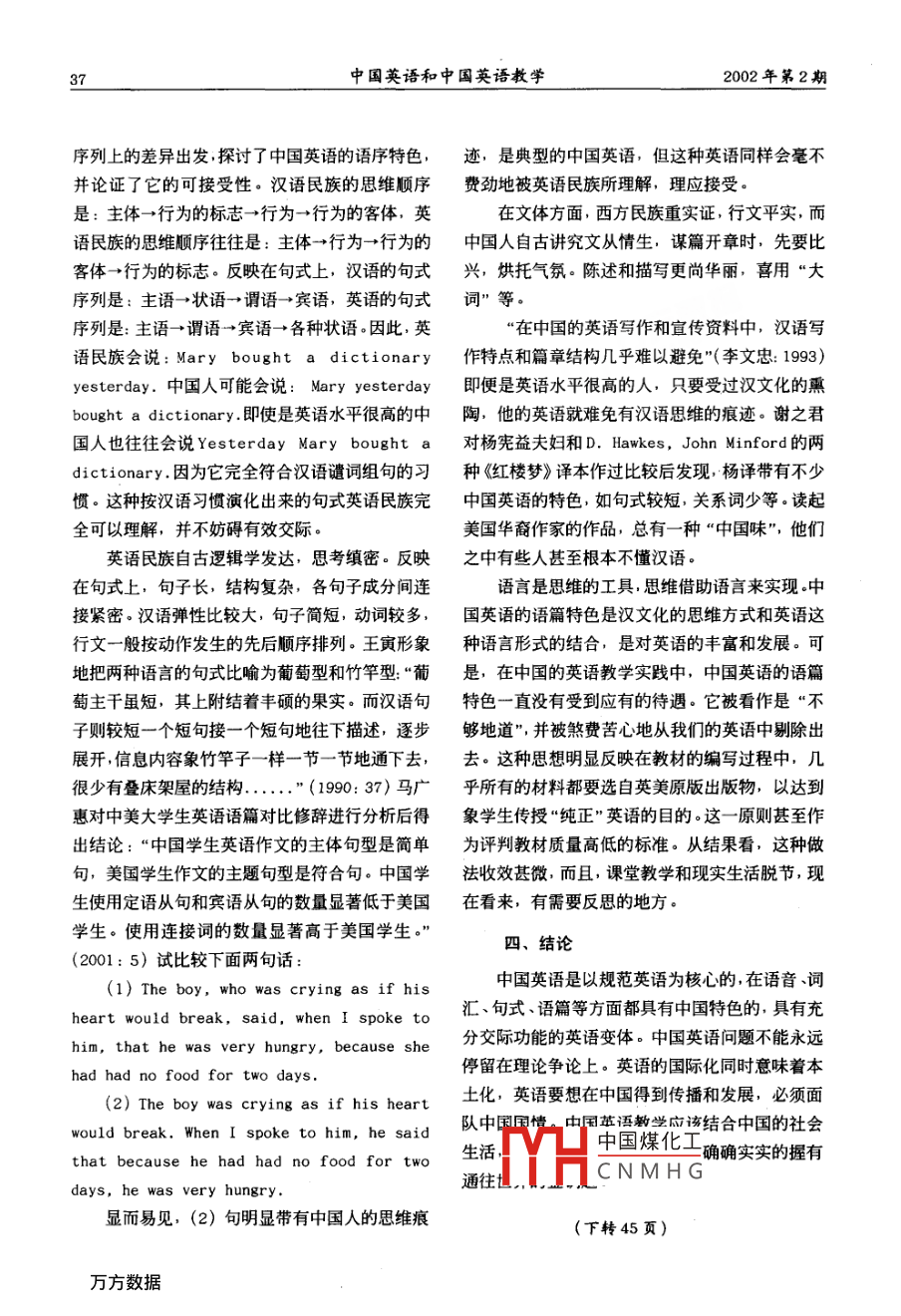 廣東外語外貿(mào)大學(xué)學(xué)報(bào)2002年第2期中國英語和中國英語教學(xué)李少華王萬平(寧夏大學(xué)外語學(xué)院·銀川·750021)內(nèi)容提要:本文回顧了圍繞中國英語問題所展開的肀論,對(duì)兩個(gè)爭論的焦點(diǎn)問題做出了自己的回答:中國英語是一種具有交際功能的變體,中國英語中的所謂漢語干擾不可避免。中國英語的語音特色與漢語的發(fā)音機(jī)制有關(guān),中國英語的詞匯特色是中國特有事物在英語中的體現(xiàn),中國英語的語篇特色由漢式思維模式所決定。英語的國際化意味著本土化。中國的英語教學(xué)應(yīng)該面向中國關(guān)鍵詞:中國英語中國英語教學(xué)中國英語問題的由來國英語界定為“中國人在中國本土上使用的、以中國英語問題作為一個(gè)理論概念提出已經(jīng)206準(zhǔn)英語為核心、具有中國特色的英語。(1991:多年了。1980年,葛傳架老先生首先指出:“無3)并指出:“中國英語是個(gè)客觀存在,它既不論在舊中國或新中國,講或?qū)懹⒄Z時(shí)都有我國所會(huì)長他人志氣、也不會(huì)滅自己威風(fēng)…(同上)兩特有的東西要表達(dá)”,如 Four Books(四書)、年后,李文忠在就“中國人在本土上使用的”和eight-1 egged essay(八股文) xiucai(秀才)“標(biāo)準(zhǔn)英語”等問題進(jìn)行討論后,對(duì)中國英語做出等等?!八羞@些英譯文都不是 Chinese新的界定:“中國英語是指以規(guī)范英語為核心、表達(dá)中國社會(huì)文化諸領(lǐng)域特有事物,不受母語干擾English或 Ching1ish,而是 China English(1980:91-92)在以后近10年里,學(xué)術(shù)界并和影響,通過音譯、借譯及語意再生諸手段進(jìn)入沒有對(duì)此給予足夠重視。80年代末,翻譯界引發(fā)英語交際,具有中國特點(diǎn)的詞匯、句式和語篇了一場關(guān)于“漢譯西化”和“西譯漢化”的辯論(1993:19)“至于中國式英語,則是指中國的英黃金棋撰文分析了“漢化英語”的出現(xiàn)和發(fā)展,語學(xué)習(xí)者和使用者由于受母語的干擾和影響,硬漢化英語’就是·帶中國特色的英語套漢語規(guī)則和習(xí)慣,在英語交際中出現(xiàn)的不合規(guī)( Chinese- colored English),它首先是正確范英語或不合英語文化習(xí)憤的畸形英語。"(同上)的,其次是帶中國色彩的,它是適應(yīng)于中國的思此后,謝之君就李文對(duì)中國英語的定義發(fā)出質(zhì)疑想方式和文明,并為中國的思想方式和文明豐富他認(rèn)為有無漢語干擾不能作為區(qū)別中國英語和中了的英語?!?1987:47)接著,孫驪(1989)概國式英語的標(biāo)準(zhǔn)?,F(xiàn)階段所謂中國英語就是受到括介紹了英語在世界范圍內(nèi)的使用,英語國別變漢語語言和文化影響的英語?!叭藶榈刈屩袊Ⅲw的研究思路,提出了“中國使用的英語”、“中語‘登堂入室’與美國英語和英國英語相提并論國化英語”、“中國人的英語”等問題,雖然沒有是不客觀的,也是不現(xiàn)實(shí)的,容易引起理論和實(shí)使用“中國英語”一詞,但實(shí)際上提出了對(duì)中國踐上的混亂?!?1995:10)張培成也表達(dá)了相同英語的理論界定問題。90年代初,榕培首先把中的觀點(diǎn)。此外,他還按照B.B. Kachru提出的中國煤化工收稿日期:2002-3-18CNMHG作者簡介:李少華,寧夏大學(xué)外語學(xué)院副教授,研究生,主要從事英語教學(xué)法研究;王萬平,寧夏石嘴山九中英語教師2002年第2期中國英語和中國英語教學(xué)得到許多學(xué)者認(rèn)同的標(biāo)準(zhǔn),從英語變體的功能出“只要它在該國長期地廣泛使用,并且具有一定的發(fā),把中國英語劃分為“使用型變體”當(dāng)?shù)靥攸c(diǎn),都可以視做英語的一種國別變體。( performance variety)或是“作為外語的變體”,(1991:2)謝之君卻認(rèn)為:“中國英語的研究和其而不是“制度體,"( institutionalized variety)他理論研究一樣,不應(yīng)該從定義開始,而是應(yīng)從因此認(rèn)為簡單籠統(tǒng)的提出中國英語有可能導(dǎo)致理問題開始?!?1995:10)目前看來,以榕培為代表論上的混亂。時(shí)隔三年,杜爭鳴就中國英語和中的對(duì)中國英語持肯定態(tài)度的觀點(diǎn)明顯占了上風(fēng)國式英語中的漢語干擾問題發(fā)表了自己的看法:首先,他們有社會(huì)語言學(xué)的理論支持。近些年來中國英語是一種群體語言特征,具有相對(duì)的穩(wěn)定國際上對(duì)英語的標(biāo)準(zhǔn)問題一直存在爭論,雖然有性,其中漢語成分或漢語思維模式的介入是有意人對(duì)“英語危機(jī)”表示擔(dān)優(yōu),但要求英語“多標(biāo)識(shí)的,且負(fù)遷移被壓到最低量,而后者卻相反中準(zhǔn)”的呼聲越來越高,英語的多標(biāo)準(zhǔn)已是有目共國英語不應(yīng)該被與那種佶屈聱牙的中國式英語混睹的事實(shí),許多國家紛紛宣布自己的英語“獨(dú)立”為一談。他認(rèn)為中國英語是中國文化的一部分,并把它看作是與英國英語和美國英語地位相等的因此,某些所謂的“干擾”實(shí)際上是無法排除的。變體,英國英語或美國英語君臨天下的時(shí)代已不中國英語中所謂的漢語干擾反映了中國人的語言復(fù)存在。據(jù)姜亞軍介紹,1992年出版的《牛津英習(xí)慣和思維習(xí)慣,是中國特有文化的一部分,與語指南》( The Oxford Companion to the english中國英語能否被接受或認(rèn)可沒有直接的關(guān)系。” Language)