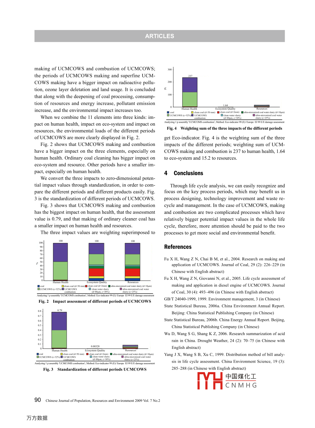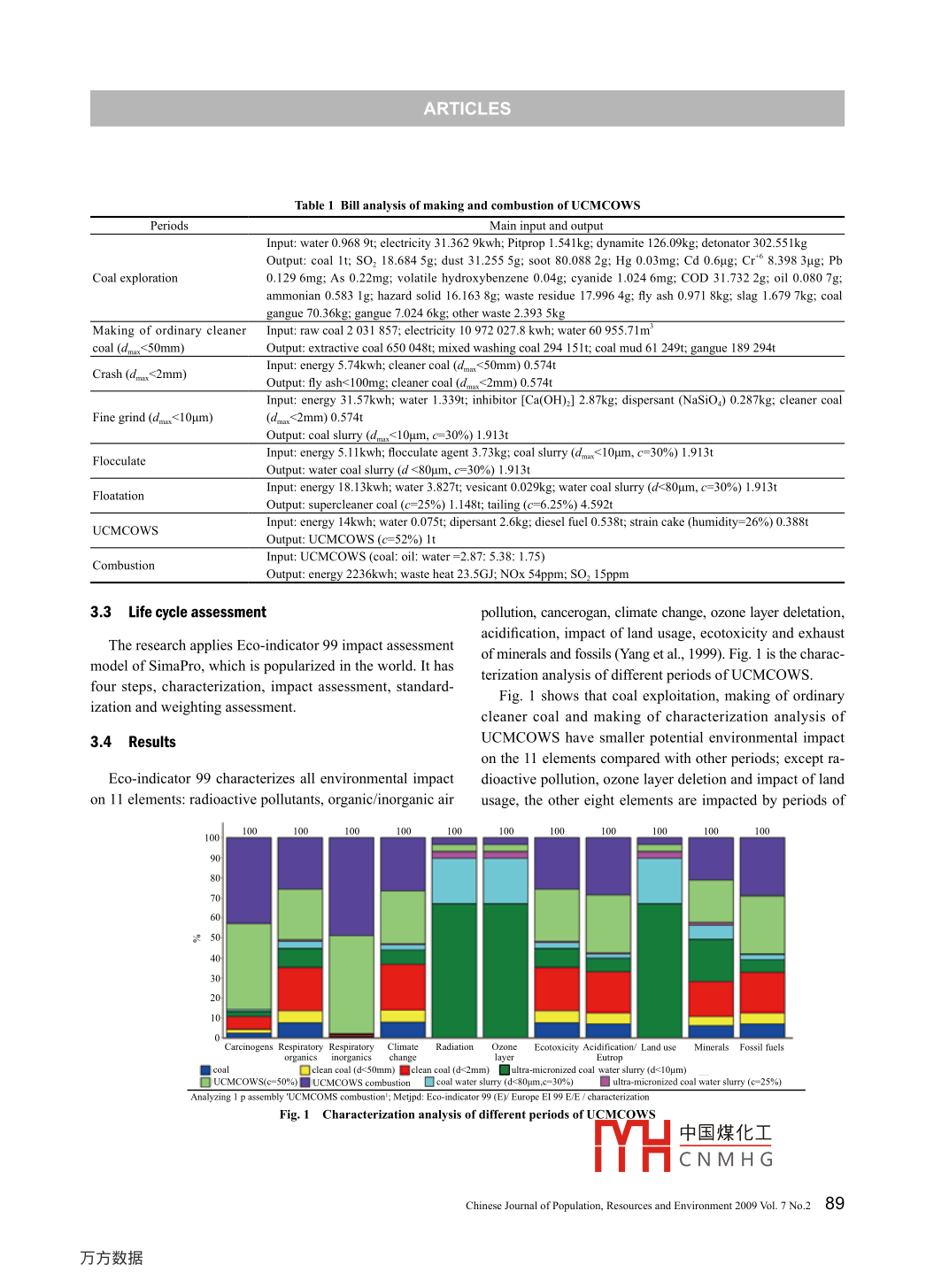 ARTICLESLife cycle Assessment of Ultra-clean MicronizedCoal oil Water SlurryJi mir1. Environmental Science and Engineering Academy, Shandong University, Jinan Shandong 250013, China2. Shandong Society for Environmental Sciences, Jinan Shandong 250100, ChinaAbstract: Life cycle assessment is applied to assess the ultra- ing, packaging, transportation, consumption, recycle and finalclean micronized coal oil water slurry (UCMCoWS)with Si- disposition. The basic construction of lCa came down to fourmaPro and the environmental impact of UCMCOWS on its whole related parts: objective and range, bill analysis, impact assess-life cycle is also analyzed. The result shows that the consumption ment, result explanation by SETAC in 1993(GB/T, 1999)of energy and products are increasing along withUCMCOWS processing, UCMCOWS making and combustion are Research methodsthe two periods which have a bigger impact on eco-system and human health. as a new substitute of fuel. UCMcoWS merits to beThe research applies SimaPro to LCa to analyze theutilized more efficiently and reasonablyresources consumption and pollutant emission in the wholeKey words: ultra-clean micronized coal oil water slurry, life cycle life duration of UCMcoWS made in UCMCOWS Makingand Combustion Lab of China Mining University, recognizeItsdegree in different life periods, define the1 Introductionimpact elements, and provide more options for technologyimprovement and cleaner productionEnvironmental problems are interrelated withand resources are not only involved in energy supply, but 3.1 Confirmation of objective and rangealso ths of environmental impact( Wu et al2006). More consideration of environmental impact hasThe objective is to recognize and analyze the environmenbeen given to the end treatment of products in the past yeartal impact of UCMCOWS in its different life periods. Theand environmental load of product disposition is used to asfe cycle of UCMCOWS includes exploitation of raw coal,sess its environmental impact. The management of industrialUCMCOWS producombustion in dieselwastes pas much attention to pollution conditions during its engine and all other life activities. The system boundary inprocess while the pollution before and after is neglectedvolves all processes theoretically, but we confine the systemLife cycle assessment(LCA) is applied to assessing theoundary to exploitation of raw coal, coal cleaning, UCMimpact of the whole life cycle of the ultra-clean micronized cowS producing, combustion in diesel engine and residualcoal oil water slurry(UCMCOwS) with SimaPro in thiscoal combustion, due to lab limitation( Fu et al., 2004; 2005)article. which provides complete information for the poten- 3.2 Bill analysistial interaction of resources application and environmentalproblems. The information used in green product design is The data were collected from production report of Yanpromising in environmental protection and human healthhou Mining Group of Shandong, China Environmental Annual Report(State Statistical Bureau, 2006a)and China En-2 Conception and frame of LCAergy Annual Report(State Statistical Bureau, 2006b). Thedata of making and combustion of UCMCOWS came fromLife cycle assessment is described as a kind of analysis and lab tests and analysis. Table I is the bill analysis of makingassessment of resources and environment for the whole pro- and combustion of UCMCOWS, while the bill analysis ofcess of a product, including its collection, processing, produc- other periodsis omitted中國煤化工Corresponding author; Ji Ming jiming@sdein. gov. cTHaCNMHGChinese Journal of Population, Resources and Environment 2009 VoL 7 No. 2ARTICLESTable 1 Bill analysis of making and combustion of UCMCowsMain input and outputOutput: coal It; So, 18.684 5g; dust 31.255 5g; soot 80.088 2g: Hg 0.03mg: Cd 0.6ug: Cr 8.398 3ug: Pb129 6mg: As 0. 22mg; volatile hydroxybenzene 0.04g: cyanide 1.024 6mg; COD 31.732 2g: oil 0.080 7gammonian 0.583 Ig: hazard solid 16. 163 8g; waste residue 17.996 4g: fly ash 0.971 8kg; slag 1.679 7kg; coalangue 7036kg; gangue 7.024 6kg; other waste 2.393 5kglaking of ordinary cleaner Input: raw coal 2 031 857; electricity 10972027 8 kwh; water 60 955.7ImOutput: extractive coal 650 048t; mixed washing coal 294 15It; coal mud 61 249t; gangue 189 294tCrash(dma <2mm)Input: energy 5.74kwh; cleaner coal (dma<50mm)0.574tOutput: fly ash<100mg; cleaner coal(dmax < 2mm)0.574tInput: energy 31.57kwh; water 1.339t; inhibitor [Ca(OH)] 2.87kg; dispersant(NaSiO4)0.287kg: cleaner coalFine grind(dmax<10um(dmax 2mm)0.574tOutput: coal slurry (dma<10um, c=30%)1.913tFlocculateInput: energy 5. 1lkwh; flocculate agent 3.73kg; coal slurry (dmax