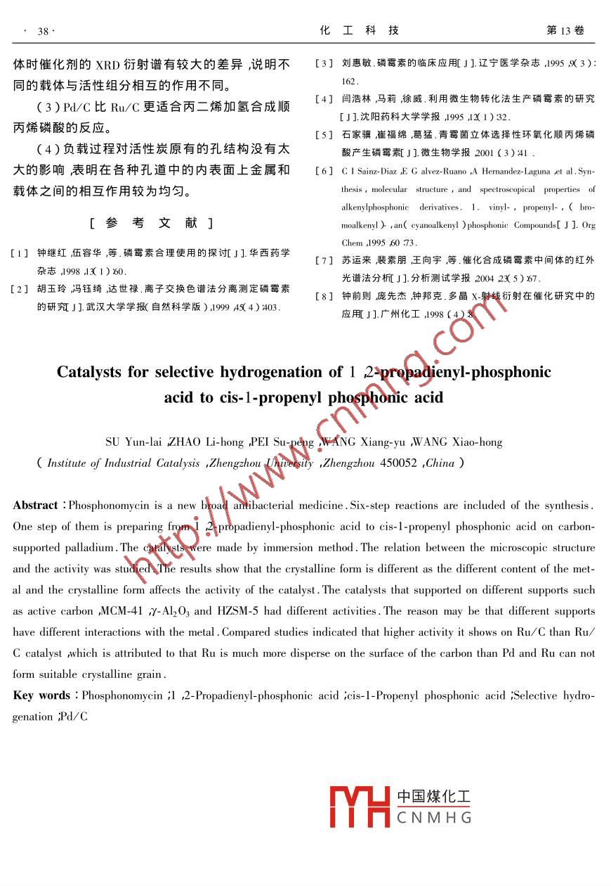 科研開發(fā)化工科技200515)34~38SCIENCE TECHNOLoGY IN CHEMICAL INdustry丙二烯磷酸選擇加氬制丙烯磷酸催化劑蘇運(yùn)來趙立紅裴素朋王向宇王曉紅鄭州大學(xué)工業(yè)催化研究所河南鄭州450052)摘要膦磷霉素是一種新型的廣譜抗菌藥,它的合成一般包括六步反應(yīng)其中由丙二烯磷酸制備丙烯磷酸是以P/C作為催化劑。筆者利用浸漬法制備了一系列活性組分質(zhì)量分?jǐn)?shù)不同的催化劑結(jié)果發(fā)現(xiàn)活性組分負(fù)載量越高催化劑的活性越好因?yàn)榻M分質(zhì)量分?jǐn)?shù)高金屬在載體表面能夠形成一定均勻大小的晶粒影響到活性的大小考察了不同的載體活性炭、MCM-4l、γ-Al2O3和HSM-5結(jié)果發(fā)現(xiàn)活性炭作為載體的催化劑性能好不同載體與活性組分形成的晶型不同,從而影響其加氫的活性渚察了釕和鈀兩種活性組分結(jié)結(jié)果發(fā)現(xiàn)鈀比釕的性能好,可能是由于金屬釕在載體活性炭上的分布較彌散不能形成較大的晶粒即以非晶態(tài)存在活性低。關(guān)鍵詞潾霉素丙二烯磷酸丙烯磷酸選擇加氬;l中圖分類號(hào):TQ460.32文獻(xiàn)標(biāo)識(shí)碼:A文章編號(hào):10080511(20055-003405磷霉素(-)R2S- epoxypropylphosphonic acid,工業(yè)合成大致可分為六步。其中丙二烯磷酸選擇Fosfomycin , FOM是一種新型的廣譜抗菌藥,1969加氫制得順式丙烯磷酸以及它的環(huán)氧化是兩個(gè)關(guān)年由西班牙土壤中分離得到的新霉素菌中產(chǎn)生,鍵的反應(yīng)對(duì)于加氫反應(yīng)目前國(guó)內(nèi)外均使用鈀負(fù)中國(guó)于1972年合成成功20世紀(jì)80年代用于臨載在活性炭上作為催化劑。床1它是一種扣制細(xì)菌細(xì)胞壁合成的臨床常用作者根據(jù)影響催化劑催化活性的幾個(gè)因素,的重要廣譜抗生素2.由于它是一類獨(dú)特的廣譜分別考察不同的活性組分不同的載體以及活性抗生素近年來被各大中小醫(yī)院普遍認(rèn)識(shí)在我國(guó)組分不同含量的影響制備出一系列的催化劑用醫(yī)藥工業(yè)中占有重要位置已經(jīng)建立的分析方法對(duì)產(chǎn)物進(jìn)行分析。磷霉素是自成一派的抗生素,它既不是β-內(nèi)催化劑的催化活性和其結(jié)構(gòu)有很大的關(guān)系酰膠類又不是四環(huán)素類,既不是大環(huán)內(nèi)脂類又不作者通過晶體射線衍射(ⅹRD)程序升溫還原是氨基糖類而是一種全新范疇的廣譜抗生素被(TPR)比表面及孔徑分布(BE)等表征方法對(duì)世界譽(yù)為21世紀(jì)的保留產(chǎn)品。目前我國(guó)有生產(chǎn)所研究的催化劑進(jìn)行微觀結(jié)構(gòu)分析以期得到催能力的廠家只有東北制藥總廠和上海新亞藥廠,化活性和結(jié)構(gòu)之間的關(guān)系。年生產(chǎn)能力近百噸僅東北制藥廠總廠全年生產(chǎn)近90t其中少部分出囗1實(shí)驗(yàn)部分般來講磷霉素的合成主要分為工業(yè)合成1.1催化劑的制備法和微生物發(fā)酵法4。由于目前微生物合成法還所用載體為已做前期處理的椰殼活性炭,其不夠成熟還只是處于研究階段5所以盡管用化顆學(xué)環(huán)氧化法合成磷霉素有諸多不利之處但是工中國(guó)煤化工比表面積相差不大業(yè)上還只能用化學(xué)全合成的方法來得到磷霉素的CNMHG去。PC用鹽酸加熱外消旋體經(jīng)化學(xué)拆分得到磷霉素6。磷霉素的溶解制成一定濃度的H2PC4溶液。在處理過的活性炭中加入蒸餾水水浴加熱,邊攪拌邊加收稿日期2005-06-10H2PlCl4溶液調(diào)節(jié)吸附的pH值噘吸附一段時(shí)間作者簡(jiǎn)介蘇運(yùn)來1963-)男河南商城人鄭州大學(xué)教后加入NaOH溶液調(diào)節(jié)還原前的pH值再滴加第5期蘇運(yùn)來簿等丙二烯磷酸選擇加氫制丙烯磷酸催化劑HCHO溶液進(jìn)行還原控制還原溫度和還原時(shí)間。1.3.2催化劑比表面的測(cè)定結(jié)束后靜置過濾并用水洗固相至中性烘干濾大多數(shù)催化劑的活性與其表面及其內(nèi)部的結(jié)液要經(jīng)過分光光度計(jì)分析對(duì)照標(biāo)準(zhǔn)曲線來得到構(gòu)有很大的關(guān)系。利用比表面分析儀對(duì)所用的催未負(fù)載上去的貴金屬的含量,進(jìn)而反過來得到實(shí)化劑進(jìn)行比表面及孔徑分布的分析,可以為其催際的活性組分的負(fù)載量。化活性提供必要的結(jié)構(gòu)解釋。按照同樣的制備條件(即吸附溫度為313K吸催化劑的表面積和孔結(jié)構(gòu)采用美國(guó)Quan附時(shí)間為6.0h吸附pH值為2.0還原劑量為理論 tanchrome nova1000c型N2物理吸附儀測(cè)定,77量的10倍還原溫度為353K還原pH值為8.0還KN2吸附連續(xù)流動(dòng)法N2作載氣。表面積的計(jì)原時(shí)間為2.0h)分別制備了Pd的質(zhì)量分?jǐn)?shù)為算采用BET公式根據(jù)N2吸附的5個(gè)點(diǎn)數(shù)據(jù)進(jìn)行0.01%,0.05%,1.00%,3.00%,5.00%,7.00%,計(jì)算亂孔分布的測(cè)定采用BJH方法根據(jù)32個(gè)點(diǎn)9.00%的一系列催化劑樣品的編號(hào)為1#~7#。的數(shù)據(jù)由等溫線的脫附分支進(jìn)行計(jì)算。按照同樣的制備條件活性組分Pd質(zhì)量分?jǐn)?shù)1.3.3催化劑的H2-TPR測(cè)定均為5%,更換不同的載體,分別為MCM-41、γ-ST-03表面孔徑測(cè)定儀主機(jī)改裝后作熱導(dǎo)檢A2O3和HSM15制備一系列的催化劑樣品編號(hào)測(cè)SKW-110型智能程序控溫儀和井式電爐控溫為8#U形石英管作反應(yīng)器,后接3A分子篩脫水,LM按照同樣的制備條件載體仍為