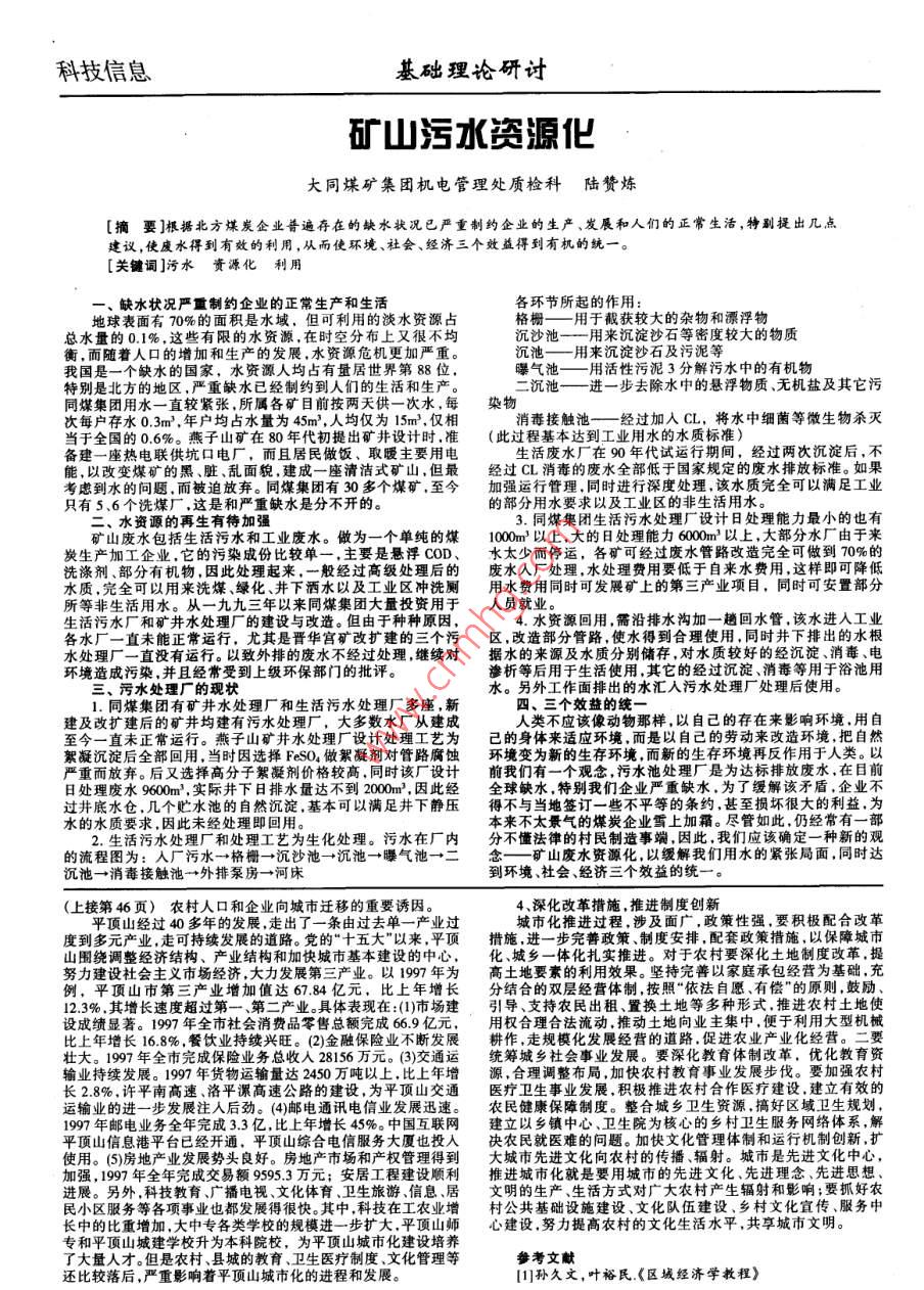 科技信息基礎(chǔ)理論研討礦山污水資源化大同煤礦集團(tuán)機(jī)電管理處質(zhì)檢科陸贊煉[摘要]根據(jù)北方煤炭企業(yè)普遍存在的缺水狀況已嚴(yán)重制約企業(yè)的生產(chǎn)、發(fā)展和人們的正常生活,特副提出幾點(diǎn)建議,使廢水得到有效的利用,從而使環(huán)境、社會(huì)、經(jīng)濟(jì)三個(gè)效益得到有機(jī)的統(tǒng)一[關(guān)鍵詞]污水資源化利用缺水狀況嚴(yán)重制約企業(yè)的正常生產(chǎn)和生活各環(huán)節(jié)所起的作用地球表面有70%的面積是水域,但可利用的淡水資源占格柵——用于截獲較大的雜物和漂浮物總水量的0.1%,這些有限的水資源,在時(shí)空分布上又很不均沉沙池一一用來(lái)沉淀沙石等密度較大的物質(zhì)著人口的增加和生產(chǎn)的發(fā)展,水資源危機(jī)更加嚴(yán)重。沉池—用來(lái)沉淀沙石及污泥等曝氣池一用活性污泥3分解污水中的有機(jī)物特別是北方的地區(qū),嚴(yán)重缺水已經(jīng)制約到人們的生活和生產(chǎn)。二沉池—進(jìn)一步去除水中的懸浮物質(zhì)、無(wú)機(jī)鹽及其它污同煤集團(tuán)用水一直較緊張,所屬各礦目前按兩天供一次水,每染物次每戶存水03m3,年戶均占水量為45m3,人均僅為15m3,僅相消毒接觸池一—經(jīng)過(guò)加入CL,將水中細(xì)菌等微生物殺滅當(dāng)于全國(guó)的06%。燕子山礦在80年代初提出礦井設(shè)計(jì)時(shí)準(zhǔn)(此過(guò)程基本達(dá)到工業(yè)用水的水質(zhì)標(biāo)準(zhǔn))備建一座熱電聯(lián)供坑口電廠,而且居民做飯、取暖主要用電生活廢水廠在90年代試運(yùn)行期間,經(jīng)過(guò)兩次沉淀后,不能,以改變煤礦的黑、臟、亂面貌建成一座清潔式礦山,但最經(jīng)過(guò)CL消毒的廢水全部低于國(guó)家規(guī)定的廢水排放標(biāo)準(zhǔn)。如果考慮到水的問(wèn)題,而被迫放棄。同煤集團(tuán)有30多個(gè)煤礦,至今加強(qiáng)運(yùn)行管理,同時(shí)進(jìn)行深度處理,該水質(zhì)完全可以滿足工業(yè)只有5、6個(gè)洗煤廠,這是和嚴(yán)重缺水是分不開(kāi)的。的部分用水要求以及工業(yè)區(qū)的非生活用水。礦山廢水包括生活污水和工業(yè)廢水。做為一個(gè)單純的煤100m3以上,大的日處理能力600mx3以上,大部分水廠由于來(lái)炭生產(chǎn)加工企業(yè),它的污染成份比較單一,主要是懸浮COD、水太少而停運(yùn),各礦可經(jīng)過(guò)廢水管路改造完全可做到70%的洗滌劑、部分有機(jī)物,因此處理起來(lái),一般經(jīng)過(guò)高級(jí)處理后的廢水人廠處理,水處理費(fèi)用要低于自來(lái)水費(fèi)用,這樣即可降低水質(zhì),完全可以用來(lái)洗煤、綠化、井下灑水以及工業(yè)區(qū)沖洗廁用水費(fèi)用同時(shí)可發(fā)展礦上的第三產(chǎn)業(yè)項(xiàng)目,同時(shí)可安置部分所等非生活用水。從一九九三年以來(lái)同煤集團(tuán)大量投資用于人員就業(yè)生活污水廠和礦井水處理廠的建設(shè)與改造。但由于種種原因4.水資源回用,需沿排水溝加一趟回水管,該水進(jìn)入工業(yè)各水廠一直未能正常運(yùn)行,尤其是晉華宮礦改擴(kuò)建的三個(gè)污區(qū),改造部分管路,使水得到合理使用,同時(shí)井下排出的水根水處理廠一直沒(méi)有運(yùn)行。以致外排的廢水不經(jīng)過(guò)處理,繼續(xù)對(duì)據(jù)水的來(lái)源及水質(zhì)分別儲(chǔ)存,對(duì)水質(zhì)較好的經(jīng)沉淀、消毒、電環(huán)境造成污染,并且經(jīng)常受到上級(jí)環(huán)保部門(mén)的批評(píng)。滲析等后用于生活使用,其它的經(jīng)過(guò)沉淀、消毒等用于浴池用污水處理廠的現(xiàn)狀水。另外工作面排出的水匯人污水處理廠處理后使用。1.同煤集團(tuán)有礦井水處理廠和生活污水處理廠多座,新四、三個(gè)效益的統(tǒng)建及改擴(kuò)建后的礦井均建有污水處理廠,大多數(shù)水廠從建成人類不應(yīng)該像動(dòng)物那樣,以自己的存在來(lái)影響環(huán)境,用自至今一直未正常運(yùn)行山礦井水處理廠設(shè)計(jì)處理工藝為己的身體來(lái)適應(yīng)環(huán)境,而是以自己的勞動(dòng)來(lái)改造環(huán)境,把自然絮凝沉淀后全部回用,當(dāng)時(shí)因選擇FesO做絮凝劑對(duì)管路腐蝕環(huán)境變?yōu)樾碌纳姝h(huán)境而新的生存環(huán)境再反作用于人類。以嚴(yán)重而放棄。后又選擇高分子絮凝劑價(jià)格較高,同時(shí)該廠設(shè)計(jì)前我們有一個(gè)觀念,污水池處理廠是為達(dá)標(biāo)排放廢水,在日前日處理廢水9600m3,實(shí)際井下日排水量達(dá)不到2000m3,因此經(jīng)全球缺水,特別我們企業(yè)嚴(yán)重缺水,為了緩解該矛盾,企業(yè)不過(guò)井底水倉(cāng),幾個(gè)貯水池的自然沉淀,基本可以滿足井下靜壓得不與當(dāng)?shù)睾炗喴恍┎黄降鹊臈l約,基至損壞很大的利益,為本來(lái)不太景氣的煤炭企業(yè)雪上加霜。盡管如此,仍經(jīng)常有一部2.生活污水處理廠和處理工藝為生化處理。污水在廠內(nèi)分不懂法律的村民制造事端,因此我們應(yīng)該確定一種新的觀的流程圖為:入廠污水→格柵→沉沙池→沉池→曝氣池→二念—礦山廢水資源化,以緩解我們用水的緊張局面,同時(shí)達(dá)沉池→消毒接觸池→外排泵房→河床到環(huán)境、社會(huì)、經(jīng)濟(jì)三個(gè)效益的統(tǒng)一。(上接第46頁(yè))農(