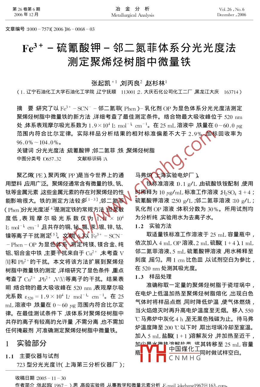 Fe3+-硫氰酸鉀-鄰二氮菲體系分光光度法測定聚烯烴樹脂中微量鐵