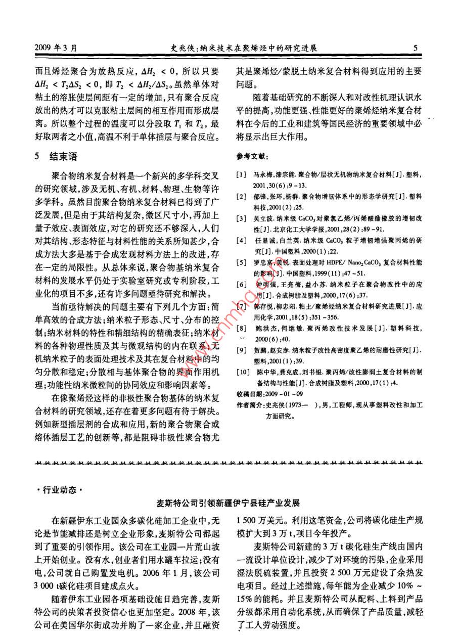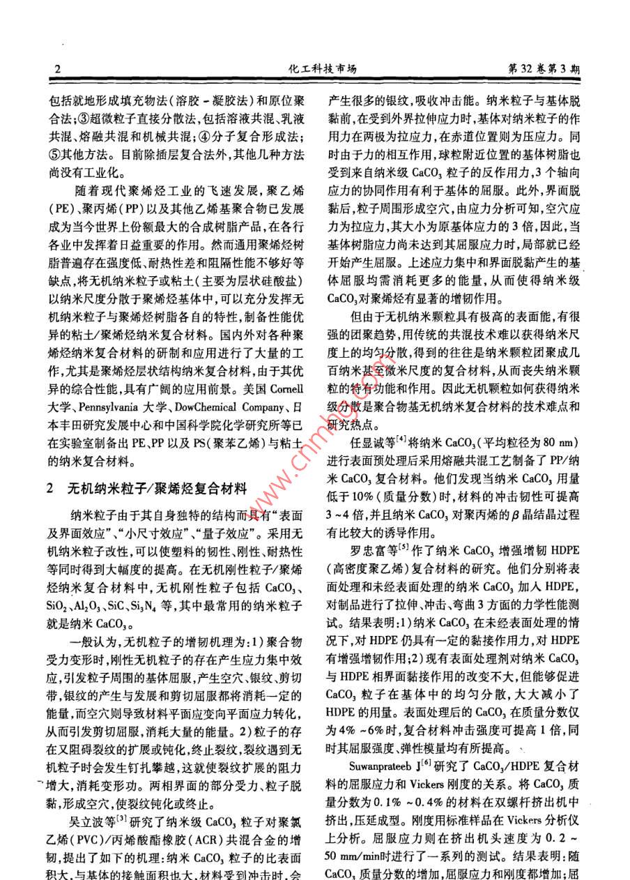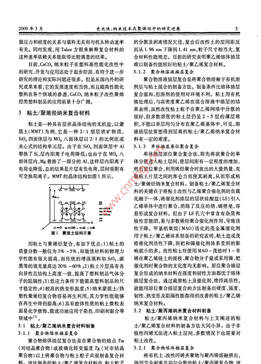 第32卷第3期化工科技市場(chǎng)2009年3月CHEMICAL TECHNOLOGY MARKET發(fā)展論壇納米技術(shù)在聚烯烴中的研究進(jìn)展史兆俠(中國(guó)石化股份有限公司北京燕山分公司塑料分公司,北京102500)摘要:綜述了 聚烯烴納米復(fù)合材料的優(yōu)點(diǎn)使用價(jià)值和近年來(lái)國(guó)內(nèi)外聚烯烴納米復(fù)合材料的研究進(jìn)展,并介紹了無(wú)機(jī)粒子/聚烯烴復(fù)合材料和粘土/聚烯烴復(fù)合材料,重點(diǎn)闡述了粘土與聚乙烯、聚丙烯納米復(fù)合材料的制備方法及粘土/聚烯烴納米復(fù)合材料插層熱力學(xué)分析,對(duì)目前聚烯烴納米復(fù)合材料存在問(wèn)題及發(fā)展前景進(jìn)行了探討。關(guān)鍵詞:粘土;聚烯烴;納米復(fù)合材料中圖分類(lèi)號(hào):TB33文獻(xiàn)標(biāo)識(shí)碼:A文章編號(hào):1009 -4725(2009)03 -0001 -05Advance in nano technology in polyolefinShi Zhaoxia(Pastic Company. ,Bejing Yanhua Petrochemical Co. ,ld. ,SINOPEC ,ejing 102500,China)were reviewed. Inorganic particle/ polyolefn nanocomposites and clay/ polyolefin nanocomposites were introduced. Prepara-tion of clay/PE,clay/PP nanocomposites , and intercalation thermodynamic analysis were elaborated. Existed problems anddeveloping prospect were discused.Key words:clay;polyolefin;nanocomposite增加塑料的密度,提高塑料的透光性、防水性、阻隔1聚合物納米復(fù) 合材料概述性、耐熱性及抗老化性等功能特性,納米塑料在食品納米復(fù)合材料指復(fù)合物的分散相至少有一相的特別是啤酒灌裝、肉類(lèi)和奶酪制品的包裝材料市場(chǎng)一維尺寸達(dá)到納米級(jí)(1 ~ 100 nm)的材料,它被稱(chēng).上潛力巨大。為21世紀(jì)最有前途的材料之一一。聚合物納米復(fù)合目前報(bào)道的聚合物納米復(fù)合材料分為兩大類(lèi),材料的研究起步較晚,但近年來(lái)發(fā)展迅速,引起高分一是與聚合物復(fù)合前粒子本身就是納米粒子,通過(guò)子科學(xué)領(lǐng)域的廣泛關(guān)注。對(duì)其改性,減少其團(tuán)聚的機(jī)會(huì),使粒子能夠在聚合物聚合物納米復(fù)合材料是以聚合物為基體(連續(xù)連續(xù)相中以納米級(jí)尺寸分散,最終得到納米復(fù)合材相)、無(wú)機(jī)粒子以納米尺度( < 100 nm)分散于基體料;二是與聚合物復(fù)合的材料是天然結(jié)構(gòu)為層狀的中的新型高分子復(fù)合材料。由于納米粒子的顆粒尺無(wú)機(jī)物,如蒙脫土、高嶺土等,在復(fù)合前粘土尺寸為寸很小、比表面積很大,約為100 m/g左右,具有表微米級(jí),通過(guò)對(duì)其有機(jī)化處理,使它的層狀結(jié)構(gòu)間距面效應(yīng)、體積效應(yīng)、量子尺寸效應(yīng)及宏觀量子隧道效變大,層狀穩(wěn)定性變差,與聚合物復(fù)合時(shí),聚合物或應(yīng),且聚合物具有密度低、強(qiáng)度高、耐腐蝕、易加工等其單體能夠進(jìn)人到粘土的片層之間,通過(guò)聚合或剪諸多優(yōu)良特性,以及納米粒子帶來(lái)的納米效應(yīng)和納切破壞粘土的層狀結(jié)構(gòu),將其剝離成納米級(jí)的片層,米粒子與基體間的界面相互作用,使聚合物納米復(fù)無(wú)規(guī)或簡(jiǎn)單有序地分散在聚合物連續(xù)相,最終得到合材料具有優(yōu)于相同組分常規(guī)聚合物復(fù)合材料的力納米復(fù)合材料。學(xué)、熱學(xué)性能,為制備高性能、多功能的新--代復(fù)合聚合物納米復(fù)合材料的制備方法歸納起來(lái)可分材料提供了可能,其在汽車(chē)及機(jī)械零部件、電子和電為以下5大類(lèi):①插層復(fù)合法,包括單體插人后聚合器部件、高性能管材、薄膜等領(lǐng)域中具有廣闊的應(yīng)用法(含插層縮聚和插層加聚)和聚合物插人法(含聚首縣2化工科技市場(chǎng)第32卷第3期包括就地形成填充物法(溶膠一凝膠法)和原位聚產(chǎn)生很多的銀紋,吸收沖擊能。納米粒子與基體脫合法;③超微粒子直接分散法,包括溶液共混、乳液黏前,在受到外界拉伸應(yīng)力時(shí),基體對(duì)納米粒子的作共混、熔融共混和機(jī)械共混;④分子復(fù)合形成法;用力在兩極為拉應(yīng)力,在赤道位置則為壓應(yīng)力。同⑤其他方法。目前除插層復(fù)合法外,其他幾種方法時(shí)由于力的相互作用,球粒附近位置的基體樹(shù)脂也尚沒(méi)有工業(yè)化。受到來(lái)自納米級(jí)CaCO3粒子的反作用力,3個(gè)軸向隨著現(xiàn)代聚烯烴工業(yè)的飛速發(fā)展,聚乙烯應(yīng)力的協(xié)同作用有利于基體的屈服。此外,界面脫(PE)、聚丙烯(PP)以及其他乙烯基聚合物已發(fā)展黏后,粒子周?chē)纬煽昭?,由?yīng)力分析可知,空穴應(yīng)成為當(dāng)今世界上份額最大的合成樹(shù)脂產(chǎn)品,在各行力為拉應(yīng)力,其大小為原基體應(yīng)力的3倍,因此,當(dāng)各業(yè)中發(fā)揮著日益重要的作用。然而通用聚烯烴樹(shù)基體樹(shù)脂應(yīng)力尚未達(dá)到其屈服應(yīng)力時(shí),局部就已經(jīng)脂普遍存在強(qiáng)度低、耐熱性差和阻隔性能不夠好等開(kāi)始產(chǎn)生屈服。上述應(yīng)力集中和界面脫黏產(chǎn)生的基缺點(diǎn),將無(wú)機(jī)納米粒子或粘土(主要為層狀硅酸鹽)體屈服均需消耗更多的能量,從而使得納米級(jí)以納米尺度分散于聚烯烴基體中,可以充分發(fā)揮無(wú)CaCO,對(duì)聚烯烴有顯著的增韌作用。機(jī)納米粒子與聚烯烴樹(shù)脂各自的特性,制備性能優(yōu)但由于無(wú)機(