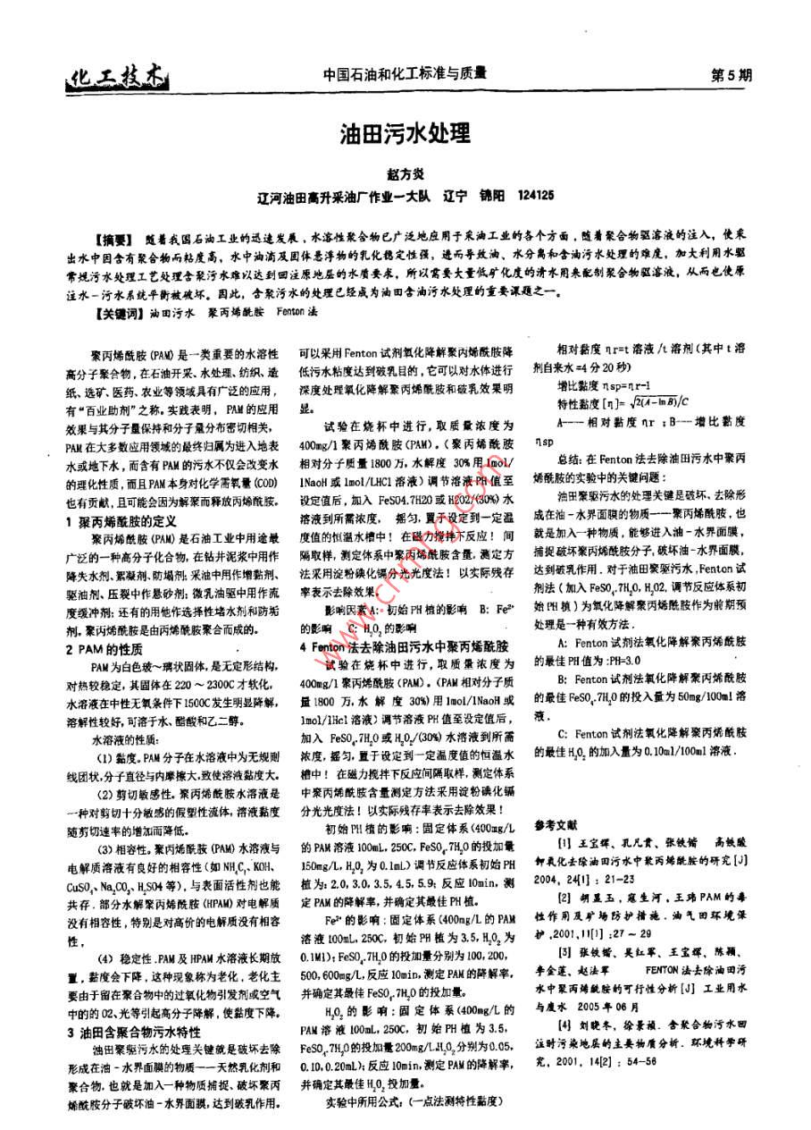 代化工技本中國石油和化工標準與質(zhì)量第5期油田污水處理起方炎遼河油田高升采油廣作業(yè)一大隊遼寧錦陽124125【擴要】隨著我國石油工業(yè)的迅速發(fā)順,水涫性聚合物已廣泛地應用于采滷工業(yè)的各個方面,隨著聚合物驅(qū)溶液的注入,使皋出水中因含有聚合物而粘度高,水中淌及固體悉物的乳化定性強,而導致油、水分島和含油污水處理的難度,加大利用水驅(qū)常規(guī)污水處理工藝處理含聚污水難以達到圓注原地屈的水要求,所以需要大量低礦化度的清水用來配制聚合物驅(qū)溶液,從而也使注水-污水系統(tǒng)平斷被破壞。因此,含聚污水的處理已經(jīng)威為油田合油污水處理的重要課題之【關鍵詞】油田污水鞏丙烯酰胺Fe0m法聚丙烯酰肢(PAM0是一類重要的水溶性可以采用 Fenton試劑氧化降解聚內(nèi)烯酰肢降相對黏度nr=t溶液/t溶劑(其中t溶高分子聚合物,在石油開采水處理、紡織造低污水粘度達到破乳目的,它可以對水體進行劑自來水難4分20秒紙、選礦醫(yī)藥,農(nóng)業(yè)等領域具有廣泛的應用,深度處理氧化降解聚丙烯酰胺和破乳效果明增比黏度nsp=nr-1有“百業(yè)助劑”之稱實踐表明,PM的應用顯特性黏度[n=2(-hmb)/c效果與其分子量保持和分子量分布密切相關,試驗在燒杯中進行,取質(zhì)量濃度為A相對黏度nr;B-增比黏度PAM在大多數(shù)應用領域的最終歸屬為進入地表400mg/1聚丙烯酰胺(PAM),(聚丙烯酰胺nsp水或地下水,而含有PAM的污水不僅會改變水相對分子質(zhì)量1800萬,水解度30%用Imol總結(jié):在 Fenton法去除油田污水中聚丙的理化性質(zhì),而且PAM本身對化學需氫量(C0D)1Nao或lmol/LCl溶液)調(diào)節(jié)溶液陽值至烯酰肢的實驗中的關鍵問題也有更獻,且可能會因為解聚而釋放丙烯酰按,設定值后,加入Fes04.720或202/(80)水油田摩驅(qū)污水的處理關健是破壞,去除形1聚丙烯酸胺的定義溶液到所需濃度,搖勻,置于設定到一定溫成在油-水界面膜的物質(zhì)一聚丙烯酰胺,也聚丙烯酰胺(PAM)是石油工業(yè)中用途最度值的恒溫水槽中!在磁力攪摔下反應!間就是加入一種物質(zhì),能夠進入油-水界面膜廣泛的一種髙分子化合物,在鉆井泥漿中用作隔取樣,測定體系中聚丙烯酰胺含量測定方捕捉破壞聚丙烯酰胺分子破壞油-水界面膜,降失水劑累凝劑防塌劑采油中用作增黏劑、法采用淀粉碘化鋸分光光度法!以實際殘存達到破乳作用,對于油田聚驅(qū)污水, Fenton試驅(qū)油劑、壓裂中作懸砂劑微乳油驅(qū)中用作流率表示去除效果,劑法(加入Fe90,NO,E02,調(diào)節(jié)反應體系初度緩沖劑還有的用他作選擇性堵水劑和防垢影響因素A:初始F植的影響B(tài):Fex始H執(zhí))為氧化降解聚丙烯酰胺作為前期預劑,聚丙烯酰胺是由丙烯酰胺聚合而成的。的影響C:BO2的影啊處理是一種有效方法2PAM的性質(zhì)4 Fenton法去除油田污水中聚丙烯酰胺A: Fenton試劑法氧化降解聚丙烯酰肢PAM為白色玻~璃狀固體,是無定形結(jié)構(gòu)試驗在燒杯中進行,取質(zhì)量濃度為的最佳陽值為FH30對熱較穩(wěn)定,其固體在20~230c才軟化,400g/1案丙酰肢(PAMO,(PAM相對分子質(zhì)B: Fenton試劑法氧化降解聚丙烯酰胺水溶液在中性無氧條件下150C生明顯降解,量1800萬,水解度30%)用1aol/Naol或的最佳Fe047H20的投入量為50mg/100溶溶解性較好,可溶于水、酯酸和乙二醇lnol/cl洛液)調(diào)節(jié)溶液PH值至設定值后,液水溶液的性質(zhì)加入Pes0,7Ho或0/(30%)水溶液到所需C: Fenton試劑法氧化降解聚丙烯酰肢()黏度。PAM分子在水溶液中為無規(guī)則濃度搖勻,置于設定到一定溫度值的恒溫水的最佳Q2的加入量為010m/100溶液線團狀分子直徑與內(nèi)摩擦大致使溶液黏度大。橙中!在磁力攪拌下反應間隔取樣,測定體系(2)剪切敏感性案丙烯戴胺水溶液是中聚丙烯酰胺含量測定方法采用淀粉碘化鎘一種對剪切十分敏感的假塑性流體溶液黏度分光光度法!以實際殘存率表示去除效果!隨獰切速率的增加而降低初始植的影響:固定體系(400mg/L參考文獻(3)相容性。聚內(nèi)烯酰菠PAO水溶液與的PAM溶液100,250Fes07H的投加量王寶、乳凡貪、張鐵高鐵酸電解質(zhì)溶液有良好的相容性(如 NH. C. KOH,、150mg/L,H為0m)調(diào)節(jié)反應體系初始P軒具化去除油田污水中聚兩烯跳胺的研究同CuS0,Na2OHS等),與表面活性劑也能植為:20,303.5,45,59反應l0nin,測20,24:21-23共存部分水解家丙烯酰胺(HPAD對電解質(zhì)定PM的降解率,并確定其煅佳FH植2]胡顯玉,寇生河,王瑋PAM的毒沒有相容性,特別是對高價的電解質(zhì)沒有相容Fe的影響:園定體系(40omg/L的PAM性作用及礦坳防護措施,油氣田環(huán)境澡洛液0on,250C,初始PH植為3.5,H02為(4)穩(wěn)定性PAM及田A水溶液長期放0M);Fes02HO的投加量分別為10000張嬌、吳紅軍、王寶輝,陳潁置,黏度會下降,這種現(xiàn)象稱為老化,老化主500600g,反應1mi,測定PAM的降解率,辛金蓬、趙法軍FENTON法去除油田污要由于留在聚合物中的過氧化物引發(fā)劑或空氣并確定其最偉Fe070的投加量水中聚丙碡眥胺的可行性分析[]工業(yè)用水中的的02、光等引起高分子降解,使黏度下降H0.的影響:固定體系(400mg/L的與腹水2005年06月3油田含聚合物污水特性FAM溶液100aL,250,初始門H植為3.5,劉曉冬,徐景預.含聚合物污水形成在治水界面膜的物質(zhì)一天然乳化劑和002a反應0min測定BAM的降解率,,2019分圻,環(huán)境將學聽油出聚驅(qū)污水的處理關鍵就是破壞去除Fes