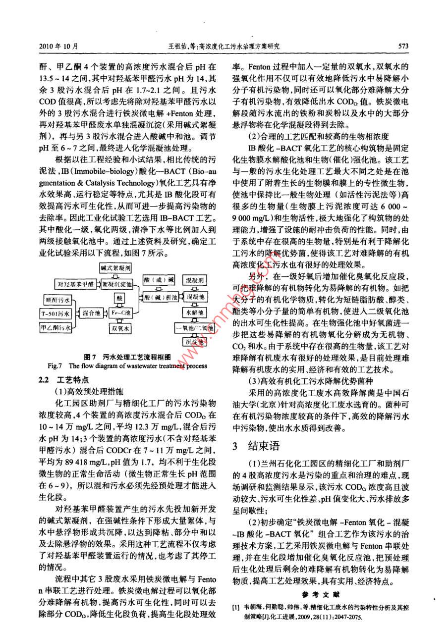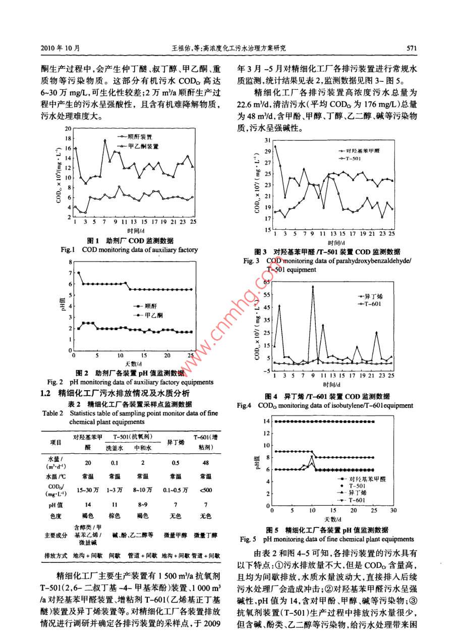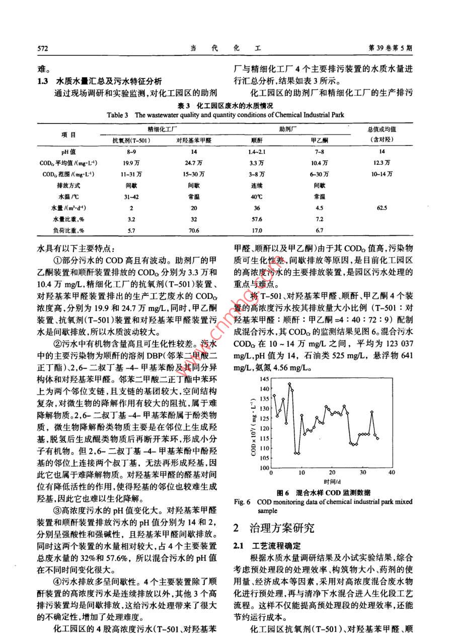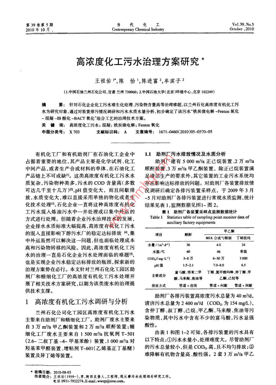 第39卷第5期當(dāng)代化..工Vo1.39.No.52010年10月Contemporary Chemical IndustryOctober ,2010高濃度化工污水治理方案研究*王祖佑",陳怡',陳進(jìn)富,牟濱子2(1.中國(guó)石油蘭州石化公司,甘肅蘭州730060; 2.中國(guó)石油大學(xué)(北京)環(huán)境中心,北京102249)摘要:針對(duì)石化企業(yè)化工污水難生化處理、污染物含量高等治理難題,以蘭州石化高濃度有機(jī)化工污水為研究對(duì)象,通過(guò)對(duì)裝置排污情況調(diào)研和污水水質(zhì)水量分析.初步確定了該污水“鐵炭微電解-Fenton氧化-混凝-IB酸化-BACT氧化"組合工藝的治理技術(shù)方案。關(guān)鍵詞:高濃度化工污水;混凝;鐵炭微電解; Fenton氧化中圖分類號(hào): x 703文獻(xiàn)標(biāo)識(shí)碼: A文章編號(hào): 1671-0460(2010)05- 0570-05有機(jī)化工廠和有機(jī)助劑廠在石油化工企業(yè)中1.1助劑廠 污水排放情況及水質(zhì)分析占據(jù)著重要的地位,其產(chǎn)品主要是化學(xué)試劑、化工助劑廠建有5000 m2/a正已烷裝置.2萬(wàn)m/a中間產(chǎn)品,或者生產(chǎn)合成材料的單體,在石油化工順酐裝置.3萬(wàn)m/a甲乙酮裝置,除正已烷裝置滿產(chǎn)品鏈上不可或缺"。這類高濃度有機(jī)化工污水水足清潔生產(chǎn)的要求外,其它裝置的工業(yè)污水系統(tǒng)均質(zhì)復(fù)雜,污染物種類多,污水的COD含量高(多數(shù)存在影響達(dá)標(biāo)排放的問(wèn)題。對(duì)助劑廠各裝置排放情可達(dá)幾千至十幾萬(wàn))巴,pH值變化大,而且間歇排況調(diào)研后確定各排污裝置采樣點(diǎn),于2009年3月放,水質(zhì)變化大,難以直接采用單獨(dú)的物化或者生-5月對(duì)助劑廠各排污裝置進(jìn)行常規(guī)水質(zhì)監(jiān)測(cè),統(tǒng)計(jì)化技術(shù)處理的,石化企業(yè)一直將這種高濃度有機(jī)化結(jié)果見(jiàn)表1,監(jiān)測(cè)數(shù)據(jù)見(jiàn)圖1-圖2。工污水混入煉油污水中--并處理或以集中外運(yùn)的表1助劑廠各裝置采樣點(diǎn)監(jiān)測(cè)數(shù)據(jù)統(tǒng)計(jì)方式進(jìn)行處理。但隨著企業(yè)污水治理技術(shù)的發(fā)展,Table 1 Statistics table of sampling point monitor data ofauxiliary factory equipments企業(yè)排水水質(zhì)標(biāo)準(zhǔn)大幅提高,高濃度有機(jī)化工污水的混入直接影響下游污水廠的穩(wěn)定達(dá)標(biāo)排放同,集項(xiàng)目順酐MEK合成與精制丁嬌提純甲乙酮中外運(yùn)雖然可以解決這一問(wèn)題,但也面臨處理成本高和污染物轉(zhuǎn)移的風(fēng)險(xiǎn)。因此,高濃度有機(jī)化工污水量/(m2dH)364.024水溫/心46常溫水的治理一直是石化企業(yè)污水處理面臨的難題(,C0D/(mg'L-)3-8萬(wàn)6-30萬(wàn)3000也是實(shí)現(xiàn)企業(yè)污水穩(wěn)定達(dá)標(biāo)排放的瓶頸,探索新的pH值1.5~2.17.0-8.05.5治理方案勢(shì)在必行。本文針對(duì)蘭州石化化工園區(qū)助劑廠和精細(xì)化工廠的高濃度有機(jī)化工污水處理開(kāi)主要成分富馬酸、鄰苯二甲丁烯、氮甲酰嗎啉、仲丁醇、甲酸、馬來(lái)酸.焦油等乙酮,己烷等展了相關(guān)技術(shù)方案研究,以期為該類廢水的治理提排放方式普道+連續(xù)管遭+間歇管道 +間歇供技術(shù)支撐。助劑廠各排污裝置高濃度污水總量為40 m/d,1高濃度有機(jī)化工污水調(diào)研與分析;清潔污水總量為2 400 m'/d (CODc 為154 mg/L),蘭州石化公司化工園區(qū)高濃度有機(jī)化工污水含仲丁醇叔丁醇、己烷、甲乙酮、馬來(lái)酸焦油等污主要來(lái)自助劑廠和精細(xì)化工廠。助劑廠廢水主要來(lái)染物質(zhì),其中污水中含有不少的富馬酸,污水顯強(qiáng)自3萬(wàn)m/a甲乙酮裝置和2萬(wàn)m/a順酐裝置;精:酸性。細(xì)化工廠廢水主要來(lái)自1 500 m/a抗氧劑T -501由表1和圖1-2可知,各排污裝置的污水具有(2.6-二叔丁基-4-甲基苯酚)裝置、1 000 m/a對(duì)以下特點(diǎn):①污水水量小,處理難度大。盡管助劑廠羥基苯甲醛裝置、增粘劑T-601(乙烯基正丁基醚)的污水總量較小,但是CODa高,且不均勻排放;②裝置及異丁烯等裝置。難降解有機(jī)物含量高、酸性強(qiáng)。2套3萬(wàn)m/a甲乙●收稿日期: 2010-08-03作者簡(jiǎn)介:王祖佑(1959-),男,陜西昊堡人,工程師,現(xiàn)從事污水處理相關(guān)研究工作。電話0931-7932274,E mail:wwep@sina.com.2010年10月王祖佑,等:高濃度化工污水治理方案研究S71酮生產(chǎn)過(guò)程中,會(huì)產(chǎn)生仲丁醚.叔丁醇、甲乙酮、重年3月-5月對(duì)精細(xì)化工廠各排污裝置進(jìn)行常規(guī)水質(zhì)物等污染物質(zhì)。這部分有機(jī)污水CODa高達(dá)質(zhì)監(jiān)測(cè),統(tǒng)計(jì)結(jié)果見(jiàn)表2,監(jiān)測(cè)數(shù)據(jù)見(jiàn)圖3-圖5。6~30萬(wàn)mg/L,可生化性較差;2萬(wàn)m/a順酐生產(chǎn)過(guò)精細(xì)化工廠各排污裝置高濃度污水總量為程中產(chǎn)生的污水呈強(qiáng)酸性,且含有機(jī)難降解物質(zhì),22.6 m/d,清潔污水(平均COD。為176 mg/L)總量污水處理難度大。為48 m/d,含甲酚、甲醇、丁醇.乙二醇、堿等污染物20質(zhì),污水呈強(qiáng)堿性。18一順酐裝臀o甲乙酮裝置29女對(duì)野基苯甲醛; 14-女T-501道12|2523g12135791131517192123251時(shí)間/d1573579113151719212325團(tuán)1助劑廠 COD監(jiān)測(cè)數(shù)據(jù)Fig.1 COD monitoring data of auxiliay factory圖3對(duì)羥基苯甲醛T -501 裝置COD監(jiān)測(cè)數(shù)據(jù)Fig. 3 COD monitoring data of parahydroxybenzaldehyde/T-501 equipment65女