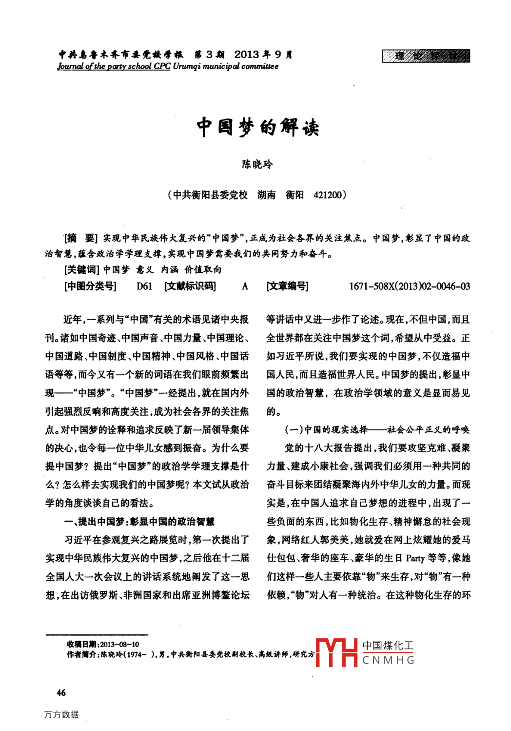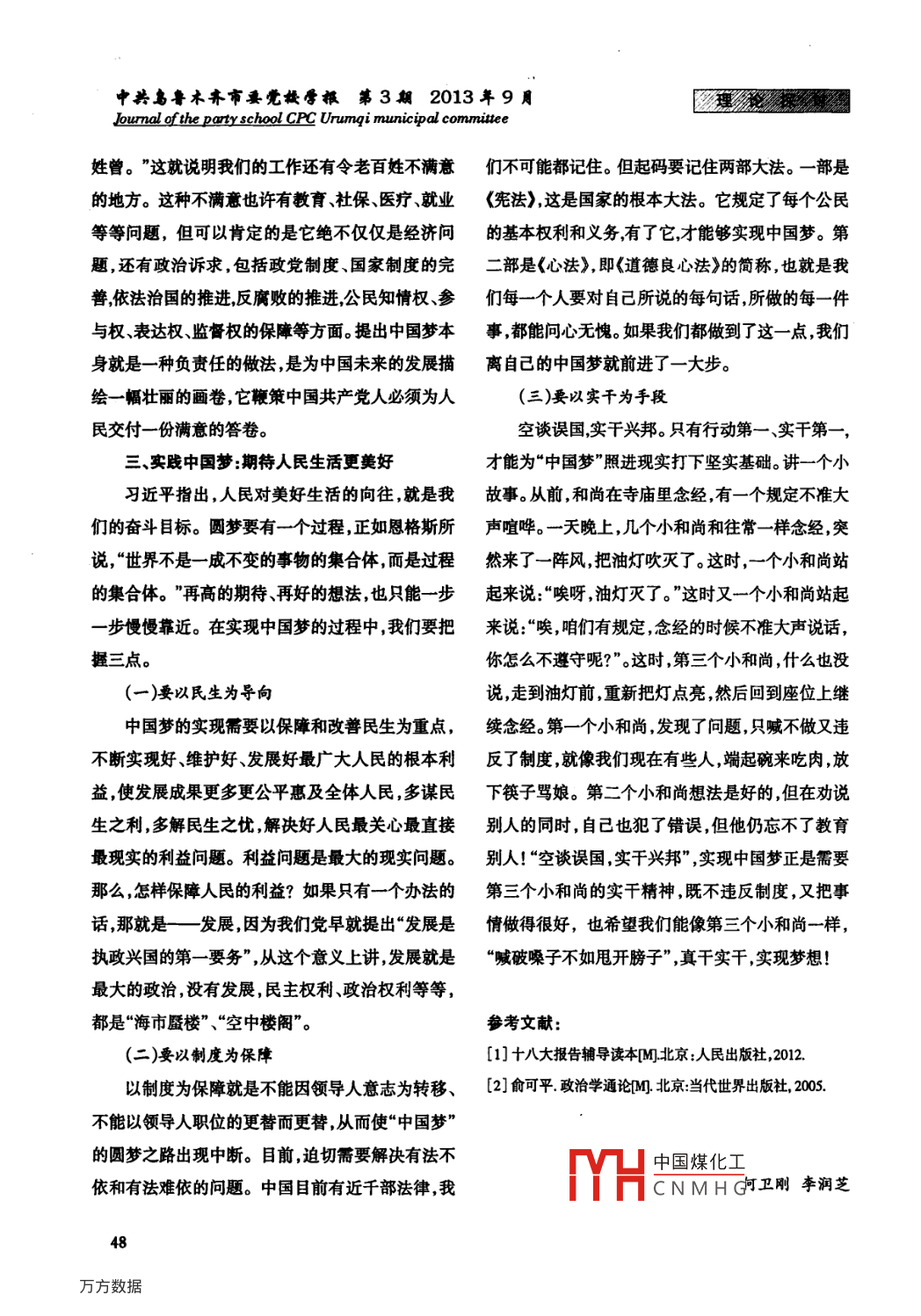 中共島魯木棄市覺餐晉報第3期2013年9月Journal of the party school CPC Urumqi municipal committee中圓夢的解讀陳曉玲(中共衡陽縣委黨校湖南衡陽421200)[摘要]實現中華民族偉大復興的“中國夢”,正成為社會各界的關注焦點。中國夢,彰顯了中國的政治智慧,蘊含政治學學理支撐,實現中國夢需要我們的共同努力和奮斗。[關鍵詞]中國夢意義內涵價值取向[中圖分類號]D61攻獻標識碼A[文章編號1671-508X(2013)02-0046-03近年,一系列與“中國”有關的術語見諸中央報等講話中又進一步作了論述?,F在,不但中國,而且刊。諸如中國奇跡、中國聲音、中國力量、中國理論、全世界都在關注中國夢這個詞,希望從中受益。正中國道路、中國制度、中國精神、中國風格、中國話如習近平所說,我們要實現的中國夢,不僅造福中語等等,而今又有一個新的詞語在我們眼前頻繁出國人民,而且造福世界人民。中國夢的提出,彰顯中現—“中國夢”?!爸袊鴫簟币唤浱岢?就在國內外國的政治智慧,在政治學領域的意義是顯而易見引起強烈反響和高度關注,成為社會各界的關注焦的。點。對中國夢的詮釋和追求反映了新一屆領導集體一)中國的現實選擇—社會公平正義的呼喚的決心,也令每一位中華兒女感到振奮。為什么要黨的十八大報告提出,我們要攻堅克難凝聚提中國夢?提出“中國夢”的政治學學理支撐是什力量建成小康社會,強調我們必須用一種共同的么?怎么樣去實現我們的中國夢呢?本文試從政治奮斗目標來團結凝聚海內外中華兒女的力量。而現學的角度談談自己的看法。實是,在中國人追求自己夢想的進程中,出現了、提出中國夢:彰顯中國的政治智慧些負面的東西,比如物化生存、精神懈怠的社會現習近平在參觀復興之路展覽時,第一次提出了象,網絡紅人郭美美,她就愛在網上炫耀她的愛馬實現中華民族偉大復興的中國夢,之后他在十二屆仕包包、奢華的座車、豪華的生日Paty等等,像她全國人大一次會議上的講話系統(tǒng)地闡發(fā)了這一思們這樣一些人主要依靠“物”來生存,對“物”有一種想,在出訪俄羅斯、非洲國家和出席亞洲博鰲論壇依賴,“物”對人有一種統(tǒng)治。在這種物化生存的環(huán)收稿日期:2013-08-10中國煤化工作者簡介:陳晚玲(1974-),男,中共衡陽縣委黨校副被長、高綴講師,研究方CNMHG中頭島魯衣齊市要覺極獸報第3期2013年9月Journal of the party school CPC Urumqi municipal committee境中有一部分人受到了功利主義、實用主義拜金各級政府從本質上來說都是接受人民的委托,辦理主義、享樂主義中的負面影響就想走捷徑搞權錢公共事務其中最關鍵的一點是政府的所作所為能交易權色交易、內幕交易,社會公平正義受到嚴重夠為公眾接受,一切權力的表現和運用都必須體現拷問,“老百姓”變成“老不信”。這就使得我們在某人民的公意即全體人民共同意志。從這個意義上些方面顯得大而不強、有面無神、有體無魂。提出中來講,中國夢是國家的夢民族的夢,也是每個中國國夢就是期許民眾建構一個具有公平正義的好的人的夢。造福人民是中國夢提出的出發(fā)點和最終落政府和社會的愿景,在這一杜會里,民眾能各顯其腳點。能、各得其所、和諧相處。這里,中國夢是公平正義(二)動員人民政治參與—“必須緊緊依靠人之夢,是每個人都有出彩機會之夢。民來實現”(二)世界的共同認可——贏得政治認同的需要毛澤東說過:“人民,只有人民才是創(chuàng)造世界歷有外國媒體評論說中國夢提得好,語言樸實、史的動力?!敝袊鴫舨皇悄骋粋€人的夢中國夢是百大眾化,關鍵是沒有傾向性既不向左、也不向右,姓夢,是大家的夢它必須緊緊依靠人民去實現。人在美國不論是共和黨還是民主黨都不反對,都能認民政治參與是實現中國夢的重要前提。西方有一部同。瑞土《新聞報》說在數千年歷史中,中國從沒像名著叫《魯濱遜漂流記》,故事的主人公魯濱遜現在這樣表現優(yōu)秀。中國夢的提出,能促進中國共他一個文明人只身來到荒島利用對原來文明社會產黨同世界各國其他政黨的交流,從世界維度看,的“記憶”的智慧和知識開墾土地、馴養(yǎng)家畜、建筑中國夢,就是中國要占據世界發(fā)展的制高點拓寬房屋,滿足生存的需要同時他還把文明社會的強中國在國際政治舞臺上的發(fā)展空間、贏得世界的認制、統(tǒng)治關系帶到這里把土人星期五當成仆人,把同,這種認同當然包括政冶認同。這里,中國夢是強“全島都是我個人的私有財產”等私有觀念帶到了國之夢,是展現中國自信之夢。這個無人的荒島,最后又成功地返回到文明社會。二、詮釋中國夢:蘊含政治學學理支排從表面上看,他是一個人生存,其實他本身就是社什么是中國夢?中國夢的內涵就是“國家富強、會的縮影和文明社會的移植。政治學原理告訴我民族振興、人民幸福”。2013年3月17日,習近平們,人必須在一定的社會生產關系、社會關系中滿在十二屆全國人大一次會議閉幕會上指出,“中國足自己的需求實現自己的夢想。同樣道理,實現中夢歸根到底是人民的夢,必須緊緊依靠人民來實國夢需要生存在這個社會當中的每一個個體一起現,必須不斷為人民造福?!睆恼螌W的角度進行思去奮斗,一起去合作,一起為國家的夢、民族的夢、索有很多個維度,下面僅闡述三點。大家的夢而參與其中同舟共濟。(一)遵循人民主