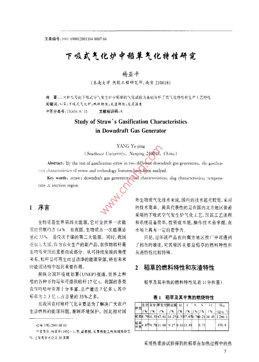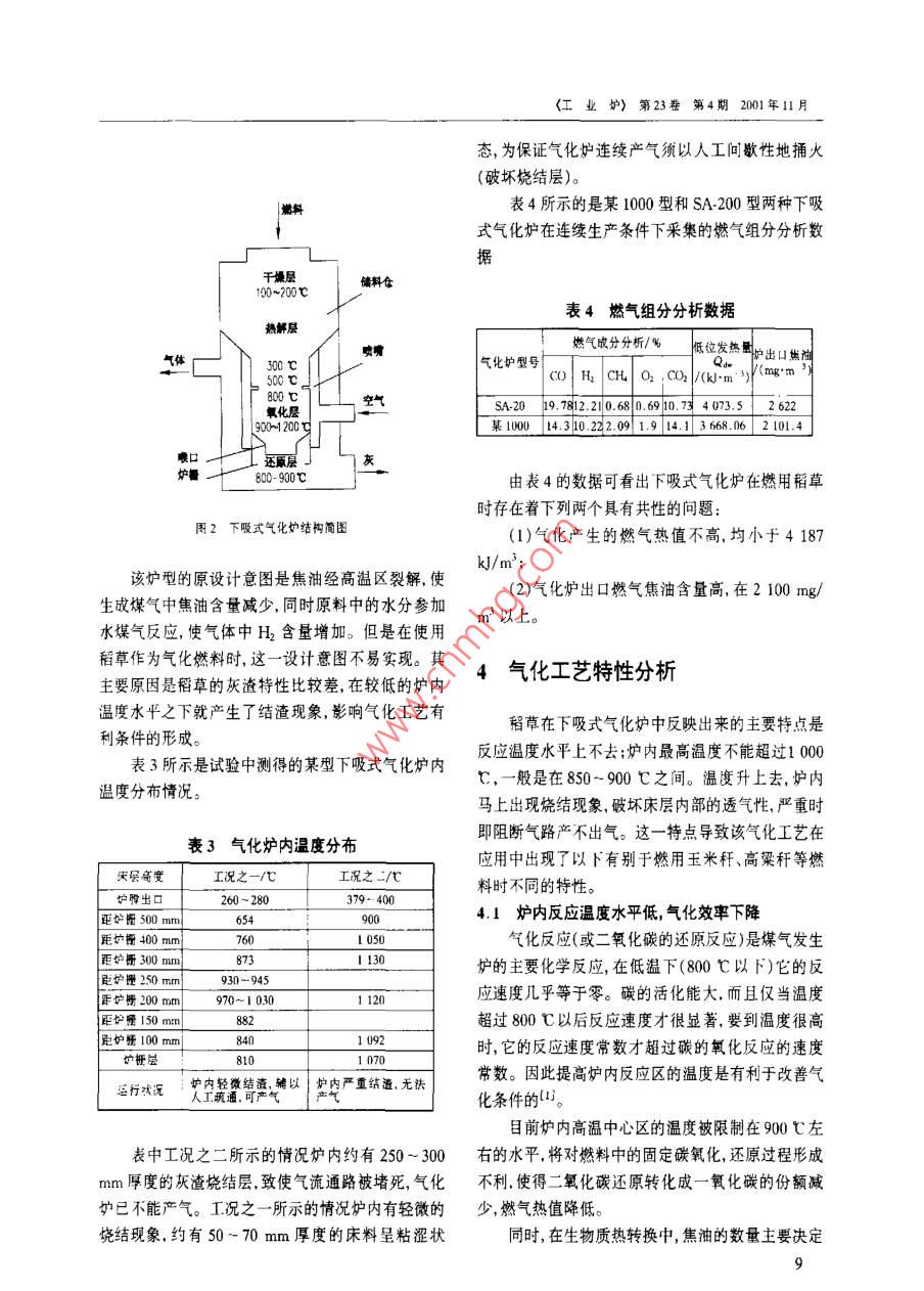 文章編號(hào): 1016988(2001 )04 0007.040下吸式氣化爐中稻萆氣化特性研究楊亞平(東南大學(xué)熱能工程研究所。南京210018)擒要:以肉種管號(hào)時(shí)下吸式空飛發(fā)生爐中稻草的氣化試驗(yàn)為基礎(chǔ)分析了其氣化特性和生產(chǎn)1.藝特性.關(guān)鍵詞:4草;下吸式氣化妒;燃科特性;灰渣特性:反應(yīng)溫度中圖分類號(hào):TK43+.6" 11文獻(xiàn)標(biāo)識(shí)碼:AStudy of Straw’s Casification Characteristicsin Downdraft Gas GeneratorYANG Ya ping(Southreust [niovrsily, Nanjing 210018, China)Abstract: By the test of gasification straw in 1Wo difrent downdraft gas generators, the gasifnca-:icn characteristics of straw and lechnology features have been analyzd.Key words: straw; downdraft gas generator; fuel characterisrics; slag characteristics; tempera-ture. n reaction region外生物質(zhì)氣化技術(shù)米說(shuō),國(guó)內(nèi)的技術(shù)起點(diǎn)較低.采用1序言的技術(shù)簡(jiǎn)單。最具代表性的足在國(guó)內(nèi)北方地區(qū)普遍采用的下吸式空氣發(fā)生爐氣化工藝,因其工藝流程生物質(zhì)是世界第四大能源,它對(duì)全世界一次能和系統(tǒng)設(shè)備簡(jiǎn)單,投資成本低,操作技術(shù)易掌握,在深的貢獻(xiàn)約占14%.在我國(guó), 生物質(zhì)占一次能源總市場(chǎng)上:具有一定的競(jìng)爭(zhēng)力.量的33%:是僅次于煤的第二大能源。同時(shí),我國(guó)但是,近年該產(chǎn)品在向南方地區(qū)推1”中卻遇到是農(nóng)在大國(guó).作為農(nóng)業(yè)生產(chǎn)的副產(chǎn)品,農(nóng)作物秸桿是了相當(dāng)?shù)碾y度,究其原因主要足稻草的燃料特性和生物質(zhì)資源的重要組成部分,從可持續(xù)發(fā)展的角度灰漣特性比較特殊..來(lái)看,稻稈是可再生而且潔凈的能源資源,將在未來(lái)的能源結(jié)構(gòu)中起到重要作用。2稻草的燃料特性和灰渣特性據(jù)聯(lián)合國(guó)環(huán)境規(guī)劉署(UNEP)報(bào)道,世界上種植的各種谷物每年可提供秸稈17億t。我國(guó)的各類稻草及其半焦的燃料特性見(jiàn)表I(分析基):農(nóng)作物秸稈資源十分豐富,總產(chǎn)量達(dá)7億多1,其中稻卓為2.3億占總量的33%之多。表1稻草及其半焦的燃燒特性在我國(guó)農(nóng)村秸稈氣化主要是為了解決廣“大農(nóng)戶.水分灰分揮發(fā)分周定明HNST0Qea生活燃料的能源問(wèn)題,兼顧環(huán)境保護(hù)。因此相對(duì)國(guó)1%/%/% 1 /% /%1% j19%[/%↓1% (wm用畢.7914.3567.6114.254.337.070. 760.21|34 4193 260.1收姆7期:2001 0803率里: .874.7811.089.27 0.6113.45 0.7|970.9作者覽介:場(chǎng)亞平(1952-).男.削教授、從事熱能工程鐵域科研工但藝發(fā)表學(xué)術(shù)論文20多篇采用熱重法試驗(yàn)得到的稻草在加熱過(guò)程中的熱試糧研兗:下吸式氣化護(hù)中鵬草氣化特性研究重曲線(即TG曲線)和微熵?zé)嶂厍€(DTG曲線)如圖1所示。樣品:草質(zhì)量:1.40g At:2i 12079210-19-98 過(guò)程:湘草C20C -950C) (20C/inX氮) CEn: ALIMTNA溫座/心不/不min)G/%1000 ct2-8且他k .07002.5-3600. 500-40. 400. 3001-10.-60t 20-70 tL-10050r -15.01250175022502750 -90」圖1帽草燃料熱分析測(cè)試圖由圖1可見(jiàn)稻草燃料中的揮發(fā)分預(yù)熱到200 C左右即開(kāi)始逸出;在330C左右達(dá)到最高逸出速率;3氣化特性試驗(yàn)隨后逸出速率衰減,在400 C左右逸出速率穩(wěn)定在-個(gè)較低的水平;在480心左右燃料中的揮發(fā)分已生物質(zhì)氣化過(guò)程是生物質(zhì)原料在缺氧狀態(tài)下加有80%左右逸出。在500 C左右逸出速率再次衰熱反應(yīng)的能量轉(zhuǎn)換過(guò)程。其原理可概述如下:生物減至一個(gè)很微弱的水平,一直保持至800七左右,在質(zhì)燃料與媒等- -般礦物燃料的工業(yè)分析成分相似,這個(gè)階段的逸出量大約只有2%-3%,基本終止了包括揮發(fā)分、固定碳和灰分三個(gè)部分。但一般揮發(fā)逸出。分含量較多,固定碳相對(duì)較少。揮發(fā)分主要由水分、稻草的灰渣特性如表2所示。一氧化碳、二氧化碳、氫、甲烷和一部分焦油組成,其間比例會(huì)隨著加熱溫度和加熱速率的不同而不同表2稻草的灰渣特性在氣化過(guò)程中隨著燃料被加熱,揮發(fā)分將首先析出,灰中鮮灰中鈉灰中鋁灰變形灰軟化|灰溶化灰流動(dòng)剩余的半焦在空氣供應(yīng)不足和高溫條件下進(jìn)行燃燒物種:元素元素元肅溫度|溢度詛度溫度氣化反應(yīng),生成二氧化碳和一氧化碳空氣煤氣,即由/% ! /%| 1% n/E 42/C t/t t/t揮發(fā)分和氣化反應(yīng)生成的-氧化碳、氧化碳共同看草0.51 | 0.46 0.094 900 1040 1120 1170 |組成。空氣中的氮?dú)馕磪⒓託饣磻?yīng),仍然余留于煤氣之中。在下吸式氣化爐中由于揮發(fā)分將通過(guò)高-般而言,生長(zhǎng)快的生物質(zhì)燃料其賊土金屬含溫氣化反應(yīng)層,其中部分焦油將被裂解,生成CH4、量高,尤其是鉀、鈉元素含量高,灰渣溶點(diǎn)低,容易產(chǎn)H2.CO等燃?xì)獬煞?。生結(jié)渣。稻草灰中鉀、鈉雖不高,但是鋁含量也很下吸式氣化妒的結(jié)構(gòu)如圖2所示,其工藝特點(diǎn)低?;抑兴釅A氧化物含量比是決定燒結(jié)溫度的一個(gè)是氣化 與固體順向流動(dòng),物料由上部?jī)?chǔ)料倉(cāng)向下移主要因素,AL2Oz有抑制燒結(jié)產(chǎn)生的作用,由表中分動(dòng),在爐內(nèi)傳來(lái)的熱量作用下邊移動(dòng)邊進(jìn)行干燥與析數(shù)據(jù)和以下試驗(yàn)情況證明稻草的灰渣特性并不熱分解;空氣向噴嘴進(