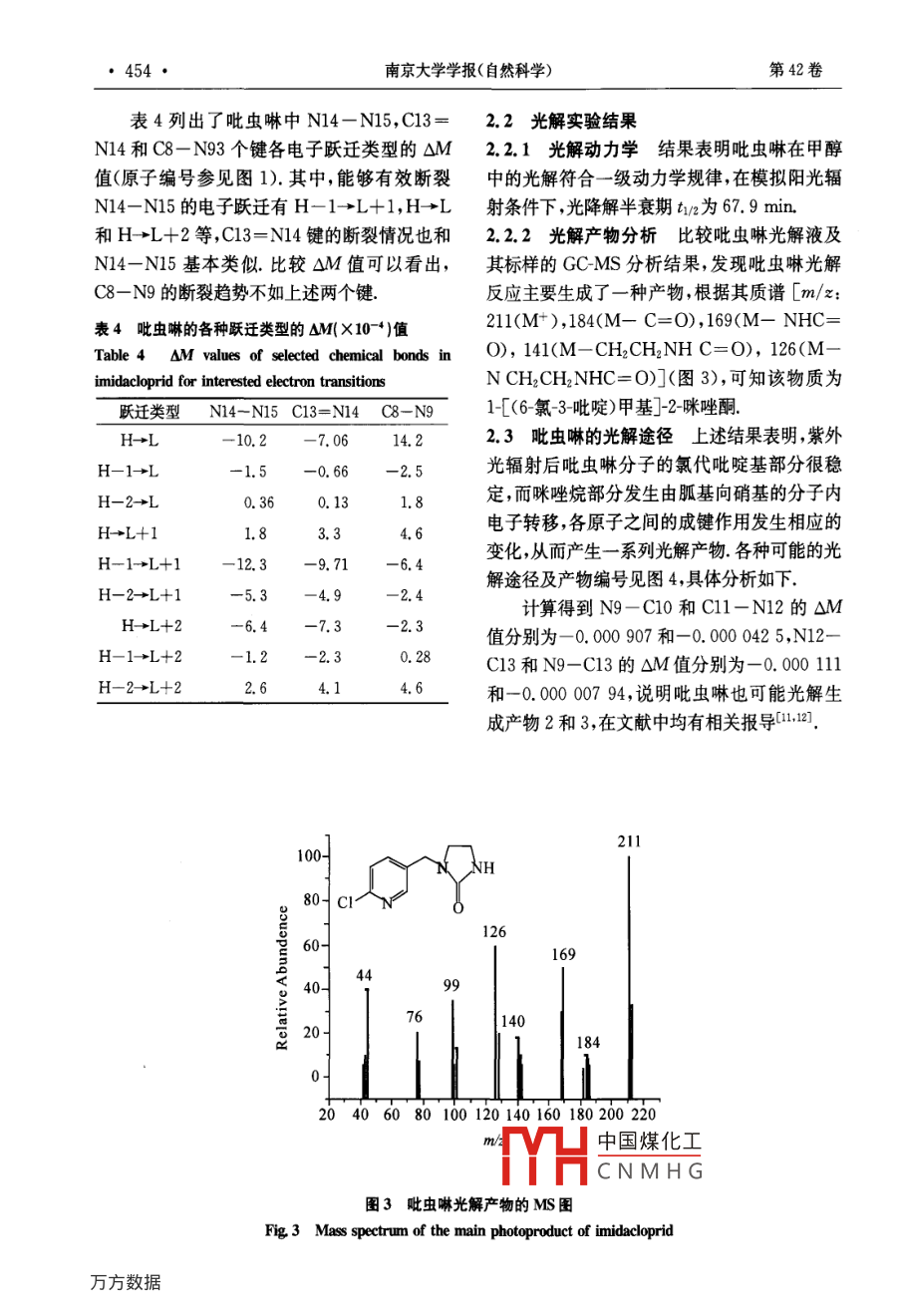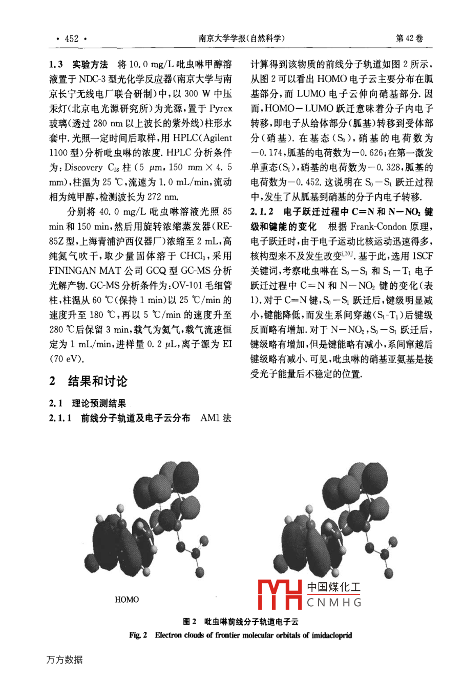 第42卷第5期南京大學學報(自然科學)VoL. 42, No 52006年9月JOURNAL OF NANJING UNVERSITY2006(NATURAL SCIENCES)吡蟲啉在甲醇中的光解研究秦元斌,展漫軍,楊曦(污染控制與資源化研究國家重點實驗室,南京大學環(huán)境學院,南京,210093)摘要:根據(jù)分子軌道理論,借助半經(jīng)驗分子軌道計算方法研究吡蟲啉可能的的光解途徑,發(fā)現(xiàn)硝基亞氨基是接受光子能量后最不穩(wěn)定的位置并預測了各種可能的光解產(chǎn)物以300W中壓汞燈(A>280nm)為光源,實驗發(fā)現(xiàn)吡蟲啉在甲醇溶劑中的光解符合一級動力學規(guī)律,其主要降解產(chǎn)物為1(6氯-3吡啶)甲基]2咪唑酮.實驗結(jié)果與理論預測結(jié)果吻合,從而提出了吡蟲啉可能的光解途徑.關(guān)鍵詞:吡蟲啉,光解,反應(yīng)機理,分子軌道理論中圖分類號:X52Photolysis of Imidacloprid in MethanolQin Yuan-Bin, Zhan Man-Jun, Yang XiState Key Laboratory of Pollution Control and Resource Reuse, School of the EnvironmentNanjing University, Nanjing, 210093, China)Abstract: In this paper, we predicted the photolysis pathways of imidacloprid by semiempirical molecular orbitaltheoretical computations. Firstly, we obtained the main transition styles of imidacloprid at A> 280 nm byConfiguration Interaction. Then we calculated the value of AM in these transition styles. The results showed thatthe bonds of N14-N15, C13=Nl4 and C8-N9 of imidacloprid tended to break. On the other hand, photodegradation behaviors of imidacloprid in methanol were studied under irradiation of a 300 W medium pressure mercury lamp(>280 nm). The primary degradation of imidacloprid followed a pseudo-first-order kinetics in methanol, and thephotodegradation half life of imidacloprid in methol is about 67. 9 min. The main photoproduct of imidacloprid wasdetermined as 1-[(6-chloro-3-pyridinyl)methylF-2-imidazolidone by GC/MS. The results of theoretical prediction a-greed well with the experimental conclusions, which suggested that semiempirical molecular orbital theoretical computations could betially applied to predict the photolysis pathways of organic contaminations.Key words: imidacloprid, photolysis, reaction mechanism, molecular orbital theory吡蟲啉( imidacloprid,結(jié)構(gòu)式見圖1)是一廣譜、高效而得到了廣泛應(yīng)用.因此,吡蟲啉種新型的硝基亞甲基類高效殺蟲劑,因其低毒、及其降解產(chǎn)物的環(huán)境行為與安全性評價也日益中國煤化工CNMHG基金項目:國家自然科學基金(50578074,20207004),國家科技攻關(guān)計劃重天項目(2003BA808A7)收稿日期:2006-01-20通訊聯(lián)系人,E-mail;yangxi@nju.edu.cn第5期秦元斌等:吡蟲啉在甲醇中的光解·451·引起關(guān)注.光解是吡蟲啉在環(huán)境中的重要M=2∑C4(A)C(B)S。(k=;,j)歸趨途徑之一,然而這方面的研究并不多,尤其缺乏對光解歷程的深入了解.本文首先應(yīng)用分子軌道(MO)理論預測了式中C(A)和C與(B)為第k個分子軌道吡蟲啉可能的光解途徑然后通過實驗研究了中原子A的原子軌道P和原子B的原子軌道q吡蟲啉的光解動力學,鑒定了其主要的光解產(chǎn)的系數(shù),Sm為p和q之間的重疊積分物結(jié)合實驗和理論預測結(jié)果,提出了吡蟲啉可對于有機物的光解來說,從第i個MO到能的光解途徑.第j個MO的單電子躍遷造成了鍵的削弱或增強.相應(yīng)地,有22:12019△M=(M,-M)/225 24 HHH如果△M值為負值,表示光激發(fā)后,分子HH中的A-B鍵可能會斷裂;反之,原子A和B則有成鍵的趨勢9H對于化合物的光解來說,光激發(fā)后,并不是H18只有從最高已占據(jù)軌道(HOMO到最低未占據(jù)軌道(LUMO的單電子躍遷,其他MO之間14∠O1的躍遷也有可能發(fā)生,甚至可能在光激發(fā)過程中起主要作用本文采用組態(tài)相互作用的方法,考慮了4個已占據(jù)軌道( occupied orbital)和3016個未占據(jù)軌道( unoccupied orbita),并得到了相應(yīng)的各個MO的躍遷類型和系數(shù),定量地分圖1吡蟲啉的結(jié)構(gòu)式和原子編號Fig 1 Structure and atomic serial numbering of析了各種躍遷類型在整個CI態(tài)中所占的比重imidacloprid由于自由基(如OH)的單電子占據(jù)軌道(SOMO中的未成對電子既可以和芳香族有機1實驗部分物的最高已占據(jù)分子軌道(HOMO作用,又可以和最低未占據(jù)分子軌道(LUMO作用,根據(jù)1.1理論預測方法所有分子結(jié)構(gòu)優(yōu)化和量前線分子軌道理論,定義如下自由基反應(yīng)描述子化學參數(shù)均采用分子軌道軟件包( MOPAC)符:中的AM1算法,由輸出文件直接得到分子的(C10M0)2+(C1M0)2}(3)生成能、分子軌道能級和原子凈電荷等參數(shù)輸A BONDS, ENPART, VECTORS, MECI,式中C100和C110分別表示HOMO和C.L.=7,C'S等關(guān)鍵詞得到鍵級、鍵能、原子LUMO中原子軌道i的系數(shù).對于激發(fā)態(tài)分軌道特征矢量以及各CI態(tài)( Configuration子,Interaction state)中各個MO躍遷的類型和系fR=∑{CxM0)2+(CM嗎)2)(4)數(shù)將優(yōu)化后的分子構(gòu)型輸入 Hyperchem7軟式中C∞M和CM表示兩個SOMO中件采用AMl算法計算單電子各躍遷能級以原=甘子的f值大小可以及相應(yīng)的自旋多重性紫外吸收波長和振子強表度CNMH紅太陽集團)純度第k個分子軌道中原子A和原子B的大于98%,甲醇(色譜純,Teda公司),CHCl3Mulliken重疊布居數(shù)M定義為:(分析純)·452·南京大學學報(自然科學)第42卷1.3實驗方法將10.0mg/L吡蟲啉甲醇溶計算得到該物質(zhì)的前線分子軌道如圖2所示,液置于NDC3型光化學反應(yīng)器(南京大學與南從圖2可以看出HOMO電子云主要分布在胍京長寧無線電廠聯(lián)合研制)中,以300W中壓基部分,而LUMO電