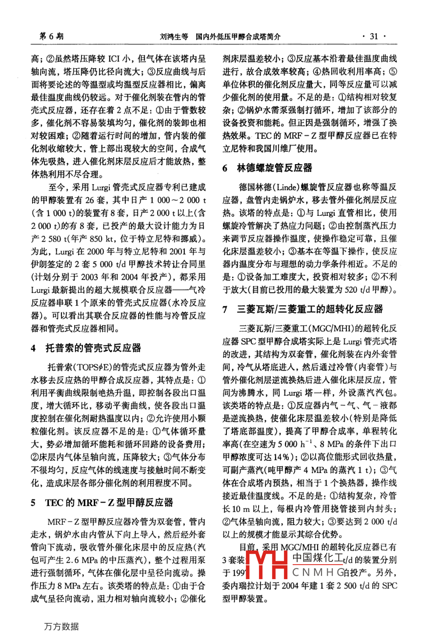 第42卷第6期化肥設(shè)計Dec.20042004年12月Chemical Fertilizer design囝內(nèi)外低瓜甲醇合成塔簡介劉鴻生,朱德林(瀘天化集團有限責任公司,四川瀘州646300)摘要:論述了當今世界工業(yè)生產(chǎn)上已應(yīng)用的大型甲醇合成塔的技術(shù)特點和應(yīng)用情況,分別對ICl的冷激型、三菱瓦斯/三菱重工的SPC型、卡薩利的臥式反應(yīng)塔、美國空氣產(chǎn)品和化學(xué)品公司的漿態(tài)床反應(yīng)器和杭州林達的均溫塔等8類塔型進行了重點闡述關(guān)鍵詞:甲醇;合成塔;低壓法;銅基催化劑中圖分類號:TQ223.121文獻標識碼:A文章編號:1004-8901(2004)06-0029-04Briefly Introducing the Low Pressure Methanol Synthesis Converter Inland and OutlandLIU Hong-sheng, ZHU De-linLutianhua Group Company Ltd, Sichuan Luzhou, 646300, China)Ahstract: The technical feature and applicable situation were discussed for the large-sized methanol converter, which has been industriallyused in production in the world presently, the eight kinds of tower types were mainly described respectively for ICi cold quench type, MitsubishiGas/Mitsubishi Heavy Industry SPC type, Casale horizontal reactor, slurry state bed reactor of American Air Product and Chemical Company andHangzhou Linda thermostatic tower etc.Key words: methanol; converter; low-pressure method copper base catalyst我國甲醇生產(chǎn)歷史已有40多年,雖已形成問世以來,只有40多年的生產(chǎn)歷史,20世紀70了年產(chǎn)約39Mt的能力,但總體表現(xiàn)為裝置生年代以后,該工藝幾乎退出了歷史舞臺。1966產(chǎn)能力偏小,經(jīng)濟技術(shù)指標落后,成本高,效益年,英國ICI公司開發(fā)了在5MPa下,采用銅差。隨著國內(nèi)甲醇市場需求的快速發(fā)展,我國甲鋅一鉻催化劑的低壓甲醇合成工藝,標志著甲醇醇生產(chǎn)的技術(shù)水平亦將會很快得到提高。筆者通合成進人了低壓合成工藝的新紀元。中壓合成工過對當今世界工業(yè)應(yīng)用的9種主要塔型進行分藝是在低壓合成工藝基礎(chǔ)上進一步發(fā)展起來的。析,希望能對新建或改造的甲醇生產(chǎn)廠家在甲醇由于低壓合成工藝設(shè)備體積相當龐大,不利于甲合成塔選型方面有所裨益。醇生產(chǎn)的大型化,因此,發(fā)展了壓力為10MPa左右,采用銅鋅鋁催化劑的中壓甲醇合成工藝,1甲醇合成工藝發(fā)展概述有效地降低了建廠費用和生產(chǎn)成本。甲醇合成按其壓力分類可分為高壓合成工最早具有代表性的塔型是ICI公司的冷激型藝、中壓合成工藝和低壓合成工藝。高壓合成是合成塔(使用CI51-2型或以后的銅基催化劑,指釆用鋅-鉻催化劑,在350~420℃、25-35合成壓力10MPa左右),以及德國魯奇(Lurg)MPa高溫高壓下的合成工藝。與中低壓合成工公司開發(fā)的管殼型甲醇合成塔。在此基礎(chǔ)上衍生藝相比,該工藝合成壓力等級高(實際操作壓力出了各種類型的甲醇合成塔。習(xí)慣上,許多學(xué)者般為30MPa),設(shè)備材質(zhì)要求高,加工費用昂和專家都將低壓甲醇合成工藝和中壓甲醇合成工貴,裝置投資大,能耗高,副反應(yīng)多,產(chǎn)品甲醇藝統(tǒng)中國煤化工催化劑)。下面質(zhì)量較差,催化劑選擇性差且鉻在制備過程中對CNMH人體有害等。因此,從1923年德國BASF公司作者簡年畢業(yè)于南京化工大學(xué),教授級高級工程師,瀘天化集團公司副總裁,從事化第1個以O(shè)O和H2為原料的高壓合成甲醇工藝肥工程的技術(shù)管理工作化肥設(shè)計2004年第42卷的闡述即沿用這樣的觀點。局部過熱,而溫度過高將會影響催化劑活性和使甲醇合成工藝按反應(yīng)器特性可分為絕熱型和用壽命,同時甲醇中副產(chǎn)物含量也較高。換熱型。ICI的冷激型是絕熱型的典型代表。換因此,近年來,ICI提出新概念甲醇工藝熱型又可分為段間換熱和床層內(nèi)換熱。段間換熱( Leading Concept Mathanol,LCM),即冷管合成有段間塔內(nèi)換熱(如卡薩利的臥式反應(yīng)塔)和段間塔(TCC),冷氣進入催化層中的逆流冷管膽,被塔外換熱2種。床層內(nèi)換熱按其換熱介質(zhì)又可分加熱,出冷管后進催化層反應(yīng)。在此基礎(chǔ)上,ICI為氣一氣換熱(如ICI的冷管式)、氣一液換熱又設(shè)計出了并流冷管反應(yīng)器。冷管合成塔(TCC)(如魯奇的管殼式、TEC的MRF-Z型、林德的的床層溫差較冷激型有了很大改善,反應(yīng)曲線也螺旋管型等)和氣一氣一液換熱(如三菱瓦斯/三較平穩(wěn)。但是,冷管塔屬氣一氣換熱,傳熱效果菱重工的SPC型)。通常,絕熱反應(yīng)離平衡曲線較氣一液換熱差,熱點溫差也比氣一液換熱型的較遠,熱點溫度較高,對催化劑的選擇范圍較高;同冷激型反應(yīng)器一樣,因氣體呈軸向流動窄,只能副產(chǎn)壓力等級較低的蒸汽或高壓熱水。塔阻力相對于徑向流較大;另外,ICI2種型號的由于換熱式塔可及時將反應(yīng)熱移走,床層溫升較反應(yīng)器出口氣體都采用工藝水冷卻,加熱后的工小,離反應(yīng)平衡曲線較近。換熱型中效果較好的藝水一部分進入天然氣飽和器,另一部分供鍋爐為氣一液換熱和氣一氣一液換熱。給水用,屬低位熱能回收,熱能綜合利用較差。甲醇合成工藝按合成氣在反應(yīng)器里的流向可至今,采用ICI冷激型反應(yīng)器和冷管式反應(yīng)分為軸向流和徑向流。由于氣體軸向流動通過催器專利已建成的甲醇裝置有58套(不包括特立尼化床的流程較長,因而阻力降較徑向流大特和沙特阿拉伯分別計劃于2004年建成投產(chǎn)的甲醇工業(yè)經(j