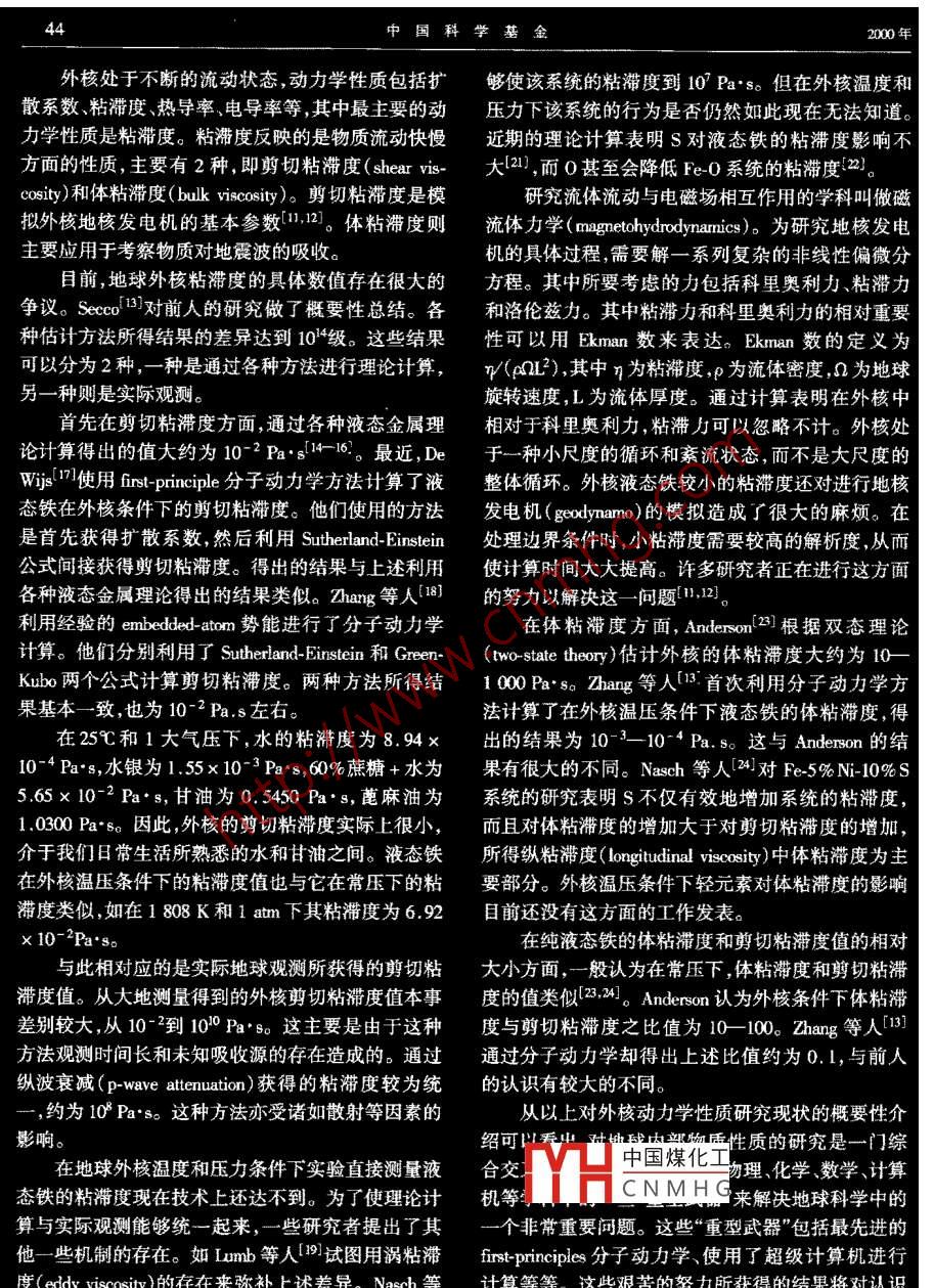 第1期中國科學(xué)基金成果簡介地球外核動(dòng)力學(xué)性質(zhì)研究張毅剛(中國科學(xué)院地質(zhì)與地球物理研究所,北京100029)[關(guān)鍵詞]外核,液態(tài)鐵,粘滯度地球的外核處于地球29005100km深度之含水,95ml%的水將與鐵作用,形成FeH2,這樣間,處于液態(tài)。而從51006371km處的內(nèi)核為固60%的密度缺口可以有氫的加入來彌補(bǔ)態(tài)研究地核輕元素組成對認(rèn)識地球形成和演化具在整個(gè)地球演化過程中,地球外核起著極其重有極其重要的意義。它與地球初始形成時(shí)的星子堆要的作用。首先,它是地球磁場的來源,通過外核液積模式( accretion model)和隨后進(jìn)行的巖漿海模式態(tài)鐵的流體運(yùn)動(dòng)(G∞ dynamo),產(chǎn)生磁場。地球磁場( magma ocean model)密切相關(guān)。本文認(rèn)為,在研究外與我們的日常生活密切相關(guān),它能夠保護(hù)我們不受核的動(dòng)力學(xué)狀態(tài)時(shí),除了考慮純鐵外,還需考慮所有宇宙帶電粒子的侵襲,是進(jìn)行航海的方向標(biāo)。在建其他元素的可能影響。立板塊構(gòu)造學(xué)說過程中,地球磁場在大洋板塊中留2外核的溫度和壓力下的痕跡曾起了決定性作用。其次,地球內(nèi)核的逐步冷卻產(chǎn)生的熱量,通過外核到達(dá)核幔邊界造成核對于地核壓力的分布目前有較清晰的認(rèn)識幔相互作用。近年來,核幔邊界的研究成為熱點(diǎn),人般認(rèn)為核幔邊界( Core Mantle boundary,CMB)的壓力們推測大洋板塊下插后能夠沉降到核幔邊界為135cpa(壓力單位1cpa=10Pa=10bar≈104大D’),地幔柱來源于核幔邊界。因此,研究外核的氣壓),而內(nèi)核和外核邊界(ICB)的壓力為330Gpao動(dòng)力學(xué)性質(zhì)是認(rèn)識整個(gè)地球演化的重要組成部分。與此相反,對地核內(nèi)部溫度的分布卻有較大的分歧。以下我們首先考察一下地球外核的物質(zhì)組成和由于地球內(nèi)外核處于液固平衡,故主要工作集中在所處的溫度壓力狀態(tài),在此基礎(chǔ)上,介紹有關(guān)外核所確定鐵在330cpa下的熔化溫度上處的動(dòng)力學(xué)狀態(tài)方面的研究Poirier等人通過理論研究認(rèn)為在ICB壓力下1地球外核物質(zhì)成分純鐵的熔化溫度約6000K,考慮到輕元素的影響,認(rèn)為ICB的溫度約為500K。Yo0等人8通過實(shí)驗(yàn)地球外核的主要成分為鐵。由于外核的密度比得到在30cpa時(shí),鐵的熔化溫度為(6830±500)K。純鐵輕10%,因此還必須考慮各種較輕元素的存Dy等人9對這方面的工作做了總結(jié)。 Belonoshko在,如:0,s,C,S和H。但外核以什么較輕元素為等人0的分子動(dòng)力學(xué)計(jì)算得出的LB溫度超過主卻有較大的爭議8000K。Williams等人通過考察體積彈性模量和氧逸對外核動(dòng)力學(xué)性質(zhì)的研究需要在以上的溫度和度,認(rèn)為硅不可能是外核中最主要的輕元素。Ale壓力區(qū)間來考慮。gre等人(2,卻認(rèn)為硅是最主要的輕元素。L等人4實(shí)驗(yàn)研究表明,硫隨壓力增加變得更親鐵中國煤化( siderophile),有可能是外核最主要的輕元素。GesCNMHG究對象的成分及其所mann等人5的工作表明硅和氧均不可能是地核的處的溫度和壓力的大致范圍,在此基礎(chǔ)上,可以開始主要輕元素。 Okuchile6認(rèn)為如果初始地球的巖漿海研究外核的動(dòng)力學(xué)性質(zhì)。本文于1999年7月29日收到中國科學(xué)基金2000年外核處于不斷的流動(dòng)狀態(tài),動(dòng)力學(xué)性質(zhì)包括擴(kuò)夠使該系統(tǒng)的粘滯度到107Pa·s。但在外核溫度和散系數(shù)、粘滯度、熱導(dǎo)率、電導(dǎo)率等,其中最主要的動(dòng)壓力下該系統(tǒng)的行為是否仍然如此現(xiàn)在無法知道。力學(xué)性質(zhì)是粘滯度。粘滯度反映的是物質(zhì)流動(dòng)快慢近期的理論計(jì)算表明S對液態(tài)鐵的粘滯度影響不方面的性質(zhì),主要有2種,即剪切粘滯度( shear vis-大121,而0甚至?xí)档虵eO系統(tǒng)的粘滯度2cosy和體粘滯度( bulk viscosity)。剪切粘滯度是模研究流體流動(dòng)與電磁場相互作用的學(xué)科叫做磁擬外核地核發(fā)電機(jī)的基本參數(shù)2。體粘滯度則流體力學(xué)( magnetohydrodynamics)為研究地核發(fā)電主要應(yīng)用于考察物質(zhì)對地震波的吸收。機(jī)的具體過程,需要解一系列復(fù)雜的非線性偏微分目前,地球外核粘滯度的具體數(shù)值存在很大的方程。其中所要考慮的力包括科里奧利力、粘滯力爭議1對前人的研究做了概要性總結(jié)。各和洛倫茲力。其中粘滯力和科里奧利力的相對重要種估計(jì)方法所得結(jié)果的差異達(dá)到104級。這些結(jié)果性可以用 Ekman數(shù)來表達(dá)。 Ekman數(shù)的定義為可以分為2種,一種是通過各種方法進(jìn)行理論計(jì)算,v/(2),其中為粘滯度,p為流體密度為地球另一種則是實(shí)際觀測。旋轉(zhuǎn)速度,L為流體厚度。通過計(jì)算表明在外核中首先在剪切粘滯度方面,通過各種液態(tài)金屬理相對于科里奧利力,粘滯力可以忽略不計(jì)。外核處論計(jì)算得出的值大約為10-2Pa·sl4-16。最近,De于一種小尺度的循環(huán)和紊流狀態(tài),而不是大尺度的Wjs!使用 first-principle分子動(dòng)力學(xué)方法計(jì)算了液整體循環(huán)。外核液態(tài)鐵較小的粘滯度還對進(jìn)行地核態(tài)鐵在外核條件下的剪切粘滯度。他們使用的方法發(fā)電機(jī)( geodynamo)的模擬造成了很