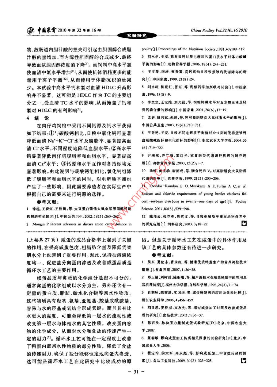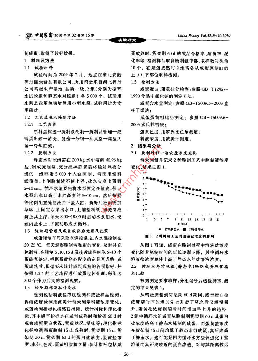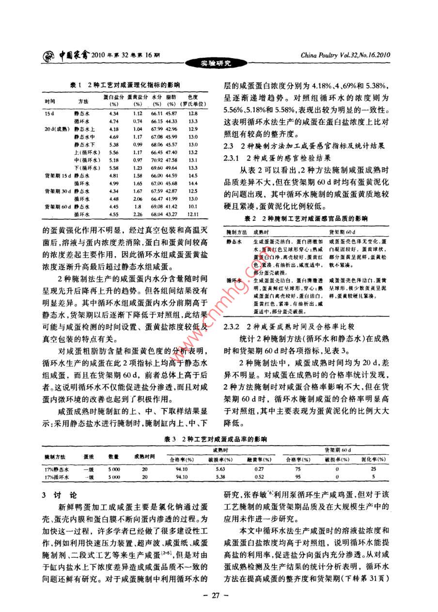 中家需2010年第32卷第168China poultry VoL 32, No 16 2010實驗研究循環(huán)水腌制咸蛋工藝研究*蒲躍進,杜金平∵,梁振華',皮勁松',潘愛鑾,吳艷’,申杰,李清逸2,向俊2,徐曉娟2(1湖北省農業(yè)科學院畜牧獸醫(yī)研究所,動物胚胎工程及分子育種湖北省重點實驗室,湖北武漢430064;2湖北神丹健康食品有限公司,湖北安陸432600摘要:為解決浸泡法加工威蛋時鹽溶液濃度上下不一致的問題,提高咸蛋品質,本研究利用循環(huán)水工藝腌制威蛋。結果發(fā)現(xiàn),循環(huán)水能促進鹽分向蛋內滲透,同一缸中用循環(huán)水」腌制的咸蛋蛋白鹽濃度明顯比對照組(靜態(tài)水)均勻,但對威蛋合格率及成熟時間影響不大;在貨架期60d時,循環(huán)水腌制的咸蛋合格率明顯高于對照組,蛋黃泥化的比例大大降低。關鍵詞:咸蛋;猜環(huán)水;工藝Study on Processing of Salted Egg with Circulating WaterU Yuejin, DU Jinping", LIANG Zhenhua, Pl Jinsong, PAN Ailuan',WU Yan, SHEN Jie, L Qingyi, XIANG Jun, XU Xiaojuan(1.Institute of Animal Husbandry and Veterinary Medicine, Hubei Academy of Agricultural SciencesKey Lab of Animal Embryo Engineering and Moleculer Breeding of Hubei Province, Wuhan, Hubei 4300642. Hubei Shendan Health Food Co, Ltd Anlu, Hubei 432600)Abstract: To solve the consistency of salt solution concentration during processing of salted eggs and improve thequality of salted eggs, circulated salted water processing was used for salting duck eggs. The results showed processing ofcirculating water could promote galt to seepage, protein concentration of salted eggs at the same cylinder using recycledsalt water processing was significantly uniformer than that of control group(static water), but it had no effect on the passrate and mature time of salted eggs. At 60 days of shelf life, pass rate of salted eggssignificantly higher than that of control group, mudding rate of egg yolk was significantlyKey words: salted eggs; circulating water; processing中國是最大的鴨蛋消費和貿易國,每年蛋鴨等特點,備受群眾喜愛市場需求經久不衰。咸蛋飼養(yǎng)量在3億只左右,鴨蛋產量達400多萬噸,出的加工方法主要有鹽泥鹽灰和鹽水法3種。其中口為5萬噸左右,居世界首位。再制蛋(包括皮鹽水法由于工藝簡單操作方便、勞動強度低及可蛋、咸蛋糟蛋、咸蛋黃等)是目前鴨蛋消費的主要重復利用、易于規(guī)?;a等優(yōu)點成為近年來大形式,其中咸蛋因食用方便、風味獨特、營養(yǎng)豐富中型蛋制品生產廠家的首選方法。但鹽水法生產咸蛋,仍存在同級別鴨蛋、同一溫度、同一鹽水濃收稿日期:201005-14度下成熟度不一致、蛋白咸味差異較大的問題影修回日期:2010-08-06基金項目:現(xiàn)代農業(yè)產業(yè)技術體系建設專項資金資助響了咸蛋品質抑制了咸蛋加工的進一步擴大。為通訊作者,E-mil;ddjinpin(@163.com解決這一問題,本研究利用水泵促成水循環(huán)來腌中家2010年第32卷第16China Poultry VoL 32, No 16.2010實駿研究制咸蛋,取得了較好效果。蛋成熟時、貨架期60d的成品合格率溶黃率泥1材料及方法化率等;檢測樣品取自腌制缸中部,取樣數每次為11試驗材料10個,在咸蛋成熟時2組需各從咸蛋腌制缸的試驗時間為2009年7月,地點在湖北安陸上、中、下部位取樣檢測。神丹健康食品有限公司;所用鴨蛋來自湖北神丹15檢測方法公司鴨蛋生產基地,品質一級,2組(分別為循環(huán)咸蛋蛋白、蛋黃鹽分檢測:參照GB-T12457水試驗組和靜態(tài)水對照組)各5000個;試驗用1990食品中氯化鈉的測定方法;水泵是選用魚塘增氧用小型水泵;試驗用鹽為食咸蛋含水量測定:參照GB-T50093-2003直用碘鹽。接干燥法;工藝流程及腌制方法咸蛋蛋黃粗脂肪測定:參照GB-T5009.61.2.1工藝流程2003索氏抽提法;原料蛋挑選→腌制液配制→腌制及管理→咸蛋黃色度:用羅氏比色扇測定鴨蛋出缸→清洗、復檢→分級→抽真空→高溫滅料液濃度:用波美計測定。菌→冷卻貯藏2結果與分析122腌制方法21腌制過程中溶液鹽濃度變化靜態(tài)水對照組需在200kg水中溶解40.96kg每天測量并記錄2種腌制工藝中腌制液濃度鹽,制成腌制液,充分攪拌靜置后將經過照檢分變化,結果見圖1。的一級鴨蛋5000個人缸腌制,液面用塑料紙覆蓋,上倒腌制液不使上浮,鹽水應高出蛋面5-10cm。循環(huán)水組要先將水泵固定在缸底,保證水泵出水口高于水缸高度約5~10cm,然后按同等比例配置腌制液并下蛋入缸,腌好后液面需加草席,上固定水泵出水口,上鋪塑料紙,加腌制液防止其上浮,每天8:00-1800時啟動水泵抽水,使缸內鹽水上、下流動形成水循環(huán)時間(d1.3腌制期管理及咸蛋成熟后處理及包裝17%靜態(tài)水一17%循環(huán)水咸蛋腌制車間采取空調挖溫,缸內水溫控制在圖12種腌制工藝對溶液鹽濃度的影響20-25℃。每天觀察腌制液和蛋的變化,及時補充從圖1可知,咸蛋在腌制過程中溶液鹽濃度腌制液,在腌制5、10、15d及接近成熟時取5-10個變化隨著腌制時間的延長逐漸下降,其中循環(huán)水蛋破殼鑒定,根據蛋黃穿心程度確定是否成熟。咸溶液鹽濃度總體上高于靜態(tài)水的鹽溶液濃度。蛋成熟后,根據要求統(tǒng)計咸蛋成熟的各項指標,并2.2循環(huán)水與對照組(靜態(tài)水)腌制咸蛋理化指按照121的工藝流程進行咸蛋包裝處理。每組選標比較30個作為后期的檢測觀察根據測定要求取樣,分組編號后送檢測室,測14檢測指標及取樣要求定的結果見表1。檢測包括料液鹽濃度檢測和咸蛋樣品檢測。從鴨蛋腌制到貨架期60d期間,咸蛋蛋白鹽料液