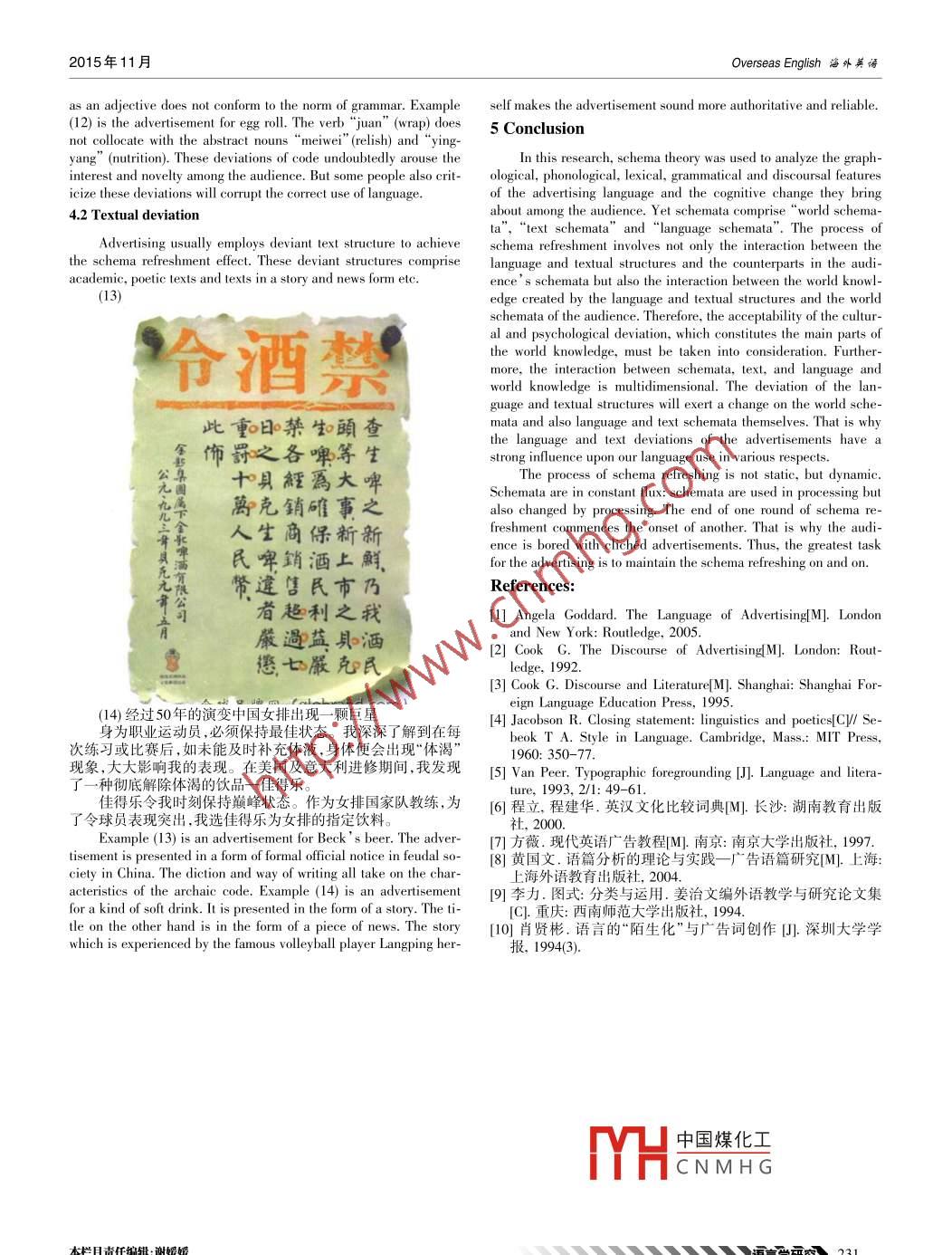 hwsy@overseaen.comISSN 1009- -5039htp://ww.overcaen.comOverseas English海外英語Tel:+86- -551-65690811 65690812Schematic Analysis of Linguistic Features of AdvertisementsLIUji-xin(China West Normal University, Nanchong 637002,China)Abstract: Advertising constitutes an indispensable part of moderm life, promoting sales and channeling consumption. Further-more, the daily conversation is also strongly influenced by advertising language. In this research, schema theory is employed toanalyze the graphological, phonological, lexical, grammatical and discoursal features of the advertising language and the cogni-tive change they bring about among the audience, aiming at helping the consumers have a better understanding of advertise-ments and helping the designers produce better works.Key words: advertising; graphological features; phonological features; lexical features ; grammatical features; discourse fea-tures ;cognitive change中圖分類號(hào):H31文獻(xiàn)標(biāo)識(shí)碼:A 文 章編號(hào): 1009- -5039(2015)22- -0229-031 Introductionmata as they are (Cook, 1995)”, meanwhile maintaining the worldschemata intact, because the existing ones in the audience are soWith the development of socialist market economy, advertise-strong that it is unnecessary to change. In advertising, only canments have penetrated into every stratum of society, becoming anthose well- known and widely accepted services and products haveindispensable part of everyday life. According to Fang Wei (1997),the privilege to use the intact advertisements (limited in the areasadvertising is usually a paid form of non- personal presentation ofof slogans and brands, etc.). The preservation of these schematainformation and persuasive in nature about ideas, producets or ser- can activate them and bring them alive easily.vices through various media. It defines for consumers the meaningand role of products and services and the distinguishing character-(2)GouBuLi (狗不理)istics of companies and institutions. Moreover, it tells the consum-The above two examples are brands of products. Example 1) isers the e>ences of using these pproducts and services. Therefore, the brand of a kind of popular soft drinks. It can remind people ofit plays an extremely important role in promoting sales and channel-the good taste of the drink where the brand is present. Example (2)ing consumption in modern society.is originally the name of a kind of stuffed steamed bun in Tianjin inThere are a lot of aricles pertaining to the linguistic features China. It has evolved into a fast food chain store. The literal mean-of English advrtisements or Chinese advertisements or contrastiveing of“GouBuLi" is that the stuffed steamed bun in which evenstudy between the two. Yet they are only addressed as autonomousdog has no interest. Although the originalobjects- -isolated texts without the audience (usually refer to thestuffed steamed bun businessman Gouzi (the nickname means pup-consumers) being considered. It is undoubtedly that their work ispy) is too busy to cater for all the customers with some being ne-very helpful in arousing the awareness of the particular features ofglected. Since then, people start to address him“GouBuLi" (Gouziadvertisements among the audience. However, advertising is per-ignores the customers’ orders). Any change or replacement 0suasive and significant only when it is related to a specific group ofthese two brands will cause a loss of the commercial influence andaudience.cultural meaning in them. This will be ultimately beyond the cus-Cook (1995) proposes that primary function of certain distomers recognition.courses is to effect a change in the schemata of their readers. Jacob-son (1960, cited in Cook, 1995) also advocates that one function of3 Schemata Reinforcinglanguage is the conative function that is to seek to affect the behav-By schemata reinforcing is meant that“l(fā)eaving existing sche-ior of the addressee. Advertisement is such kind of discourse thatmata stronger than before (Cook, 1995)’ . (In connectionist terms,its main function is to disrupt the language and text schemata ofincreasing the‘strength” of a schema may mean increasing thespeific group of audience, while preserving, reinforing or refresh- weightings in neural connections, and the result of this will be thating the world schemata. Among the three, schemata refreshment isthe schema is activated more readily, and departures from it accept-proved to be most influential and persuasive. Thus, how the linguis-ess easily.) In advertising, the products and services which aretic features afeet schemata of the audience and what kind of cogni-already known to the audience sometimes apply the abridged andtive change they bring about among the audience will be analyzedsimplified advertisements to reinforce the brand image among thein details in this paper.audience. Besides this, the proliferation of new products and servic-2 Schemata Preservinges urge the application of the deviation of linguistic and textual for-As to schemata preserving, it refers to“l(fā)eaving existing sche-mation to achieve the purpose of schemata reinforcing and schema-中國(guó)煤化工收稿日期:2015-09-25修回日期:2015-10-12THCNMHG基金項(xiàng)目:西華師范大學(xué)青年教師科研資助項(xiàng)目“大學(xué)英語聽說課堂上教師模糊限制語之功能研究"(編號(hào):13D027)作者簡(jiǎn)介:劉吉欣(1980- -),男,四川廣元人,西華師范大學(xué)講師,碩士,主要研究方向?yàn)閼?yīng)用語言學(xué)。本欄目責(zé)任編輯:謝嬡嬡Overseas English海外英語2015年11月ta refreshment as well, which will be explained in detail in next sec- tion equipments) the company provides. Example (6) is an adver-tisement for Finance Management W eekly. The rearrangement of4 Schemata Refreshingthe same series of syllables creates a sense of humor and prosodicfeeling. It also reveals the function of this kin