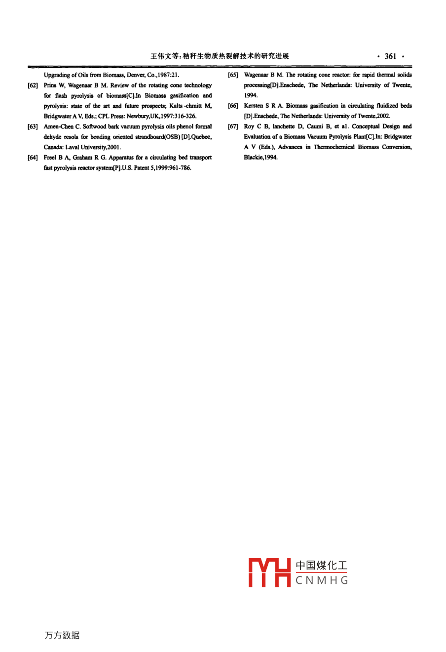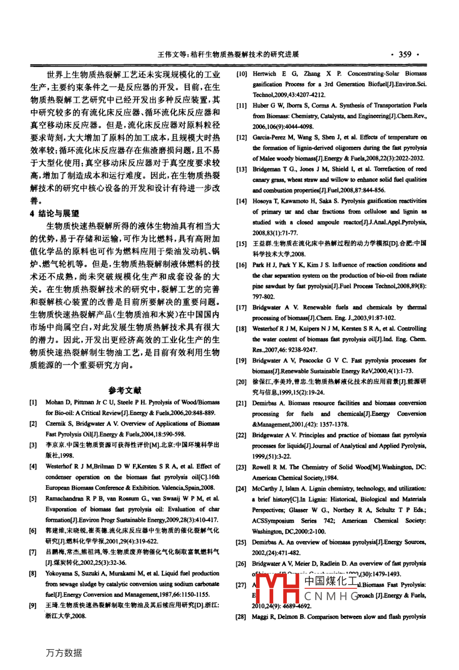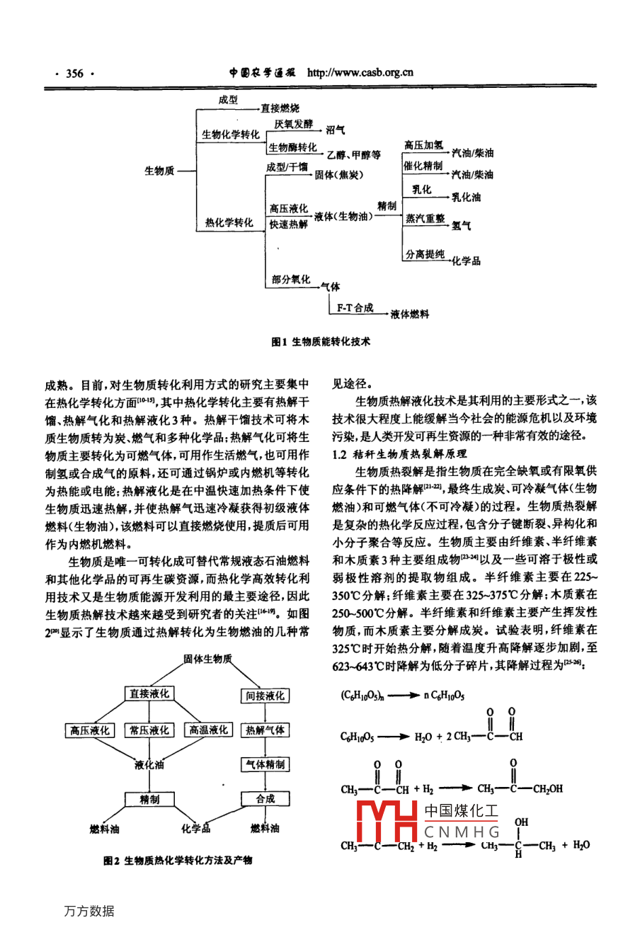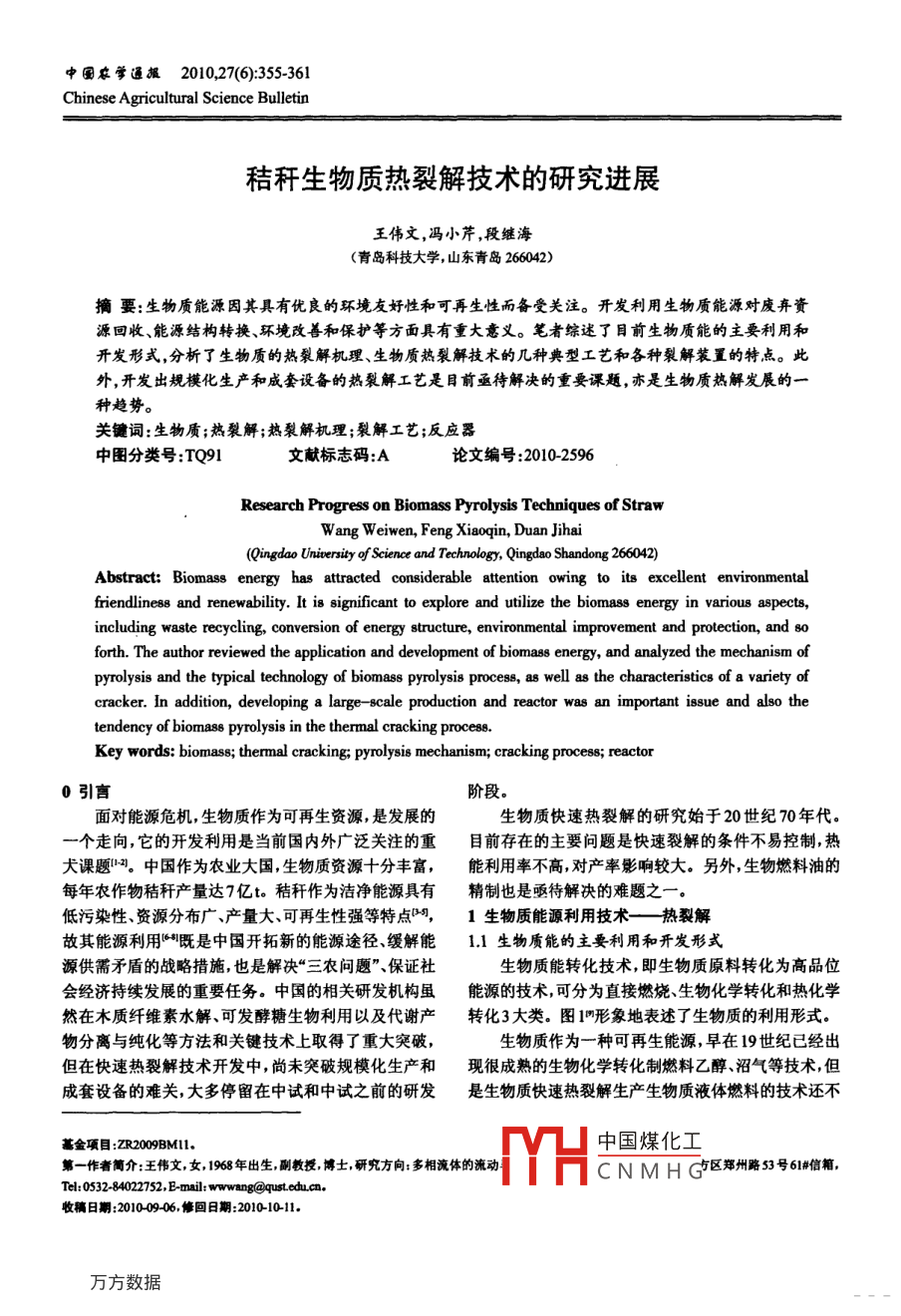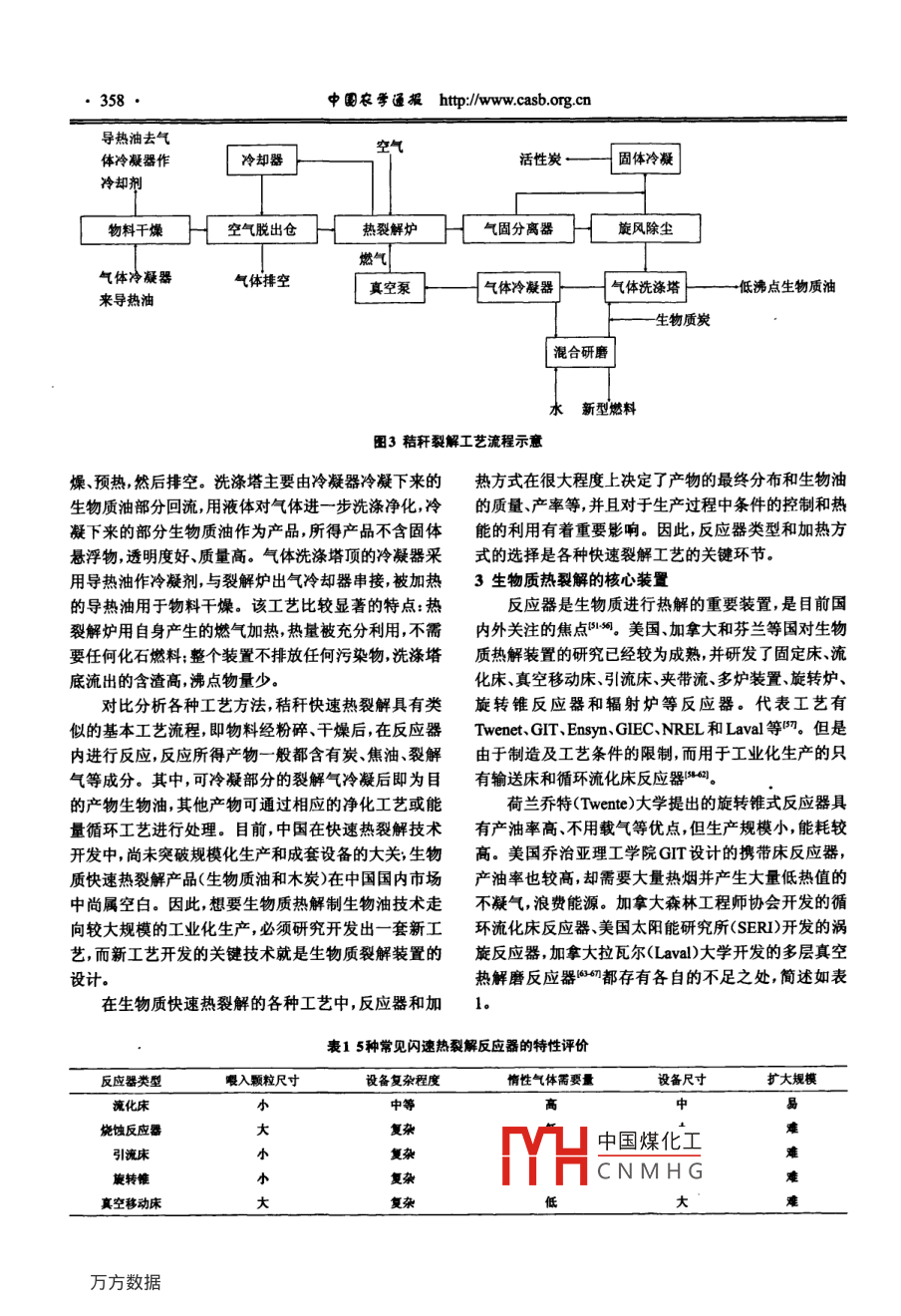 中國歡學逼擺2010,27(6):355361Chinese Agricultural Science Bulletin秸稈生物質熱裂解技術的研究進展王偉文,馮小芹,段繼海(青島科技大學,山東青島266042)摘要:生物質能源因其具有優(yōu)良的環(huán)境友好性和可再生性而備受關注。開發(fā)利用生物質能源對廢棄資源回收、能源結構轉換、環(huán)境改善和保護等方面具有重大意義。筆者綜述了目前生物質能的主要利用和開發(fā)形式,分析了生物質的熱裂解機理、生物質熱裂解技術的幾種典型工藝和各種裂解裝置的特點。此外,開發(fā)出規(guī)?;a和成套設備的熱裂解工藝是目前亟待解決的重要課題,亦是生物質熱解發(fā)展的一種趨勢。關鍵詞:生物質;熱裂解;熱裂解機理;裂解工藝;反應器中圖分類號:TQ91文獻標志碼:A論文編號:20102596Research Progress on Biomass Pyrolysis Techniques of StrawWang Weiwen, Feng Xiaoqin, Duan Jihai(Qingdao University of Science and Technology, Qingdao Shandong 266042)Abstract: Biomass energy has attracted consle attention owing to its excellent environmentalfriendliness and renewability. It is significant to explore and utilize the biomass energy in various aspects,including waste recycling, conversion of energy structure, environmental improvement and protection, and soforth. The author reviewed the application and development of biomass energy, and analyzed the mechanism ofpyrolysis and the typical technology of biomass pyrolysis process, as well as the characteristics of a variety ofcracker. In addition, developing a large-scale production and reactor was an important issue and also thetendency of biomass pyrolysis in the thermal cracking processKey words: biomass; thermal cracking: pyrolysis mechanism; cracking process; reactor0引言階段。面對能源危機,生物質作為可再生資源,是發(fā)展的生物質快速熱裂解的研究始于20世紀70年代。一個走向,它的開發(fā)利用是當前國內外廣泛關注的重目前存在的主要問題是快速裂解的條件不易控制,熱犬課題。中國作為農業(yè)大國,生物質資源十分豐富,能利用率不高,對產率影響較大。另外,生物燃料油的每年農作物秸稈產量達7億t。秸稈作為潔凈能源具有精制也是亟待解決的難題之一。低污染性、資源分布廣、產量大、可再生性強等特點,1生物質能源利用技術—熱裂解故其能源利用既是中國開拓新的能源途徑、緩解能1.1生物質能的主要利用和開發(fā)形式源供需矛盾的戰(zhàn)略措施,也是解決“三農問題”、保證社生物質能轉化技術,即生物質原料轉化為高品位會經濟持續(xù)發(fā)展的重要任務。中國的相關研發(fā)機構雖能源的技術,可分為直接燃燒、生物化學轉化和熱化學然在木質纖維素水解、可發(fā)酵糖生物利用以及代謝產轉化3大類。圖1形象地表述了生物質的利用形式物分離與純化等方法和關鍵技術上取得了重大突破生物質作為一種可再生能源,早在19世紀已經出但在快速熱裂解技術開發(fā)中,尚未突破規(guī)?;a和現(xiàn)很成熟的生物化學轉化制燃料乙醇、沼氣等技術,但成套設備的難關,大多停留在中試和中試之前的研發(fā)是生物質快速熱裂解生產生物質液體燃料的技術還不中國煤化工第一作者簡介:王偉文,女,1968年出生,副教授,博士,研究方向:多相流體的流動CNMH區(qū)鄭州略3號61信箱Tel: 0532-84022752, E-mail: wwwang@qust.edu.cn收稿日期:20100906,修回日期:20101011356中國農學逼報htp:/www.casb.org.cn直接燃燒生物化學轉化厭氧發(fā)酵沼氣生物酶轉化高壓加氫乙醇、甲醇等汽油柴油生物質成型/干餾催化精制固體(焦炭)汽油/柴油乳化乳化油高壓液化精制熱化學轉化」「快速熱解液體(生物油)蒸汽重整L分離提純化學品部分氧化氣體LF合成一液體燃料圖1生物質能轉化技術成熟。目前對生物質轉化利用方式的研究主要集中見途徑在熱化學轉化方面,其中熱化學轉化主要有熱解干生物質熱解液化技術是其利用的主要形式之一,該餾、熱解氣化和熱解液化3種。熱解干餾技術可將木技術很大程度上能緩解當今社會的能源危機以及環(huán)境質生物質轉為炭燃氣和多種化學品;熱解氣化可將生污染,是人類開發(fā)可再生資源的一種非常有效的途徑物質主要轉化為可燃氣體可用作生活燃氣也可用作12秸稈生物質熱裂解原理制氫或合成氣的原料還可通過鍋爐或內燃機等轉化生物質熱裂解是指生物質在完全缺氧或有限氧供為熱能或電能;熱解液化是在中溫快速加熱條件下使應條件下的熱降解,最終生成炭、可冷凝氣體(生物生物質迅速熱解,并使熱解氣迅速冷凝獲得初級液體燃油)和可燃氣體(不可冷凝)的過程。生物質熱裂解燃料(生物油)該燃料可以直接燃燒使用,提質后可用是復雜的熱化學反應過程包含分子鍵斷裂、異構化和作為內燃機燃料。小分子聚合等反應。生物質主要由纖維素半纖維素生物質是唯一可轉化成可替代常規(guī)液態(tài)石油燃料和木質素3種主要組成物四以及一些可溶于極性或和其他化學品的可再生碳資源而熱化學高效轉化利弱極性溶劑的提取物組成。半纖維素主要在225~用技術又是生物質能源開發(fā)利用的最主要途徑因此350℃分解:纖維素主要在325-375℃分解:木質素在生物質熱解技術越來越受到研究者的關注。如圖250500℃分解。半纖維素和纖維素主要產生揮發(fā)性2顯示了生物質通過熱解轉化為生物燃油的幾種常物質,而木質素主要分解成炭。試驗表明,纖維素在325℃時開始熱分解,隨著溫度升高降解逐步加劇,至固體生
