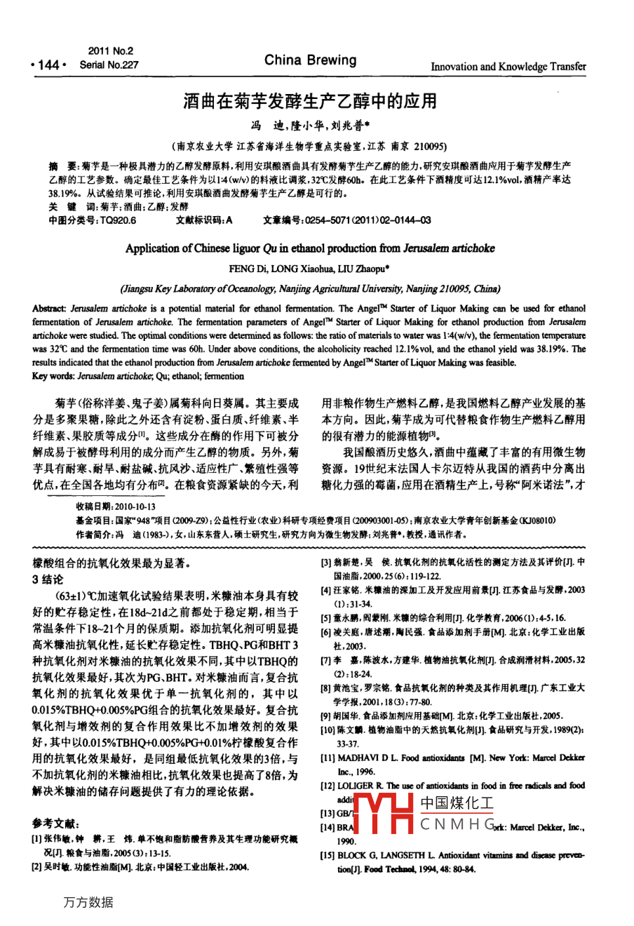 2011No2·144· Serial No227China BrewingInnovation and Knowledge Transfer酒曲在菊芋發(fā)酵生產(chǎn)乙醇中的應用馮迪,隆小華,劉兆普南京農(nóng)業(yè)大學江蘇省海洋生物學重點實驗室江蘇南京210095)摘要:菊芋是一種極具潛力的乙醇發(fā)酵原料,利用安琪釀酒曲具有發(fā)酵菊芋生產(chǎn)乙醇的能力研究安琪釀酒曲應用于菊芋發(fā)酵生產(chǎn)乙醇的工藝參數(shù)。確定最佳工藝條件為以14w)的料液比調(diào)漿,32℃發(fā)酵60h。在此工藝條件下酒精度可達121%v,酒精產(chǎn)率達3819%。從試驗結(jié)果可推論,利用安琪酸酒曲發(fā)酵菊芋生產(chǎn)乙醇是可行的。關鍵詞:菊芋;酒曲;乙醇;發(fā)酵中圖分類號:TQ9206文獻標識碼:A文章編號:02545071(2011)020144Application of Chinese liguor Qu in ethanol production from Jerusalem artichokeFENG Di, LONG Xiaohua, LIU Zhaopu'Abstract: Jerusalem artichoke is a potential material for ethanol fermentation. The Angel Starter of Liquor Making can be used for ethanolfermentation of Jerusalem artichoke. The fermentation parameters of Angel" Starter of Liquor Making for ethanol production from Jerusalemartichoke were studied. The optimal conditions were determined as follows the ratio of materials to water was 1:4(w/v), the fermentation temperaturewas 32C and the fermentation time was 60h. Under above conditions, the alcoholicity reached 12. 1%vol, and the ethanol yield was 38.19%. Theresults indicated that the ethanol production from Jerusalem artichoke fermented by Angel M Starter of Liquor Making was feasibleKey words: Jerusalem artichoke, Qu; ethanol; fermention菊芋(俗稱洋姜、鬼子姜)屬菊科向日葵屬。其主要成用非糧作物生產(chǎn)燃料乙醇是我國燃料乙醇產(chǎn)業(yè)發(fā)展的基分是多聚果糖除此之外還含有淀粉、蛋白質(zhì)、纖維素、半本方向。因此,菊芋成為可代替糧食作物生產(chǎn)燃料乙醇用纖維素、果膠質(zhì)等成分。這些成分在酶的作用下可被分的很有潛力的能源植物解成易于被酵母利用的成分而產(chǎn)生乙醇的物質(zhì)。另外,菊我國釀酒歷史悠久,酒曲中蘊藏了豐富的有用微生物芋具有耐寒、耐旱、耐鹽堿、抗風沙、適應性廣、繁殖性強等資源。19世紀末法國人卡爾邁特從我國的酒藥中分離出優(yōu)點在全國各地均有分布。在糧食資源緊缺的今天,利糖化力強的莓菌應用在酒精生產(chǎn)上,號稱“阿米諾法”,才收稿日期:2010-1013基金項目:國家“948~項目(2009-);公益性行業(yè)(農(nóng)業(yè))科研專項經(jīng)費項目(20090001405);南京農(nóng)業(yè)大學青年創(chuàng)新基金K08010作者簡介:馮迪(1983-),女,山東東營人,碩士研究生,研究方向為微生物發(fā)酵:劉兆普·教授,通訊作者。檬酸組合的抗氧化效果最為顯著。[3]翁新楚吳侯抗氧化劑的抗氧化活性的測定方法及其評價門中3結(jié)論國油脂,2000,25(6):119122(63+)℃加速氧化試驗結(jié)果表明米糠油本身具有較汪家銘米油的深加工及開發(fā)應用前景門江蘇食品與發(fā)酵203(1):3134好的貯存穩(wěn)定性,在18d-21d之前都處于穩(wěn)定期,相當于[5]意永鵬蒙剛,米糠的綜合利用[門化學教育,2006(1):45,16常溫條件下18-21個月的保質(zhì)期。添加抗氧化劑可明顯提(6]凌關庭,唐述潮陶民強食品添加劑手冊隊北京:化學工業(yè)出版高米糠油抗氧化性,延長貯存穩(wěn)定性。 TBHQ, PG和BHT3社,2003種抗氧化劑對米糖油的抗氧化效果不同,其中以TBHQ的四李嘉陳波水方建華植物油抗氧化劑合成潤滑材料.20032抗氧化效果最好,其次為PG、BHT。對米糠油而言復合抗Q):1824.氧化劑的抗氧化效果優(yōu)于單一抗氧化劑的,其中以黃池寶,羅宗銘食品抗氧化劑的種類及其作用機理門廣東工業(yè)大學學報,2001,18(3):77-800015%TBHQ+0.005%PG組合的抗氧化效果最好。復合抗9]胡國華食品添加劑應用基礎DM北京:化學工業(yè)出版社,2005氧化劑與增效劑的復合作用效果比不加增效劑的效果[0陳文瞬植物油脂中的天然抗氧化劑食品研究與開發(fā),1989(2好,其中以0.015%TBHQ+0.005%PG001%檸檬酸復合作用的抗氧化效果最好,是同組最低抗氧化效果的3倍,與[ MADHAVI D L Food antioxidants [M]. New York: Marcel Dekker不加抗氧化劑的米糠油相比,抗氧化效果也提高了8倍,為解決米糠油的儲存問題提供了有力的理論依據(jù)[12] LOLIGER R The use of antioxidants in food in free radicals and food中國煤化工[3]GB參考文獻:[4]BRACNMH Grk: Mareel Dekker, Inc[張偉敏鐘耕王煒單不飽和脂肪酸營養(yǎng)及其生理功能研究概況糧食與油脂,2005(3):1315[15] BLOCK G, LANGSETH L Antioxidant vitamins and disease preven[2]吳時敏.功能性油脂M]北京:中國輕工業(yè)出版社,2004too[] Food Techno 1994, 48: 80-842011年第2期創(chuàng)新與借鑒中國釀造總第227期145突破了供生產(chǎn)酒精用淀粉非用麥芽不可的狀況網(wǎng)。因此,2結(jié)果與分析利用傳統(tǒng)酒曲對發(fā)酵新原料菊芋進行研究意義深遠。另21菊芋原料分析外,傳統(tǒng)的制曲是多種微生物進入曲料競爭生存,能適應制曲環(huán)境的保存下來并生長繁殖積累了豐富的代謝產(chǎn)物豪1菊芋粉的組成成分分析和種類繁多的酶系的過程。因此與單菌種發(fā)酵相比酒Table 1. Composition analysis of Jerusalem artichoke powder組成成分水分%總糖%還原糖%曲能夠提供更豐富穩(wěn)定的發(fā)酵菌種與酶系更加有利于乙質(zhì)量分數(shù)4225醇生產(chǎn)的工業(yè)化自20世紀30年代以來菊芋一步法生產(chǎn)乙醇的工藝主由表1可知,菊芋全粉成分主要包括糖類化合物