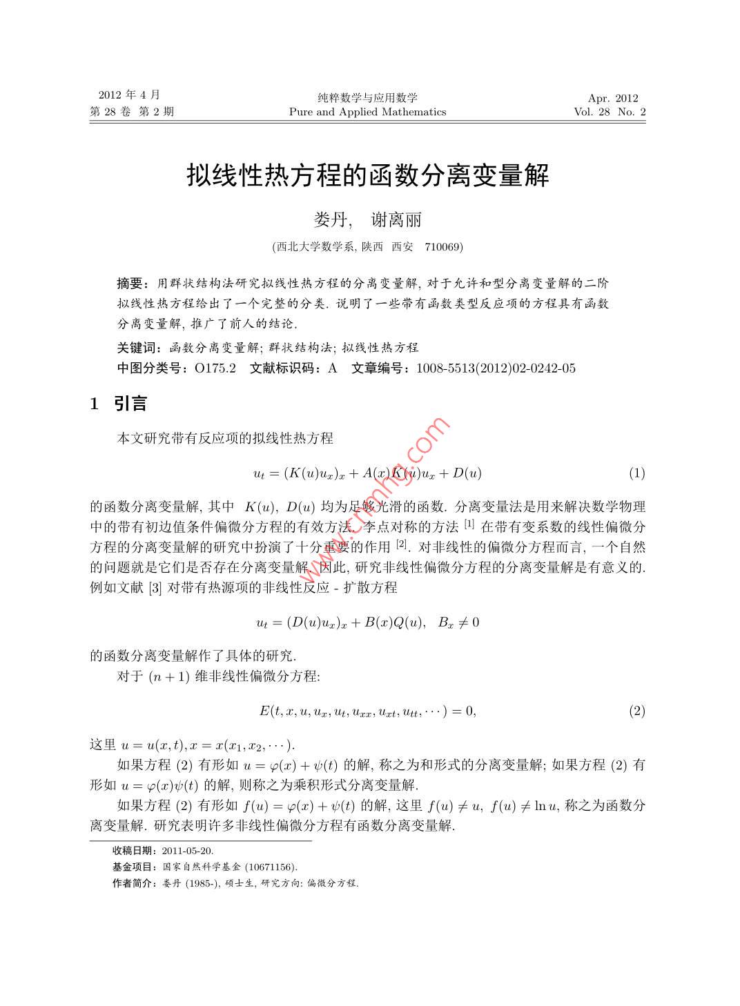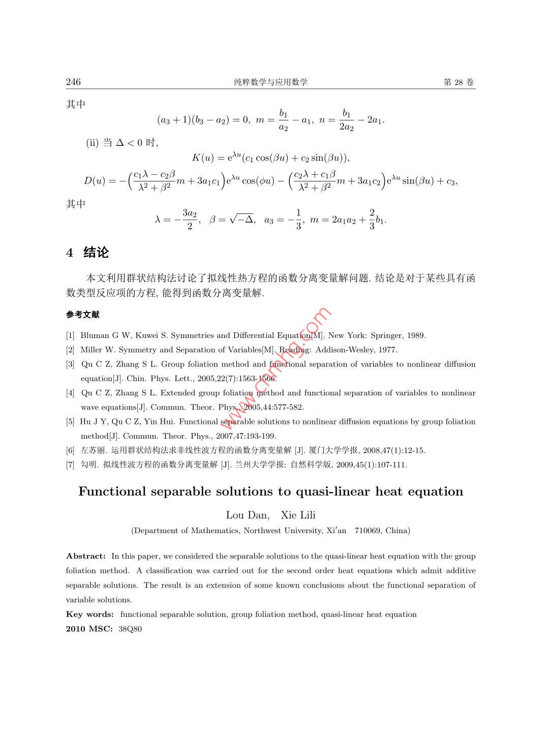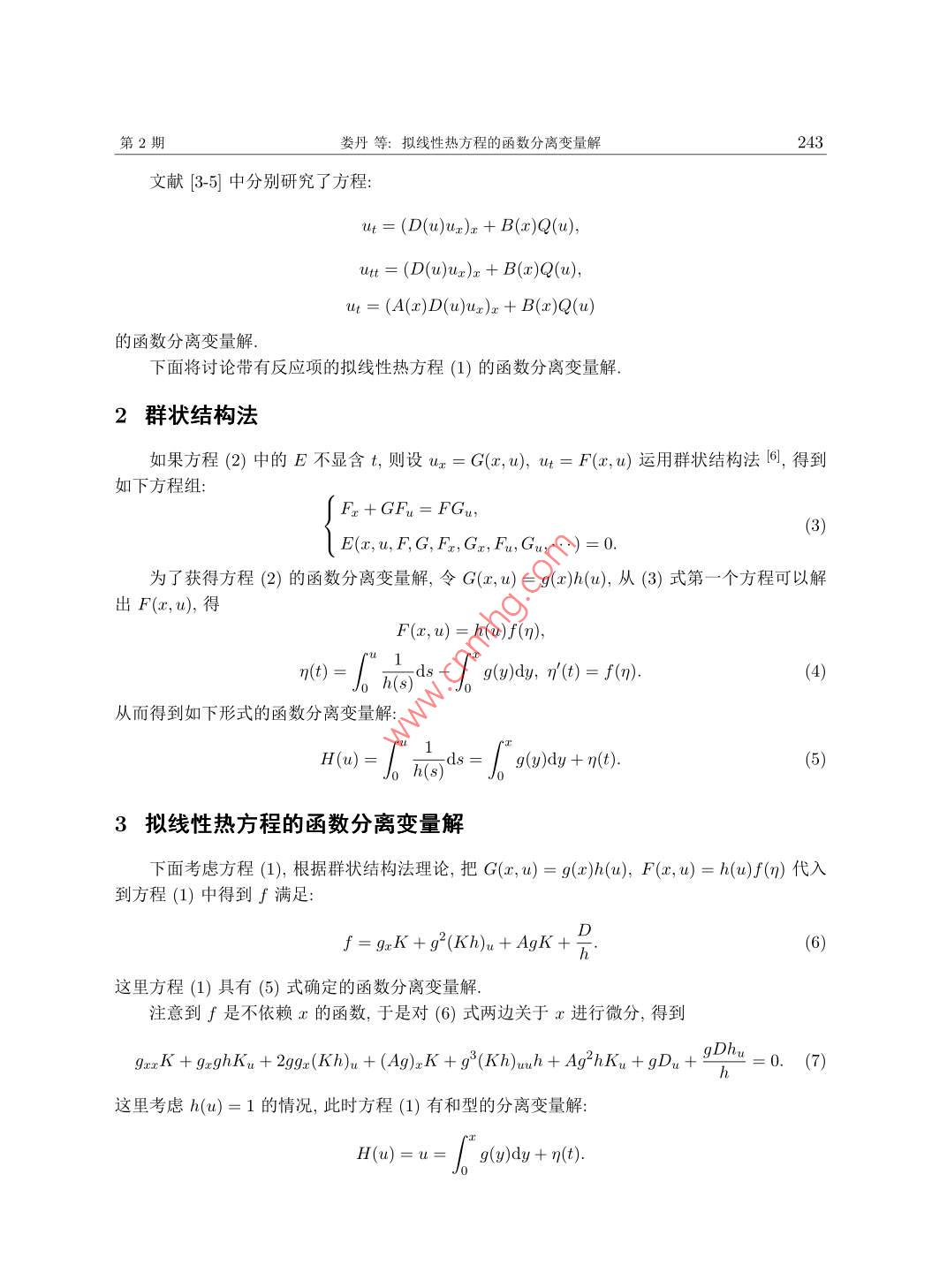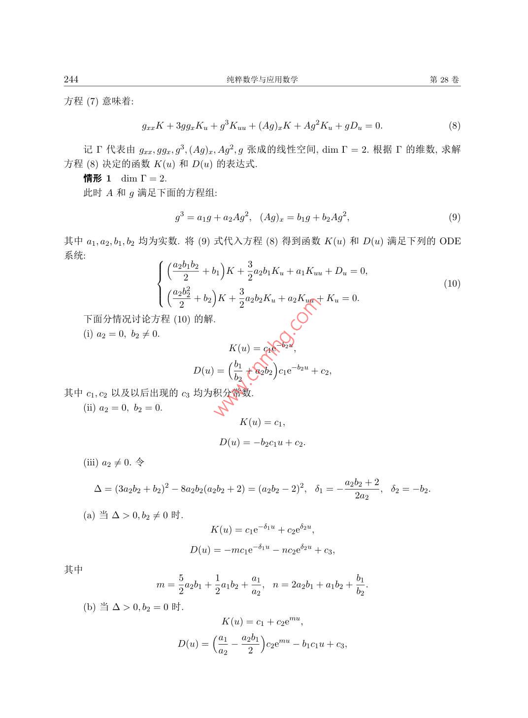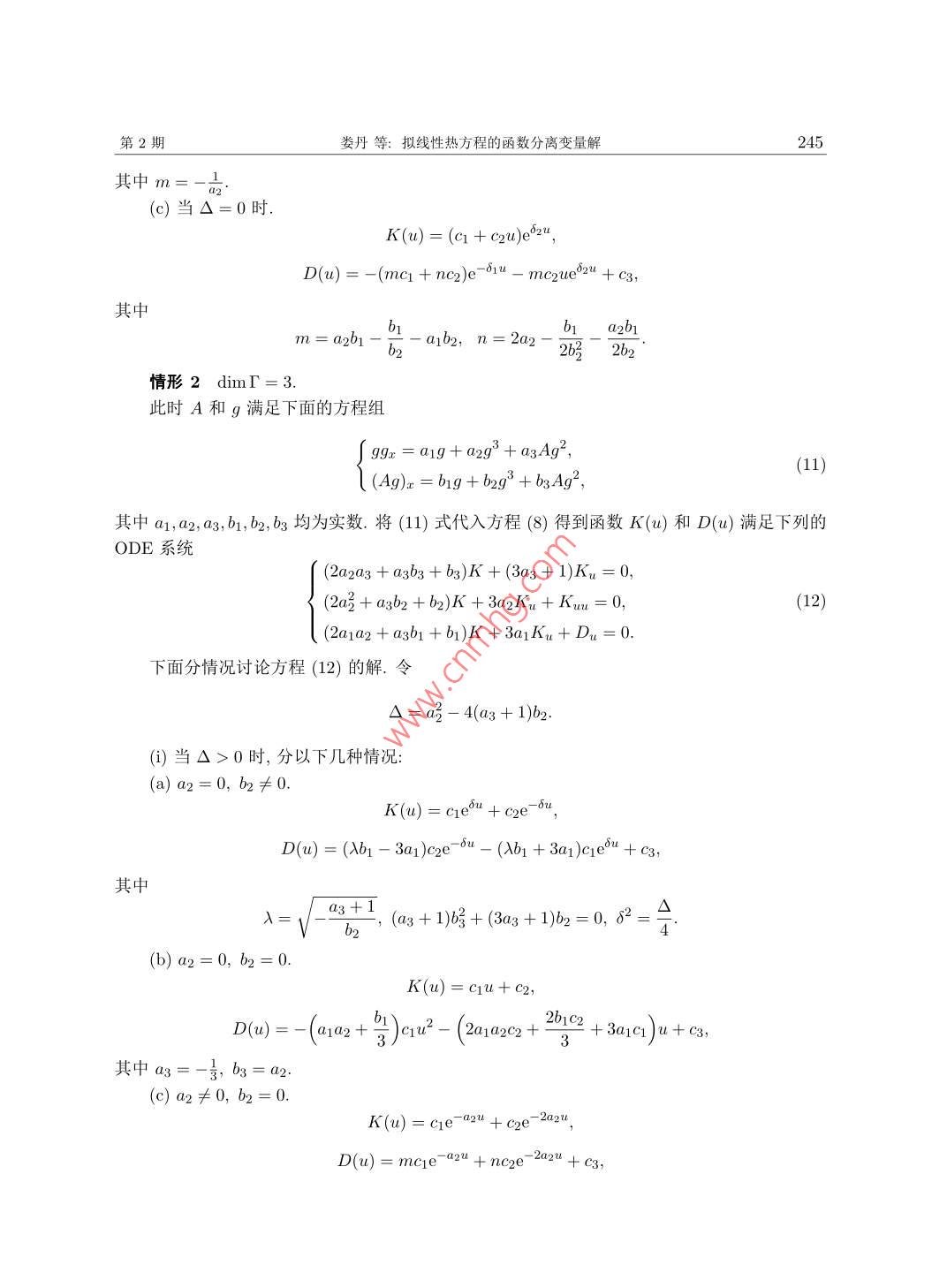 2012年4月純粹數(shù)學(xué)與應(yīng)用數(shù)學(xué)Apr.2012第28卷第2期Pure and applied mathematicsVol. 28 No. 2擬線性熱方程的函數(shù)分離變量解婁丹,謝離麗(西北大學(xué)數(shù)學(xué)系,陜西西安710069)摘要:用群狀結(jié)構(gòu)法硏究擬線性熱方程的分離變量解,對(duì)于允許和型分離變量解的二階擬線性熱方程給出了一個(gè)完整的分類.說(shuō)明了一些帶有函數(shù)類型反應(yīng)項(xiàng)的方程具有函數(shù)分離變量解,推廣了前人的結(jié)論,關(guān)鍵詞;函數(shù)分離變量解;群狀結(jié)構(gòu)法;擬線性熱方程中圖分類號(hào):O175.2文獻(xiàn)標(biāo)識(shí)碼:A文章編號(hào):1008-5513(2012)02-0242051引言本文研究帶有反應(yīng)項(xiàng)的擬線性熱方程ut=(K(uux)x+A(a)K(u)ux+ D(a)的函數(shù)分離變量解,其中K(u),D(l)均為足夠光滑的函數(shù).分離變量法是用來(lái)解決數(shù)學(xué)物理中的帶有初邊值條件偏微分方程的有效方法.李點(diǎn)對(duì)稱的方法在帶有變系數(shù)的線性偏微分方程的分離變量解的研究中扮演了十分重要的作用2.對(duì)非線性的偏微分方程而言,一個(gè)自然的問(wèn)題就是它們是否存在分離變量解.因此,研究非線性偏微分方程的分離變量解是有意義的例如文獻(xiàn)③對(duì)帶有熱源項(xiàng)的非線性反應(yīng)-擴(kuò)散方程ut=(D(u)ur)x+b(cQ(u),B2+0的函數(shù)分離變量解作了具體的研究對(duì)于(mn+1)維非線性偏微分方程:E(t, u, ux, ut, Wrr, Urt, utt, ...)=0這里u=u(x,t),x=x(x1,x2,…)如果方程(2)有形如u=(x)+v(t)的解,稱之為和形式的分離變量解;如果方程(2)有形如u=φ(x)v(t)的解,則稱之為乘積形式分離變量解如果方程(2)有形如∫(u)=φ(x)+(t)的解,這里f(au)≠u,f(u)≠lt,稱之為函數(shù)分離變量解.研究表明許多非線性偏微分方程有函數(shù)分離變量解.收稿日期:2011-05-20.基金項(xiàng)目:國(guó)家自然科學(xué)基金(10671156)作者簡(jiǎn)介:婁丹(1985-),碩士生,研究方向:偏微分方程第2期婁丹等:擬線性熱方程的函數(shù)分離變量解243文獻(xiàn)3-5中分別研究了方程ut=(D(u)ux)z+ B(a)Q(u),=(D(u)u)x+B(x)Q(),ut=(A(a)D(u)ux)x+ b(a)Q(a)的函數(shù)分離變量解,下面將討論帶有反應(yīng)項(xiàng)的擬線性熱方程(1)的函數(shù)分離變量解2群狀結(jié)構(gòu)法如果方程(2)中的E不顯含t,則設(shè)ux=G(x,u),w=F(x,u)運(yùn)用群狀結(jié)構(gòu)法6,得到如下方程組Fx +GFu= Fgu(3)E(a, u, F, G, Fx, Gx, Fu, Gu,".)=0為了獲得方程(2)的函數(shù)分離變量解,令G(x,u)=9(x)h(u),從(3)式第一個(gè)方程可以解出F(x,t),得F(x,)=h()f(m)n0=C“4+-0)=/m(4)從而得到如下形式的函數(shù)分離變量解h(sg(y)dy +n(t)3擬線性熱方程的函數(shù)分離變量解下面考慮方程(1),根據(jù)群狀結(jié)構(gòu)法理論,把G(x,u)=9(x)h(u),F(x,u)=h(u)f(m)代入到方程(1)中得到∫滿足:Df=gxK+g(Kh)u+Agkth這里方程(1)具有(5)式確定的函數(shù)分離變量解注意到∫是不依賴x的函數(shù),于是對(duì)(6)式兩邊關(guān)于x進(jìn)行微分,得到n5+90hKn+20(b)+(402+92(Kh)mnh+42hkn+gDn+9Dhn=0.(7)這里考慮h(ω)=1的情況,此時(shí)方程(1)有和型的分離變量解:H(u)=t=/9()dy+m(t)244純粹數(shù)學(xué)與應(yīng)用數(shù)學(xué)第28卷方程(7)意味著:gxrK+3ggxKu+g Kuu+(Ag)K+ AgKu+gDu=0記r代表由g,9,93,(Aq)x,Ag2,9張成的線性空間,dimr=2.根據(jù)r的維數(shù),求解方程(8)決定的函數(shù)K(x)和D(u)的表達(dá)式情形1dimT=2此時(shí)A和g滿足下面的方程組g3=a19+a24g2,(Ag)x=b1g+b24g2其中a1,a2,b1,b2均為實(shí)數(shù).將(9)式代入方程(8)得到函數(shù)K(u)和D()滿足下列的ODE系統(tǒng)2+b1K+oa2b1Ku +a1Kuu+Du=0,2+b2)K+3a2b2n+a2m+Kn=0.下面分情況討論方程(10)的解(i)a2=0,b2≠0K(u)=c1e-bzu(u)=(+a2b2c1e-b2+c2,b2其中c1,c2以及以后出現(xiàn)的c3均為積分常數(shù).(i)a2=0,b2=0.K(u)D()=-b2C1+(il2≠0.令△=(2+b2-8a2b(a22+2)=(02h2-2,61=-2+2,b2=-b2(a)當(dāng)△>0,b2≠0時(shí)K(u)=c1e-01x+c20(u)=-m1e-61-me2e92+c3,其中61+anb2a2b1+a1b2b(b)當(dāng)△>0,b2=0時(shí)K(u)=a1 a2b)c2emu-b1Ciu第2期婁丹等:擬線性熱方程的函數(shù)分離變量解245其中m=-1(c)當(dāng)△=0時(shí)K(u)=(D(u)=-(mc +nc2e-o1u-mc2ue02u+ C3其中b=b2如-動(dòng)情形2dim=3.此時(shí)A和g滿足下面的方程組99x=a19+a2g°+a3Ag11)(Ag)x=b19+b29+b3A92其中a1,a2,a3,b1,b2,b3均為實(shí)數(shù).將(11)式代入方程(8)得到函數(shù)K()和D(u)滿足下列的ODE系統(tǒng)(2a203+a3b3+b)K+(3a3+1)Kn=0,2a2+a3b2 +b2)K+3a2Ku+Kuu=0(2a1a2+a3b1+b1)K+3a1Kn+Da=0.下面分情況討論方程(12)的解.令a2-4(a3+1)b2(i)當(dāng)△>0時(shí),分以下幾種情況:0,b2≠0K(u)=cie u+C2e-ouD(u)=(Mb1-3a)e2e-0u-(Xb1+3a1)c1e+c3其中a3+1,(a3+1)63+(303+1)b2=0,6(b)a2=0,b2=0Ctua1a2+e12-(2a1a2c2+2b1c3+3a1c1)+e3,其中(c)a2≠0,b2=0K(u)D+nce246純粹數(shù)學(xué)與應(yīng)用數(shù)學(xué)第28卷其中(a3+1)(b3-a2)b12(i)當(dāng)△<0時(shí),K(u)=e(c1 cos(Bu)+C2 sin(Bu))CC2)+C1入2+B1C1cOSx2+B2m+301c2edu sin(u)+其中入B△,a3=-,m=2a1a2+b14結(jié)論本文利用群狀結(jié)構(gòu)法討論了擬線性熱方程的函數(shù)分離變量解問(wèn)題.結(jié)論是對(duì)于某些具有函數(shù)類型反應(yīng)項(xiàng)的方程,能得到函數(shù)分離變量解參考文獻(xiàn)[1 Bluman G W, Kuwei S Symmetries and Differential Equation M. New York: Springer, 1989[2 Miller W. Symmetry and Separation of Variables[M]. Reading: Addison-Wesley, 1977.3 Qu C Z, Zhang S L Group foliation method and functional separation of variables to nonlinear diffusionequation[J. Chin. Phys. Lett., 2005, 22(7): 1563-15664 Qu C Z, Zhang S L. Extended group foliation method and functional sepa