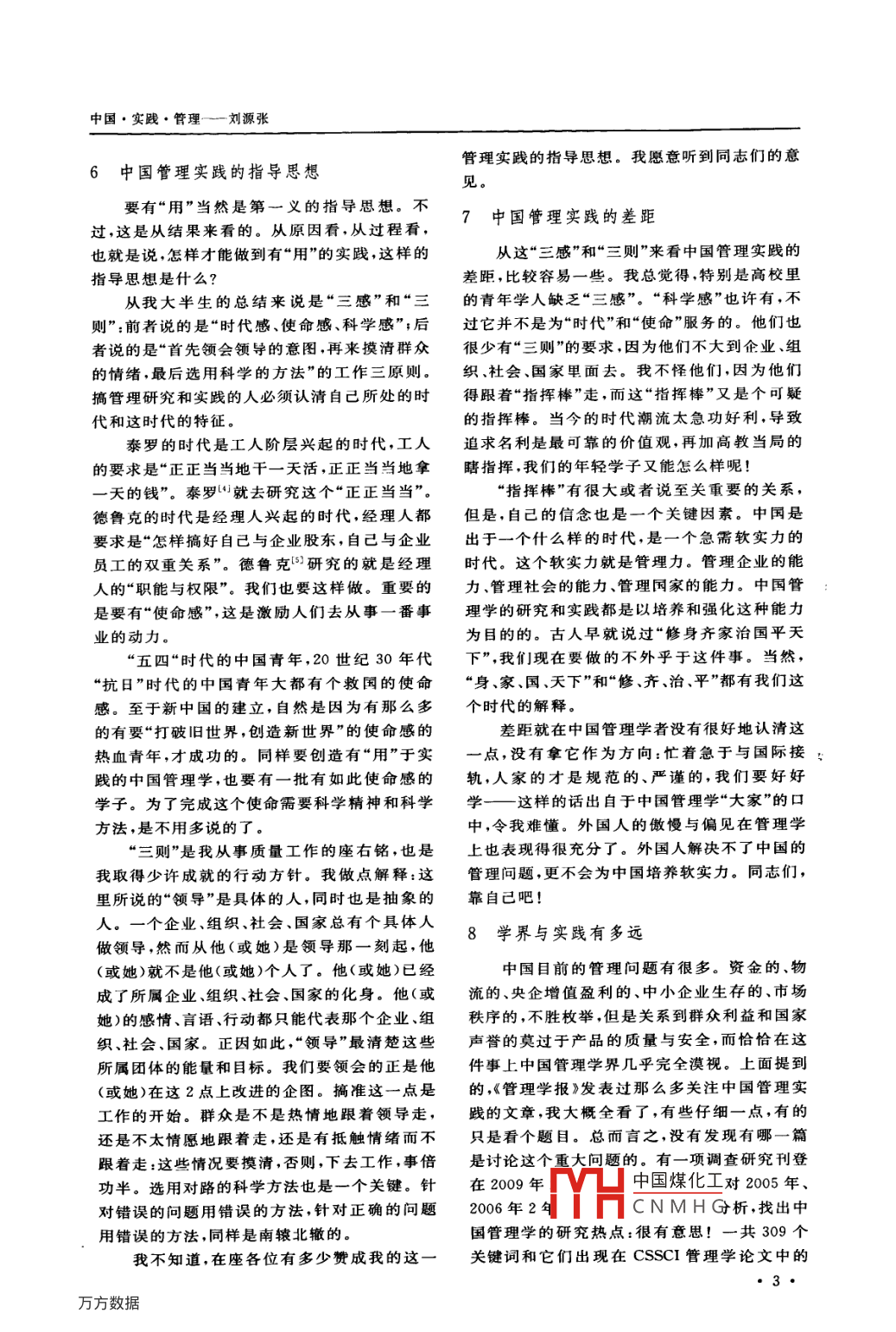 第9卷第1期管理學(xué)報Vol 9 No2012年1月Chinese Journal of ManagementJan.2012中國·實(shí)踐·管理劉源張(中國科學(xué)院數(shù)學(xué)與系統(tǒng)科學(xué)研究院)摘要:探討了直面中國實(shí)踐的管理研究的基本問題諸如問題的緣由、學(xué)術(shù)背景、致用的內(nèi)涵、指導(dǎo)思想、當(dāng)前差距等,對在我國反思和開展基于中國實(shí)踐的管理研究極具啟發(fā)。關(guān)鍵詞:中國;實(shí)踐;管理中圖分類號:C93文獻(xiàn)標(biāo)識碼:A文章編號:1672-884X(2012)01-0001-04China Practice ManagementLIU YuanzhangAcademy of Mathematics and Systems Science, Chinese Academy of Sciences, Beijing, China)Abstract: This paper discusses the fundamental issues of management directly for managementpractice in China, such as the causes of issue, academic background, meaning of practical adoptionguiding ideology and the current gap. It is suggestive for reflecting on and undertaking research inmanagement in China.Key words China; practice; management本次論壇的主題是“中國·實(shí)踐·管理”,來了。不過,在說管理之前,我得先聲明幾句:允許我就把它作為我這次講話的標(biāo)題。以下分首先,我的局限。我只是在質(zhì)量管理這方面做10個問題來說說我的想法。了一些工作,也做了一些學(xué)術(shù)上的思索。別的管理,無論是作為工作還是作為學(xué)術(shù)學(xué)術(shù),方面我充其量不過是涉獵了一點(diǎn)。拿京劇的用語說,我在這些方面不是“專業(yè)演員”,而只是都是一個龐大的體系個“票友”。其次,我這個人懶得很,話是講了許從工作上說,“經(jīng)國濟(jì)民”,“修身齊家治國多,很少把它寫下來,投到期刊上的就更少了。平天下”這些老詞所說的就是管理工作;新詞的也許因為這個緣故,僅有的一點(diǎn)上期刊的東西“構(gòu)建和諧社會”、“轉(zhuǎn)型升級”以及“節(jié)能減排”也很少,甚至可以說絕無被學(xué)者引用。其三,因自然也都是管理工作。這些管理工作又都構(gòu)成此,我不能算是學(xué)術(shù)圈里的人,頂多是個邊緣人一個龐大的體系,所以,人們往往用“系統(tǒng)工程”物;可是,站在圈外,看圈內(nèi)也許看得更清楚這個詞來訴說它們的龐大和復(fù)雜:其實(shí)是暗示些,并且,還有一種便宜:我說錯話,圈內(nèi)的人或它們不好干。從學(xué)術(shù)上說,管理這門學(xué)問的稱許還能原諒,當(dāng)做外行話,也就不那么深究了。呼本身就是一個有爭論的課題??梢?要把管今天的會,我就是以這種心情來參加的。再說,理作為一門學(xué)術(shù)說清楚是一件不容易的事情。我實(shí)踐了質(zhì)量管理近60年,確是感覺有些話可至于它的內(nèi)容,那就更是五花八門,以致有人評以在這會上說一說。不過,我這個年近90的人說它是“叢林”。讓我看,它簡直是“深淵”如果不能脫俗,說起話來,難免嘮叨。請同志們諒解輕易來發(fā)表自己對它的見解,弄不好掉進(jìn)去,很。最后,把管理當(dāng)作學(xué)術(shù)來討論,我用管理可能萬劫難復(fù)了。學(xué)來稱呼,沒有定義2我來說管理,實(shí)在惶恐3為什么要來談?wù)f中國管理實(shí)踐論壇組織者要我來說說管理和實(shí)踐,我也有人說想借這個機(jī)會會會老朋友認(rèn)認(rèn)新朋友所以就踐派和文獻(xiàn)Ha中國煤仆分2種:實(shí)是說,干實(shí)CNMHG收稿日期:2011-11-21本文系作者在2011中國·實(shí)踐·管理”論壇上的大會報告—編者注管理學(xué)報第9卷第1期2012年1月踐的全然不理文獻(xiàn);查文獻(xiàn)的全然不顧實(shí)踐。實(shí)踐的本質(zhì)。還有人說,是理論家與實(shí)踐者的區(qū)別。這兩種《管理學(xué)報》自2004年創(chuàng)刊以來,就致力說法大同小異;但是,正如人們常說的:“理論來于推動中國管理實(shí)踐。卷首欄中發(fā)表的這方面自實(shí)踐,反過來理論又指導(dǎo)實(shí)踐”,那么,上面那的論文不下百篇?!豆芾韺W(xué)報》發(fā)起的“管理學(xué)些說法是不是有點(diǎn)批評的含義呢!本來,理論在中國”學(xué)術(shù)研討會已召開4屆;“中國·實(shí)踐與實(shí)踐應(yīng)該是統(tǒng)一的。管理”論壇今年是第2屆。在座各位想必都我曾經(jīng)想稍稍改變這種理論研究與實(shí)際需曾參加過這些活動或撰文。討論的主題大約要的脫節(jié),為中國科學(xué)院辦過一點(diǎn)事,是20世是,中國管理實(shí)踐的標(biāo)準(zhǔn)是什么,怎么評價中國紀(jì)80年代的事了。我把中科院與東風(fēng)汽車公管理實(shí)踐,中國管理實(shí)踐的現(xiàn)狀又是怎樣的這司,又把中科院與燕山石化公司拉到一起,讓他幾個問題。我無法一一敘述各位學(xué)者的學(xué)說或們2家坐在一起談?wù)?又把2家的研究項目和主張,還是讓我說說我自己的觀點(diǎn)吧應(yīng)用需求擺了一個小型展覽,都是雙方領(lǐng)導(dǎo)出面的。雖然事后沒能達(dá)到合作的地步,但是結(jié)5學(xué)術(shù)研究和實(shí)踐工作的“用”是什么果卻使雙方都看到了理論與實(shí)踐的脫節(jié)。這是“之道”和“致用”所說的“用”,指的是什么,自然科學(xué)和技術(shù)科學(xué)的事。社會科學(xué)方面,我答案似乎很簡單。不過,我覺得這里面說道不也有一點(diǎn)類似的故事。也是20世紀(jì)80年代的少。其實(shí),這恐怕是一道難題。反正,我看有3事了。當(dāng)時的總理趙紫陽起初想要一個個人的個“絕不是”:第一,絕不是在所謂