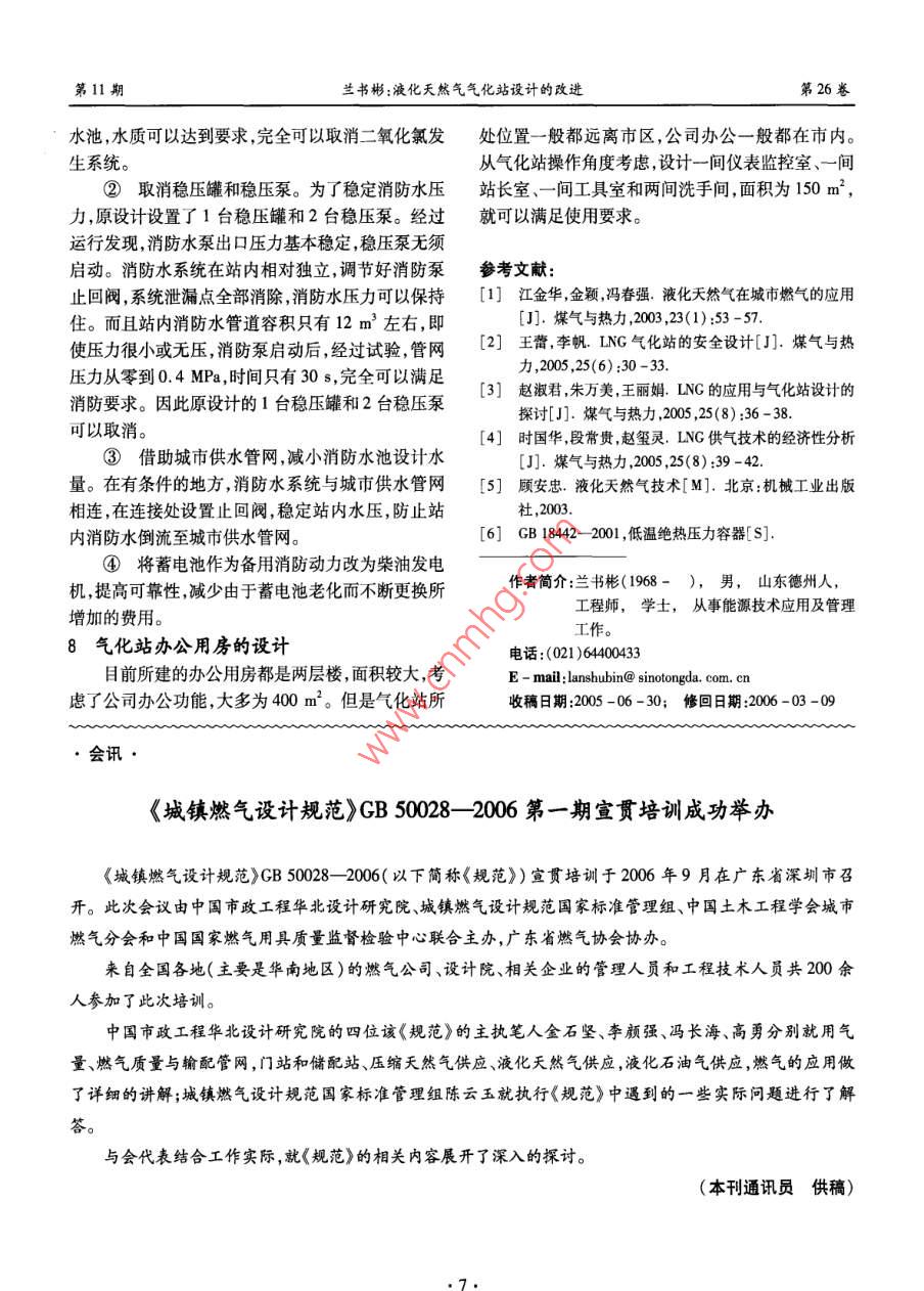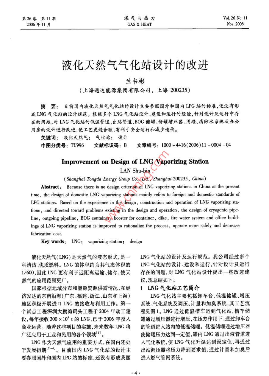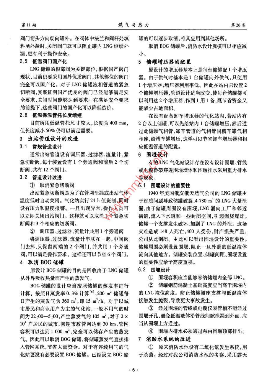 第26卷第11期煤氣與熱力 Vol. 26 No. 112006年11月 GaS HEATNov.2006液化天然氣氣化站設(shè)計(jì)的改進(jìn)蘭書彬(上海通達(dá)能源集團(tuán)有限公司,上海200235)摘要:目前國內(nèi)液化天然氣氣化站的設(shè)計(jì)主要參照國外和國內(nèi)LPG站的標(biāo)準(zhǔn),還沒有形成LNG氣化站的設(shè)計(jì)規(guī)范。根據(jù)多個(gè)LNG氣化站設(shè)計(jì)、建設(shè)和運(yùn)行的經(jīng)驗(yàn),針對設(shè)計(jì)及運(yùn)行中存在的問題,對LNG氣化站的低溫管道、出站管道BOG儲罐、儲罐增壓器、圍堰、消防水系統(tǒng)及辦公用房的設(shè)計(jì)進(jìn)行改進(jìn),使工藝更趨合理,有利于安全運(yùn)行和減少造價(jià)。關(guān)鍵詞:液化天然氣;氣化站;設(shè)計(jì)中圖分類號:TU996文獻(xiàn)標(biāo)識碼:B文章編號:1000-4416(2006)11-0004-04 Improvement on Design of LNG Vaporizing Station LAN Shu-bin Shanghai Tongda Energy Group Co., Lutd., Shanghai 200235, China) Abstract: Because there is no design criterion of LNG vaporizing stations in China at the present time, the design of domestic LNG vaporizing stations mainly refers to foreign and domestic standards of LPG stations. Based on the experience in the design, construction and operation of LNG vaporizing sta- tions, and directed toward problems existing in the design and operation, the design of cryogenic pipe- line, outgoing pipeline, BOG container, booster for container, dike, fire water system and office build- ings of LNG vaporizing station is improved to rationalize the process, operate more safely and decrease fabrication cost. Key words: LNG; vaporizing station; design液化天然氣(LNG)是天然氣的液態(tài)形式,是一g氣化站的設(shè)計(jì)及運(yùn)行規(guī)范。我公司經(jīng)過多個(gè)種清潔、優(yōu)質(zhì)燃料。LNG的體積約為其氣態(tài)體積的LNG氣化站的設(shè)計(jì)、建設(shè)和運(yùn)行,針對設(shè)計(jì)及運(yùn)行1/600,因此LNG更有利于遠(yuǎn)距離運(yùn)輸、儲存,天存在的問題,對LNG氣化站設(shè)計(jì)提出一些改進(jìn)建然氣的應(yīng)用范圍更廣。議,現(xiàn)總結(jié)如下。國家根據(jù)地域分布和能源資源供需情況,在經(jīng)1g氣化站工藝簡介濟(jì)發(fā)達(dá)的東南沿海(廣東、福建、浙江、山東和上海)LNG氣化站主要包括卸車臺、低溫儲罐、增壓地區(qū)積極開展進(jìn)口LNG的接收與利用工作。第一系統(tǒng)、氣化系統(tǒng)及調(diào)壓、計(jì)量和加臭系統(tǒng),其工藝流個(gè)試點(diǎn)工程深圳大鵬灣碼頭工程于2004年動工建程見圖1。LNG通過低溫槽車運(yùn)到氣化站,槽車儲設(shè),每年接收300×104t的LNG,已于2006年入罐通過增壓器進(jìn)行增壓,在壓差作用下,通過卸車臺商業(yè)運(yùn)營。隨著這些項(xiàng)目的實(shí)施,未來數(shù)年LN將的管道進(jìn)入站內(nèi)的低溫儲罐。低溫儲罐通過增壓器廣泛應(yīng)用于工業(yè)和民用的各個(gè)領(lǐng)域。使儲罐壓力達(dá)到一定值,罐內(nèi)LNG通過出液管道進(jìn)LNG作為天然氣應(yīng)用的重要方式,在國內(nèi)還處人氣化系統(tǒng),使LNG氣化升溫達(dá)到設(shè)定值,再通過于發(fā)展初期2-4目前國內(nèi)LNG氣化站的設(shè)計(jì)主出站調(diào)壓器將壓力降到要求值,通過計(jì)量和加臭后要參照國外和國內(nèi)LPG站的標(biāo)準(zhǔn)還沒有形成我國進(jìn)入燃?xì)夤芫W(wǎng)系統(tǒng)。第11期蘭書彬:液化天然氣氣化站設(shè)計(jì)的改進(jìn)第26卷皿放散氣加熱器g加熱器放空管NG槽車空浴式氣化器水浴式氣化器BOG儲罐調(diào)壓裝置計(jì)量裝置進(jìn)入城市管加臭裝置卸車增壓器儲罐增壓器圖1LNG氣化站工藝流程 Fig. Process flow of LNG vaporizing station2低溫管道設(shè)計(jì)變化容易產(chǎn)生微小泄漏,因此閥門大多采用焊接連2.1低溫管道管徑適當(dāng)縮小接,盡量減少法蘭連接的數(shù)量,以減少LNG泄漏的減少昂貴的低溫管道的使用量是降低造價(jià)的有可能性。但是由于周期性檢修和臨時(shí)檢修的需要,效方法。由于低溫管道的建設(shè)費(fèi)用幾乎與管道直徑系統(tǒng)內(nèi)必須要有法蘭連接,以便于管道斷開、隔離、成比例增長,因此要合理選擇管徑。置換和吹掃。特別是在儲罐和管道連接部位必須在以城市燃?xì)夤?yīng)為主的氣化站,以日供氣量根部閥前設(shè)置法蘭連接,以便管道儲罐的周期檢驗(yàn)。25000m3/d為例,每天需要供應(yīng)1車氣(約40m目前我公司已經(jīng)在儲罐上進(jìn)液和氣相管道根部閥前的LNG)。目前氣化站所設(shè)卸液管道通常都為DN設(shè)置了法蘭連接。65mm,卸1車氣的實(shí)際時(shí)間約3h。卸車速度主要采用法蘭連接后為了盡量減少泄漏,增加安全取決于兩罐壓差,如果提前將準(zhǔn)備充液的儲罐壓力性,法蘭宜采用凹凸面法蘭,墊片采用聚四氟乙烯降低,提高壓差,根據(jù)經(jīng)驗(yàn),卸車速度按3m/s計(jì)板,平面法蘭宜采用金屬纏繞式墊片(Cr8Ni9+石DN50mm管道卸1車氣的理論卸車時(shí)間約2h。因墨或聚四氟乙烯帶),可以防止由于墊片破壞而造此對于供氣量為25000m3/d的氣化站,卸車管道成LNG的大量泄漏??煽s小到DN50mm,與槽車管徑一致。2.4儲罐根部閥門安裝方向的改進(jìn)管道直徑縮小后,相應(yīng)的低溫閥門、止回閥、卸①截止閥結(jié)構(gòu)特點(diǎn)車金屬軟管及管件的通徑都相應(yīng)縮小,節(jié)約資金。從閥門結(jié)構(gòu)來看,截止閥密封點(diǎn)有閥座、閥體中2.2取消U