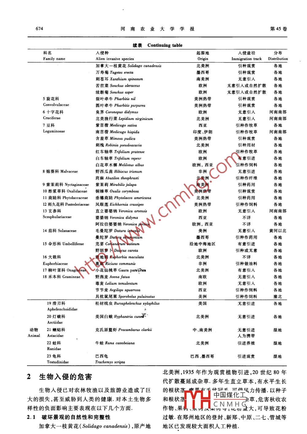第45卷第6期河南農業(yè)大學學報Vol.45 No. 62011年12月.Journal of Henan Agricultural UniversityDec.2011文章編號:1000 -2340(2011)06 -0672 -06河南省生物入侵種調查及對策研究李長看',張云霞',賈元翔”,張光宇’(1.鄭州師范學院生命科學系,河南鄭州450044; 2.河南農業(yè)大學,河南鄭州450002 ;3.河南省野生動物救護中心,河南鄭州450044)摘要:通過調查研究,確認河南外來入侵物種有23科60種,包括植物18科55種,動物5科5種.研究表明生物入侵危害日益加劇,防范工作迫在眉睫.建議加強對引進種的管理、研究與長期監(jiān)測;加強國內外合作,共建入侵物種數(shù)據信息系統(tǒng);完善相關法律法規(guī);加強科普教育,提高公眾防范意識.關鍵詞:生物入侵;入侵物種;入侵危害;防范對策中圖分類號:Q949文獻標志碼:AResearch on investigation into the alien invasive biological speciesin Henan Province and measure for itLI Chang-kan' , ZHANG Yun-xia' ,JIA Yuan-xiang2 ,ZHANG Cuang-yu'(1. Life Sciences of Department, Zhengzhou Normal University , Zhengzhou 450044,China;2. Henan Agricultural University ,Zhengzhou 450002, China;3. Wildife Rescue Center of Henan Province ,Zhengzhou 450044, China)Abstract: Investigation has confirmed 23 families, 60 species as alien invasive biological species inHenan Province,which include plants of 18 families and 55 species, and animals of 5 families and 5spieeies. Research results show the alien invasion is increasingly violent, and the precaution and con-troling are extremely urgent. This paper suggests strengthening management research and monitoring ofintroduced species ,strengthening cooperation with foreign countries ,coestablishing data imformationsystem, perfecting law and regulation, enhancing education about popular science spreading, and ad-vancing the general public' s consciousness of precaution and controling.Key words : alien invasive biology ; invasive species ; invasive damage ; measure of precaution and con-troling千百年來,人類從全球各地引進動物和植物.1645年開通的伽瑪航線,將甘薯、煙草、銀合歡、金.可供食用的動植物中外來物種高達90% ,若沒有合歡等引進. 1840年鴉片戰(zhàn)爭后,荊豆、一年蓬、小外來種的雜交與馴化,人類至今可能依然無法解決白酒草等外來雜草進人中國.大部分外來物種,如衣食等生活的基本需求.中國從域外引進良種的歷玉米、小麥、馬鈴薯、番茄、西瓜、南瓜、刺槐、懸鈴史頗為悠久.公元前4世紀,“蜀-印度道”將非洲木郁金香等,或作為糧食、蔬菜、用材、或作為觀的酸豆引進中國.公元前1世紀,“絲綢之路”上,賞,在一定程度 上促進了人類社會的發(fā)展.但在進張騫從中亞帶回葡萄、紫苜蓿、石榴等經濟作物.入“地球村”時代“生物A倡"正在成為喪失生物中國煤化工HY HCNMHG收稿日期:2011-09-16.基金項目:河南省政府決策研究課題(豫B339);鄭州市科技攻關項目(0910SGYS34371).作者簡介:李長看,1967年生,男,河南登封人,副教授,從事動物生態(tài)及資源保護教學研究.第6期李長看等:河南省生物人侵種調查及對策研究673多樣性的“3大殺手”之一,進而對本土生態(tài)乃至人依據.類生存構成極大威脅.對于生物人侵,人們或許陌1河南主要入侵物種生,然而- .提起口蹄疫(FMD)、瘋牛病( BSE)、非典(SARS)、甚至艾滋病(AIDS),人類并不陌生,其由于河南的地理環(huán)境更適宜外來物種棲息,人實它們都是生物入侵的成員.“生物入侵"概念由侵呈下列特點:①涉及地域廣.河南各地發(fā)現(xiàn)生物美國人EITON于1954年率先提出.“外來種”與人侵種,即使山區(qū),如在滎陽環(huán)翠峪山頂即多次采“人侵種”是兩個概念,二者既有聯(lián)系,又有區(qū)別.集到“曼陀羅".②涉及的生態(tài)系統(tǒng)多.森林生態(tài)系“外來種”泛指非本土原產的外域種.“人侵種”是統(tǒng)、農田生態(tài)系統(tǒng)、濕地生態(tài)系統(tǒng)、甚至城市生態(tài)系外來種中歸化的生物物種.具有3個標準:借助人統(tǒng)中都不乏人侵種.③涉及的物種類型多.研究表類活動引人自然分布區(qū)以外;在當?shù)氐淖匀换蛉斯っ?在河南人侵生物中,包括動物、植物、微生物.已生態(tài)系統(tǒng)中建立種群;對當?shù)厣鷳B(tài)系統(tǒng)和景觀造成有報道的53種植物中,美洲起源的外來人侵種所威脅,損害生物多樣性.據資料統(tǒng)計:所有外來物種占比例最大,為54.5%,有29種;熱帶起源的外來中,約有10%能在新的生態(tài)系統(tǒng)中自行繁殖,可自人侵種為22種,占41.5%[2.④轉基因物種存在行繁殖的外來種中約10%能造成生物災害而成為人侵風險.近年經濟作物引進中,如轉基因大豆、棉人侵種.僅為外來物種1%的入侵種卻給世界造成花等,均不同程度存在人侵風險.巨大的損失.目前統(tǒng)計人侵中國的外來種已達400余種,世界自然保護聯(lián)盟(IUCN.2001)公布的“全通過文獻(2-7]及調查研究,基本確認目前河南球最具威脅的100種入侵種”中,已有50%人侵了外來入侵物種統(tǒng)計有23科、60種,包括植物18科中國,是全球受外來生物人侵影響最大的國家之.55種,動物5科5種.人侵植物中草本植物53種、-1. 河南地處中原,氣候溫和,使多數(shù)外來物種占96.4%.基本.上屬于田間雜草,起源地多為美洲能更容易找到合適的棲息地.因而河南省對外來物和歐洲,僅人侵中國的主要惡性雜草,就有26種人種的防控任務更為嚴峻.本文在前人工作的基礎侵河南.按類群統(tǒng)計:菊科14種、占人侵物種的上2-”),調查研究了河南外來物種的現(xiàn)狀,并針對23.3%