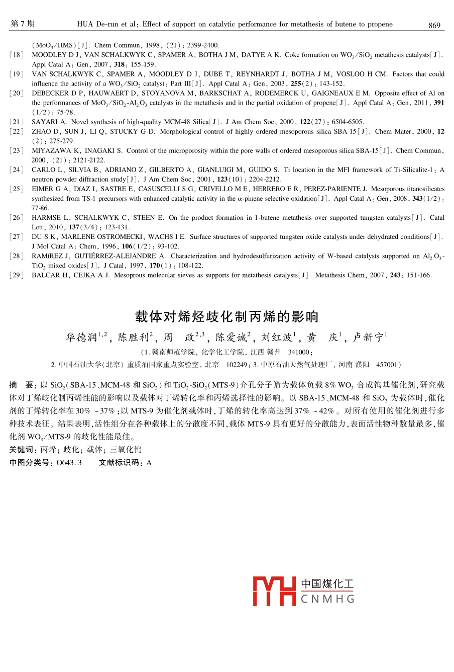 第42卷第7期燃料化學(xué)學(xué)報(bào)Vol 42 No. 7014年7月Journal of Fuel Chemistry and TechnologyJul.2014文章編號(hào):0253-2409(2014)070865-05Effect of support oncatalytic performance for metathesis of butene to propeneHUA De-run''-. Chen Sheng-Ii-. ZHOU-chenng, LIU Hong-bo, HUANG QingXin-ning(1. Gannan Normal University, Chemical Institute of Chemical Industry, Ganzhou 341000, China2. China University of Petroleum, State Key of Heavy Oil Processing, Beiying 102249, Chi3. Natural Gas Treating Plant, Sinopec Zhongyuan Oilfield Branch, Puyang 457001, ChinaAbstract: The catalysts with SBA-15, MCM-48, SiO,, and MTS-9 as supports were synthesized with 8% WO,, and theircatalytic performance for metathesis of butene to propene were carried out. The conversion of butene is 30%0-37% on the catalystswith SBA-15, MCM-48, and Sio, as supports, and that of butene is 37%0-42% on WO,/MTS 9 catalyst. The catalystcharacterization results show that the catalytic activities depend on the acidic numbers of catalysts prepared and the distribution oftungstens on the supports used. As a result, the performance of 8% WO,/MTS-9 catalyst for the titled reaction is bestKeywords: propene; metathesis; support; wO3CLC number: 0643. 3 Document code : Arec, Olefin metathesis is a catalytically induced attracted the most attentionComparedtion wherein olefins undergo bond reorganization, conventional catalyst supported molybdenum andresulting in a redistribution of alkylidene moietiesenumcatalysts supported tungstenwereOlefin metathesis was first reported by Eleuterio in thoroughly investigated for a long time due to19632, which has been regarded as an important considerable resistance to poison19.Bureaction for the conversion of low value olefin into few reports on an effect of support on metathesis ofdemanded olefinic substrates.,3-6. The reaction butene to propone 4, 5, Ipathways of olefin metathesis can be illustrated asThe highlight of the paper was to investigate theshowed in Figure 1effect of support on the activity of catalysts forthesis of butene toorts withR, CH: CHRRCHdifferent pore sizes and architectures had beenemployed in this study: conventional SiO,, SBA-15of hexagonal structure cubic mCm-48 with threeR CHECHRR CHR CHdimensional intersecting channels, MTS-9 containingFigure 1 Reaction of olefin metathesistitanium. The effect of support on catalyst activityand selectivity was investigatedThe catalytic activity was found to dependparticularly on the content of active component,8)Eexperimenthe state of active component 9, activation 1.1 Synthesis of supportsprepand theMCM-48 was hydrothermally synthesized fromproperties of the support 4, 5, 13. As concerns support, an assembly of surfactant micelle( CTAB ) withsupport often affected the dispersity and properties of silicate precursors in alkali media as described in thesupported metal oxide, which resulted in catalysts literatureexhibiting different catalytic activity. MoreoverMesoporous SBA-15 was synthesized in stronglyreducibility of catalyst was dependent on supportacidic mediaSo support was important to metathesis catalystMTS-9 was hydrothermally synthesized frorMesoporous materials have a unique characteristic, assembly of triblock polymers( P123)with preformedand are candidates for support. Mesoporous silica- titanosilicate precursors in strongly acidic media(pHbased catalysts exhibited higher activity, which was valud中國(guó)煤化工 ure. First, precursorsattributed to the better dispersion of the active phase cont,nanoclustersrfaceThe preplHCNMHsupported tungsten oxide catalysts had a high potential assembled with triblockcopolymers in a strong acidfor practical applications in metathesis 6. I and medium (ph value< 1). The synthesis procedure forReceived date. 2013-11-27: Received in revised form: 2014-03-1Correspondingauthor:CHENSheng-li,E-mail:slchen@cup.edu.cn.866燃料化學(xué)學(xué)報(bào)第42卷All catalysts were prepared by the wet 1.4 Test of catalysts 73MTS-9 was reported in detail in literature 2.used as the excitation sourcespectrum reso1. 2 Preparation of catalystswas estimated to be 4.0impregnation method. The WO, to support ratio( inCatalytic properties ofcatalysts wereweight)of catalyst was 8.0%. The impregnated evaluated by the metathesis of butene. The metathesisproducts were dried at 80C for 12 h, and then the was carried out in a down flow fixed bed stainlesscatalysts were thermally treated at 550 C for 4hsteel microreactd.C4 stream was1. 3 Characterization of catalyststreated through basf adsorbents selexsorb Cd andX-ray powder diffraction patterns of the catalycos for the removal ofwere recorded on a Bruker D8 ADVACe compounds and other trace contaminants, which candiffractometer, using Cu Ka (0. 15406 nm) cause catalyst deactivation. Before introduction of C4radiation in the 20 range of 10-60 with a scanning stream into the reactor, the catalyst was pretreatedrate of 1(o)/min. N, adsorption-desorption isotherms situ with a mixture flow of N, and H, for 30 min atat-196C were recorded with a Micromeritics ASAP 420C. Weight hour space velocity( WHSV of the2010 automatic sorption analyzer. The bet surface metathesis reaction was 6. 4 h. All products wereareas were calculated from the desorption isotherms in analyzed using a gas chromatograph equipped with athe relative pressure range of p/po=0.01-1.0. UV- flame ionization detector FID )and a 50 m PONARaman spectra were obtained on a Hr800 UV-Raman capillary column. The reaction pathways werespectrograph( Horiba Jobin Yvon Company, illustrated in Figure 2 in detailFrance). The 244.0 nm line from a He-Cd laser iscross-metathesisCH CH-CHCICH, CH=CH, +CH, CH=CHCH, CHelf-metathesisCHCH,+CHCH, CH=CHCH, CHcross-metathesis2CH CHECHH CH CHECHCHCHCH=CHFigure 2 Possible reaction pathways of 2-butene2 Results and discussionAmong all catalyst, 8% WO,/MTS-9 exhibited2.1 Test of catalyststhe highest activity. Activity of 8%WO,/SiO,wasFigure 3 shows the effect 