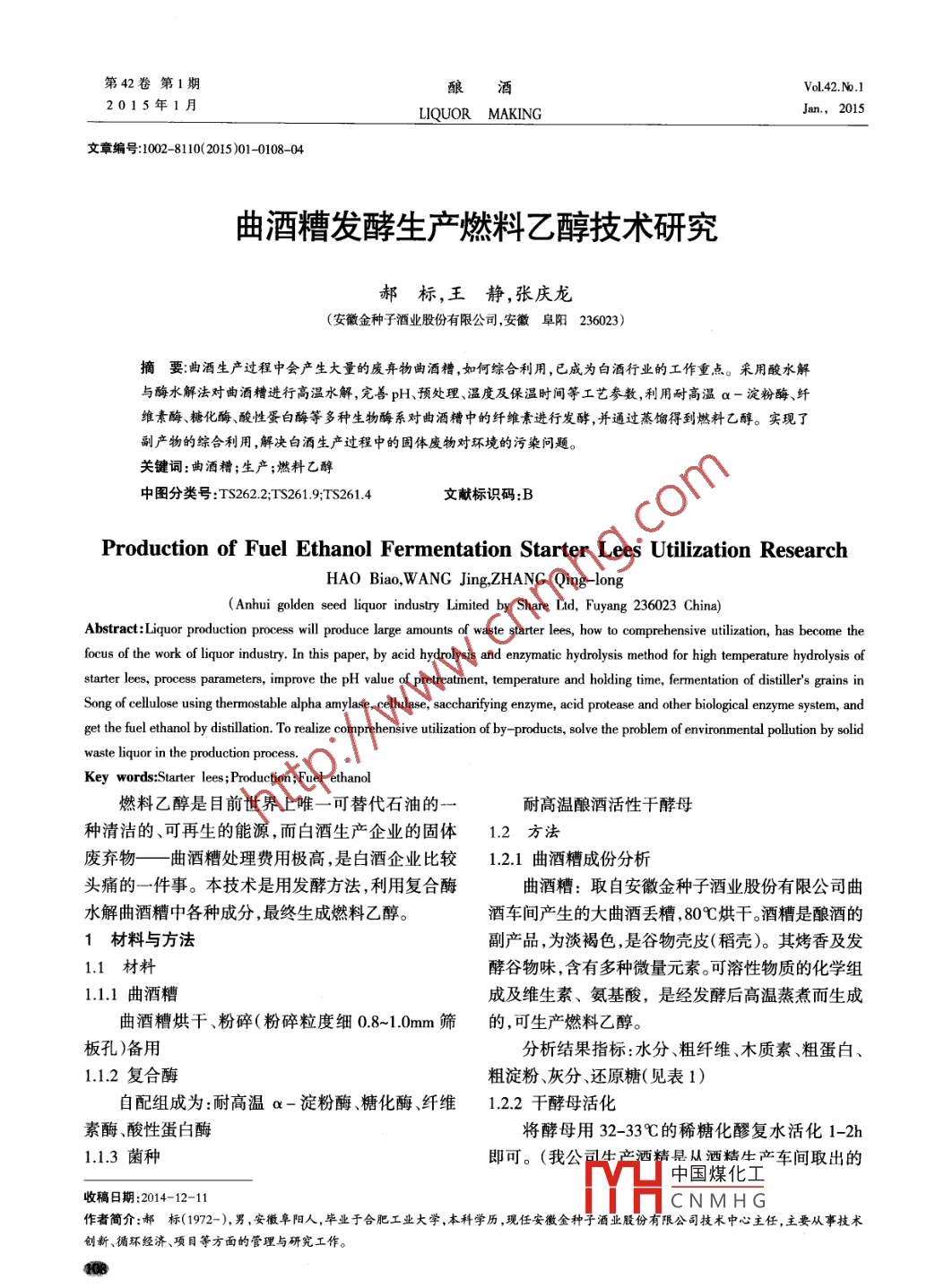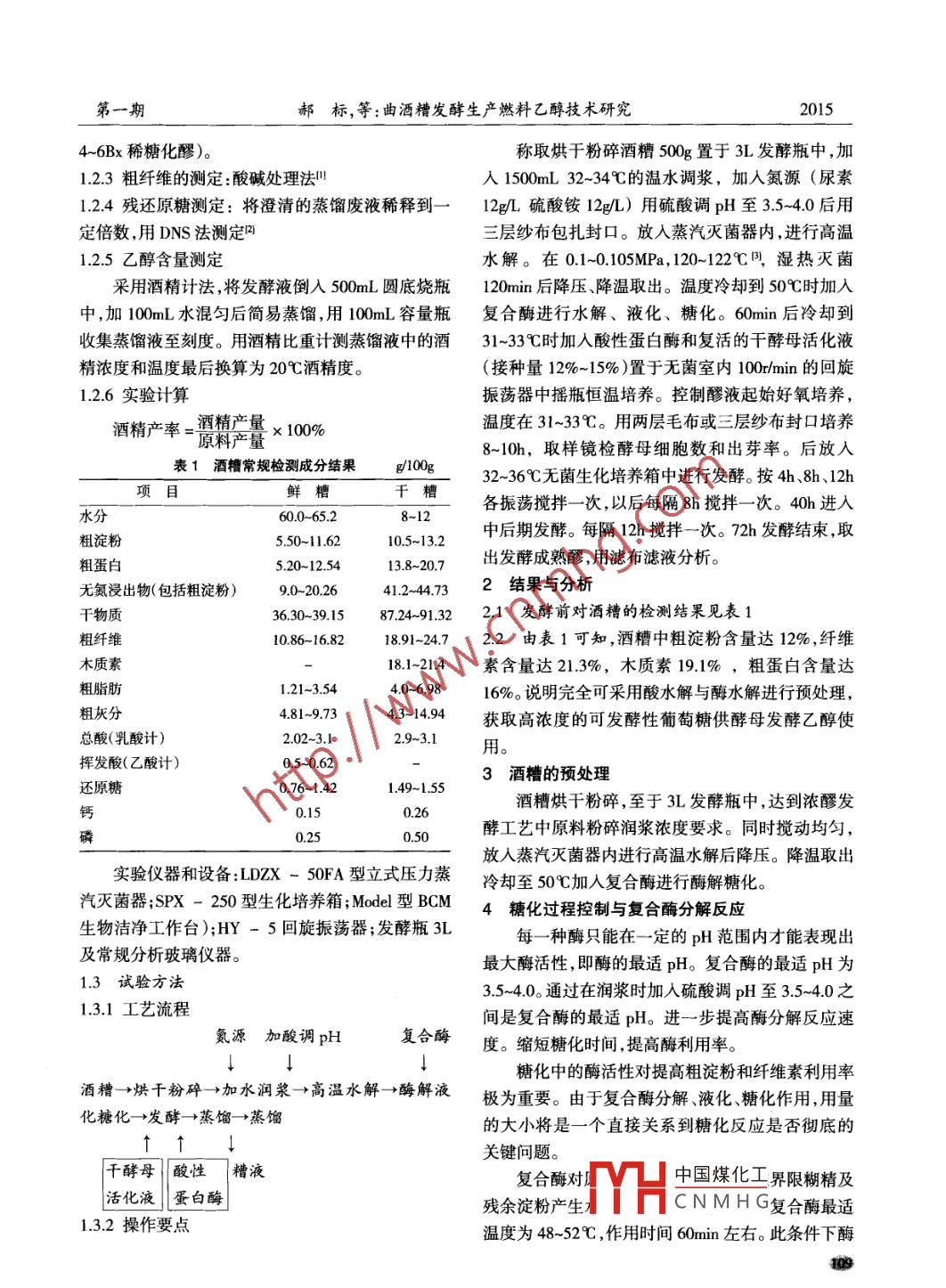 第42卷第1期釀酒vol42.№.12015年1月LIQUOR MAKINGJan.,2015文章編號1002-8110(2015)01-0108-04曲酒糟發(fā)酵生產(chǎn)燃料乙醇技術(shù)研究郝標(biāo),王靜,張慶龍(安徽金種子酒業(yè)股份有限公司,安徽阜陽236023)摘要曲酒生產(chǎn)過程中會產(chǎn)生大量的廢棄物曲酒糟,如何綜合利用,已成為白酒行業(yè)的工作重點。采用酸水解與酶水解法對曲酒糟進行高溫水解,完善pH、預(yù)處理、溫度及保溫時間等工藝參教,利用耐高溫α-淀粉酶、纖維煮酶、糖化酶、酸性蛋白酶等多種生物酶系對曲酒糟中的纖維素進行發(fā)酵,并通過蒸餾得到燃料乙醇。實現(xiàn)了副產(chǎn)物的綜合利用,解決白酒生產(chǎn)過程中的固體廢物對環(huán)境的污染問題關(guān)鍵詞:曲酒糟;生產(chǎn);燃料乙醇中圖分類號:TS2622;TS2619TS2614文獻標(biāo)識碼:BProduction of Fuel Ethanol Fermentation Starter Lees Utilization ResearchHAo Biao, WANG Jing, ZHANG Qing(Anhui golden seed liquor industry Limited by Share Ltd, Fuyang 236023 ChinaAbstract: Liquor production process will produce large amounts of waste starter lees, how to comprehensive utilization, has become thefocus of the work of liquor industry. In this paper, by acid hydrolysis and enzymatic hydrolysis method for high temperature hydrolysis ofstarter lees, process parameters, improve the pH value of pretreatment, temperature and holding time, fermentation of distillers grains inSong of cellulose using thermostable alpha amylase, cellulase, saccharifying enzyme, acid protease and other biological enzyme system, andget the fuel ethanol by distillation. To realize comprehensive utilization of by-products, solve the problem of environmental pollution by solidwaste liquor in the production processKey words: Starter lees; Production; Fuel ethanol燃料乙醇是目前世界上唯一可替代石油的耐高溫釀酒活性干酵母種清潔的、可再生的能源,而白酒生產(chǎn)企業(yè)的固體1.2方法廢棄物——一曲酒糟處理費用極高,是白酒企業(yè)比較1.21曲酒糟成份分析頭痛的一件事。本技術(shù)是用發(fā)酵方法,利用復(fù)合酶曲酒糟:取自安徽金種子酒業(yè)股份有限公司曲水解曲酒糟中各種成分,最終生成燃料乙醇。酒車間產(chǎn)生的大曲酒丟糟,80℃烘干。酒糟是釀酒的1材料與方法副產(chǎn)品,為淡褐色,是谷物殼皮(稻殼)。其烤香及發(fā)1.1材料酵谷物味,含有多種微量元素??扇苄晕镔|(zhì)的化學(xué)組1.1.1曲酒糟成及維生素、氨基酸,是經(jīng)發(fā)酵后高溫蒸煮而生成曲酒糟烘干、粉碎(粉碎粒度細0.8-1.0mm篩的,可生產(chǎn)燃料乙醇。板孔)備用分析結(jié)果指標(biāo):水分、粗纖維、木質(zhì)素、粗蛋白、1.1.2復(fù)合酶粗淀粉、灰分、還原糖(見表1)自配組成為:耐高溫α-淀粉酶、糖化酶、纖維1.2.2千酵母活化素酶酸性蛋白酶將酵母用32-33℃的稀糖化醪復(fù)水活化1-2h1.1.3菌種即可。(我公司生產(chǎn)灑精是叢酒生產(chǎn)車間取出的中國煤化工收稿日期:2014-12-11CNMHG作者簡介:郝標(biāo)(1972-),男,安徽阜陽人,畢業(yè)于合肥工業(yè)大學(xué),本科學(xué)歷,現(xiàn)任安徽金種子酒業(yè)股份有限公司技術(shù)中心主任,主要從事技術(shù)創(chuàng)新、循環(huán)經(jīng)濟、項目等方面的管理與研究工作。第一期郝標(biāo),等:曲酒糟發(fā)酵生產(chǎn)燃料乙醇技術(shù)研究20154-6Bx稀糖化醪)。稱取烘干粉碎酒糟500g置于3L發(fā)酵瓶中,加123粗纖維的測定:酸堿處理法叫入1500mL32-34℃的溫水調(diào)漿,加入氮源(尿素1.24殘還原糖測定:將澄清的蒸餾廢液稀釋到一12g/L硫酸銨12g/L)用硫酸調(diào)pH至3.5-40后用定倍數(shù),用DNS法測定三層紗布包扎封口。放入蒸汽滅菌器內(nèi),進行高溫1.2.5乙醇含量測定水解。在0.1~0.105MPa,120-12℃閂,濕熱滅菌采用酒精計法,將發(fā)酵液倒入500mL圓底燒瓶120min后降壓、降溫取出。溫度冷卻到50℃時加入中,加100mL水混勻后簡易蒸餾,用100mL容量瓶復(fù)合酶進行水解、液化、糖化。60min后冷卻到收集蒸餾液至刻度。用酒精比重計測蒸餾液中的酒31~33℃時加入酸性蛋白酶和復(fù)活的干酵母活化液精濃度和溫度最后換算為20℃酒精度。(接種量12%-15%)置于無菌室內(nèi)100r/min的回旋126實驗計算振蕩器中搖瓶恒溫培養(yǎng)??刂契惨浩鹗己醚跖囵B(yǎng)酒精產(chǎn)率=酒精產(chǎn)量×100%溫度在31~33℃。用兩層毛布或三層紗布封口培養(yǎng)8-10h,取樣鏡檢酵母細胞數(shù)和出芽率。后放入表1酒糟常規(guī)檢測成分結(jié)果g100g32~36℃無菌生化培養(yǎng)箱中進行發(fā)酵。按4h、8h、12h項目水分鮮糟千糟各振蕩攪拌一次,以后每隔8攪拌一次。40h進入60.0-65.28-12粗淀粉5.50~11.62中后期發(fā)酵。每隔12h攪拌一次。72h發(fā)酵結(jié)束,取0.5-13.2粗蛋白5.20-12.5413.8~20.7出發(fā)酵成熟醪,用濾布濾液分析無氮浸出物(包括粗淀粉)90-2026412-44732結(jié)果與分析干物質(zhì)3630-39.587.24913221發(fā)酵前對酒糟的檢測結(jié)果見表1粗纖維10.86-16.821891-2472.2由表1可知,酒糟中粗淀粉含量達12%,纖維木質(zhì)素18.1-214素含量達21.3%,木質(zhì)素191%,粗蛋白含量達粗脂肪1.21~3.5440-6.9816%。說明完全可采用酸水解與酶水解進行預(yù)處理,粗灰分4.81-9.734.3~14.94獲取高濃度的可發(fā)酵性葡萄糖供酵母發(fā)酵乙醇使總酸(乳酸計)2.02-3.129~3.1用揮發(fā)酸(乙酸計)0.5~0.623酒糟的預(yù)處理還原糖0.76~1.42149-1.55鈣0.150.26酒糟烘干粉碎,至于3L發(fā)酵瓶中,達到濃醪發(fā)磷0.250.50酵工藝中原料粉碎潤漿濃度