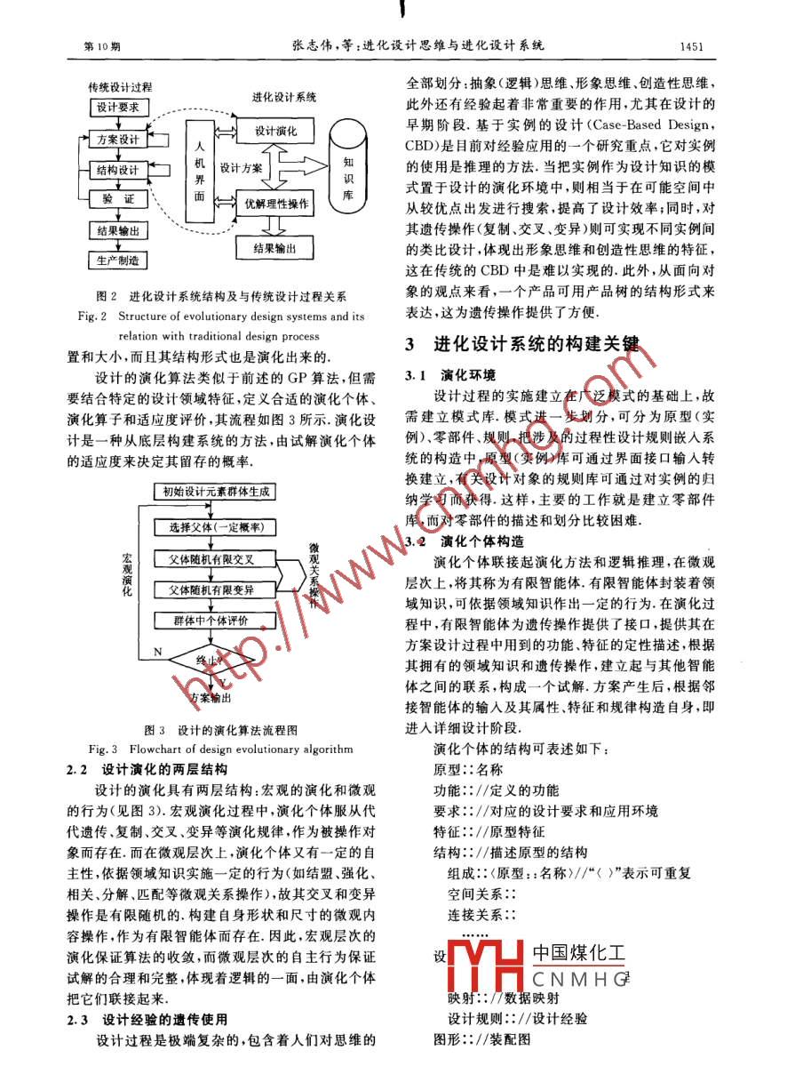 第34卷第10期上海交通大學(xué)學(xué)報(bào)Vol, 34 No. 102000年10月JOURNAL OF SHANGHAI JIAOTONG UNIVERSITYOct. 2000文章編號(hào):1006- 2467(2000)10-1449-04進(jìn)化設(shè)計(jì)思維與進(jìn)化設(shè)計(jì)系統(tǒng)張志偉,葉慶泰,王安麟(.上海交通大學(xué)機(jī)械工程學(xué)院,上海200030)摘要:結(jié)合思維的瞬間達(dá) 爾文進(jìn)化機(jī)制和遺傳程序設(shè)計(jì)的思想,闡述了設(shè)計(jì)思維的進(jìn)化過(guò)程.在.此基礎(chǔ)上,提出了進(jìn)化設(shè)計(jì)系統(tǒng)的結(jié)構(gòu),并對(duì)其特征和構(gòu)建關(guān)鍵進(jìn)行了分析.設(shè)計(jì)是復(fù)雜而富創(chuàng)造性的活動(dòng),是演化方法和邏輯推理的結(jié)合,一方面體現(xiàn)出設(shè)計(jì)思維的諸多特征;另一方西為形象思維和創(chuàng)造性思維的計(jì)算機(jī)實(shí)現(xiàn)提供了一定程度上的可能性,拓展了設(shè)計(jì)方法學(xué)和設(shè)計(jì)自動(dòng)化的研究思路.關(guān)鍵詞:進(jìn)化設(shè)計(jì);有限智能體;設(shè)計(jì)方法學(xué);設(shè)計(jì)自動(dòng)化;遺傳程序設(shè)計(jì)中圖分類(lèi)號(hào):TH 122; TP 17; TP 391.72文獻(xiàn)標(biāo)識(shí)碼:AThought and Systems of Evolutionary DesignZHANG Zhi-wei, YE Qing-tai,WANG An-lin(School of Mechanical Eng.,Shanghai Jiaotong Univ.,Shanghai 200030, China)Abstract: Combined with the instant Darwin evolution mechanism of thought and the meaning of geneticprogramming, the evolution process of design thought was represented. Based on the process, the struc-ture of evolutionary design systems was proposed, and the properties and the key points of evolutionarysystem's building were analyzed. Design is an action which is very complex and rich of creativity. Thecombination of evolutionary method and logic reasoning emerges many properties of design thought on onehand, and provides possibility to some extent for the realization of image thought and creativity thought onthe other hand. It is a new access to the research of design methodology and design automation.Key words: evolutionary design; agents limited ; design methodology; design automation; genetic pro-gramming設(shè)計(jì)模型,如功能-結(jié)構(gòu)模型、功能-行為-狀態(tài)困難.模型、功能-行為-結(jié)構(gòu)模型和公理設(shè)計(jì)模型等1[.2],近來(lái)的設(shè)計(jì)方法學(xué)研究中,另一種趨勢(shì)是對(duì)非側(cè)重于研究設(shè)計(jì)知識(shí)的使用過(guò)程,試圖找到設(shè)計(jì)過(guò)邏輯方法的廣泛研究,其中演化方法越來(lái)越得到研程中隱含的邏輯關(guān)系,其設(shè)計(jì)類(lèi)型是自上而下的方究者們的重視[”.不同于純粹邏輯推理方法的設(shè)計(jì)法.在上述設(shè)計(jì)模型中,功能、行為、結(jié)構(gòu)之間的映射過(guò)程的實(shí)施是推理的展開(kāi),在演化設(shè)計(jì)過(guò)程中演化關(guān)系,可應(yīng)用搜索技術(shù)來(lái)解決,但模型的實(shí)現(xiàn)以功個(gè)體 的組合具有某種程度上的隨機(jī)性,通過(guò)自然選能、行為和結(jié)構(gòu)的完整存在集為基礎(chǔ).但是,在設(shè)計(jì)擇,最后得到相應(yīng)于設(shè)計(jì)要求的優(yōu)解.在演化設(shè)計(jì)過(guò)開(kāi)始時(shí)功能、行為集定義不良,它們?cè)谠O(shè)計(jì)過(guò)程中根程中,.中國(guó)煤化工設(shè)計(jì)要求的試據(jù)設(shè)計(jì)要求和現(xiàn)有的狀態(tài)(結(jié)構(gòu))動(dòng)態(tài)衍生,這個(gè)根解,通H三個(gè)設(shè)計(jì)空間,這本性的問(wèn)題使這種單純邏輯方向研究遇到了很大的.CN M H G于結(jié)構(gòu)組合的無(wú)限多樣性,單純的演化方法有收斂慢和無(wú)法在功.收稿日期:1999-07-12能、行為層面上進(jìn)行有效評(píng)價(jià)的困難,因此需要演化作者簡(jiǎn)介:張志偉(1971~),男,博士生.方法和邏輯方法的有機(jī)結(jié)合.第10期張志偉,等:進(jìn)化設(shè)計(jì)思維與進(jìn)化設(shè)計(jì)系統(tǒng)1451傳統(tǒng)設(shè)計(jì)過(guò)程全部劃分:抽象(邏輯)思維、形象思維、創(chuàng)造性思維,進(jìn)化設(shè)計(jì)系統(tǒng)「設(shè)計(jì)要求此外還有經(jīng)驗(yàn)起著非常重要的作用,尤其在設(shè)計(jì)的.早期階段.基于實(shí)例的設(shè)計(jì)(Case Based Design,方案設(shè)計(jì)上口設(shè)計(jì)演化CBD)是目前對(duì)經(jīng)驗(yàn)應(yīng)用的一個(gè)研究重點(diǎn),它對(duì)實(shí)例[結(jié)構(gòu)設(shè)計(jì)8設(shè)計(jì)方案知的使用是推理的方法.當(dāng)把實(shí)例作為設(shè)計(jì)知識(shí)的模+驗(yàn)證庫(kù)識(shí)式置于設(shè)計(jì)的演化環(huán)境中,則相當(dāng)于在可能空間中優(yōu)解理性操作從較優(yōu)點(diǎn)出發(fā)進(jìn)行搜索,提高了設(shè)計(jì)效率;同時(shí),對(duì)[結(jié)果輸出]其遺傳操作(復(fù)制、交叉、變異)則可實(shí)現(xiàn)不同實(shí)例間結(jié)果輸出的類(lèi)比設(shè)計(jì),體現(xiàn)出形象思維和創(chuàng)造性思維的特征,[生產(chǎn)制造這在傳統(tǒng)的CBD中是難以實(shí)現(xiàn)的.此外,從面向?qū)D2 進(jìn)化設(shè)計(jì)系統(tǒng)結(jié)構(gòu)及與傳統(tǒng)設(shè)計(jì)過(guò)程關(guān)系象的觀點(diǎn)來(lái)看,一個(gè)產(chǎn)品可用產(chǎn)品樹(shù)的結(jié)構(gòu)形式來(lái)Fig.2 Structure of evolutionary design systems and its表達(dá),這為遺傳操作提供了方便.relation with traditional design process置和大小,而且其結(j