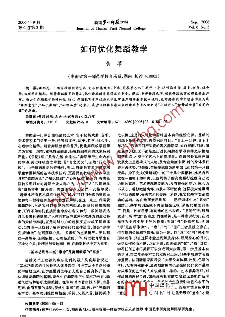 2006年9月湖南第一師花學(xué)報Sep. 2006第6卷第3期Joumal of Hunan First Normal CollegeVoL6 No. 3如何優(yōu)化舞蹈教學(xué)黃葶(湖南省第-師范學(xué)校音樂系,湖南長沙410002)摘要:舞蹈是一門綜合性很強(qiáng)的藝術(shù),它不僅集戲曲、音樂、美術(shù)等藝術(shù)門類于一身 ,還吸取文學(xué)、歷史、哲學(xué)、社會.學(xué)、心理學(xué)之精華。隨著舞蹈教育的普及,優(yōu)化舞蹈教學(xué)顯得尤為重要。現(xiàn)在,重視舞蹈表演,輕視舞蹈教育的現(xiàn)象特別嚴(yán)重。而由于舞蹈教學(xué)的特殊性,所以,舞蹈教育者不僅要求學(xué)生掌握舞蹈的基本技術(shù)技巧,更需要在教學(xué)中培養(yǎng)學(xué)生具有“舞蹈意念”、“知識舞蹈”、“心理品質(zhì)”的意識,有責(zé)任扭轉(zhuǎn)長期以來對舞蹈專業(yè)人稱之為“小腦巨人”和舞蹈欣賞“曲高和寡"的局面。關(guān)鍵詞:舞蹈訓(xùn)練;意念;知識舞蹈;心理品質(zhì)中圖分類號:J712.2文獻(xiàn)標(biāo)識碼:A文章編號:1671 -4369(2006)03 -0150 -02舞蹈是--門綜合性很強(qiáng)的藝術(shù),它不僅集戲曲、音樂、之以恒,這是前人對勤學(xué)苦練基本功的經(jīng)驗之談?;A(chǔ)的美術(shù)等藝術(shù)門類于一身,還吸取文學(xué)、歷史、哲學(xué)、社會學(xué)、訓(xùn)練不是朝夕之功,需要積以時日?!芭_上- -分鐘,臺下十心理學(xué)之精華。隨著舞蹈教育的普及,優(yōu)化舞蹈教學(xué)顯得年功”??v觀我們所知曉的著名舞蹈家,如白淑湘、劉敏、黃尤為重要?,F(xiàn)在,重視舞蹈表演,輕視舞蹈教育的現(xiàn)象特別豆豆等,他們無不都是經(jīng)歷過長期勤奮學(xué)習(xí)和持之以恒地嚴(yán)重。<樂記》載,“ 凡音之起,由生也?!蔽璧冈从谏鼉?nèi)在刻苦訓(xùn)練,才獲得了藝術(shù)上的高境界。白淑湘是我國芭蕾的沖動,需以呼吸意念承載,若”言之無文”,必然“行之不發(fā)展史上里程碑式的人物,從專業(yè)角度來看,她的身體條件遠(yuǎn)”。由于舞蹈教學(xué)的特殊性,所以,舞蹈教育者不僅要求并杯占優(yōu)勢,但勤奮、苦練使她成為新中國飛起的第- -只白學(xué)生掌握舞蹈的基本技術(shù)技巧,更需要在教學(xué)中培養(yǎng)學(xué)生天鵝。為了完成<天鵝湖》中的三十幾個揮鞭轉(zhuǎn),她把自己具有“舞蹈意念”、“知識舞蹈”、“心理品質(zhì)"的意識,有責(zé)任放在 一圈椅子的中央,以圓周椅子的高度強(qiáng)行控制自己動扭轉(zhuǎn)長期以來對舞蹈專業(yè)人稱之為“小腦巨人”和舞蹈欣力腿的高度。藝術(shù)表現(xiàn)需要能力,沒有較強(qiáng)的能力,就會力賞“曲高和寡”的局面。美國著名詩人保羅. 安格爾說:不從心。 看似激情滿懷,四肢卻不聽使喚,這樣極大地阻礙“舞蹈比所有藝術(shù)都有優(yōu)越的手段,它可以用全部的微觀血了作品的表現(xiàn),失去藝術(shù)的美感。所以,扎實(shí)的基本功是成管和每一根神經(jīng)和全部的智慧在舞蹈,在這一點(diǎn)上,我是羨功的基礎(chǔ)。若在地面素質(zhì)訓(xùn)練一把桿訓(xùn)練中 與“意念”慕舞蹈的,雖然我可以用我的筆來想象,用我的思想來想相結(jié)合,基本功訓(xùn)練就不再是枯燥無味、呆板的重復(fù)訓(xùn)練象,可我不如你們直接用生命身心名義和每一根神 經(jīng)表達(dá)了,而是一種有思想、有韻味的藝術(shù)表現(xiàn)?!耙怆S氣行,形隨自己要表達(dá)的情感。”人體具有反應(yīng)脈沖和推進(jìn)力的激動特意動" ,所謂“意"指意念、內(nèi)在精神,是一種意識行為,在動點(diǎn)的天然節(jié)奏欲,正是對脈沖力的起伏反應(yīng)構(gòu)成了舞蹈律作行為中起支配主導(dǎo)的作用;所謂“氣"是指氣息;所謂動,當(dāng)舞者一旦找到了解譯它密碼的肢體語言,便會“窮神“形”是指形體動作?!耙狻?、“氣”、“形"三者雖獨(dú)立存在,變洌幽微" ,達(dá)到蕩滌心靈,一片澄明的空靈境界。要達(dá)到但在舞蹈必須相互依托結(jié)為一體。以“意"和“氣”引導(dǎo)這一高境界,必須依賴于心理品質(zhì)的升華,所以教育學(xué)生自形體動作,只有這樣才能達(dá)到解放身體、舒展身心的目的,我凈化心靈,讓精神與天地同往來,在舞蹈教學(xué)中更為重要。做到動作松而不懈,力而不僵,真正做到“收”、‘‘放"自如。-、基本功訓(xùn)練中的“意念”是舞蹈教學(xué)的“亮點(diǎn)"學(xué)習(xí)任何藝術(shù)門類都可以分成兩大步驟,第- 步是基本功的學(xué)習(xí),第二步是基本功的發(fā)揮和運(yùn)用,但基本功的學(xué)習(xí)最俗話說:“工欲善其事必先利其器。”吳曉邦曾說過:為重要。法國雕塑家羅丹說:“如果沒有體積、比例、色彩的“基本功訓(xùn)練的目的是把人體各部位,各關(guān)節(jié)從不自然和僵學(xué)問,沒有靈敏的手,最強(qiáng)烈的感情也是癱瘓的!'這個道理化中解放出來,讓學(xué)生懂得怎樣去支配自己的身體?!被緦氖氯魏嗡囆g(shù)的人來說都是一樣的。 藝術(shù)修養(yǎng)再好,對功訓(xùn)練是舞蹈的基礎(chǔ),是學(xué)生在舞蹈學(xué)習(xí)中基本功強(qiáng)化、舞作品情感理解再透,如果沒有扎實(shí)的功底就無法把作品應(yīng)蹈氣質(zhì)與舞姿形成的關(guān)鍵。在訓(xùn)練時本著由淺人深、由易有的者從寧直接影響藝術(shù)水平的到難、由簡至繁的原則,使學(xué)生掌握“直繃、軟、開"等舞蹈高低Y中國煤化工