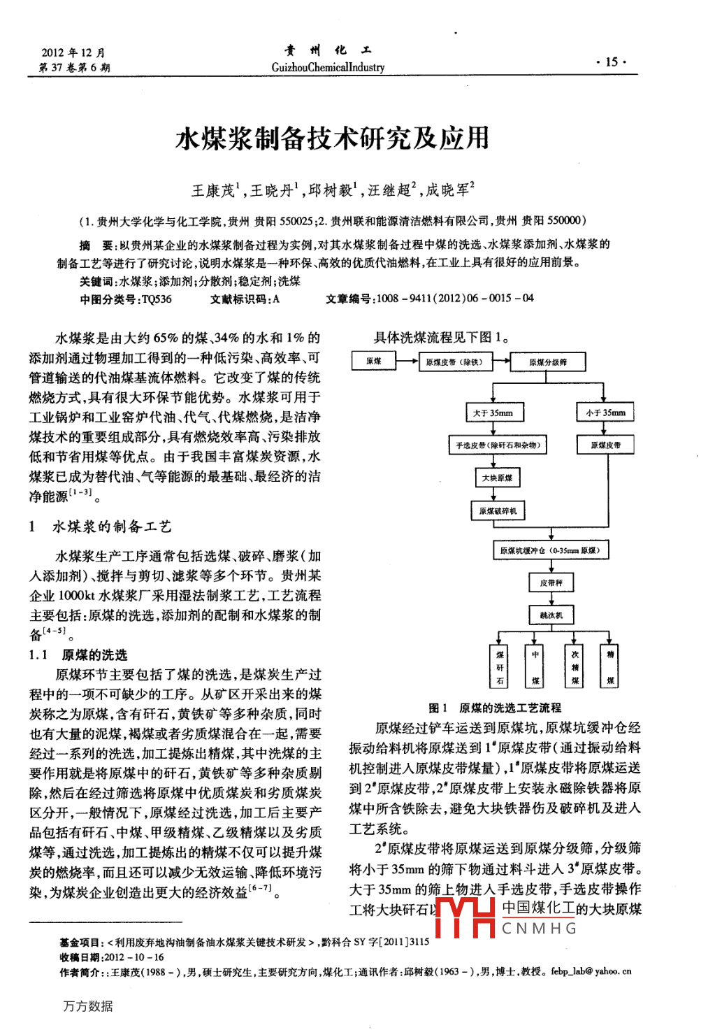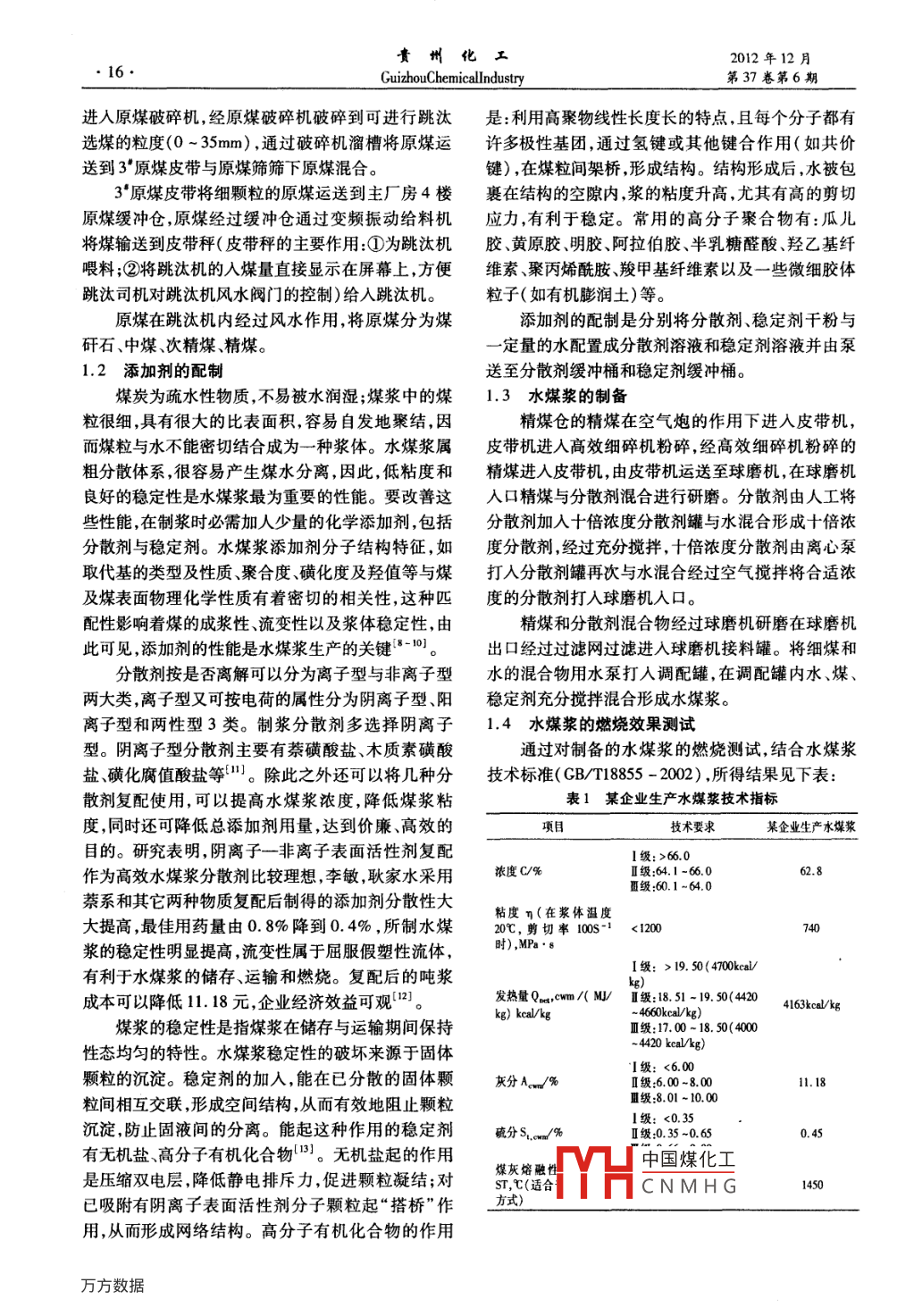 2012年12月貴州化工第37卷第6期GuizhouChemicalIndustry15水煤漿制備技術(shù)研究及應(yīng)用王康茂',王曉丹1,邱樹毅1,汪繼超2,成曉軍2(1.貴州大學(xué)化學(xué)與化工學(xué)院,貴州貴陽55005;2.貴州聯(lián)和能源清潔燃料有限公司,貴州貴陽55000摘要:以貴州某企業(yè)的水煤漿制備過程為實(shí)例對(duì)其水煤漿制備過程中煤的洗選、水煤漿添加劑、水煤漿的制備工藝等進(jìn)行了研究討論,說明水煤漿是一種環(huán)保高效的優(yōu)質(zhì)代油燃料在工業(yè)上具有很好的應(yīng)用前景。關(guān)鍵詞:水煤漿;添加劑;分散劑;穩(wěn)定劑;洗煤中圖分類號(hào):TQ536文獻(xiàn)標(biāo)識(shí)碼:A文章編號(hào):1008-9411(2012)06-0015-04水煤漿是由大約65%的煤34%的水和1%的具體洗煤流程見下圖1添加劑通過物理加工得到的一種低污染、高效率、可煤原煤皮帶(除鐵原煤分級(jí)箭管道輸送的代油煤基流體燃料。它改變了煤的傳統(tǒng)燃燒方式,具有很大環(huán)保節(jié)能優(yōu)勢(shì)。水煤漿可用于工業(yè)鍋爐和工業(yè)窯爐代油、代氣、代煤燃燒,是潔凈大于35mm小于35mm煤技術(shù)的重要組成部分,具有燃燒效率高、污染排放手選皮帶(除矸石和雜物原煤皮帶低和節(jié)省用煤等優(yōu)點(diǎn)。由于我國(guó)豐富煤炭資源,水煤漿已成為替代油、氣等能源的最基礎(chǔ)、最經(jīng)濟(jì)的潔大塊原煤凈能源(1-3原煤破碎機(jī)水煤漿的制備工藝水煤漿生產(chǎn)工序通常包括選煤、破碎、磨漿(加原煤坑緩沖倉(cāng)(035mm原煤入添加劑)、攪拌與剪切、濾漿等多個(gè)環(huán)節(jié)。貴州某皮帶秤企業(yè)1000kt水煤漿廠釆用濕法制漿工藝,工藝流程主要包括:原煤的洗選,添加劑的配制和水煤漿的制跳汰機(jī)備1.1原煤的洗選原煤環(huán)節(jié)主要包括了煤的洗選,是煤炭生產(chǎn)過矸程中的一項(xiàng)不可缺少的工序。從礦區(qū)開采出來的煤炭稱之為原煤,含有矸石,黃鐵礦等多種雜質(zhì),同時(shí)圖1原煤的洗選工藝流程也有大量的泥煤,褐煤或者劣質(zhì)煤混合在一起,需要原煤經(jīng)過鏟車運(yùn)送到原煤坑,原煤坑緩沖倉(cāng)經(jīng)經(jīng)過一系列的洗選加工提煉出精煤其中洗煤的主振動(dòng)給料機(jī)將原煤送到1原煤皮帶(通過振動(dòng)給料要作用就是將原煤中的矸石,黃鐵礦等多種雜質(zhì)剔機(jī)控制進(jìn)入原煤皮帶煤量),原媒皮帶將原媒運(yùn)送除,然后在經(jīng)過篩選將原煤中優(yōu)質(zhì)煤炭和劣質(zhì)煤炭到2“原煤皮帶,2原煤皮帶上安裝永磁除鐵器將原區(qū)分開,一般情況下,原煤經(jīng)過洗選加工后主要產(chǎn)煤中所含鐵除去避免大塊鐵器傷及破碎機(jī)及進(jìn)入品包括有矸石、中煤、甲級(jí)精煤、乙級(jí)精煤以及劣質(zhì)工藝系統(tǒng)。煤等,通過洗選,加工提煉出的精煤不僅可以提升煤2原煤皮帶將原煤運(yùn)送到原煤分級(jí)篩,分級(jí)篩炭的燃燒率,而且還可以減少無效運(yùn)輸、降低環(huán)境污將小于35mm的篩下物通過料斗進(jìn)人3原煤皮帶染,為煤炭企業(yè)創(chuàng)造出更大的經(jīng)濟(jì)效益6。大于35mm的篩上物進(jìn)入手選皮帶,手選皮帶操作工將大塊矸石以中國(guó)煤化工的大塊原煤CNMHG基金項(xiàng)目:<利用廢棄地溝油制備油水煤漿關(guān)鍵技術(shù)研發(fā)>,黔科合SY字[2013115收稿日期:2012-10-16作者簡(jiǎn)介∷王康茂(1988-),男,碩士研究生,主要研究方向煤化工;通訊作者:邱樹毅(1963-),男博士,教授。 ebp _lab@ yahoo貴州化工2012年12月16·Guizhou ChemicallInd第37卷第6期進(jìn)人原煤破碎機(jī),經(jīng)原煤破碎機(jī)破碎到可進(jìn)行跳汰是:利用高聚物線性長(zhǎng)度長(zhǎng)的特點(diǎn),且每個(gè)分子都有選煤的粒度(0~35mm),通過破碎機(jī)溜槽將原煤運(yùn)許多極性基團(tuán),通過氫鍵或其他鍵合作用(如共價(jià)送到3·原煤皮帶與原煤篩篩下原煤混合鍵),在煤粒間架橋,形成結(jié)構(gòu)。結(jié)構(gòu)形成后,水被包3·原煤皮帶將細(xì)顆粒的原煤運(yùn)送到主廠房4樓裹在結(jié)構(gòu)的空隙內(nèi),漿的粘度升高,尤其有高的剪切原煤緩沖倉(cāng),原煤經(jīng)過緩沖倉(cāng)通過變頻振動(dòng)紿料機(jī)應(yīng)力,有利于穩(wěn)定。常用的高分子聚合物有:瓜兒將煤輸送到皮帶秤(皮帶秤的主要作用:①為跳汰機(jī)膠、黃原膠、明膠、阿拉伯膠、半乳糖醛酸、羥乙基纖喂料;②將跳汰機(jī)的入煤量直接顯示在屏幕上,方便維素、聚丙烯酰胺、羧甲基纖維素以及一些微細(xì)膠體跳汰司機(jī)對(duì)跳汰機(jī)風(fēng)水閥門的控制)紿入跳汰機(jī)。粒子(如有機(jī)膨潤(rùn)土)等。原煤在跳汰機(jī)內(nèi)經(jīng)過風(fēng)水作用,將原煤分為煤添加劑的配制是分別將分散劑、穩(wěn)定劑干粉與矸石、中煤、次精煤、精煤。定量的水配置成分散劑溶液和穩(wěn)定劑溶液并由泵1.2添加劑的配制送至分散劑緩沖桶和穩(wěn)定劑緩沖桶煤炭為疏水性物質(zhì),不易被水潤(rùn)濕;煤漿中的煤1.3水煤漿的制備粒很細(xì),具有很大的比表面積,容易自發(fā)地聚結(jié),因精煤倉(cāng)的精煤在空氣炮的作用下進(jìn)入皮帶機(jī),而煤粒與水不能密切結(jié)合成為一種漿體。水煤漿屬皮帶機(jī)進(jìn)入高效細(xì)碎機(jī)粉碎,經(jīng)高效細(xì)碎機(jī)粉碎的粗分散體系,很容易產(chǎn)生煤水分離,因此,低粘度和精