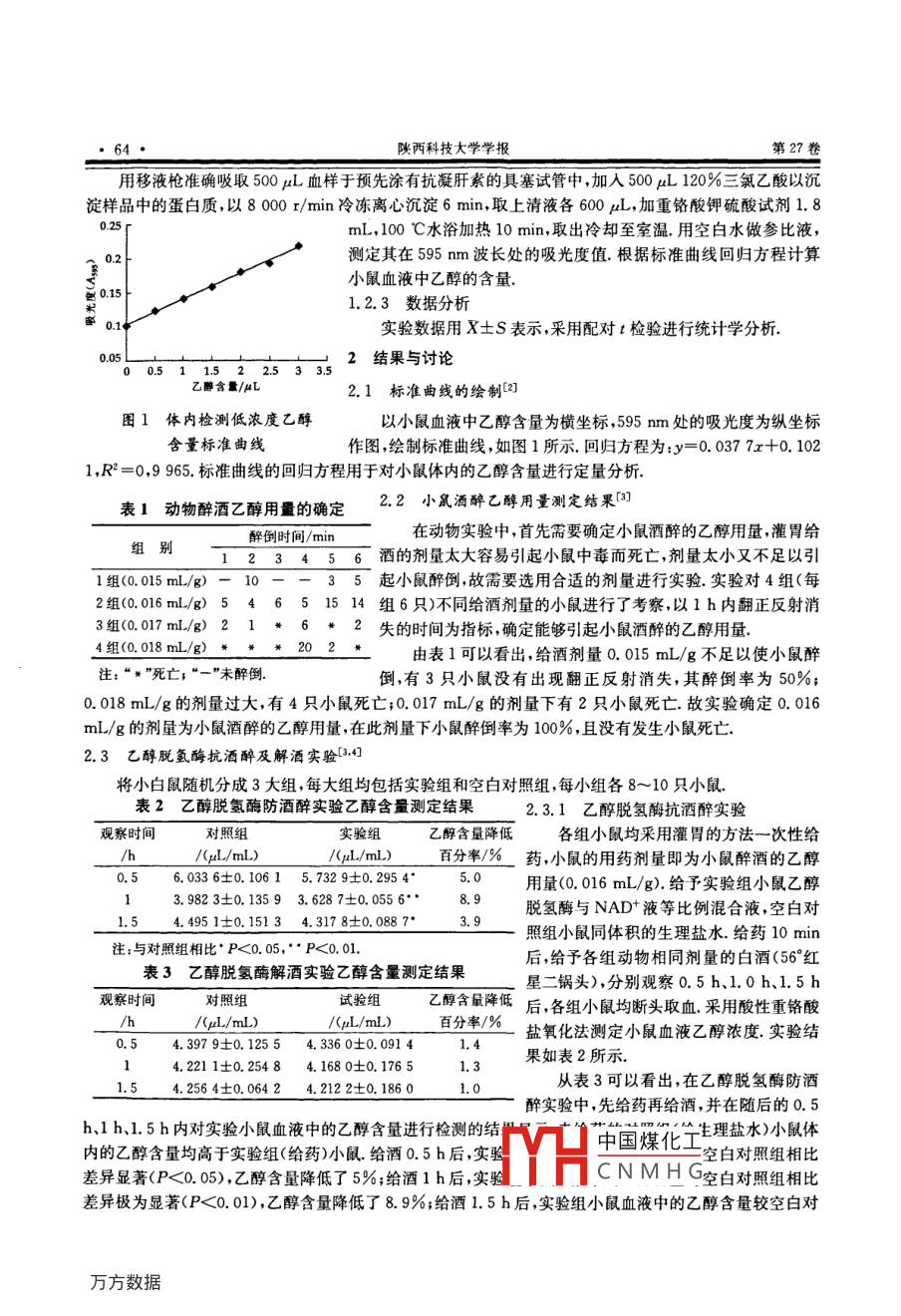 陜西科技大學(xué)學(xué)報(bào)Aug.2009JOURNAL OF SHAANXI UNIVERSITY OF SCIENCE & TECHNOLOGY文章編號(hào):1000-5811(2009)04006303乙醇脫氫酶對(duì)小鼠抗醉解酒作用的研究毛跟年,李麗維,齊鳳,張曉霞(陜西科技大學(xué)生命科學(xué)與工程學(xué)院,陜西西安710021)摘要:通過抗醉和解酒兩項(xiàng)實(shí)驗(yàn),觀察了乙醇脫氨酶直接作為解酒藥物的抗醉酒及解酒作用.結(jié)果顯示,乙醇脫氬酶在防酒醉試驗(yàn)中的作用效果比較明顯,尤其是在給酒后1h,小鼠血液中乙酵含量降低最明昰,而對(duì)巳經(jīng)處于酒醉狀態(tài)的小鼠的解酒作用效果并不明顯.關(guān)鍵詞:乙醇脫氫酶;抗醉酒;解酒中圖分類號(hào):Q554+,9文獻(xiàn)標(biāo)識(shí)碼:A0引言乙醇脫氫酶( alcohol dehydrogenases,簡(jiǎn)稱ADH)是廣泛專一性的含鋅金屬酶,以NADH為輔酶,催化伯醇和醛之間的可逆反應(yīng).乙醇脫氫酶在人體內(nèi)主要分布于胃壁和肝臟細(xì)胞中,在乙醇代謝中發(fā)揮著重要作用.近年來國(guó)內(nèi)外的研究表明,飲酒后有部分乙醇既未進(jìn)入血液循環(huán),也未潴留在消化道內(nèi),而是在胃內(nèi)被氧化代謝這一現(xiàn)象被稱為乙醇的第一關(guān)卡代謝( First-pass metabolism of ethano).胃乙醇脫氡酶是參與這一代謝的主要酶.胃內(nèi)這一代謝可調(diào)節(jié)乙醇的生物利用度,進(jìn)而影響乙醇對(duì)肝臟及機(jī)體的毒性作用如果在胃內(nèi)可以加強(qiáng)乙醇的分解,就可以防止其進(jìn)入胃壁細(xì)胞以及肝臟細(xì)胞中,從而達(dá)到保護(hù)胃粘膜和肝臟的功效,同時(shí)也可以防止乙醇及乙醛進(jìn)入血液循環(huán),損壞人體的神經(jīng)系統(tǒng),造成其他的毒副作用1材料與方法1.1實(shí)驗(yàn)材料(1)ADH酶液:自制;胃蛋白酶、胰蛋白酶和輔酶: sigma公司;56°北京紅星二鍋頭:北京紅星股份有限公司;其他化學(xué)試劑均為國(guó)產(chǎn)分析純(2)昆明種小鼠體重(20士2)g,雌雄各半西安交通大學(xué)醫(yī)學(xué)院實(shí)驗(yàn)動(dòng)物中心提供,小鼠按常規(guī)方式飼養(yǎng)一周,挑選健康正常者,隨機(jī)分組.實(shí)驗(yàn)前禁食12h,自由飲水(3)紫外可見分光光度計(jì)(北京瑞利分析儀器廠);臺(tái)式超速離心機(jī)(上海安亭科學(xué)儀器廠);微量移液槍( Gilson, france);超級(jí)恒溫器(重慶試驗(yàn)設(shè)備廠);冰箱等.1.2實(shí)驗(yàn)方法1.2.1酸性重鉻酸鹽氧化法用涂有肝素的離心管接取新鮮小鼠的血6份,每份取500山L,用微量進(jìn)樣器按0、0.5、1、1.5、2、2.5、3pL系列添加50%的乙醇分別加入500L120%三氯乙酸沉淀蛋白,以8000r/min冷凍離心沉淀6min,取上清液各600HL,加重鉻酸鉀硫酸試劑1.8mL,100℃水浴加熱10min,取出冷卻至室溫.用空白水做參比液,測(cè)其在595nm處的吸光度值1.2.2血液中乙醇濃度的檢測(cè)中國(guó)煤化工收稿日期:2009-05-04CNMHG作者簡(jiǎn)介:毛跟年(1962-),男陜西省涇陽縣人,教授,研究方向:生物藥物材料研究與應(yīng)用基金項(xiàng)目:陜西省自然科學(xué)基金項(xiàng)目(SJo8B18)、陜西省教育廳專項(xiàng)科研計(jì)劃項(xiàng)目(編號(hào)08JK236)陜西科技大學(xué)學(xué)報(bào)第27卷用移液槍準(zhǔn)確吸取500L血樣于預(yù)先涂有抗凝肝素的具塞試管中,加入500山L120%三氯乙酸以沉淀樣品中的蛋白質(zhì),以8000r/min冷凍離心沉淀6min,取上清液各600L,加重鉻酸鉀硫酸試劑1.8mL,100℃水浴加熱10min,取出冷卻至室溫.用空白水做參比液測(cè)定其在595nm波長(zhǎng)處的吸光度值.根據(jù)標(biāo)準(zhǔn)曲線回歸方程計(jì)算小鼠血液中乙醇的含量1.2.3數(shù)據(jù)分析實(shí)驗(yàn)數(shù)據(jù)用X士S表示,采用配對(duì)t檢驗(yàn)進(jìn)行統(tǒng)計(jì)學(xué)分析2結(jié)果與討論00.5152乙醇含量/HL2.1標(biāo)準(zhǔn)曲線的繪制2圖1體內(nèi)檢測(cè)低濃度乙醇以小鼠血液中乙醇含量為橫坐標(biāo),595nm處的吸光度為縱坐標(biāo)含量標(biāo)準(zhǔn)曲線作圖繪制標(biāo)準(zhǔn)曲線,如圖1所示回歸方程為:y=0.0377x+0.1021,R2=0,9965.標(biāo)準(zhǔn)曲線的回歸方程用于對(duì)小鼠體內(nèi)的乙醇含量進(jìn)行定量分析表1動(dòng)物醉酒乙醇用量的確定22小鼠酒醉乙醇用量測(cè)定結(jié)果1醉倒時(shí)間/min在動(dòng)物實(shí)驗(yàn)中,首先需要確定小鼠酒醉的乙醇用量,灌胃給組別酒的劑量太大容易引起小鼠中毒而死亡,劑量太小又不足以引1組(0.015mL/g)-10起小鼠醉倒,故需要選用合適的劑量進(jìn)行實(shí)驗(yàn)實(shí)驗(yàn)對(duì)4組(每2組(0.016mL/g)54651514組6只)不同給酒劑量的小鼠進(jìn)行了考察,以1h內(nèi)翻正反射消3組(0.017mL/g)21失的時(shí)間為指標(biāo),確定能夠引起小鼠酒醉的乙醇用量4組(0.018mL/g)由表1可以看出,給酒劑量0.015mL/g不足以使小鼠醉注:“*”死亡;“一”未醉倒倒,有3只小鼠沒有出現(xiàn)翻正反射消失,其醉倒率為50%;0.018mL/g的劑量過大,有4只小鼠死亡;0.017mL/g的劑量下有2只小鼠死亡.故實(shí)驗(yàn)確定0.016mL/g的劑量為小鼠酒醉的乙醇用量,在此劑量下小鼠醉倒率為100%,且沒有發(fā)生小鼠死亡2.3乙醇脫氫酶抗酒醉及解酒實(shí)驗(yàn)3將小白鼠隨機(jī)分成3大組,每大組均包括實(shí)驗(yàn)組和空白對(duì)照組,每小組各8~10只小鼠表2乙醇脫氫酶防酒醉實(shí)驗(yàn)乙醇含量測(cè)定結(jié)果2.3.1乙醇脫氫酶抗酒醉實(shí)驗(yàn)觀察時(shí)間對(duì)照組實(shí)驗(yàn)組乙醇