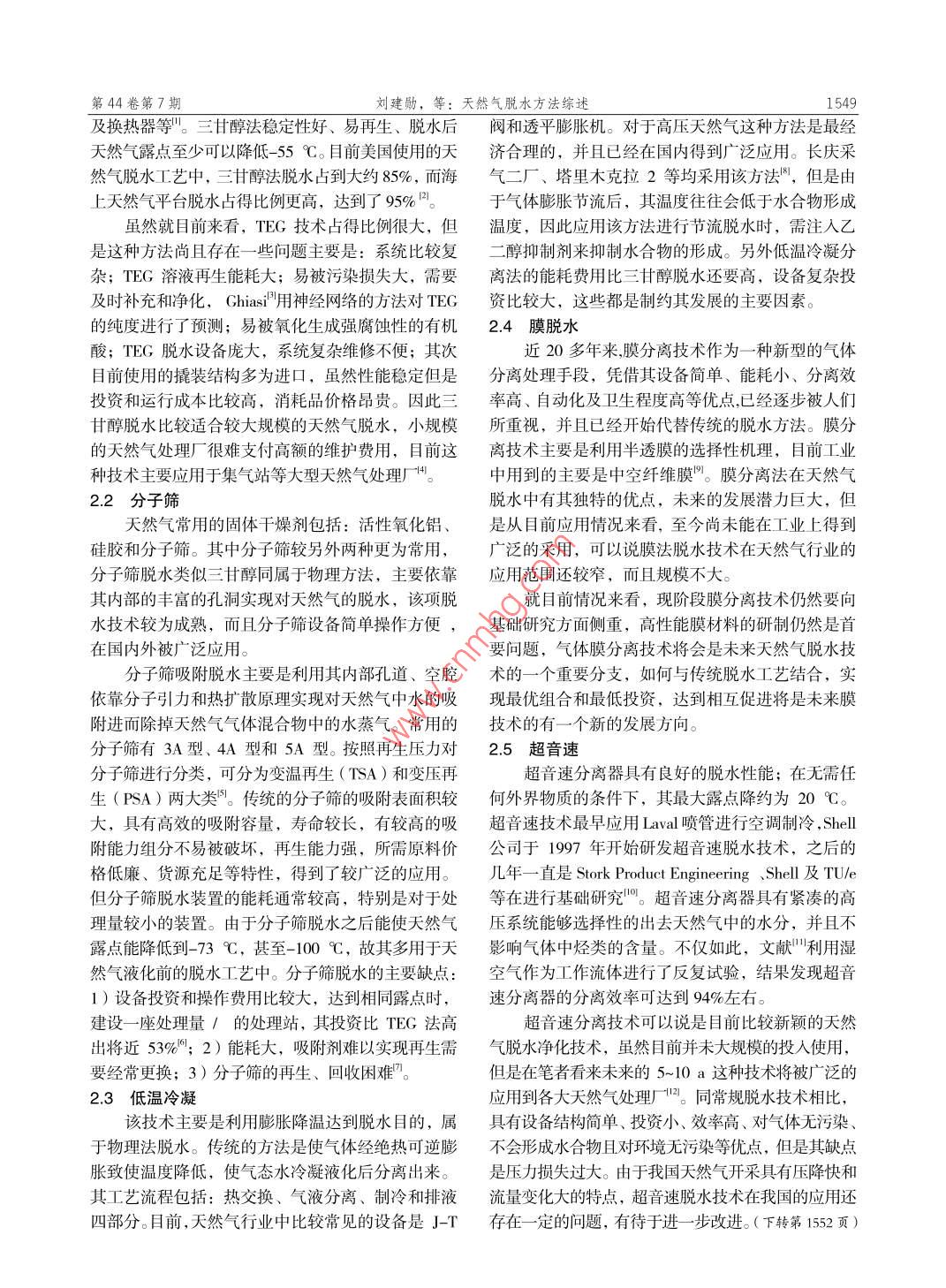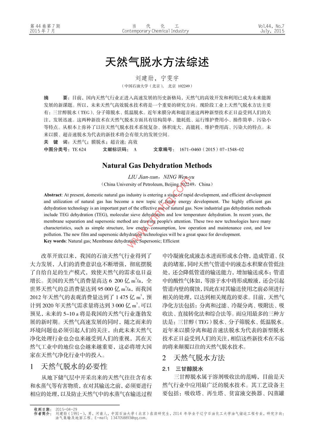 第44卷第7期化工Vvo1.44. No.72015年7月Contemporary Chemical IndustryJuly,2015天然氣脫水方法綜述劉建勛,寧雯宇(中國(guó)石油大學(xué)(北京),北京102249 )摘要:目前,國(guó)內(nèi)天然氣行業(yè)正進(jìn)入高速發(fā)展的歷史新格局,天然氣的高效開發(fā)和利用已成為未來能源發(fā)展的新課題。所以,未來天然氣高效脫水技術(shù)將是-“ 個(gè)重要的研究方向。現(xiàn)階段工業(yè)上天然氣脫水方法主要有:三甘醇脫水(TEG)、分子篩脫水、低溫脫水。近年來膜分離和超音速這兩種新型技術(shù)正日益受到人們的關(guān)注,發(fā)展迅速。這兩種新技術(shù)在天然氣脫水方面具有結(jié)構(gòu)簡(jiǎn)單、能耗低、運(yùn)行維護(hù)費(fèi)用小、操作簡(jiǎn)單、污染小等特點(diǎn)。從根本上彌補(bǔ)了以往天然氣脫水技術(shù)系統(tǒng)復(fù)雜、體積龐大、高能耗、維護(hù)費(fèi)用高、污染大的特點(diǎn)。未來以膜、超音速脫水為代表的新技術(shù)將會(huì)有很大的發(fā)展空間。關(guān)鍵詞:天然氣;膜脫水;超音速;高效中圖分類號(hào): TE 624文獻(xiàn)標(biāo)識(shí)碼: A文章編號(hào): 1671-0460 (2015) 07-1548-02Natural Gas Dehydration MethodsLIU Jian-xun, NING Wen-yu( China University of Petroleum, Bejjing 102249,China)Abstract: At present, domestic natural gas industry is entering a stage of rapid development, and efficient developmentand utilization of natural gas has become a new topic of future energy development. The highly efcient gasdehydration technology is an important part of the efective use of natural gas. Now industrial gas dehydration methodsinclude TEG dehydration (TEG), molecular sieve dehydration and low temperature dehydration. In recent years, themembrane separation and supersonic method are drawing people's attention. These two new technologies have manycharateristics, such as simple structure, low energy consumption, low operation and maintenance cost, and lowpollution. The new film and supersonic dehydration technologies will be a great space for development.Key words: Natural gas; Membrane dehydration; Supersonic; Efficient改革開放以來,我國(guó)的石油天然氣行業(yè)得到了中冷凝液化成液態(tài)水進(jìn)而形成水合物,造成管道、儀大力發(fā)展,人們的消費(fèi)意識(shí)也不斷增強(qiáng),徹底擺脫表的堵塞,同時(shí)天然氣管道中的液態(tài)水積聚在管低洼了自給自足的生產(chǎn)模式,致使天然氣的需求也8益處,還會(huì)降低管道的輸送能力,增加輸送成本;管道增長(zhǎng)。美國(guó)的天然氣消費(fèi)量高達(dá)6 200億m/a,全中的酸性氣體如,等溶于水中將形成酸液,還會(huì)引起:世界天然氣的總消費(fèi)量達(dá)到95000億m'/a,而我國(guó)管道內(nèi)壁的腐蝕,因此在對(duì)其輸送使用之前必須進(jìn)行2012年天然氣的表觀消費(fèi)量達(dá)到了1475億m',預(yù)相關(guān)的處理,以達(dá)到相關(guān)規(guī)范的要求。目前,天然氣計(jì)到2020年天然氣需求量將達(dá)到3000億m'??梢詢艋椒ò?分離和過濾、冷凝分離、吸附法、吸預(yù)見,未來的5~10 a將是我國(guó)的天然氣行業(yè)蓬勃發(fā)收法、直接轉(zhuǎn)化法和綜合法等。而應(yīng)用最多的三種方展的新時(shí)期。天然氣高速發(fā)展的同時(shí),隨之而來的法是:三甘醇(TEG)脫水、分子篩脫水、低溫脫水。環(huán)境問題也必須引起人們的關(guān)注,由此未來天然氣近年來以膜分離和超音速法脫水為代表的新型脫水凈化處理行業(yè)也會(huì)也來越受到人們的重視,其在天技術(shù)正日益受到人們的關(guān)注,相信這些新技術(shù)在不遠(yuǎn)然氣工業(yè)中的地位也會(huì)越來越重要,這必將增大國(guó)的將來顛 覆以往的天然氣脫水技術(shù)。家在天然氣凈化行業(yè)中的投入。2天然氣脫水方法1天然氣脫水的必要性2.1 三甘醇脫水從地下儲(chǔ)氣層中開采出來的天然氣往往含有水三甘醇脫水屬于溶劑吸收法的范疇,目前是天和水蒸氣等有害物質(zhì),在對(duì)其輸送之前,必須要進(jìn)行然氣行業(yè)中應(yīng)用最廣泛的脫水技術(shù)。其工藝設(shè)備主相應(yīng)的處理,以及防止天然氣中的水蒸氣在輸送過程要包括: 吸收塔、再生塔、貧富液交換器、閃蒸罐收到日期: 2015-04-29.作者簡(jiǎn)介:劉建勛(1991-), 男,河南人,中國(guó)石油大學(xué)(北京)在讀研究生,2014年畢業(yè)于遼寧石油化工大學(xué)油氣儲(chǔ)運(yùn)工程專業(yè),研究方向:油氣集輸及地面工程。E-mail: 1 347058893@qq.com.第44卷第7期劉建勛,等:天然氣脫水方法綜述1549及換熱器等"。三甘醇法穩(wěn)定性好、易再生、脫水后閥和透平膨脹機(jī)。對(duì)于高壓天然氣這種方法是最經(jīng)天然氣露點(diǎn)至少可以降低- -55 C。目前美國(guó)使用的天濟(jì)合理的,并且已經(jīng)在國(guó)內(nèi)得到廣泛應(yīng)用。長(zhǎng)慶采然氣脫水工藝中,三甘醇法脫水占到大約85%,而海氣二廠、塔里木克拉2等均采用該方法”,但是由上天然氣平臺(tái)脫水占得比例更高,達(dá)到了95%”。于氣體膨脹節(jié)流后,其溫度往往會(huì)低于水合物形成雖然就目前來看,TEG 技術(shù)占得比例很大,但溫度,因此應(yīng)用該方法進(jìn)行節(jié)流脫水時(shí),需注人乙是這種方法尚且存在一.些問題主要是:系統(tǒng)比較復(fù)二醇抑制劑來抑制水合物的形成。另外低溫冷凝分雜; TEG溶液再生能耗大;易被污染損失大,需要離法的能耗費(fèi)用比三甘醇脫水還
