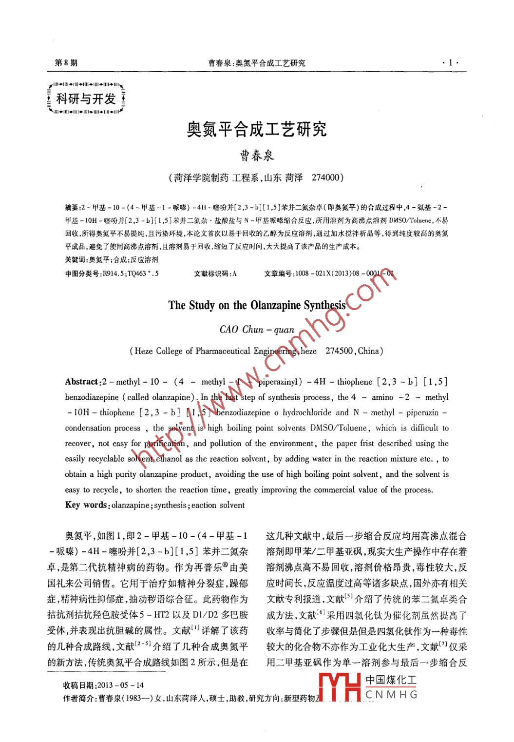 第8期曹春泉:奧氮平合成工藝研究舊出◆◆科研與開發(fā)奧氮平合成工藝研究曹春泉(菏澤學(xué)院制藥工程系,山東菏澤2740000摘要:2-甲基-10-(4-甲基-1-哌嗪)-4H-噻吩并[2,3-b][1,5]苯并二氮雜卓(即奧氮平)的合成過程中,4-氨基-2甲基-10H-噻吩并[2,3-b][1,5]苯并二氮雜·鹽酸鹽與N-甲基哌嗪縮合反應(yīng),所用溶劑為高沸點(diǎn)溶劑 DMso/Toluene,不易回收所得奧氮平不易提純,且污染環(huán)境,本論文首次以易于回收的乙醇為反應(yīng)溶劑,邐過加水?dāng)嚢栉鼍У?得到純度較高的奧氮平成品,避免了使用高沸點(diǎn)溶劑,且溶劑易于回收,縮短了反應(yīng)時(shí)間,大大提高了該產(chǎn)品的生產(chǎn)成本。關(guān)鍵詞:奧氮平;合成;反應(yīng)溶劑中圖分類號:B14.5;TQ463.5文獻(xiàn)標(biāo)識碼:A文章編號:1008-021X(2013)08-0001-02The Study on the Olanzapine SynthesisCAO Chun- quanHeze College of Pharmaceutical Engineering heze 274500, China)Abstract: 2 -methyl-10-(4piperazinyl )-4H- thiophene [2, 3-b][1, 5]benzodiazepine(called olanzapine). In the last step of synthesis process, the 4-amino-2- methyl10H-thiophene [2, 3-b][1, 5] benzodiazepine o hydrochloride and N-methyl - piperazincondensation process, the solvent is high boiling point solvents DMSO/Toluene, which is difficultrecover, not easy for purification, and pollution of the environment, the paper frist described using theeasily recyclable solvent ethanol as the reaction solvent, by adding water in the reaction mixture etc,obtain a high purity olanzapine product, avoiding the use of high boiling point solvent, and the solvent iseasy to recycle, to shorten the reaction time, greatly improving the commercial value of the procesKey words: olanzapine; synthesis; eaction solvent奧氮平,如圖1,即2-甲基-10-(4-甲基-1這幾種文獻(xiàn)中,最后一步縮合反應(yīng)均用高沸點(diǎn)混合哌嗪)-4H-噻吩并[2,3-b][1,5]苯并二氮雜溶劑即甲苯/二甲基亞砜,現(xiàn)實(shí)大生產(chǎn)操作中存在著卓,是第二代抗精神病的藥物。作為再普樂由美溶劑沸點(diǎn)高不易回收,溶劑價(jià)格昂貴,毒性較大,反國禮來公司銷售。它用于治療如精神分裂癥,躁郁應(yīng)時(shí)間長,反應(yīng)溫度過高等諸多缺點(diǎn),國外亦有相關(guān)癥精神病性抑郁癥,抽動(dòng)穢語綜合征。此藥物作為文獻(xiàn)專利報(bào)道,文獻(xiàn)介紹了傳統(tǒng)的苯二氮卓類合拮抗劑拮抗羥色胺受體5-HT2以及D/D2多巴胺成方法,文獻(xiàn)6采用四氯化鈦為催化劑雖然提高了受體并表現(xiàn)出抗膽堿的屬性。文獻(xiàn)詳解了該藥收率與簡化了步驟但是但是四氯化鈦?zhàn)鳛橐环N毒性的幾種合成路線,文獻(xiàn)2-介紹了幾種合成奧氮平較大的化合物不亦作為工業(yè)化大生產(chǎn),文獻(xiàn)僅采的新方法,傳統(tǒng)奧氮平合成路線如圖2所示,但是在用二甲基亞砜作為單一溶劑參與最后一步縮合反收稿日期:2013-05-14中國煤化工作者簡介:曹舂泉(1983-)女,山東菏澤人,碩士,助教,研究方向;新型藥物HCNMHG山東化工SHANDONG CHEMICAL INDUSTRY2013年第42卷應(yīng),但是需要做酸、堿處理并且也面臨著不易回收,操作步驟繁瑣等缺點(diǎn),文獻(xiàn)。未采用溶劑僅采用加大N-甲基哌嗪用量,使其既做溶劑也做反應(yīng)原料但是存在著生成的奧氮平不易提純,且N-甲基哌N一CHb嗪也大大過量,進(jìn)一步增加了生產(chǎn)成本等缺點(diǎn),本文采用價(jià)格相對便宜,易于回收,污染較輕的乙醇為單反應(yīng)溶劑,通過控制反應(yīng)溫度與時(shí)間,反應(yīng)完畢后以純水處理等步驟得到了高純度的奧氮平成品,見圖3,而乙醇易于回收,大大降低了生產(chǎn)成本。圖1奧氮平結(jié)構(gòu)NO2CH CH CHO+H2NH HCIhSnChDMSO Toluenc圖2奧氪平傳統(tǒng)合成工藝路線-CH3NAhCCH:,OHH3CH3圖3奧氮平的合成原料與儀器濾得黃色固體約42g,收率為72%。熔點(diǎn):195乙醇分析純;N-甲基哌嗪分析純;4-氨基96℃與文獻(xiàn)一致,FSI-MS:313.4[M+1],1H2-甲基-10H-噻吩并[2,3-b][1,5]苯并二NMR,(CDCl3)8:2.25(s,3H,C-CH3),2.37(s,氮雜·鹽酸鹽,自制;純化水;WRS-1C型熔點(diǎn)測定3H,N-CH3),2.4(t,4H,(CH2)2N-CH3),3.49儀; Agilent G6460A型液質(zhì)聯(lián)用儀; Bruck400MHZ核(t,4H,C-N-(CH2)2),5.01(s,1l,NH),6.34(s磁共振儀。lH,S-C=CH-);6.60-7.06(m,4H,PhH)。2實(shí)驗(yàn)部分3小結(jié)1000mL四口瓶中加入4-氨基-2-甲基本工藝改進(jìn)中,首次嘗試以價(jià)格較低廉且易于10H-噻吩并[2,3-b][1,5]苯并二氮雜·鹽酸鹽回收處理的乙醇代替甲苯/DMSO體系,得到了純度50.0g(0.2mol),N-甲基哌嗪125mL,乙醇150mL,較高的奧氮平成品,經(jīng)過ES-Ms,H-NMR及熔氮?dú)獗Wo(hù)條件下緩慢加熱至回流約94℃左右,TC點(diǎn)檢測確證了結(jié)構(gòu),經(jīng)過工藝改進(jìn)后,收率達(dá)到了檢測反應(yīng)保溫?cái)嚢柽^夜,停止攪拌自然冷卻至72%,原料簡單易動(dòng)聞尢十降低了奧氮50℃以下,加入水100mL,此時(shí)析出大量黃色固體,平生產(chǎn)成本,具抽濾,將該固體加入約50mL水中,常溫?cái)嚢?h,抽CNMH、轉(zhuǎn)第4頁)SHANDONG CHEMICAL INDUSTRY2013年第42卷Br何溶劑,40℃下直接反應(yīng)24h,可高純度,高收率得Br.得到1-溴-3,5-二甲基金剛烷,后處理簡單方「2便,可應(yīng)用于工業(yè)化生產(chǎn),降低了鹽酸美金剛的工藝成本參考文獻(xiàn)[1] Abdel-Aal Raafat A, Assi Abdel-Azim A, Kostandy1.3合成方法Botros B. Memantine prevents aluminum-induced cogni-在反應(yīng)器中加入溴8.0L,5.1kg的1,3-二甲tive deficit in rats[J]. Behavioural Brain Research, 2011基金剛烷中在40℃下于10h內(nèi)慢慢地加入