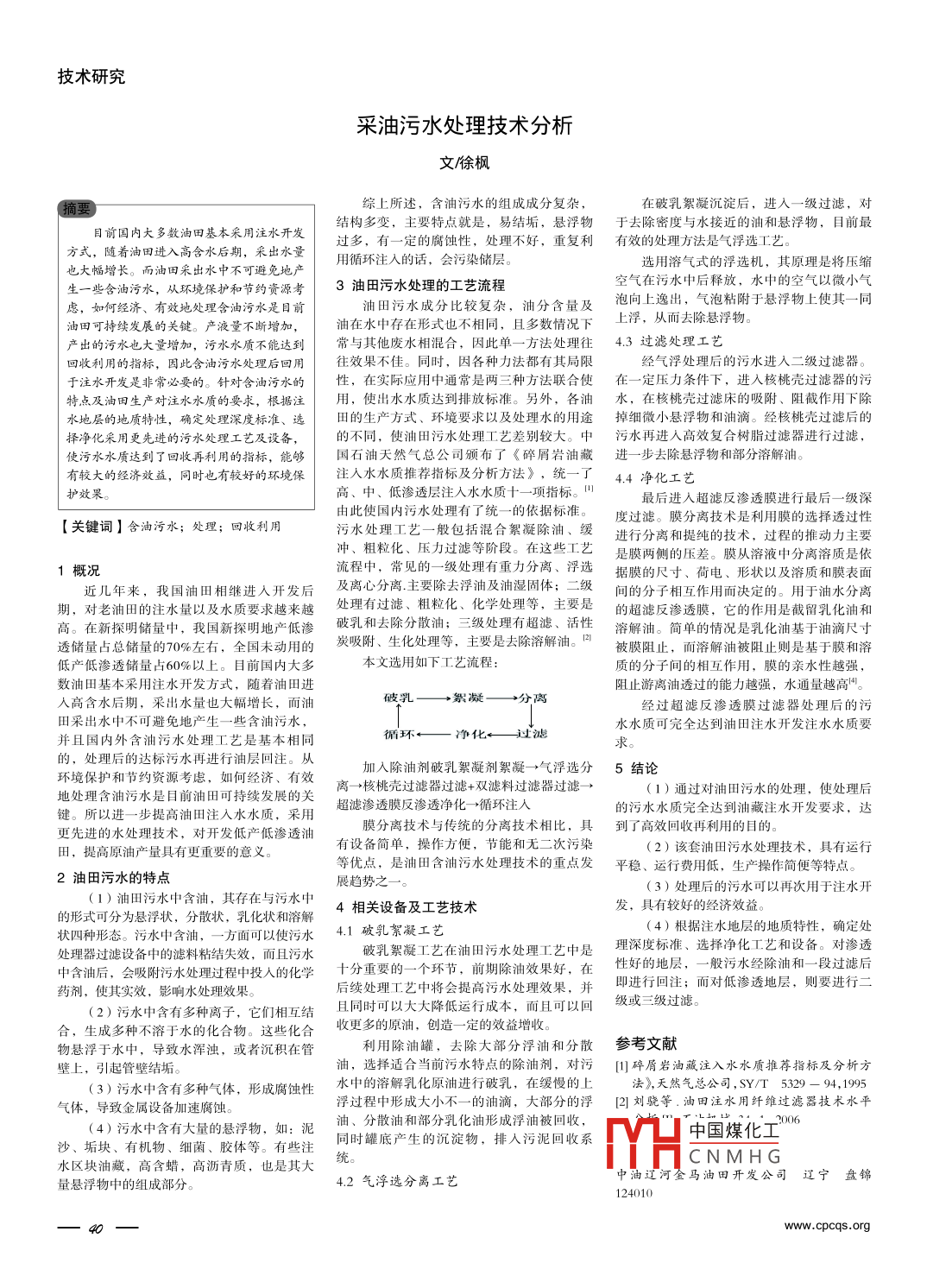 技術(shù)研究采油污水處理技術(shù)分析文徐楓摘要~綜上所述,含油污水的組成成分復(fù)雜,在破乳絮凝沉淀后,進(jìn)入- -級(jí)過(guò)濾,對(duì)目前國(guó)內(nèi)大多數(shù)油田基本采用注水開(kāi)發(fā)結(jié)構(gòu)多變,主要特點(diǎn)就是,易結(jié)垢,懸浮物于去除密度與水接近的油和懸浮物,目前最方式,隨著油田進(jìn)入高含水后期,采出水量過(guò)多,有一定的腐蝕性,處理不好,重復(fù)利有效的處理方法是氣浮選工藝。用循環(huán)注入的話,會(huì)污染儲(chǔ)層。選用溶氣式的浮選機(jī),其原理是將壓縮也大幅增長(zhǎng)。而油田采出水中不可避免地產(chǎn)生一些含油污水,從環(huán)境保護(hù)和節(jié)約資源考3油田污水處理的工藝流程空氣在污水中后釋放,水中的空氣以微小氣慮,如何經(jīng)濟(jì)、有效地處理含油污水是目前油田污水成分比較復(fù)雜,油分含量及泡向上逸出,氣泡粘附于懸浮物上使其一同油田可持續(xù)發(fā)展的關(guān)鍵。產(chǎn)液量不斷增加,油在水中存在形式也不相同,且多數(shù)情況下上浮,從而去除懸浮物。產(chǎn)出的污水也大量增加,污水水質(zhì)不能達(dá)到常與其他廢水相混合,因此單一方法處理往4.3 過(guò)濾處理工藝回收利用的指標(biāo),因此含油污水處理后回用往效果不佳。同時(shí),因各種力法都有其局限經(jīng)氣浮處理后的污水進(jìn)入二級(jí)過(guò)濾器。于注水開(kāi)發(fā)是非常必要的。針對(duì)含油污水的性,在實(shí)際應(yīng)用中通常是兩三種方法聯(lián)合使在- -定壓力條件下,進(jìn)人核桃殼過(guò)濾器的污特點(diǎn)及油田生產(chǎn)對(duì)注水水質(zhì)的要求,根據(jù)注用,使出水水質(zhì)達(dá)到排放標(biāo)準(zhǔn)。另外,各油水, 在核桃殼過(guò)濾床的吸附、阻截作用下除水地層的地質(zhì)特性,確定處理深度標(biāo)準(zhǔn)、選田的生產(chǎn) 方式、環(huán)境要求以及處理水的用途掉 細(xì)微小懸浮物和油滴。經(jīng)核桃殼過(guò)濾后的擇凈化采用更先進(jìn)的污水處理工藝及設(shè)備,的不同,使油田污水處理工藝差別較大。中污水再進(jìn)人高效復(fù)合樹(shù)脂過(guò)濾器進(jìn)行過(guò)濾,使污水水質(zhì)達(dá)到了回收再利用的指標(biāo),能白國(guó)石油天然氣總公司頒布了《碎屑巖油藏進(jìn)一步去除懸浮物和部分溶解油。有較大的經(jīng)濟(jì)效益,同時(shí)也有較好的環(huán)境保注人水水質(zhì)推薦指標(biāo)及分析方法》,統(tǒng)-了4.4 凈化工藝護(hù)效果。高、中、低滲透層注入水水質(zhì)十-項(xiàng)指標(biāo)。最后進(jìn)入超濾反滲透膜進(jìn)行最后- -級(jí)深由此使國(guó)內(nèi)污水處理有了統(tǒng)一的依據(jù)標(biāo)準(zhǔn)。度過(guò)濾。膜分離技術(shù)是利用膜的選擇透過(guò)性[關(guān)鍵詞] 含油污水;處理;回收利用污水處理工藝- -般包括混合絮凝除油、緩進(jìn)行分離和提純的技術(shù),過(guò)程的推動(dòng)力主要沖、粗?;?、壓力過(guò)濾等階段。在這些工藝是膜兩側(cè)的壓差。膜從溶液中分離溶質(zhì)是依1概況流程中,常見(jiàn)的一-級(jí)處理有重力分離、浮選據(jù)膜的尺寸、 荷電、形狀以及溶質(zhì)和膜表面近幾年來(lái),我國(guó)油田相繼進(jìn)人開(kāi)發(fā)后及離心分離.主要除去浮油及油濕固體;二級(jí)間的分子相互作用而決定的。用于油水分離期,對(duì)老油田的注水量以及水質(zhì)要求越來(lái)越處理有過(guò)濾、粗粒化、化學(xué)處理等,主要是的超濾反滲透膜,它的作用是截留乳化油和高。在新探明儲(chǔ)量中,我國(guó)新探明地產(chǎn)低滲破乳和去除分散油;三級(jí)處理有超濾、活性溶解油。簡(jiǎn)單的情況是乳化油基于油滴尺寸透儲(chǔ)量占總儲(chǔ)量的70%左右,全國(guó)未動(dòng)用的炭吸附、生化處理等,主要是去除溶解油。口被膜阻止,而溶解油被阻止則是基于膜和溶低產(chǎn)低滲透儲(chǔ)量占60%以上。目前國(guó)內(nèi)大多本文選用如下工藝流程:質(zhì)的分子間的相互作用,膜的親水性越強(qiáng),數(shù)油田基本采用注水開(kāi)發(fā)方式,隨著油田進(jìn)阻止游離油透過(guò)的能力越強(qiáng),水通量越高”。入高含水后期,采出水量也大幅增長(zhǎng),而油破乳-一◆絮凝一吩離經(jīng)過(guò)超濾反滲透膜過(guò)濾器處理后的污田采出水中不可避免地產(chǎn)生一些含油污水,循環(huán)←-凈化←過(guò)濾水水質(zhì)可完全達(dá)到油田注水開(kāi)發(fā)注水水質(zhì)要并且國(guó)內(nèi)外含油污水處理工藝是基本相同的,處理后的達(dá)標(biāo)污水再進(jìn)行油層回注。從加入除油劑破乳絮凝劑絮凝- +氣浮選分5 結(jié)論環(huán)境保護(hù)和節(jié)約資源考慮,如何經(jīng)濟(jì)、有效離→核桃殼過(guò)濾器過(guò)濾+雙濾料過(guò)濾器過(guò)濾-→(1)通過(guò)對(duì)油田污水的處理,使處理后地處理含油污水是目前油田可持續(xù)發(fā)展的關(guān)超濾滲透膜反滲透凈化- -循環(huán)注人的污水水質(zhì)完全達(dá)到油藏注水開(kāi)發(fā)要求,達(dá)鍵。所以進(jìn)一步提高油田注入水水質(zhì),采用膜分離技術(shù)與傳統(tǒng)的分離技術(shù)相比,具到了高效回收再 利用的目的。更先進(jìn)的水處理技術(shù),對(duì)開(kāi)發(fā)低產(chǎn)低滲透油有設(shè)備簡(jiǎ