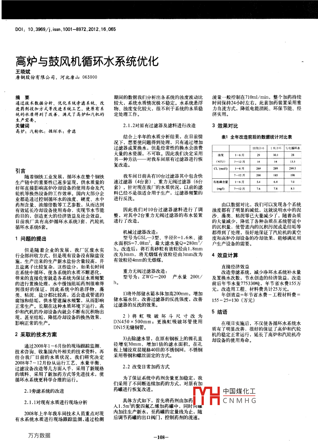 Dol:10.3969/jisn.1001-89722012.16.065高爐與鼓風(fēng)機(jī)循環(huán)水系統(tǒng)優(yōu)化王曉斌唐鋼股份有限公司,河北唐山063000摘要期間的數(shù)據(jù)我們分析出各系統(tǒng)的濁度波動(dòng)比流量一般控制在710ml/min,整個(gè)加藥持續(xù)通過技術(shù)數(shù)據(jù)分析、優(yōu)化系統(tǒng)旁濾系統(tǒng)、改較大,系統(tǒng)水質(zhì)情況極不穩(wěn)定。水系統(tǒng)懸浮時(shí)間保持24小時(shí)左右。此套加藥裝置采用重進(jìn)藥劑授加方式等改進(jìn)系統(tǒng)工藝,使原有系物、濁度變化較大,很不利于系統(tǒng)的水質(zhì)穩(wěn)力自流方式,降低電能消耗、環(huán)保節(jié)能、經(jīng)統(tǒng)的水質(zhì)得到了改善,滿足了高爐和汽機(jī)的定處理工作濟(jì)實(shí)用。生產(chǎn)需要。關(guān)鍵詞2.L.2對(duì)原有過濾器及濾料進(jìn)行改造3效果對(duì)比高爐;汽輪機(jī);循環(huán)水;旁濾結(jié)合上半年的水質(zhì)分析結(jié)果,在目前情表1全年改造前后的數(shù)據(jù)統(tǒng)計(jì)對(duì)比表況下,想要使問題得到處理,只有通過增加過濾器或置換水,但是經(jīng)常性的換水會(huì)浪費(fèi)們期凈環(huán)1環(huán)發(fā)電循環(huán)水大量的水資源,不可取。因此我們決定采用-6月另一種方法—對(duì)我車間原有過濾器進(jìn)行恢7-12月引言CL(mo)t6月2995著鋼鐵工業(yè)發(fā)展,循環(huán)水在整個(gè)鋼鐵我車間日前共有10臺(tái)過濾器其中包含快7-12月生產(chǎn)鏈中的重要性已逐步顯現(xiàn),供水質(zhì)量的速過濾器(4臺(tái)合套)、重力無閥過濾器(6臺(tái)有機(jī)磷含量1-6月5464好壞直接影響高爐冷卻設(shè)備的使用壽命及汽套),針對(duì)現(xiàn)在我廠的水質(zhì)狀況,以前的濾7-12月輪機(jī)等換熱設(shè)備的工作效率。國內(nèi)大部分企料已經(jīng)不是很適合用于生產(chǎn),過濾器頻繁的業(yè)都是通過控制循環(huán)水的濁度、硬度、水中進(jìn)行反洗。藥劑含量、濃縮倍數(shù)等工藝參數(shù),從而達(dá)到由以數(shù)據(jù)對(duì)比,我們可以發(fā)現(xiàn)各個(gè)系統(tǒng)有效延長冷卻設(shè)備使用壽命,實(shí)現(xiàn)節(jié)水節(jié)能因此我們對(duì)10臺(tái)過濾器濾料進(jìn)行了調(diào)濁度都有了明顯的減低,這就說明水中的泥的經(jīng)濟(jì)效益及社會(huì)效益。整,對(duì)其中2臺(tái)重力無閥過濾器的布水裝置沙,藻類、粘泥等已大量減少了,隨著雜質(zhì)目前我廠共冇高爐循環(huán)水系統(tǒng)3套,汽輪機(jī)進(jìn)行了改造的大量減少,降低了各種雜質(zhì)在系統(tǒng)管道中循環(huán)水系統(tǒng)6套的沉積量,使管道內(nèi)的沉積污泥或是結(jié)垢等機(jī)械過濾器改造都得到了處理,很好地保證了汽輪機(jī)的真空1問題的提出號(hào)為GSL-3型、半徑R=1.6米、濾度和高爐冷卻設(shè)備的冷卻效果,能夠滿足用水面積S=7.08m2、最大濾水量Q=280m3/戶生產(chǎn)設(shè)備的需要。但是隨著企業(yè)的發(fā)展,我廠區(qū)廢水實(shí)h。改造后:將石英砂粒有效粒徑由18mm行全部回收方式,但是現(xiàn)有設(shè)備沒有除鹽設(shè)改為3mm,將無煙煤有效粒徑由3mm改為4效益計(jì)算施,生產(chǎn)出來的生產(chǎn)新水鹽份含量較高,并有效粒徑4mm的無煙煤直接經(jīng)濟(jì)效益在系統(tǒng)中循環(huán),使各系統(tǒng)的水質(zhì)不斷惡化重力無閥過濾器改造:改造旁濾系統(tǒng),減少凈環(huán)水系統(tǒng)補(bǔ)水量帶來的直接危害就是各系統(tǒng)為保證水質(zhì)頻繁型號(hào)為:ZWG-200產(chǎn)水量200/及置換水次數(shù),節(jié)水創(chuàng)造的經(jīng)濟(jì)效益,改造的進(jìn)行置換處理,水中緩蝕阻垢藥劑很難得前后年節(jié)水量775330噸,年節(jié)省水費(fèi)155萬到很好的保證,因此系統(tǒng)中的懸浮物、藻元,改造用工程、材料費(fèi)共計(jì)25萬元。類、粘泥、鹽分都比較高,還會(huì)造成管道的1)將外部儲(chǔ)水箱本體加高200mm,增加年創(chuàng)效益=年節(jié)省水費(fèi)一工程材料費(fèi)=腐蝕和結(jié)垢,供水管道漏水頻繁,從而影響儲(chǔ)水箱水位,改善過濾器的反洗強(qiáng)度,改善155-25=130(萬元)正常生產(chǎn)。長期在這種水質(zhì)環(huán)境下運(yùn)行,高過濾器的反洗的效果爐和汽機(jī)的冷卻設(shè)備內(nèi)就會(huì)不斷有沉積物出5結(jié)語現(xiàn),甚至結(jié)垢,降低冷卻設(shè)備的換熱效果,2)將虹吸破壞斗尺寸改為影響正常的生產(chǎn)。DN450×500mm;更換虹吸破壞管使用在項(xiàng)目實(shí)施后,不僅使各循環(huán)水系統(tǒng)水DNl5無縫鋼管質(zhì)有了明顯改善,很好的保證了高爐和汽輪2采取的技術(shù)方案3)去除濾水冒,在原有鋼板上的圓孔機(jī)的穩(wěn)定正常運(yùn)行,延長了高爐和汽輪機(jī)冷通過2008年1~6月份的現(xiàn)場跟蹤監(jiān)測徑增至30mm,增加1倍的濾水面積。在孔卻設(shè)備的使用壽命。技術(shù)咨詢、收集國內(nèi)外相關(guān)的技術(shù)資料,板上鋪設(shè)雙層規(guī)格40目的不銹鋼網(wǎng),不銹鋼結(jié)合我廠目前的水質(zhì)狀況,我們研究決定采用帶鋼和螺絲固定的方式2008年7~12月份從運(yùn)行工藝、水量平衡過濾設(shè)備改造等幾方面入手,采用了新規(guī)格2.2改變?nèi)粘<铀幏绞降奶盍?、采用了新加藥方式等先進(jìn)技術(shù),使循環(huán)水系統(tǒng)更科學(xué)合理的運(yùn)行。為了保證系統(t