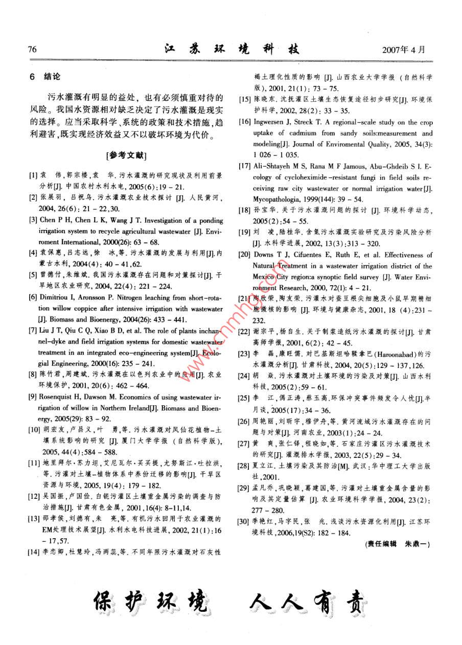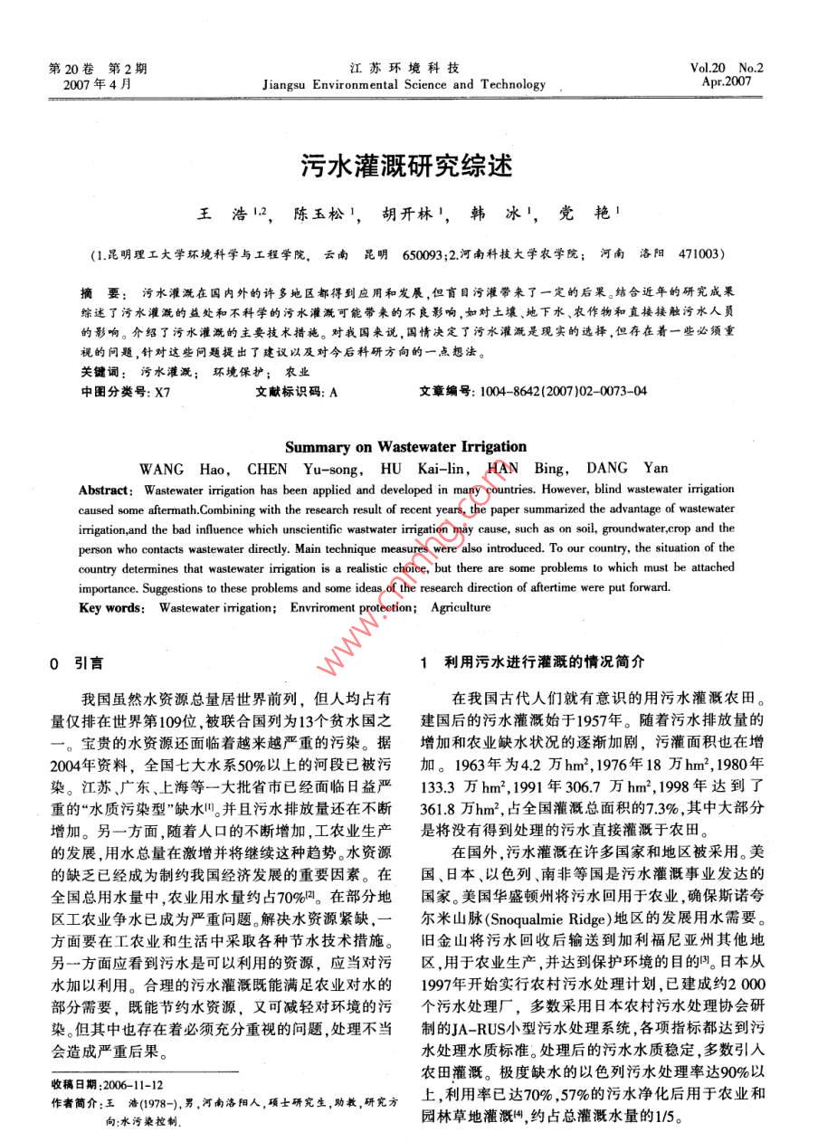 第2期江蘇環(huán)境科技Vol 20 No. 22007年4月Jiangsu Environmental Science and TechnologyApr.2007污水灌溉研究綜述王浩1,陳玉松1,胡開林',韓冰',黨艷(1.昆明理工大學(xué)環(huán)境科學(xué)與工程學(xué)院,云南昆明6503;2河南科技大學(xué)農(nóng)學(xué)院;河南洛陽(yáng)471003)摘要:污水灌溉在國(guó)內(nèi)外的許多地區(qū)都得到應(yīng)用和發(fā)展,但盲目污灌帶來(lái)了一定的后果。結(jié)合近年的研究成果綜述了污水灌溉的益處和不科學(xué)的污水灌溉可能帶來(lái)的不良影響,如對(duì)土壤、地下水、農(nóng)作物和直接接觸污水人員的影響。介紹了污水灌溉的主要技術(shù)措施。對(duì)我國(guó)來(lái)說(shuō),國(guó)情決定了污水灌溉是現(xiàn)實(shí)的選擇,但存在著一些必須重視的問(wèn)題,針對(duì)這些問(wèn)題提出了建議以及對(duì)今后科研方向的一點(diǎn)想法。關(guān)鍵詞:污水灌溉;環(huán)境保護(hù);農(nóng)業(yè)中圖分類號(hào):X7文獻(xiàn)標(biāo)識(shí)碼:A文章編號(hào):1004-8642(2007)020073-04Summary on Wastewater IrrigationWANG Hao, CHEN Yu-song, HU Kai-lin, HAN Bing, DANG YanAbstract: Wastewater irrigation has been applied and developed in many countries. However, blind wastewater irrigationcaused some aftermath. combining with the research result of recent years, the paper summarized the advantage of wastewaterrrigation, and the bad influence which unscientific wastwater irrigation may cause, such as on soil, groundwater, crop and theperson who contacts wastewater directly. Main technique measures were also introduced. To our country. the situation of thecountry determines that wastewater irrigation is a realistic choice, but there are some problems to which must be attachedKey words: Wastewater imigation; Envriroment protection: Agricultur0引言1利用污水進(jìn)行灌溉的情況簡(jiǎn)介我國(guó)雖然水資源總量居世界前列,但人均占有在我國(guó)古代人們就有意識(shí)的用污水灌溉農(nóng)田。量?jī)H排在世界第109位,被聯(lián)合國(guó)列為13個(gè)貧水國(guó)之建國(guó)后的污水灌溉始于1957年。隨著污水排放量的寶貴的水資源還面臨著越來(lái)越嚴(yán)重的污染。據(jù)增加和農(nóng)業(yè)缺水狀況的逐漸加劇,污灌面積也在增2004年資料,全國(guó)七大水系50%以上的河段已被污加。1963年為4.2萬(wàn)hm2,1976年18萬(wàn)hm2,1980年染。江蘇、廣東、上海等一大批省市已經(jīng)面臨日益嚴(yán)1333萬(wàn)hm2,1991年306,7萬(wàn)hm2,1998年達(dá)到了重的“水質(zhì)污染型"缺水并且污水排放量還在不斷361.8萬(wàn)hm2,占全國(guó)灌溉總面積的73%,其中大部分增加。另一方面,隨著人口的不斷增加,工農(nóng)業(yè)生產(chǎn)是將沒(méi)有得到處理的污水直接灌溉于農(nóng)田的發(fā)展,用水總量在激增并將繼續(xù)這種趨勢(shì)。水資源在國(guó)外,污水灌溉在許多國(guó)家和地區(qū)被采用。美的缺乏已經(jīng)成為制約我國(guó)經(jīng)濟(jì)發(fā)展的重要因素。在國(guó)、日本、以色列、南非等國(guó)是污水灌溉事業(yè)發(fā)達(dá)的全國(guó)總用水量中,農(nóng)業(yè)用水量約占70%。在部分地國(guó)家。美國(guó)華盛頓州將污水回用于農(nóng)業(yè),確保斯諾夸區(qū)工農(nóng)業(yè)爭(zhēng)水已成為嚴(yán)重問(wèn)題。解決水資源緊缺,一爾米山脈( Snoqualmie Ridge)地區(qū)的發(fā)展用水需要方面要在工農(nóng)業(yè)和生活中采取各種節(jié)水技術(shù)措施。舊金山將污水回收后輸送到加利福尼亞州其他地另一方面應(yīng)看到污水是可以利用的資源,應(yīng)當(dāng)對(duì)污區(qū),用于農(nóng)業(yè)生產(chǎn),并達(dá)到保護(hù)環(huán)境的目的。日本從水加以利用。合理的污水灌溉既能滿足農(nóng)業(yè)對(duì)水的1997年開始實(shí)行農(nóng)村污水處理計(jì)劃,已建成約2000部分需要,既能節(jié)約水資源,又可減輕對(duì)環(huán)境的污個(gè)污水處理廠,多數(shù)采用日本農(nóng)村污水處理協(xié)會(huì)研染。但其中也存在著必須充分重視的問(wèn)題,處理不當(dāng)制的JA-RUS小型污水處理系統(tǒng),各項(xiàng)指標(biāo)都達(dá)到污會(huì)造成嚴(yán)重后果。水處理水質(zhì)標(biāo)準(zhǔn)。處理后的污水水質(zhì)穩(wěn)定,多數(shù)引入農(nóng)田灌溉。極度缺水的以色列污水處理率達(dá)90%以收稿日期:2006-11-12作者筒介,王(978-),男,河南洛陽(yáng)人,項(xiàng)士研究生,助教,研究方上,利用率已達(dá)70%,57%的污水凈化后用于農(nóng)業(yè)和向:水污染控制園林草地灌溉,約占總灌溉水量的1/5。蘇環(huán)境科故2007年4月2污水灌溉的益處健康特別是重金屬等有毒物質(zhì)。重金屬對(duì)人的危害極大,世界八大公害之一的日本“疼疼病”事件就是2.1緩解缺水狀況由鎘(Cd)污染引起的。并且被重金屬污染的土壤恢我國(guó)農(nóng)業(yè)每年缺水達(dá)300億m3。20世紀(jì)90年代,復(fù)十分困難。在我國(guó)由污水灌溉引起的重金屬污染因缺水造成的糧食減產(chǎn)達(dá)250~400億kg。隨著我國(guó)已經(jīng)在許多地方發(fā)生。如在甘肅的白銀市污水灌溉人口的不斷增長(zhǎng)和工農(nóng)業(yè)的發(fā)展,廢水的排放量越區(qū)已使土壤受到重金屬離子嚴(yán)重污染,需要采取換來(lái)越大。據(jù)有關(guān)部門統(tǒng)計(jì),2002年全國(guó)工業(yè)和城鎮(zhèn)生土、深翻清水灌溉、改良土壤等綜合治理措施,才能
