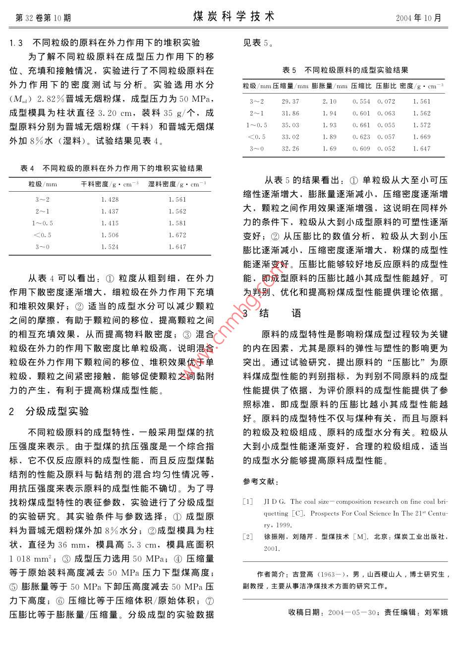第32卷第10期煤炭科學技術2004年10月粉煤成型特性研究吉登高2,張麗娟,王祖訥,馬永和2(1.中國礦業(yè)大學(北京),北京10083;2.太原理工大學,山西太原0300243.山西煤田地質研究所,山西太原030001摘要:通過對不同粒級原料的成型試驗研究,揭示了原料粒級與粉煤成型性能之間的變化關系,提岀了以原料的“壓膨比”作為描述原料成型性能的判別指標。關鍵詞:粉煤;原料粒級;成型性能;型煤中圖分類號:TQ517.3文獻標識碼:B文章編號:0253-2336(2004)10-0051-02Research on fine coal briquetting characteristicsJI Deng-gao, ZHANG Li-juan, WANG Zu-na', MA Yong-he(1. Beijing Campus, China University of Mining and Technology, Beijing 100083, China; 2. Taiyuan University of TechnologyTaiyuan 030024, China: 3. Shanxi Research Institute of Coal Field Geology, Taiyuan 030001, China)粉煤成型是以適當的工藝和設備,將一定粒度密度測試,稱為煤水密度。測試數據見表3。組成的粉煤加工成一定形狀、尺寸、強度及理化特性的塊煤。根據不同用戶的需要,克服煤炭天然存表2晉城無煙煤的篩分分析數據在的缺陷,賦予原煤所沒有的優(yōu)良特性,實現(xiàn)煤的凊潔、高效利用。該實驗對粉煤成型工藝中原料粒項目3~22~11-0.50.5~0.25<0.25級對粉煤成型性能的影響關系進行了研究,目的在22.8516.36于表征粉煤的成型性能(目前還沒有表征粉煤成型灰分/%26.4524.3622.323.6130.98性能的確切參數),揭示原料粒級對型煤質量的影響機理,科學合理地進行成型原料準備,為設計和運行成型設備提供理論依據表3不同粒級煤的散密度分析結果粒級/mm散密度/g·cm-3煤水密度/g·cm-31不同粒級原料的堆積實驗1.6841.1實驗基礎條件0.7681.651晉城無煙煤的分析數據見表1、表2。<0.50,7420,8781,697表1晉城無煙煤的工業(yè)分析數據項目M。/%A/%Va/%FC/%S/%焦渣特征從表3結果可以看出:①粒級從大到小散密指標1.7924.886.9466.390.54度和煤水密度逐漸增大,即粒級從大到小自然堆積的效果逐漸變好;②單粒級的散密度和煤水密度1.2單粒級原料的堆積實驗沒有混合粒級的散密度和煤水密度高,即單粒級的為了解不同粒級的實際堆積情況,對晉城無煙自然堆積的效果沒有混合粒級好;③分子黏合理粉煤各粒級進行自然堆積密度(稱為散密度)和對論認為,粒子間的結合是在壓力作用下,粒子間由水密度的測試。煤的真相對密度按照國家標準,先于接觸緊密,而出現(xiàn)分子黏合現(xiàn)象的結果;④應用2%十二烷基硫酸鈉溶液3mL作浸潤劑,為了選擇合理的粒級組合,促使成型原料在成型過程中接近濕法成型的實際過程,進行了煤不加浸潤劑的粒子之間的距離,減小和粒子間接觸面的增大;⑤減小堆積孔隙度,以有利于粒子間黏結力的產生,第32卷第10期煤炭科學技術2004年10月1.3不同粒級的原料在外力作用下的堆積實驗見表5為了解不同粒級原料在成型壓力作用下的移位、充填和接觸情況.實驗進行了不同粒級原料在表5不同粒級原料的成型實驗結果外力作用下的密度測試與分析。實驗選用水分粒級/mm壓縮量/mm膨脹量/mm壓縮比壓膨比密度/g·cm-3(Ma)2.82%晉城無煙粉煤,成型壓力為50MPa,2.100.5540.0721.561成型模具為柱狀直徑3.20cm,裝料35g/個,成0.6010.0631.562型原料分別為晉城無煙粉煤(干料)和晉城無煙煤1~0.535.031.930,6610,0551.572外加8%水(濕料)。試驗結果見表4<0.533.00.6230.051.6691.690.6090.0521.647表4不同粒級的原料在外力作用下的堆積實驗結果粒級/mm干料密度/g·cm-3濕料密度/g·cm-8從表5的結果看出:①單粒級從大至小可壓縮性逐漸增大,膨脹量逐漸減小,壓縮密度逐漸增大,顆粒之間作用效果逐漸增強,這說明在同樣外1~0,51.4151.581力的條件下,粒級從大到小成型原料的可塑性逐漸<0.51.672變好;②從壓膨比的數值分析,粒級從大到小壓1.524膨比逐漸減小,壓縮密度逐漸增大,粉煤的成型性能逐漸變好。壓膨比能夠較好地反應原料的成型性從表4可以看出:①粒度從粗到細,在外力能,即成型原料的壓膨比越小其成型性能越好??勺饔孟律⒚芏戎饾u增大,細粒級在外力作用下充填為判別、優(yōu)化和提高粉煤成型性能提供理論依據和堆積效果好;②適當的成型水分可以減少顆粒之間的摩擦,有助于顆粒間的移位,提高顆粒之間結語的相互充填效果,從而提高物料散密度;③混合原料的成型特性是影響粉煤成型過程較為關鍵粒級在外力的作用下散密度比單粒級高,說明混合的內在因素,尤其是原料的彈性與塑性的影響更為粒級在外力作用下顆粒間的移位、堆積效果優(yōu)于單突岀。通過試驗研究,提出原料的“壓膨比”為原粒級,顆粒之間緊密接觸,能夠促使顆粒之間黏附料煤成型性能旳判別指標,為判別不同原料的成型力的產生,有利于提高粉煤成型性能性能提供了依據,為評價原料的成型性能提供了參2分級成型實驗照標準,即成型原料的壓膨比越小其成型性能越好。原料的成型特性不僅與煤種有關,而且與原料不同粒級原料的成型特性,一般采用型煤的抗的粒級及粒級組成、原料的成型水分有關。粒級從壓強度來表示。由于型煤的抗壓強度是一個綜合指大到小成型性能逐漸變好,合理的粒級組成,適當標,它不僅反應原料的成型性能,而且反應型煤黏的成型水分能夠提高原料成型性能。結劑的性能及原料與黏結劑的混合均勻性情況等,參考文獻:用抗壓強度來表示原料的成型性能不確切。為了尋找粉煤成型特性的表征參數,實驗進行了分級成型[1 JI D G. The coal size-composition resea