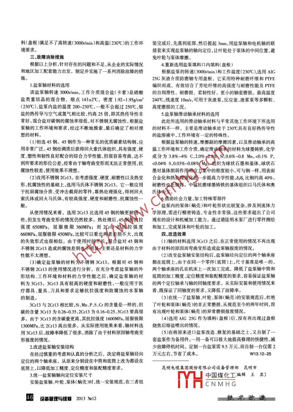 高溫熔鹽泵改造摘要對(duì)進(jìn)口PLCⅤ杋組所配備的高溫熔鹽泵運(yùn)行中岀現(xiàn)的問(wèn)題分析與改進(jìn),降低故障率和維修成本關(guān)鍵詞高溫熔鹽泵故障改造中圖分類(lèi)號(hào)TH122文獻(xiàn)標(biāo)識(shí)碼B概述(1)材料選用不當(dāng)。當(dāng)初在原裝的進(jìn)口鹽泵軸損壞后,沒(méi)有昆明電纜股份有限公司裝備線(xiàn)車(chē)間PLCⅤ鹽浴連硫機(jī)組對(duì)軸材料進(jìn)行金相組織分析,來(lái)確定軸的材料,由于材料選用不(英國(guó)制造)1987年引進(jìn),是目前生產(chǎn)大截面橡套類(lèi)電纜的主要當(dāng),造成軸頻繁變形損壞。設(shè)備。在生產(chǎn)過(guò)程中,產(chǎn)品在熔鹽漂浮中完成硫化工序,硫化過(guò)(2)鹽泵內(nèi)部結(jié)構(gòu)缺陷。鹽泵內(nèi)部由中筒、底筒、泵體(蝸程中不會(huì)造成擦傷、壓扁現(xiàn)象。尤其對(duì)于大截面(φ9omm,單芯殼)、葉輪、鹽泵軸、導(dǎo)鹽管、盤(pán)根座、滑動(dòng)軸承軸承底座等組成400mm2)更能顯示出優(yōu)越性,該機(jī)組的硫化傳熱介質(zhì)是混合鹽由于鹽泵軸徑向定位的兩個(gè)軸承座分別設(shè)計(jì)在中筒和底筒上(卡素),不含霉素,直接用加熱管加熱,其導(dǎo)熱效率是蒸汽的1造成安裝中筒底筒和鹽泵軸時(shí),對(duì)三者的同軸度要求非常高倍以上,用自控溫的電加熱,與傳統(tǒng)蒸汽連硫機(jī)組相比,具有節(jié)使三者的加工精度、定位精度和裝配精度要求都很高,任一環(huán)節(jié)能環(huán)保的特點(diǎn)而且鹽是可以多次反復(fù)利用的,可降低成本5%不到位,都極易造成鹽泵軸的彎曲變形而報(bào)廢,加上鹽泵軸屬于10%。PLCV機(jī)組采用4道密封,每生產(chǎn)一批產(chǎn)品,開(kāi)機(jī)、停機(jī)全細(xì)長(zhǎng)軸(1616mm),一般機(jī)床加工難度較大。過(guò)程僅需lm長(zhǎng)的校模線(xiàn)(蒸汽硫化最少需數(shù)10m),在長(zhǎng)時(shí)間2葉輪和泵體(蝸殼)損壞連續(xù)生產(chǎn)中,不會(huì)造成??诘南绕诹蚧F(xiàn)象,所生產(chǎn)的電纜表面葉輪和泵體(蝸殼)內(nèi)壁由于鹽液的沖刷被侵蝕,這屬于正光滑美觀常的消耗和磨損,但在損壞的葉輪和泵體中,有70%出現(xiàn)了摩該機(jī)是公司A類(lèi)關(guān)鍵設(shè)備之一,所生產(chǎn)的橡套類(lèi)產(chǎn)品的產(chǎn)擦的痕跡,隨著摩擦損壞的加劇,最終造成葉輪和泵體的報(bào)廢值占公司所有橡套類(lèi)產(chǎn)品總產(chǎn)值的60%以上。一旦鹽泵出現(xiàn)故通過(guò)觀察分析,原因主要是鹽泵軸上沒(méi)有軸向定位臺(tái)階,軸向安障,整條生產(chǎn)線(xiàn)將無(wú)法進(jìn)行生產(chǎn),嚴(yán)重影響生產(chǎn)的正常組織。由裝定位靠鹽泵軸與電機(jī)軸的聯(lián)軸套和電機(jī)的安裝間隙來(lái)實(shí)現(xiàn)于該機(jī)組生產(chǎn)線(xiàn)長(zhǎng),鹽泵出現(xiàn)故障,造成材料浪費(fèi)較大,會(huì)大大卻沒(méi)有形成統(tǒng)一的安裝規(guī)范,造成不同的工人安裝時(shí),鹽泵軸在增加生產(chǎn)成本,擠壓產(chǎn)品的利潤(rùn)空間,影響公司橡套類(lèi)產(chǎn)品的市豎直方向高度不一樣,從而使得安裝在鹽泵軸底端部的葉輪在場(chǎng)占有率。泵體(蝸殼)中的上下位置(間隙)不一樣,一旦往上或往下的間在2005年—2006年期間,鹽泵故障頻繁,共發(fā)生各類(lèi)故障隙過(guò)小,葉輪就會(huì)與泵體摩擦,造成葉輪和泵體的異常磨損而很13起,造成公司大量橡套類(lèi)產(chǎn)品不能按時(shí)交貨損失巨大。為了從快報(bào)廢。根本解決問(wèn)題,根據(jù)鹽泵的特殊工作環(huán)境及要求,進(jìn)行結(jié)構(gòu)改造。3熔鹽從鹽泵上蓋填料口噴出二、鹽泵故障分析高溫的熔鹽在鹽泵的運(yùn)行過(guò)程中,突然從上蓋填料口噴出1鹽泵軸彎曲變形造成停機(jī)。將鹽泵拆開(kāi)后發(fā)現(xiàn),填料口處的填料(盤(pán)根)已嚴(yán)重?zé)S彎曲變形是鹽泵主要故障形式,原因如下焦,在反復(fù)出現(xiàn)幾次類(lèi)似的故障后,確定原因是所選用的石墨填磨性,表面鑄膠又可以起到緩沖托輥的作用;②托輥的特種結(jié)構(gòu)上,膠帶的使用壽命由原來(lái)的8個(gè)月左右提高到10個(gè)月左右既可以防止物料拋灑,又可以起到調(diào)節(jié)皮帶方向、防止皮帶跑偏每年可節(jié)約備件資金91萬(wàn)元。避免了支架變形現(xiàn)象的發(fā)生;減的調(diào)偏作用;③緩沖托輥軸承座的安裝固定方式增加了托輥的少了托輥的更換頻率,降低了工人的勞動(dòng)強(qiáng)度;杜絕了皮帶的跑強(qiáng)度與穩(wěn)定性,即使有大塊物料砸到托輥上,也不會(huì)由于振動(dòng)強(qiáng)偏現(xiàn)象減少了膠帶磨損,防止了物料的拋灑,改善了作業(yè)環(huán)境烈而將托輥振脫于卡槽外;④托輥軸釆用小滾筒的軸承增強(qiáng)了降低了備件消耗;保證了堆取料機(jī)的穩(wěn)定順行。另外,研制的整托輥的強(qiáng)度,避免了托輥軸的變形;⑤緩沖托輥不但具有滾筒的體熱硫化工藝強(qiáng)力調(diào)偏緩沖托輥,既有托輥功能又有滾筒功能高強(qiáng)度與耐磨性,還具有托輥的調(diào)偏、防止物料拋灑的特點(diǎn)。不但在堆取料機(jī)下料斗有推廣價(jià)值,在所有落料量大,沖擊量大改造效果的料斗都能應(yīng)用,可以代替皮帶機(jī)緩沖床。W13.12-242011年1月份,利用堆取料機(jī)停車(chē)檢修的機(jī)會(huì),將強(qiáng)力調(diào)偏緩沖托輥在
