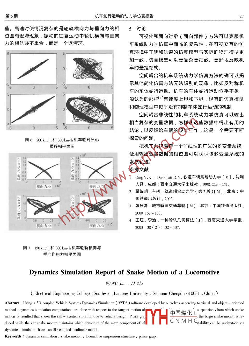 第23卷第6期鐵道機(jī)車車輛2003年12月railWaYLOCOMOtiVE carDec文章編號(hào):1008-7842(2003)06-0024-04機(jī)車蛇行運(yùn)動(dòng)的動(dòng)力學(xué)仿真報(bào)告王玨,李治西南交通大學(xué)電氣工程學(xué)院,四川成都610031)摘要應(yīng)用全三維空間耦合的機(jī)車系統(tǒng)動(dòng)力學(xué)仿真軟件,對(duì)反對(duì)稱懸掛結(jié)構(gòu)機(jī)車的直線運(yùn)動(dòng)進(jìn)行了動(dòng)力學(xué)仿真,揭示了由機(jī)車設(shè)計(jì)帶來的機(jī)車自激振動(dòng)。仿真結(jié)果的相平面圖表明機(jī)車的轉(zhuǎn)向架蛇行運(yùn)動(dòng)得到有效抑制,而車體蛇行運(yùn)動(dòng)未能得到很好抑制,是其自激振動(dòng)的主要原因。因此,基于機(jī)車的空間耦合非線性模型,動(dòng)力學(xué)仿真可以深入研究機(jī)車的非線性穩(wěn)定性。關(guān)鍵詞動(dòng)力學(xué)仿真,蛇行運(yùn)動(dòng),機(jī)車懸掛結(jié)構(gòu),相平面圖圖分類號(hào):U260.11·2文獻(xiàn)標(biāo)志碼:A前言機(jī)車模型和輪軌模型1一種方法是在小位移的前提鐵道機(jī)車的性能受到兩個(gè)基本問題的限制1,軌下得到線性化的多自由度動(dòng)力學(xué)運(yùn)動(dòng)方程,使用特征道線路不平順輸入引起的不穩(wěn)定性和車輛設(shè)計(jì)帶來的值和特征矢量方法判斷線性系統(tǒng)的失穩(wěn),從而得到蛇自激不穩(wěn)定性。線路不平順乃至軌道子系統(tǒng)的動(dòng)力學(xué)行失穩(wěn)旳臨界速度。另外,動(dòng)力學(xué)仿真旳通常方法是性能無疑是非常重要的影響因數(shù),在鐵道機(jī)車系統(tǒng)動(dòng)依靠包含部分非線性特性的多自由度動(dòng)力學(xué)運(yùn)動(dòng)方程力學(xué)仿真中已經(jīng)得到相當(dāng)細(xì)化研究2)但是,由于機(jī)給予輪對(duì)5mm的橫向擾動(dòng),觀察車輛的時(shí)域響應(yīng),多車系統(tǒng)和輪軌接觸的復(fù)雜性而對(duì)杋車模型和輪軌模型次實(shí)驗(yàn)搜尋蛇行失穩(wěn)的臨界速度。的簡(jiǎn)化,使得動(dòng)力學(xué)仿真計(jì)算大多依賴外部輸入擾動(dòng),由于機(jī)車的復(fù)雜性,上述機(jī)車模型基本上是全對(duì)常常不能很好地揭示機(jī)車設(shè)計(jì)帶來的自激不穩(wěn)定性。稱旳,未能反映通常機(jī)車旳反對(duì)稱結(jié)構(gòu),后面將說明然而,工程實(shí)踐指岀鐵道杋車有一種自激蛇行運(yùn)動(dòng),這對(duì)機(jī)車的蛇行運(yùn)動(dòng)非常關(guān)鍵。特征值和特征矢量方可以肯定其產(chǎn)生原因不是線路不平順3。本文報(bào)告了法可以判斷蛇行失穩(wěn)的臨界速度,但是無法知道失穩(wěn)對(duì)某型機(jī)車直線運(yùn)動(dòng)的動(dòng)力學(xué)仿真結(jié)果,應(yīng)用現(xiàn)代計(jì)后機(jī)車蛇行運(yùn)動(dòng)的發(fā)展情況,機(jī)車的阻尼系統(tǒng)和非線算機(jī)技術(shù)的可視化方法和面向?qū)ο蠓椒朔藱C(jī)車系性的輪軌接觸可以在一定程度抑制蛇行運(yùn)動(dòng)的發(fā)展統(tǒng)和輪軌接觸旳復(fù)雜性,對(duì)杋車模型和輪軌模型進(jìn)行因此該方法會(huì)過于保守。同時(shí)全對(duì)稱的機(jī)車模型無法了細(xì)化,在沒有線路不平順輸入而只是機(jī)車懸掛結(jié)構(gòu)揭示業(yè)已存在的機(jī)車的蛇行運(yùn)動(dòng),該方法又過于遲鈍。是反對(duì)稱的情況下,觀察到機(jī)車的自激蛇行運(yùn)動(dòng)。仿全對(duì)稱機(jī)車模型的動(dòng)力學(xué)仿真也存在同樣的缺點(diǎn),而真結(jié)果的相平面圖表明杋車的轉(zhuǎn)向架蛇行運(yùn)動(dòng)得到有且由于車體的巨大慣性,5mm的橫向階躍擾動(dòng)通常不效抑制,而車體蛇行運(yùn)動(dòng)未能得到很好抑制,是其不能激起全對(duì)稱機(jī)車模型的車體蛇行運(yùn)動(dòng)。穩(wěn)定的主要原因。因此,基于機(jī)車的空間耦合非線性機(jī)車通常是反對(duì)稱結(jié)構(gòu)的,我們的初步仿真結(jié)果模型,動(dòng)力學(xué)仿真可以深λ研究機(jī)車的非線性穩(wěn)定性。顯示杋車蛇行運(yùn)動(dòng)在50~300kmh的速度范圍都存在2機(jī)車蛇行運(yùn)動(dòng)抗蛇行運(yùn)動(dòng)減振器可以有效抑制轉(zhuǎn)向架蛇行運(yùn)動(dòng),但機(jī)車的蛇行運(yùn)動(dòng)現(xiàn)象表現(xiàn)為在直線軌道上輪對(duì)沿是單節(jié)機(jī)車滑行在剛性的軌面上似乎不存在抑制車體類似正弦軌跡前進(jìn),轉(zhuǎn)向架和車體伴有橫移和搖頭運(yùn)蛇行運(yùn)動(dòng)的機(jī)制。動(dòng)。機(jī)車的蛇行可以分為兩種型式,即車體蛇行和轉(zhuǎn)3可視化和面向?qū)ο蟮姆抡婺P拖蚣苌咝?也稱一次蛇行和二次蛇行。劇烈的蛇行運(yùn)圖1是仿真模型的一個(gè)局部快照,三維可視化和動(dòng)對(duì)于機(jī)車的穩(wěn)定性和平穩(wěn)性是十分不利的,當(dāng)它發(fā)面向?qū)ο?面向部件)的仿真環(huán)境有利于用戶直觀方展到依靠輪緣接觸來限制時(shí),會(huì)加劇機(jī)車部件和軌道便地添中國(guó)煤化工數(shù),仿真模型部件以的磨損和破壞。因此避免和減輕機(jī)車的蛇行運(yùn)動(dòng)是機(jī)及模型目CNMHG輛更加一致。面向?qū)囋O(shè)計(jì)的重要任務(wù)之象(面向部件)的方法,較之于面向系統(tǒng)(面向方程)對(duì)機(jī)車蛇行運(yùn)動(dòng)的研究基本上使用的是線性化的的方法和面向變量(鍵合圖)的方法,在機(jī)車系統(tǒng)動(dòng)