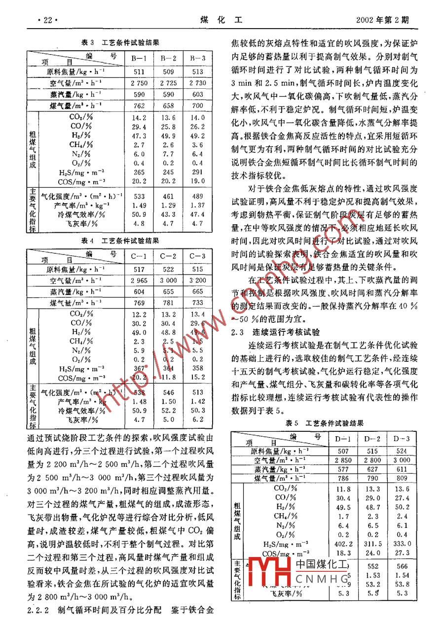 第2期(總第99期)煤化工No. 2(Total No 99)2002年4月Coal Chemical IndustryApr.2002鐵合金焦氣化制合成氣門長(zhǎng)貴1黃曄2胡斌2(1.西北化工研究院,710600;2.陜西榆林天然氣化工有限責(zé)任公司,719000)摘要本文介紹了鐵合金焦固定床間歌氣化制取合成氣的生產(chǎn)技術(shù),針對(duì)鐵合金焦的特性,采用特殊的制氣工藝條件和操作條件在工業(yè)生產(chǎn)裝置上試燒取得了良好的結(jié)果,表明鐵合金焦完全可以作為合成氣生產(chǎn)的原料關(guān)鍵詞鐵合金焦氣化合成氣文章編號(hào):1005-9598(2002)02-0020-04中圖分類號(hào):TQ54文獻(xiàn)標(biāo)識(shí)碼:A該公司共同合作進(jìn)行了鐵合金焦的工業(yè)試燒試驗(yàn),引言以探索鐵合金焦氣化制取合成甲醇原料氣的可行神府煤田是榆林地區(qū)儲(chǔ)量豐富開采方便的大型性制氣工藝條件操作控制參數(shù)及技術(shù)經(jīng)濟(jì)指標(biāo)為煤田,其煤質(zhì)以老年褐煤或年輕長(zhǎng)焰煤為主。然而該大型工業(yè)生產(chǎn)裝置的設(shè)計(jì)和操作提供可靠幕的依據(jù)。地區(qū)卻不產(chǎn)無煙煤,一些以煤為原料生產(chǎn)合成氨甲1鐵合金焦焦質(zhì)特點(diǎn)醇的廠家只能舍近求遠(yuǎn),從外地購(gòu)買高價(jià)無煙煤作原料,在目前當(dāng)?shù)罔F路運(yùn)輸十分不方便的情況下,造成鐵合金焦的焦質(zhì)分析見表1這些企業(yè)生產(chǎn)成本增加,經(jīng)濟(jì)效益下降。近年來,榆林表1鐵合金焦焦質(zhì)分析結(jié)果地區(qū)為了充分利用當(dāng)?shù)刎S富的煤炭資源,每年生產(chǎn)近焦鐵合金焦500萬t鐵合金焦。這種焦炭由于其理化性能特殊3焦質(zhì)較差,一直未能得到合理的利用,在當(dāng)?shù)厥蹆r(jià)非工業(yè)分析/質(zhì)量分?jǐn)?shù)%I1.628.59常低廉,僅作為燃料使用,浪費(fèi)了寶貴的資源。鐵合金焦(又名藍(lán)炭)是利用當(dāng)?shù)刈冑|(zhì)程度較淺的煙煤經(jīng)中溫脫揮發(fā)分處理的一種質(zhì)量較差的焦炭,。元素分析/質(zhì)量分?jǐn)?shù)%4.10與冶金焦和無煙煤相比,這種焦炭揮發(fā)分高,機(jī)械強(qiáng)0.920.20度和熱穩(wěn)定性差,灰熔點(diǎn)溫度低。因此,用作固定床間歇?dú)饣癄t的原料,必須采用特殊的制氣工藝條件和操灰熔點(diǎn)/CI070l090作控制手段才能滿足合成氣生產(chǎn)的制氣要求。發(fā)熱量/·g28560陜西榆林天然氣化工有限責(zé)任公司,是一座以抗破碎強(qiáng)度/%76.54天然氣為原料的合成甲醇廠,由于天然氣價(jià)格的調(diào)穩(wěn)定性/%800C整和生產(chǎn)裝置的擴(kuò)建,該公司從長(zhǎng)遠(yuǎn)的經(jīng)濟(jì)利益和學(xué)反應(yīng)活性(a值)/%37.0當(dāng)?shù)氐馁Y源優(yōu)勢(shì)出發(fā),擬采用固定床氣化技術(shù),以本1000℃地豐富的低價(jià)鐵合金焦為原料生產(chǎn)合成甲醇原料氣。利用鐵合金焦作固定床氣化的原料生產(chǎn)水煤氣15.4TiO,0.08尚未有先例和經(jīng)驗(yàn)可借鑒,為此西北化工研究院和灰組成/%中國(guó)煤化工收稿日期:2001-10-186.98作者簡(jiǎn)介:門長(zhǎng)貴,男,1954年6月出生,1978年畢業(yè)于華東CNMHG3.85U I m/s理工大學(xué)煤化工專業(yè),高級(jí)工程師?,F(xiàn)任西北化工研究院煤結(jié)渣性/%0.2m/s氣化研究所所長(zhǎng)。多年來一直從事煤氣化技術(shù)的開發(fā)研究工0.3m/s作,有多項(xiàng)煤氣化技術(shù)成果。2002年A月門長(zhǎng)貴等:鐵合金焦氣化制合成氣試燒焦樣的粒度分布如下:解決的關(guān)鍵技術(shù)問題,也是解決鐵合金焦能否作為粒度/mm>75<25固定床氣化的原料在工業(yè)生產(chǎn)過程中長(zhǎng)期、穩(wěn)定、連重量分布/%850.5續(xù)、經(jīng)濟(jì)運(yùn)行的關(guān)鍵所在焦質(zhì)分析的結(jié)果表明:鐵合金焦質(zhì)量較差,其理化特性是,揮發(fā)分含量高,灰熔點(diǎn)溫度低,抗破碎機(jī)2鐵合金焦氣化試驗(yàn)械強(qiáng)度和熱穩(wěn)定性差,反應(yīng)活性較高這種焦炭的特點(diǎn)決定了它用于常壓固定床間歇?dú)饣?無法沿用常鐵合金焦氣化試驗(yàn)是在西北化工研究院固定床規(guī)的制氣工藝條件和操作控制手段,如何穩(wěn)定爐況,氣化小型工業(yè)生產(chǎn)裝置上進(jìn)行的。生產(chǎn)裝置的氣化提高氣化強(qiáng)度,保證合格的煤氣組分是試燒中需要工藝流程示于圖1。樓料汽包氣化爐塔冷卻水洗氣箱圖1鐵合金焦試燒裝置工藝流程示意圖試燒采用固定床常壓間歇?dú)饣扑簹?制氣為了探求鐵合金焦的較佳制氣工藝條件,對(duì)鐵過程分為:空氣鼓風(fēng)蓄熱、蒸汽吹凈、蒸汽上吹制氣合金焦分別進(jìn)行了不同制氣工藝條件的對(duì)比試驗(yàn),和下吹制氣、二次上吹制氣五個(gè)過程整個(gè)制氣過程試驗(yàn)結(jié)果見表2、表3和表4。是利用自動(dòng)機(jī)控制。原料焦由自動(dòng)分布加料器定時(shí)表2工藝條件試驗(yàn)結(jié)果供給。吹風(fēng)氣經(jīng)煙囪排放,粗煤氣經(jīng)除塵,兩級(jí)洗滌A-1A-2A-3后送到400m3緩沖氣柜,由緩沖氣柜穩(wěn)壓、穩(wěn)流、計(jì)原料焦量/kg:h-1量,連續(xù)經(jīng)過焦炭過濾器,電捕焦油器,脫除焦油,再空氣量/m3h4752430由加壓風(fēng)機(jī)升壓,經(jīng)活性炭脫硫后送到儲(chǔ)氣柜。紫汽量/kg:h整個(gè)試燒過程分為三個(gè)階段:預(yù)試燒;制氣工藝煤氣量/m3·h-1條件優(yōu)化試驗(yàn);連續(xù)運(yùn)行考核試驗(yàn)。CO2/%12.612.213.4CO/%預(yù)試燒粗l2/%