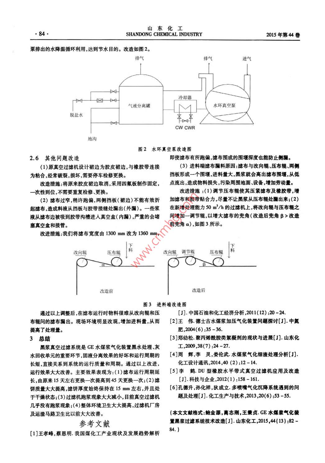 山東化工82·SHANDONG CHEMICAL INDUSTRY2015年第44卷CE水煤漿氣化裝置黑漿過濾系統(tǒng)技術(shù)改造鮑金源,高志剛,王秉貞(神華包頭煤化工有限責(zé)任公司,內(nèi)蒙古包頭014010)摘要:文章針對大型水煤漿氣化帶來的黑漿真空過濾系統(tǒng)問題,詳細(xì)分析,通過采取相應(yīng)技術(shù)改造、優(yōu)化操作方式,效果良好關(guān)鍵詞:黑漿;過濾;改造中圖分類號:TQ51文獻(xiàn)標(biāo)識碼:B文章編號:1008-021X(2015)13-0082-03GE Water Coal Slurry Gasification Plant Black Slurry Filtration TechnologyTransformation SystemBao Jinyuan, Gao Zhigang, Wang BingzhenShenhua Baotou Coal Chemical Co, Ltd, Baotou 014010, China)Abstract: A detailed analysis of the black slurry vacuum filtration system, aiming at the large coal water slurry gasificationthrough the corresponding technical transformation, operation optimization, the effect is gooKey words: black slurry; vacuum filtration; technical transformation我國能源結(jié)構(gòu)的特點是富煤少油貧氣,發(fā)展煤化工事統(tǒng)經(jīng)過四級閃蒸降溫濃縮后在靜態(tài)混合器中與絮凝劑業(yè),以煤為原料生產(chǎn)各類化工產(chǎn)品,是非石油路線生產(chǎn)替代混合后進(jìn)入沉降槽,上層較清灰水溢流至灰水槽返回系統(tǒng)循石油產(chǎn)品的一個有效途徑。煤氣化技術(shù)作為煤化工生產(chǎn)的環(huán)利用。黑水中的顆粒(黑漿)沉降至底部,通過泵送至真空龍頭裝置,其安、穩(wěn)、長滿優(yōu)運行是煤化工發(fā)展的基柱。GE過濾系統(tǒng)濾餅(細(xì)渣)外送至渣場,分離出的較干凈的水返水煤漿氣化是國內(nèi)工業(yè)化較為成熟的煤氣化技術(shù)之一,該氣回系統(tǒng)循環(huán)利用。化技術(shù)在近年的運行實踐中積累了豐富的經(jīng)驗和教訓(xùn)2。1.2真空過濾機構(gòu)造但隨著生產(chǎn)規(guī)模的不斷擴大,大規(guī)模CE水煤漿氣化又帶來黑漿真空過濾機是一種固液分離設(shè)備,在氣化裝置中了另一些突出問題。在國內(nèi)某大型煤制烯烴項目中煤氣化用來處理澄降槽底部排出的含固5%-20%的黑水,是渣水裝置設(shè)計5開2備共7臺CE氣化爐,單爐投煤量為1500v處理的關(guān)鍵設(shè)備。d。高負(fù)荷運行的同時黑漿過濾處理系統(tǒng)成為了CE水煤漿DU型橡膠水平帶式真空過濾機3)由主機管路系統(tǒng)和氣化運行穩(wěn)定的關(guān)鍵因素之一。該裝置在運行初期數(shù)次因電控系統(tǒng)組成。其中過濾機主機由機架組件濾布糾偏裝黑漿過濾系統(tǒng)故障致使處理不掉黑漿排人研磨水池經(jīng)過置壓布輥、布料裝置、立輥隔板裝置真空裝置濾布洗滌靜止沉降后送入黑水沉降槽如此形成惡性循環(huán),導(dǎo)致沉降再生裝置橡膠帶、濾布、驅(qū)動輥組件、從動輥組件、驅(qū)動裝槽攪拌器扭矩過大,聯(lián)軸節(jié)螺栓斷裂嚴(yán)重制約滿負(fù)荷運行。置、濾餅淋洗裝置濾布張緊裝置卸料裝置各類托輥、排氣1黑漿真空過濾系統(tǒng)簡介罩、氣水分離器等組成,主要用碳鋼或不銹鋼、SBR橡膠、聚1.1流程簡介丙稀和超高分子量聚乙烯等各類材料制造,并采取相應(yīng)的防CE水煤漿氣化將氣化爐黑水和洗滌塔黑水排至閃蒸系腐措施。各主要零部件位置示意圖見圖1。加料裝置洗液槽卸料輥從動輥驅(qū)動輥真空箱C.一百0)a刮刀沖洗管托輥張緊輥糾偏輥過濾帶改向輻圖1真空過濾機結(jié)構(gòu)圖收稿日期:2015-04-26作者簡介:鮑金源(1988-),安徽廬江人,助理工程師,主要從事水煤漿氣化技術(shù)。第13期鮑金源等:CE水煤漿氣化裝置黑漿過濾系統(tǒng)技術(shù)改造83·2存在問題及技術(shù)改造實際處理量只有15m3/h,實際生產(chǎn)中每個系列產(chǎn)生約122.1處理能力不足m3/h黑漿,共60m3/h,黑漿中含固量20%左右。裝置原設(shè)計3臺真空過濾機2開1備,單臺有效過濾面國內(nèi)同類型氣化裝置真空過濾機使用情況見表1。積25m3,有效過濾寬度1300mm,最大處理黑水35m3/h,但表1國內(nèi)同類型氣化裝置真空過濾機使用情況表煤種灰有效過濾設(shè)計處理能力實際處理量廠家滿負(fù)荷/(m3/h)過濾機臺數(shù)含量%面積/m3(m3/h)(m3/b)氣化爐負(fù)荷/過濾機能力浩良河化肥廠31*21開1備31225=1:0.4中石化南化65.71開1備滿足生產(chǎn)65.7/13.8=1:0.21新奧10-131開1備滿足生產(chǎn)86x236=1:0.21久泰2開1備82×3/(25×2)=1:0.2伊泰181開1備滿足生產(chǎn)55x2/16=1:0.145本裝置原設(shè)計85*5開1備85×5/(15×2)=1:0.07新2舊開本裝置新增后85·51新1舊備50+15*285·5/50+15·2)=1:0.189改進(jìn)措施新增2臺處理能力在50m3/h的過濾機新機附著在過濾機濾布的孔隙中,油污在濾布空隙上形成油過濾機投人運行后,采取1新2舊運行1新1舊備用沉降過膜堵塞濾孔,降低水的通過性影響濾布的再生。濾系統(tǒng)恢復(fù)正常。綜合各家運行數(shù)據(jù)可以看出GE水煤漿氣改進(jìn)措施將真空過濾機產(chǎn)生的濾液輸送到沉降槽,減化裝置黑漿過濾系統(tǒng)能力配置在氣化負(fù)荷:過濾能力=1:少磨機給水槽的進(jìn)水量,研磨水池水全部輸送到磨機給水02左右較為合適。槽,不再送往沉降槽。2.2濾布使用壽命短2.3濾布跑偏打皺(1)濾布沖洗不干凈,將網(wǎng)眼堵塞,造成過濾效果降低。濾布在真空過濾機運行過程中跑偏是很難避免的,這是濾布吸水性逐漸變差濾餅厚度漸薄,到使用后期只有幾毫由于濾帶難免有松緊、長短之時,各轉(zhuǎn)向輥存在平行誤差等米還存在帶水現(xiàn)象,在使用