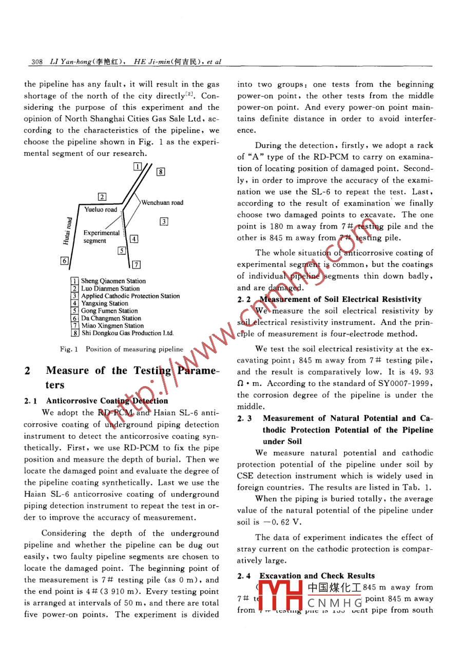 Journal of Shanghai Jiaotong University(Science), Vol E-10, No 3, 2005, 307-310Article ID:1007-1172(2005)03-0307-04Experimental Study of Surface Detection ofGas Pipeline buried in SoilLI Yan-hng2(李艷紅),HEJi-min(何吉民),LI Zhi-peng2(李志鵬), ZHANG Yong-gang2(張永剛), FENG Bao-he2(馮寶鶴)(1. School of Mechanical Eng, Shanghai Jiaotong Univ, Shanghai 200030, China;2. North Shanghai Gas Co. Ltd, Shanghai 200001)Abstract: Pipeline is a key segment in the transportation of city gas and its safety affects the safety of industrialand domestic application. The characteristics of Shi Dongkou east gas steel pipeline buried in soil were discussedand its parameters related to safety were measured, including the state of anticorrosive layer, the soil resistivitythe natural potential and the protective potential of gas pipeline. The experimental results were confirmed byvating, which are of value to the knowledge of the gas pipeline buried in soil in Shanghai. The experimental datawere analyzed which provide the scientific basis for the assurance of the gas pipeline safety and the reparation of aticorrosivelayerKey words: steel pipeline cathodic protection; experimental studyDocument code: AIntroductionthe pipelines inevitably come up against miscellaneous corrosion currents produced by stray allGas pipelines buried in soil are necessary in sorts of electrical currents and high-voltage electri-transport process of city gas. Whether it is safe or cal field All of these factors affect safe operationnot is related to the safety of tens of thousands do- of underground pipeline seriously, so it is neces-mestic customers in life and the industrial cus- sary to have the good understanding about operatomers in worktional situation of the pipelineBecause of the high-speed development of theThe results of the experiment in this papergas business in Shanghai, the gas users are ebring us further understanding about the circum-panded from hundreds of thousands in several mil- stance of gas steel-pipeline buried in soil in Shangions, and the gas pipeline is also developed from hai region, and provide scientific warrant to repairingot tube into steel pipe. The underground steel- the erosion resistant coating of pipeline and ensurepipelines will bring into all kinds of corrosions in safe operation of the pipelineoperation. Because of different locations, groundtemperature and oxygen contents, the surface of 1 Choice of Experimental pipelinepipelines willappear various degrees corrosionThe east pipeline leaving the factory of Shin Shanghai, the underground soil salinity, the Dongkou Gas Production Ltd. lay along Wenchuanhigh underground water level the high tempera- Road and pass Sheng Qiaomen Station, Yangxingture when leaving factory in gas transport processStation and Gong Fumen Station to Miao Xingmenand etc, will result in the electrochemical corrosion Station, totally 16 km long (see Fig. 1, and mainin macro and the chemical corrosion in microscopic ly is used for supplying gas to the residents whoview. In addition, in the long distance transpordiffic中國煤化工 Most pipeline aremanaged, becauseReceived date: 2004-03-25CNMH G Changjiang riverE-mail:liyh@sjtu.edu.cnwhere covered with lakes and rivers densely. Once308 LI Yan-hong(李艷紅),HEJ-min(何吉民),ealthe pipeline has any fault, it will result in the gas into two groups one tests from the beginningshortage of the north of the city directly 2 Con- power-on point, the other tests from the middleidering the purpose of this experiment and the power-on point And every power-on point mainopinion of North Shanghai Cities Gas Sale Ltd, ac- tains definite distance in order to avoid interfecording to the characteristics of the pipeline, weencechoose the pipeline shown in Fig. 1 as the experiDuring the detection, firstly, we adopt a rackmental segment of our researchof“A” type of the RD-PCM to carry on examination of locating position of damaged point. Second-nation we use the SL-6 to repeat the test. LastWenchuan roadaccording to the result of examination we finallyYueluo roadchoose two damaged points to excavate. The onepoint is 180 m away from 7 testing pile and theExperimentalother is 845 m away from 7# testing pileThe whole situation of anticorrosive coating ofexperimental segment is common, but the coatingsof individual pipeline segments thin down badlyand are damagedApplied Cathodic Protection Station2. 2 Measurement of Soil Electrical ResistivityWe measure the soil electrical resistivity bysoil electrical resistivity instrument. And the prin-8]Shi Dongkou Gas Production Ltd.ciple of measurement is four-electrode methodFig. 1 Position of measuring pipelinee test the soil electrical resistivity at the ex-cavating point: 845 m away from 7# testing pile2 Measure of the Testing Parame- and the result is comparatively low. It is 49.93tersn.m. According to the standard of syoo07-1999the corrosion degree of the pipeline is under the2.1 Anticorrosive Coating DetectionWe adopt the RD-PCM and Haian SL-6 anti- middle2. 3 Measurement of Natural Potential and Cacorrosive coating of underground piping detectionthodic Protection Potential of the Pipelineinstrument to detect the anticorrosive coating syn-nder solthetically. First, we use rd-PCM to fix the pipeWe measure natural potential and cathodicposition and measure the depth of burial. Then welocate the damaged point and evaluate the degree of protection potential of the pipeline under soil byCse detection instrument which is widely used inthe pipeline coating synthetically. Last we use the foreign countries. The results are listed in Tab. 1Haian SL-6 anticorrosive coating of undergroundpiping detection instrument to repeat the test in orWhen the piping is buried totally, the averagevalue of the natural potential of the pipeline underder to improve the accuracy of measurementsoil is -0.62 VConsidering the depth of the undergroundThe data of experiment indicates the effect ofpipeline and whether