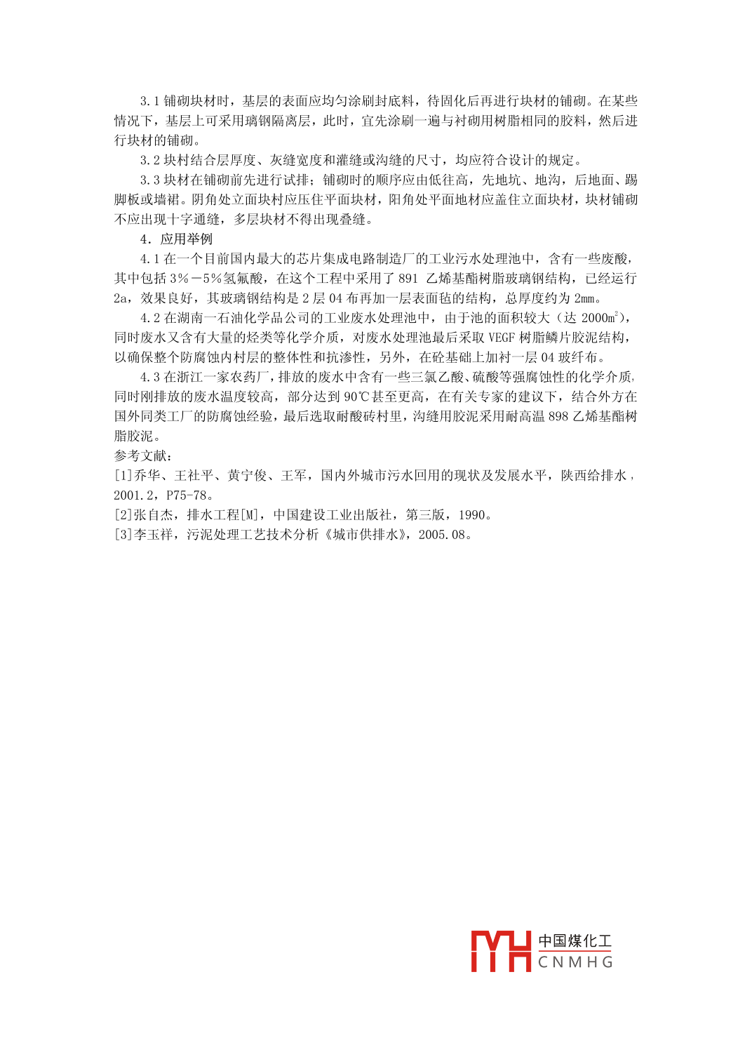 工業(yè)污水處理的理論探討景欣昕吉林省興環(huán)環(huán)境技術(shù)服務(wù)有限公司吉林長春130000摘要:就常見的工業(yè)污水處理池的防腐蝕技術(shù)進行了總結(jié)和探討,其中對玻璃鋼材里工藝的樹脂材料的選擇進行了討論,結(jié)合目前防腐蝕技術(shù)的發(fā)展,推薦了一種 新型材料玻璃鱗片膠泥。關(guān)鍵詞:工業(yè);污水處理;水池防腐蝕;玻璃鱗片膠泥;玻璃鋼Abstract: Common industrial anti-corrosion technology for sewage treatment pond were summarized and discussed,which discussed the choice of glass steel process resin material, combined with the development of anti-corrosiontechnology, recommended a new material -glass flake clay.Key words: industrial; sewage treatment; pool against corrosion; glass flake clay; FRP中圖分類號: U64 9+2文獻標識碼: A隨著國民經(jīng)濟的迅速發(fā)展,大量新的工廠、冶煉廠礦得以投產(chǎn)運行。由于工藝原因,會產(chǎn)生大量的工業(yè)污水和廢水,原來相當(dāng)數(shù)量的廠礦企業(yè)會直接向自然界排放,而這些未經(jīng)處理的工業(yè)污水或廢水均含有大量的腐蝕性或有害性化學(xué)物質(zhì),不僅污染了自然環(huán)境,同時對人類自身健康產(chǎn)生了巨大的威脅,嚴重影響了可持續(xù)發(fā)展進程。這些企業(yè)中有許多大型鋼筋混凝土污(廢)水池,- .般均建在室外,這些行業(yè)的工業(yè)污(廢)水均含有腐蝕性的化學(xué)介質(zhì),而鋼筋混凝土結(jié)構(gòu)要經(jīng)受住各種物理和化學(xué)的侵蝕,在設(shè)計時就要考慮對它采取防腐蝕處理措施,以確保其使用的耐久性。根據(jù)我們對各類污(廢)水池多年積累的實踐經(jīng)驗,將各種防腐蝕處理方法進行了總結(jié),并介紹了一些新型的防腐蝕材料。1.玻璃鋼襯里的施工制作它是玻璃纖維增強塑料(俗稱“玻璃鋼”或“FRP")在混凝土表面形成的村里防護層,.具有整體性、抗?jié)B性好和造價合理的特點。在該工藝中,采用玻璃纖維與玻璃纖維短切氈或表面氈的復(fù)合結(jié)構(gòu),只要防腐蝕樹脂選用適當(dāng),襯里厚度在l-3mm之間就能夠達到良好的防腐蝕效果。l. l樹脂的選擇。在混凝土面上施工,要求樹脂的收縮率不能太大,否則可能會導(dǎo)致玻璃鋼村里“脫殼”,而引起防腐蝕失效。因此,業(yè)主和施工隊均會選用環(huán)氧樹脂,因為環(huán)氧樹脂具有來源廣、成本合理、耐腐蝕性能良好、收縮率低等特點。但環(huán)氧樹脂本身也有其一定的使用局限性。①環(huán)氧樹脂的固化可采用酸酥類或胺類固化體系。酸酐類固化劑需要中高溫的固化條件。而--般防腐蝕施工均采用在室溫或常溫下固化的胺類固化劑,其原理是利用胺基團上的活潑氫與環(huán)氧基反應(yīng)而交聯(lián)形成三維網(wǎng)狀結(jié)構(gòu),但這個交聯(lián)結(jié)構(gòu)很容易在酸性介質(zhì)作用下分解,導(dǎo)致三維交聯(lián)結(jié)構(gòu)的解體而引起防腐蝕襯里的失效。因此,胺類固化的環(huán)氧樹脂在大于40°C或者更高溫度下的耐酸性就不太理想,室溫下胺類固化的環(huán)氧樹脂的熱變形溫度(HDT)在60-70°C之間,故推薦使用溫度不能超過70°C。②胺類固化環(huán)氧樹脂的養(yǎng)護周期較長,且低分子胺類固化劑(如乙二胺)的毒性較大,因此,要采用毒性較小的固化劑,如T31等。③工程中采用的6101 (E-44) 環(huán)氧樹脂的粘度較大,不能直接操作,為了降低樹脂粘度,應(yīng)加入適當(dāng)比例的稀釋劑來降粘,活性稀釋劑( 如低分子的環(huán)氧化合物)成本相當(dāng)高,一般不采用。 而通常采用的非活性稀釋劑,如丙酮等并不參加環(huán)氧樹脂的固化反應(yīng),丙酮極易揮發(fā),造成固化物的不致密,此類環(huán)氧樹脂的抗?jié)B性相對較差,尤其是含有氫氟酸等工業(yè)污(廢) 水等強腐蝕性化學(xué)介質(zhì),由于其較小的分子體和.空易發(fā)生分子水平中國煤化工上的擴散或溶脹,環(huán)氧樹脂的耐氫氨酸的效果較差。YHCNMH G針對上述環(huán)氧樹脂存在的不足,人們成功開發(fā)了環(huán)氧乙烯基酯樹脂。環(huán)氧乙烯基酯樹脂是由環(huán)氧樹脂與甲基丙烯酸通過開環(huán)加成化學(xué)反應(yīng)而制得,它保留了環(huán)氧樹脂的基本鏈段,又有不飽和聚酯樹脂的良好工藝性能,它既能在室溫條件下固化,又具有良好的工藝性和耐腐蝕性。目前,一種特種不飽和聚酯樹脂-高性能的芳烴型樹脂(902) 使用比較普遍,它含有較多的苯環(huán)結(jié)構(gòu),對硫酸和硝酸的耐腐蝕性能尤為突出,902樹脂與環(huán)氧樹脂相比,綜合應(yīng)用成本降低了1 / 3左右。1.2施工過程及要點。①封底層:在經(jīng)過處理的基層表面,均勻地涂刷封底料,不得有漏涂、流掛等缺陷,自然固化不宜少于24 h。②修補層:在基層的凹陷不平處,應(yīng)采用樹脂膠泥料修補填平,自然困化不宜少于24 h,用樹脂膠泥料修補刮平基層。③連續(xù)法樹脂玻璃鋼鋪村層的施工,應(yīng)符合下列規(guī)定: a. 玻璃纖維布應(yīng)剪邊,絳綸布應(yīng)進行防收縮的預(yù)處理。b.先均勻涂刷一層鋪襯膠料,隨即村上一-層纖維增強材料,必須貼實,其上再涂- -層膠料,再襯上一層纖維增強材料,連續(xù)鋪村時,上下兩層纖維增強材料的接縫應(yīng)錯開,錯開距離不得小于50mm,陰陽角處應(yīng)增加一到二層纖維增強材料。c.平面一-次連續(xù)鋪襯層數(shù)或厚度,以不應(yīng)產(chǎn)生滑