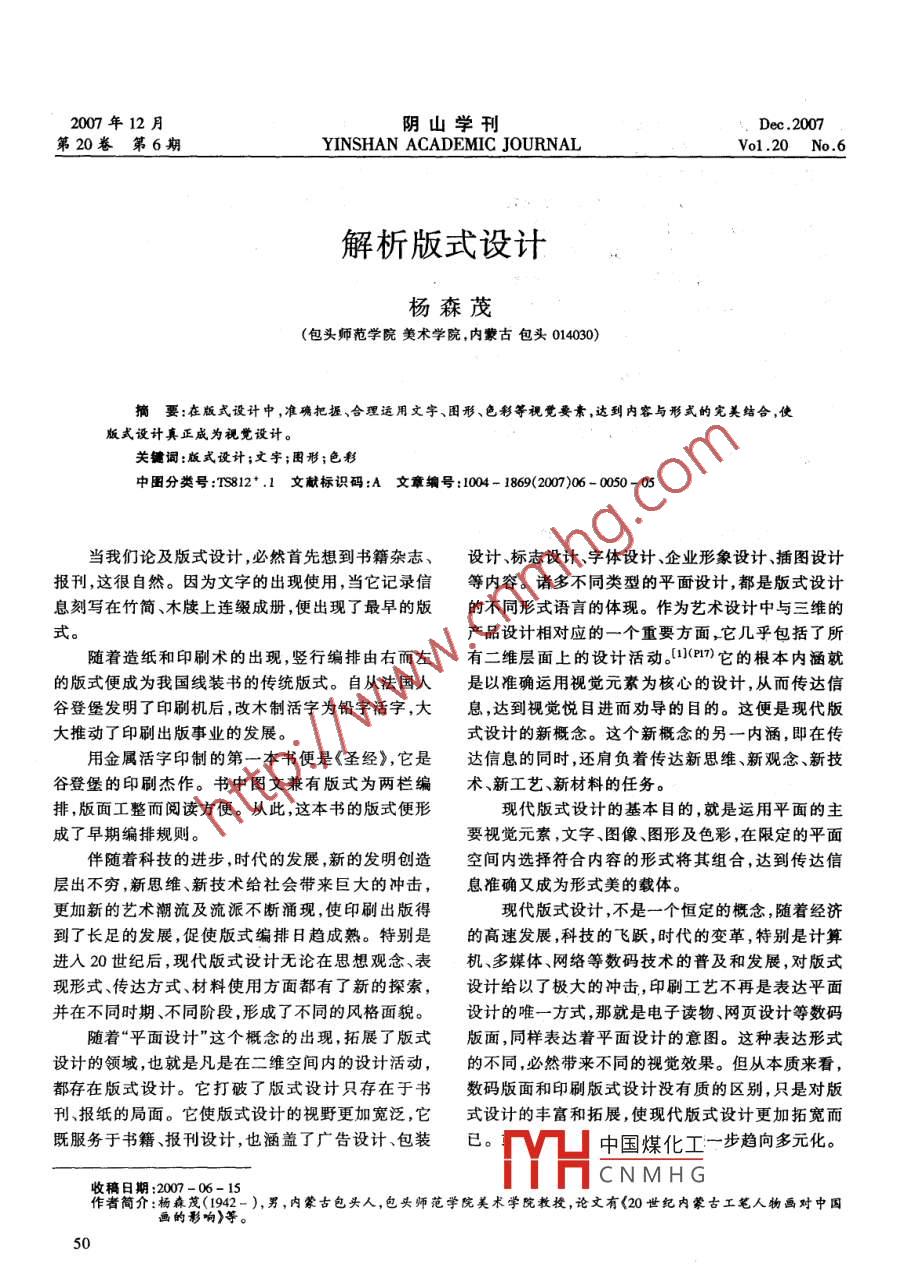 2007年12月陰山學(xué)刊Dec .2007.第20卷. 第6期YINSHAN ACADEMIC JOURNALVo1.20 No.6解析版式設(shè)計楊森茂(包頭師范學(xué)院美術(shù)學(xué)院,內(nèi)蒙古包頭014030)摘要:在版式設(shè)計中 ,準確把握、合理運用文字、困形、色彩等視覺要素,達到內(nèi)容與形式的完美結(jié)合,使版式設(shè)計真正成為視覺設(shè)計。關(guān)鍵詞:版式設(shè)計;文字;困形;色彩中團分類號:TS812*.1文獻標識碼:A 文章編 號:1004- 1869(2007)06 - 0050- 05當(dāng)我們論及版式設(shè)計,必然首先想到書籍雜志、設(shè)計、標志設(shè)計、字體設(shè)計、企業(yè)形象設(shè)計、插圖設(shè)計報刊,這很自然。因為文字的出現(xiàn)使用,當(dāng)它記錄信等內(nèi)容。諸多不同類型的平面設(shè)計,都是版式設(shè)計息刻寫在竹簡、木牘上連綴成冊,便出現(xiàn)了最早的版的不同形式語言的體現(xiàn)。作為藝術(shù)設(shè)計中與三維的式。產(chǎn)品設(shè)計相對應(yīng)的一個重要方面,它幾乎包括了所隨著造紙和印刷術(shù)的出現(xiàn),豎行編排由右而左有二維層面上的設(shè)計活動。(1](P17)它的根本內(nèi)涵就的版式便成為我國線裝書的傳統(tǒng)版式。自從法國人是以準確運用視覺元素為核心的設(shè)計,從而傳達信谷登堡發(fā)明了印刷機后,改木制活字為鉛字活字,大息,達到視覺悅目進而勸導(dǎo)的目的。這便是現(xiàn)代版大推動了印刷出版事業(yè)的發(fā)展。式設(shè)計的新概念。這個新概念的另一內(nèi)涵,即在傳.用金屬活字印制的第一本書便是《圣經(jīng)》,它是達信息的同時,還肩負著傳達新思維、新觀念、新技谷登堡的印刷杰作。書中圖文兼有版式為兩欄編術(shù)、新工藝、新材料的任務(wù)。排,版面工整而閱讀方便。從此,這本書的版式便形現(xiàn)代版式設(shè)計的基本目的,就是運用平面的主成了早期編排規(guī)則。要視覺元素,文字、圖像、圖形及色彩,在限定的平面伴隨著科技的進步,時代的發(fā)展,新的發(fā)明創(chuàng)造空間內(nèi)選擇符合內(nèi)容的形式將其組合,達到傳達信層出不窮,新思維、新技術(shù)給社會帶來巨大的沖擊,息準確又成為形式美的載體。更加新的藝術(shù)潮流及流派不斷涌現(xiàn),使印刷出版得現(xiàn)代版式設(shè)計,不是一個恒定的概念,隨著經(jīng)濟到了長足的發(fā)展,促使版式編排日趨成熟。特別是.的高速發(fā)展,科技的飛躍,時代的變革,特別是計算進入20世紀后,現(xiàn)代版式設(shè)計無論在思想觀念、表機、多媒體、網(wǎng)絡(luò)等數(shù)碼技術(shù)的普及和發(fā)展,對版式現(xiàn)形式、傳達方式材料使用方面都有了新的探索,設(shè)計給以了極大的沖擊,印刷工藝不再是表達平面并在不同時期、不同階段,形成了不同的風(fēng)格面貌。設(shè)計的唯一方式,那就是電子讀物、網(wǎng)頁設(shè)計等數(shù)碼隨著“平面設(shè)計”這個概念的出現(xiàn),拓展了版式版面,同樣表達著平面設(shè)計的意圖。這種表達形式設(shè)計的領(lǐng)域,也就是凡是在二維空間內(nèi)的設(shè)計活動,的不同,必然帶來不同的視覺效果。但從本質(zhì)來看,都存在版式設(shè)計。它打破了版式設(shè)計只存在于書數(shù)碼版面和印刷版式設(shè)計沒有質(zhì)的區(qū)別,只是對版刊、報紙的局面。它使版式設(shè)計的視野更加寬泛,它式設(shè)計的豐富和拓展,使現(xiàn)代版式設(shè)計更加拓寬而既服務(wù)于書籍、報刊設(shè)計,也涵蓋了廣告設(shè)計、包裝.已。中國煤化工一步趨向多元化。MHCNMHG收稿日期:2007 -06-15作者簡介:楊森茂(1942-),男,內(nèi)蒙古包頭人,包頭師范學(xué)院美術(shù)學(xué)院教授,論文有<20世紀內(nèi)蒙古工筆人物畫對中國畫的影響)等。50把握好視覺語言的表達方式,才能較好地落實設(shè)計-、現(xiàn)代版式設(shè)計的基本原則意圖,表達好主題思想。版式設(shè)計本身不是目的,設(shè)計是為了更好的準(一)文字要素一- 獲取信息的主要渠道。確傳達信息的一-種手段。版式設(shè)計中尤為主要的是文字。關(guān)鍵是諸多設(shè)版式設(shè)計的基本目的,是用設(shè)計的手段,將文計的標題、副題、正文、注解等都離不開文字。讀者字、圖形、色彩等組織起來,用最獨特、最準確和最精在諸多設(shè)計中獲取信息的主渠道是文字,因而所用細的形式為讀者提供準確的信息。這就要版面條理文字清晰、易辨、規(guī)范、統(tǒng)一是最起碼的條件。要想清晰,主題鮮明突出,起到誘導(dǎo)和增強讀者的注目力運用好文字,首先要掌握文字的字體和字號。.和理解力的作用。文字的表現(xiàn)形式是字體,不同的字體字號給人版式設(shè)計的最大制約是受版面空間的限定,只的視覺感受和心理感受是不同的,這說明字體具有能在有限的空間安排文字與圖片等,因此,要使主題強烈的感情色彩,因而字體的準確選擇有助于表達鮮明突出就尤顯重要。通常人們厭惡那種不分主主題,恰當(dāng)?shù)拿赖淖煮w可以使讀者產(chǎn)生愉悅,且有助次,含意費解的擁塞版式,因而信息處理要主次明.于理解內(nèi)容。字體一般分為三類,即常用印刷體,確、版式簡潔單純,一目了然,使讀者輕松愉悅地理如:宋體黑體、等線體等,裝飾性較強的藝術(shù)字體,解內(nèi)容,了解主題,得到信息??傊哂袑?dǎo)讀的潛如:綜藝體、彩云體琥珀