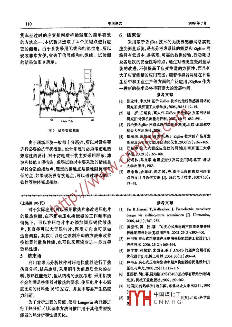 第35卷第4期Vol35 No 4200年7月CHINA MEASUREMENT TESTJuy,2009壓電換能器的熱仿真分析陳飛,傅波(四川大學制造科學與工程學院四川成都610065)摘要:壓電換能器在工作過程中的發(fā)熱不僅會引起換能器的性能下降而且還可能導致?lián)Q能器失效?;趥鳠釋W的基本理論應用 ANSYS有限元分析軟件建立了壓電換能器的熱分析模型。采用有限差分的數(shù)值求解方法對換能器的整體溫度場進行了求解分析了前后質量塊采用不同材料的 Langevin換能器的溫度場分布規(guī)律,為大功率壓電換能器的散熱和性能優(yōu)化方法的研究提供了基礎關鍵詞:壓電換能器;發(fā)熱;熱仿真;有限元;溫度場中圖分類號:TP919;TP212文讞標識碼:A文章編號:1674-5124(200004010403Thermal simulation analysis of piezoelectric transducerCHEN Fei, F BoCollege of Manufacturing Science and Engineering, Sichuan University, Chengdu, 610065, China)Abstract: The heating of piezoelectric transducer not only lowers the efficiency of these devices, but may alsolead to their failure. Based on the heat transfer equation, the FEM thermal analysis model of piezoelectrictransducer was established by means of ANSYS. The temperature field distribution of Langevin transducers withvarious material types was analyzed. The work provides a foundation for the thermal analysis and optimization oflarge power piezoelectric transducers.Key words: Piezoelectric transducer; Heat; Thermal simulation; Finite element; Temperature field1引言析,就可以在產品開始生產之前確定和消除熱問目前,在功率超聲領域例如超聲清洗和超聲題降低設計成本,提高設計、生產、再設計和再生焊接中,對大功率壓電換能器的需求不斷增加。但產的效能,縮短高性能壓電換能器的研制周期,并是,隨著功率的提高壓電片的發(fā)熱量也會相應地有助于進行故障分析。增加,如果換能器結構設計不合理,熱量得不到有2壓電換能器熱仿真分析基本理論效地散發(fā),壓電片的溫度就會不斷上升,從而造成壓電換能器熱分析,又稱為熱模擬,是利用換能器性能的下降,嚴重的情況下(例如接近居里數(shù)學的手段在壓電換能器的概念設計階段獲得溫度)換能器會失效,從而影響整機工作的可靠性,溫度分布的方法,它可以使壓電換能器設計人員甚至造成設備故障,引起災難性的后果。統(tǒng)計資料在設計階段就能發(fā)現(xiàn)產品的熱缺陷,從而改變其表明,在正常溫度范圍內,電子元器件的失效率隨設計。元器件溫度的升髙呈指數(shù)增加,大致來說,元器件隨著現(xiàn)代計算機技術的飛速發(fā)展,用數(shù)值方法的溫度每升高10°C,其可靠性減半。因此,對壓電求解傳熱學問題所占的比重越來越大。數(shù)值方法主換能器進行可靠的熱分析,實施有效的熱控制措要有有限差分法、有限容積法、有限元素法及有限施是提高換能器工作可靠性的關鍵措施之一。通分析法等。在計算溫度場時整個傳熱過程可以簡過實驗的方法來研究換能器的發(fā)熱問題,耗時長成化為本高。如果采用數(shù)值模擬方法來對換能器進行熱分能量守中國煤化工分布可以根據(jù)CNMH作者滴介請飛(932男.四川成都市人碩士研究生,0x“ax+,1游+1a)+9=C0收稿日期:2008-12-26;收到修改稿日期:2009-03-11專業(yè)方向為超聲振動技術及應用。第35卷第4期陳飛等:壓電換能器的熱仿真分析105式中C——材料的比熱容單位為J(Km3);32壓電換能器熱分析模型—溫度隨時間的變化率,即單位時間在進行熱分析前,首先要根據(jù)實體結構建立如圖2所示的熱分析模型。模型的建立必須與實體模的溫升;型相一致,考慮到計算量和易于網格剖分等因素k,,—x,y,z方向上的熱導率,單位為在 ANSYS里建立的14分析模型如圖3所示該圖是進行了網格剖分后的實體簡化模型,此熱分析模對于各向同性導熱材料k二二kk,上式變?yōu)?型中忽略了電極片,將壓電環(huán)簡化為壓電片,忽略(2)了螺栓和預應力螺栓絕緣套筒。在穩(wěn)態(tài)情況下,7=0,上面兩個方程變?yōu)?(3)t a2t at根據(jù)上述控制方程、邊界條件和初始條件創(chuàng)建圖2換能器有限元分析模型圖3模型網格劃分圖一個溫度場泛函表達式利用變分法推導有限元公3施加熱載荷并求解式,然后利用迭代法或消去法進行求解,即可得到分析時作如下假設:①壓電片是平面均勻熱相應的計算結果源;②環(huán)境溫度和換能器的初始溫度為25℃;③忽3壓電換能器的熱仿真分析略熱幅射效應④壓電片產生的熱功率為100W,與有限元分析的方法是目前在工程領域中常用外界的熱對流系數(shù)為20W(m2K);⑤器件的外表的數(shù)值模擬方法ANSY作為有限元分析軟件在熱面與周圍空氣進行對流換熱其對流換熱系數(shù)h為分析方面具有強大的功能可以分析工程中普遍存常數(shù)周圍空氣的溫度女為常數(shù)該邊界滿足的條在的熱問題其熱分析的基本原理是將所處理的對件為:象劃分成有限個單元(包含節(jié)點),然后根據(jù)能量守進而進一步求解出其他相關量本文主要通過穩(wěn)態(tài)式中≈h(恒的原理求解一定邊界條件和初始條件下的每個(5)節(jié)點處的平衡方程,由此計算出各節(jié)點的溫度值,n,一為邊界處的溫度梯度為導熱分析對壓電換能器進行傳熱分析。熱系數(shù);3.1壓電換能器的結構與原理h——壓電片與空氣間的對流換熱系數(shù);Langevin換能器,在原理上可以被簡化為表示邊界處溫度;“三明治”結構壓電環(huán)被夾在兩金屬端塊之間。圖y空氣的溫度。1顯