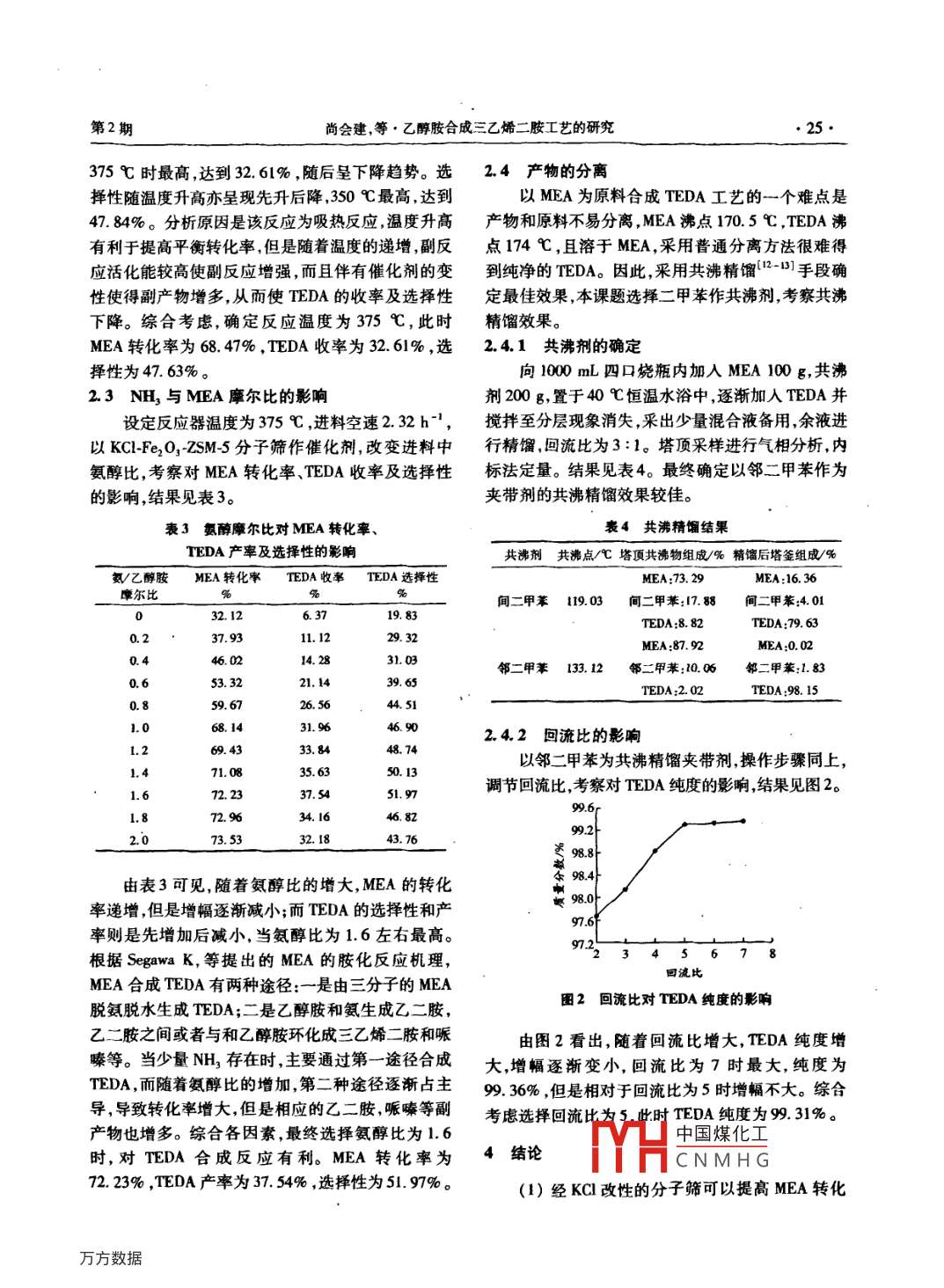 2012年第27卷第2期聚氨酯工業(yè)2012.Vol.27No.2POLYURETHANE INDUSTRY生產(chǎn)與應(yīng)用·乙醇胺合成三乙烯二胺工藝的研究尚會(huì)建王少杰王麗梅鄭學(xué)明(河北科技大學(xué)研究生學(xué)院石家莊050018)摘要:在自行研制的小型固定床反應(yīng)器上以乙醇胺為原料進(jìn)行三乙烯二胺合成工藝的研究,考察了溫度、質(zhì)量空速、氯醇比以及催化劑對(duì)反應(yīng)的影響。研究表明,KC-Fe2O3-ZSM5分子篩為最優(yōu)催化劑,較優(yōu)的工藝條件為反應(yīng)溫度為375℃、進(jìn)料質(zhì)量空速為2.32h-、氨醇比為1.6,乙醇胺的轉(zhuǎn)化率可達(dá)72.23%,三乙烯二胺的產(chǎn)率達(dá)到37.54%,選擇性為5197%;以鄰二甲苯作為共沸劑的共沸精餾分離,回流比為5,可以得到純度為99.31%的三乙烯二胺晶體。關(guān)鍵詞:三乙烯二胺;乙醇胺;ZSM5分子篩催化劑;共沸精餾中圖分類號(hào):TQ4266文獻(xiàn)標(biāo)識(shí)碼:A文章編號(hào):1005-1902(2012)02-0023-04三乙烯二胺(TEDA)是聚氨酯泡沫的基本催化劑、農(nóng)藥生產(chǎn)引發(fā)劑、無(wú)氯電鍍添加劑。作為聚氨酯1實(shí)驗(yàn)部分工業(yè)中用量最大應(yīng)用最廣的一種叔胺類催化劑,其1.1主要原料系列產(chǎn)品適用于聚氨酯軟泡硬泡彈性體及涂料等乙醇胺(MEA)、正丙醇,天津市紅巖化學(xué)試劑多種制品。在我國(guó)傳統(tǒng)的生產(chǎn)工藝口以二氯乙廠;KCl、Ni(NO3)2·6H2O、Fe(NO2)39H2o,天津市烷和氨水為原料,250℃和3.9MPa下進(jìn)行熱壓氨永大化學(xué)試劑開發(fā)中心;Cu(NO3)29H12O,天津市解生成大量二亞乙基三胺和少量三乙烯二胺因其標(biāo)準(zhǔn)科技有限公司,以上均為分析級(jí);可溶性淀粉,工藝條件苛刻,設(shè)備要求極高早已被淘汰。有研究工業(yè)級(jí),天津市標(biāo)準(zhǔn)科技有限公司;蒸餾水、氨水,石者以哌嗪及其衍生物為原料,在360℃高壓釜家莊試劑廠;ZSM5分子篩原粉,工業(yè)級(jí)石家莊合中,以含Ba2的 SrHPO4為催化劑合成TEDA,原料佳化學(xué)品有限公司。轉(zhuǎn)化率和TEDA選擇性較高但是原料昂貴以致僅12催化劑的制備停留在實(shí)驗(yàn)室階段。目前工業(yè)化生產(chǎn)TEDA多以乙采用浸漬法制備分子篩催化。配置一定濃度的二胺為原料,雖然生產(chǎn)工藝較為成熟但依然存Kcl、KCNi(NO3)2、KCFe(NO3)3和 KCl-Cu在原料緊俏較為昂貴、副產(chǎn)物多的問(wèn)題。而乙醇胺(NO2)2溶液。分別加入60g分子篩原粉,置于水價(jià)格低廉但是存在催化劑制備要求高0),其與浴中恒溫50℃充分?jǐn)嚢?h,使金屬硝酸鹽吸附到TEDA不易分離的難題。研究表明,以ZSM分子催化劑表面金屬陽(yáng)離子可調(diào)變酸位中心達(dá)到改性篩為載體適當(dāng)?shù)呢?fù)載一些金屬離子,可制得具有較分子篩催化劑后,靜置30h,真空抽濾后將濾餅放入高催化活性和選擇性的催化劑。在150℃下干燥4h。本課題以改性ZSM5分子篩為催化劑,常壓下將改性后的ZSM5催化劑粉末和3g粘合劑采用乙醇胺和18.8%的氨水及去離子水共同進(jìn)料反(5%可溶性淀粉的水溶液加熱至沸騰,自然冷卻獲應(yīng)在自制的小型固定床反應(yīng)器上進(jìn)行三乙烯二胺的得)充分混合均勻后再經(jīng)計(jì)成型烘干培燒,制得直合成。通過(guò)研究溫度、氨醇比等工藝條件對(duì)反應(yīng)的影徑2.5m,長(zhǎng)中國(guó)煤化工金屬離子的響,并選擇較為適宜共沸精餾夾帶劑,優(yōu)化工藝條件改性分子篩催CN MHGZSM-5KCl以達(dá)到成本低、產(chǎn)率高對(duì)環(huán)境污染小的預(yù)期目的。Fe2O3Z5M5KC4 CuO-ZSM5改性分子篩催化劑?!?4聚氨酯工業(yè)第27卷1.3催化反應(yīng)1.4分析方法自制的小型固定床連續(xù)催化反應(yīng)評(píng)價(jià)裝置見產(chǎn)物組分采用GC7700氣相色譜儀FD檢測(cè)器圖1。進(jìn)行分析,并用內(nèi)標(biāo)法定量?jī)?nèi)標(biāo)物為正丙醇。以乙醇胺為基準(zhǔn),測(cè)定其反應(yīng)前后的量及目標(biāo)產(chǎn)物TEDA生成量,分別以式(1)、式(2),式(3)計(jì)算轉(zhuǎn)化率、產(chǎn)率、選擇性。MEA轉(zhuǎn)化率=2×10%(1)TEDA產(chǎn)率x100%TEDA選擇性TEDAx100%原料瓶;2—蠕動(dòng)泵;3-溫控儀;4-固定床反應(yīng)器;5—冷凝管;6產(chǎn)物收集瓶;7一緩沖瓶;8—尾氣收集瓶式中:m1為反應(yīng)消耗MEA的物質(zhì)的量;n為通圖1氣固相連續(xù)反應(yīng)器催化反應(yīng)評(píng)價(jià)裝置人反應(yīng)器中MEA初始的物質(zhì)的量;nmD為反應(yīng)生以長(zhǎng)30cm、管徑d14mm(壁厚2mm)的不銹成TEDA的物質(zhì)的量。鋼管為固定床反應(yīng)器,可裝填32.0g催化劑。以石2結(jié)果與討論英砂為保溫材料,熱電偶加熱,用可控控溫儀將反應(yīng)器程序升溫至設(shè)定溫度,蠕動(dòng)泵通入去離子水吹脫2.1催化劑的影響催化劑10min,再泵入含水質(zhì)量分?jǐn)?shù)為50%的乙醇在反應(yīng)器常壓、溫度350℃、進(jìn)料質(zhì)量空速胺,原料經(jīng)過(guò)預(yù)熱汽化進(jìn)入固定床反應(yīng)器中。產(chǎn)物(WHv)232h-l、NH3:MEA=1:1(摩爾比),以不經(jīng)冷凝器到收集瓶中。待反應(yīng)穩(wěn)定,取產(chǎn)物進(jìn)行同催化劑進(jìn)行合成三乙烯二胺的反應(yīng),收集反應(yīng)產(chǎn)物分析。進(jìn)行分析。并按照MEA轉(zhuǎn)化率、TEDA的收率及選擇性的計(jì)算公式進(jìn)行數(shù)據(jù)處理所得數(shù)據(jù)見表1。1不同催化劑對(duì)MEA轉(zhuǎn)化率、TEDA產(chǎn)率及選擇性的影響催化