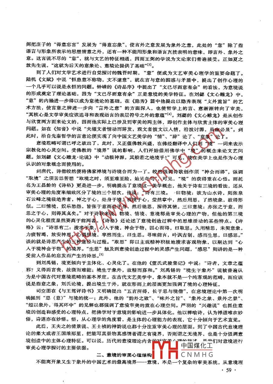 社會(huì)科學(xué)研究2002 年第3期意{境的審美心理分析蔣芝蕓[摘要]意境作為中國 古代文藝美學(xué)的一個(gè)核心范疇,有著豐富的審美心理蘊(yùn)含。藝術(shù)意境中審美情感意緒是與心理化了的物景及物境相互交融,共同存在的;意境創(chuàng)造中藝術(shù)想象則是與心理物象相伴相隨的。意境的創(chuàng)生中依賴審美活動(dòng)兩主體(創(chuàng)作主體與接受主體)一定的心理基礎(chǔ),高妙的藝術(shù)意境的產(chǎn)生有賴于創(chuàng)作主體的人格境界,不同的文化人格會(huì)創(chuàng)構(gòu)出不同的藝術(shù)意境。而審美接受主體重體道的心理特征,往往使得欣賞者從具體的藝術(shù)作品的欣賞中去尋求對(duì)整個(gè)的人生、歷史、宇宙的形而上的感悟,因而藝術(shù)意境的創(chuàng)生聯(lián)系著中華民族共同的審美心理結(jié)構(gòu)。[關(guān)鍵詞]意境范疇;審美心理;靜態(tài)分析;主體心理[中圖分類號(hào)] B83-0; 101 [文獻(xiàn)標(biāo)識(shí)碼] A [文章編號(hào)] 1000-4769 (2002) 03 -0058- 04意境(境界)或曰境,作為中國古代文藝美學(xué)的-個(gè)核心范疇,關(guān)系到中華民族精神心理與人格境界。上-個(gè)世紀(jì)以來,人們關(guān)于意境研究的文章與論著甚多,對(duì)于意境的審美心理雖有不少研究,但遠(yuǎn)未廣泛和深人,本文在此試作- -點(diǎn)探討,希就教于方家。一、歷史的追溯:意境理論形成中的審美心理蘊(yùn)含作為- -個(gè)審熒范疇,意境的正式提出是在中唐時(shí)期題名為王昌齡的《詩格》中。但正如周來祥先生所說,“意境不是-個(gè)凝固的概念,而是一個(gè)不斷流動(dòng)的歷史范疇”[1]。意境經(jīng)歷了由萌芽到成熟的漫長過程。對(duì)于意境的淵源,人們往往追溯到先秦時(shí)代的哲學(xué)中,《周易》中的“立象以盡意”,老子的“大音希聲,大象無形”,莊子的“言者所以在意,得意而忘言”都被當(dāng)作意境理論的最早源頭。在這些被認(rèn)為是源頭的論述中,“意” 是重心所在,由此,我們不難見,從- -開始,意境就是關(guān)涉心理的一一個(gè)理論命題。有人指出,在先秦哲學(xué)中“意” 是指人的思想, (2)這固然有一定道理,但我以為不如對(duì)“意”作更寬泛的理解。雖然思想也是人的心理活動(dòng)的產(chǎn)物,但從對(duì)美學(xué)或古典文論的影響而言,把“意”理解為思想感情更好。這不僅因?yàn)樵谒囆g(shù)實(shí)踐中情感是重心,也因?yàn)樵谌说男睦砘顒?dòng)中其特點(diǎn)是思想與情感態(tài)度相伴隨,可以說,先秦哲學(xué)中的“意”不僅僅指人的思想,它極有可能是指思想、感情等人的心理活動(dòng)的產(chǎn)物。沿著“意”進(jìn)行追尋,魏晉之際王弼關(guān)于“言、象、意”的哲學(xué)思辨也是關(guān)涉意境的重要線索了。王弼在《周易略例明象》說:“夫象者,出意者也。言者,明象者也。盡意莫若象,盡象莫若言。盲生于象,故可尋言以觀意。象生于意,故可尋象辛著。故言者所以明象,得象而忘言。象者所以存意,得意而忘象?!睆闹袊夯ひ馔蟆闭f,王YHCNMHG[作者簡介]蔣芝蕓,湖北民族學(xué)院中文系副教授,湖北恩施445000。弼把莊子的“得意忘言”發(fā)展為“得意忘象”, 使言外之意發(fā)展為象外之意,此處的“意”除了指語言與形象所表示的思想情意之外,還有一種不能用形象和語言直接表明的意味,即言外、象外之意。這言說不盡的“意", 就與文藝的特征相通,因而王弼的學(xué)說為文論家們普遍接受。正如夏之放先生說,“這就為后天的意象論、意境論提供了基礎(chǔ)”(3]。到了人們對(duì)文學(xué)藝術(shù)進(jìn)行自覺探討的魏晉時(shí)期,“意” 便成為文藝審美心理學(xué)的重要命題了。陸機(jī)《文賦》中說“恒患意不稱物,文不逮意”,就在言與意的困感與矛盾中,提出了創(chuàng)作心理的一個(gè)幾乎可以說是永恒的問題。鐘嶸的《詩品序》中提出了“文已盡而意有余”的看法,為意境說的形成奠定了理論基礎(chǔ),因?yàn)椤拔囊驯M而意有余”正是意境的美學(xué)特征。在劉勰《文心雕龍》中,“意”的內(nèi)涵進(jìn)一步得以成為意境論的基礎(chǔ), 在《隱秀》篇中他提出以隱秀表現(xiàn)“文外重旨”的藝術(shù)方法,使言意之辨進(jìn)- -步向“言外之意”的方面深人,也使哲學(xué)上的言、意漸漸轉(zhuǎn)向了審美,“其核心是文學(xué)審美應(yīng)該追尋和表現(xiàn)語言的表層符號(hào)之外的意蘊(yùn)”[4)。劉勰的《文心雕龍》是從創(chuàng)作與欣貫兩方面來論文的,因而他實(shí)際上已涉及到審美的兩主體,即創(chuàng)作主體與欣賞主體的審美心理問題。如在《知音》中說“夫綴文者情動(dòng)而辭發(fā),觀文者披文以人情,沿波討源,雖幽必顯”。釗此時(shí),沿自先秦哲學(xué)的言意論便實(shí)現(xiàn)了向中國文藝美學(xué)的“情”、 “辭”論了、“意象”論了。意境范疇可謂已呼之欲出了,此時(shí),又正值佛教興盛,在佛經(jīng)翻譯中人們用“境”一詞來示宗教化的心靈空間。受佛教的“境界”說的影響,人們開始借用佛學(xué)中“境”的概念來論文藝問題。如劉勰《文心雕龍.論說》中“動(dòng)極神源,其般若之絕境乎!”可見,境在美學(xué)上也是作為心理認(rèn)識(shí)的對(duì)象概念而使用的。到唐代,詩僧皎然便將佛家禪境與詩境合而為一